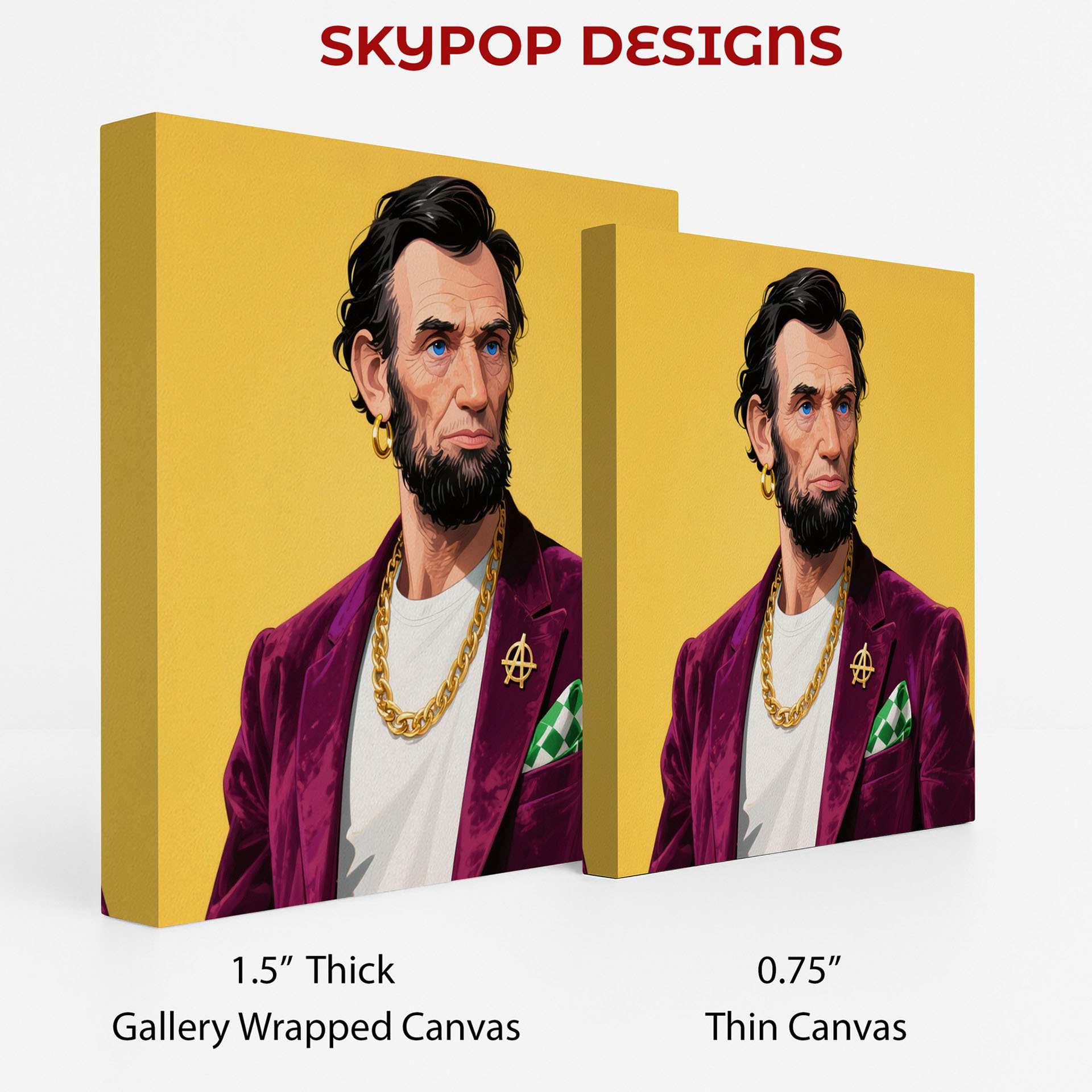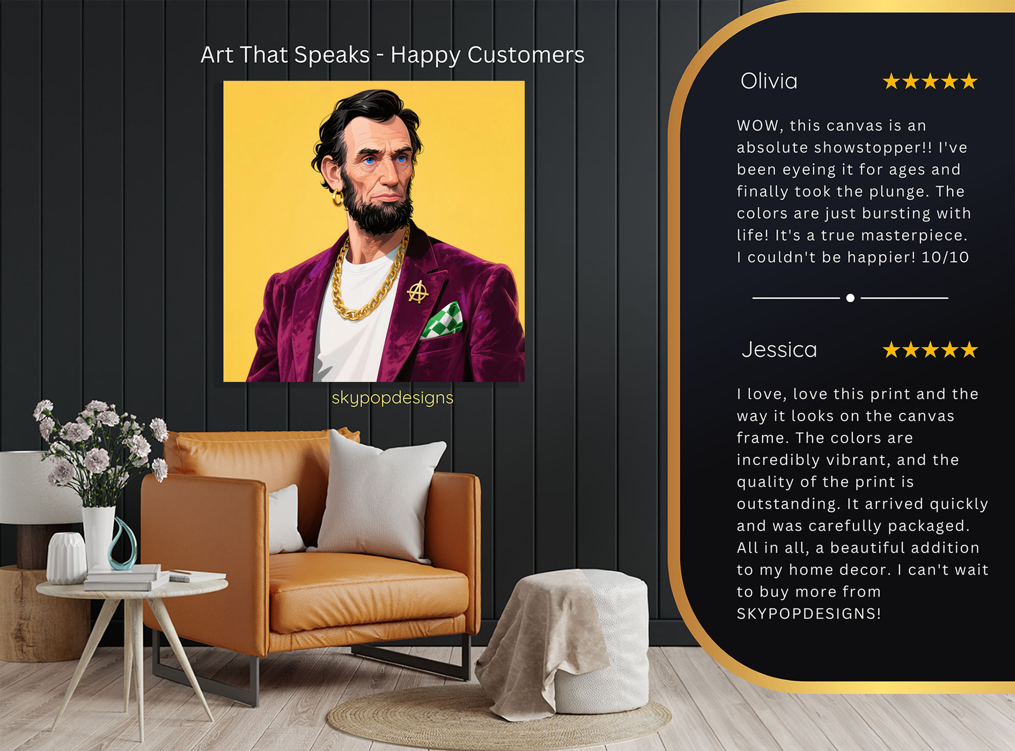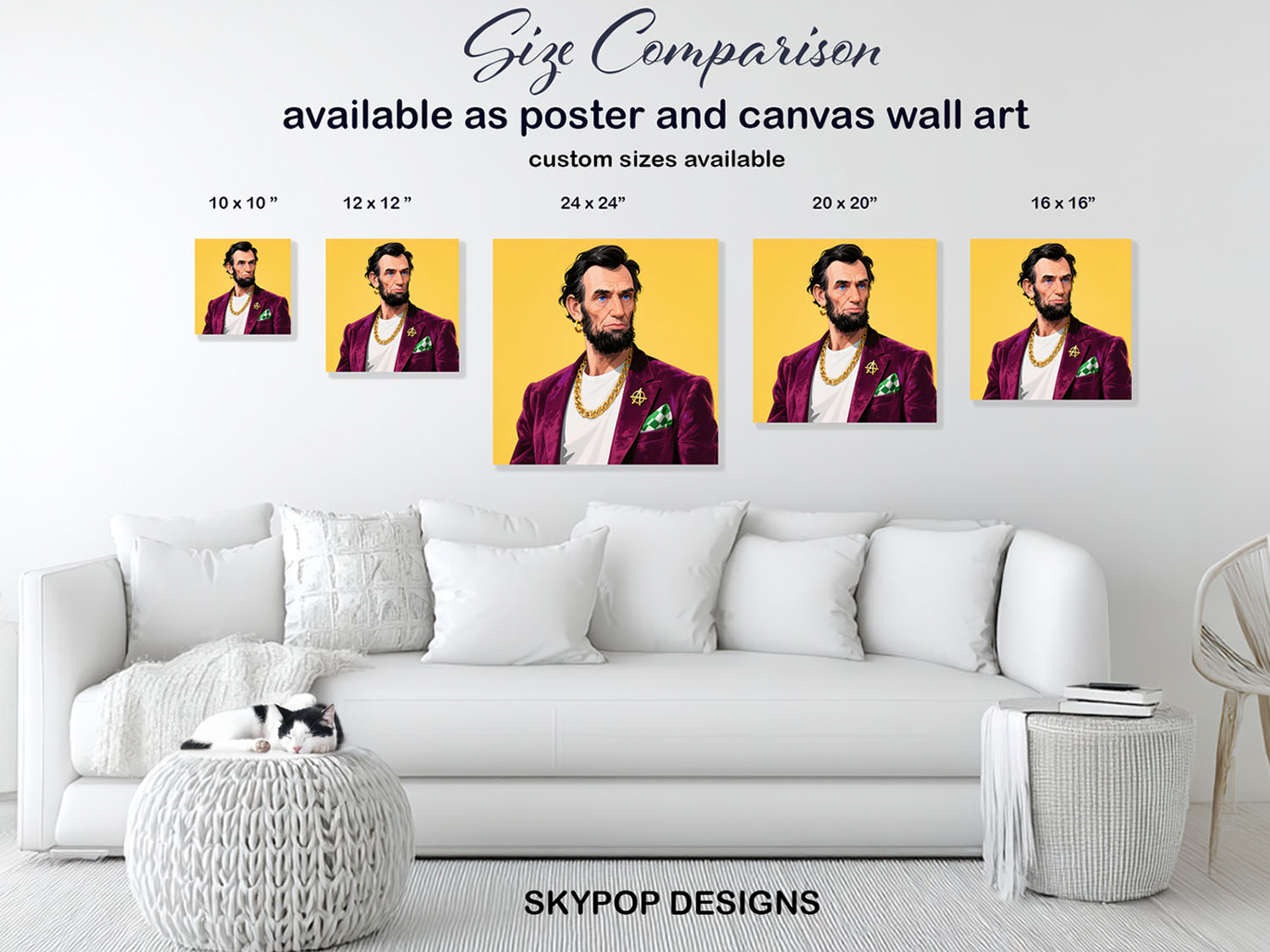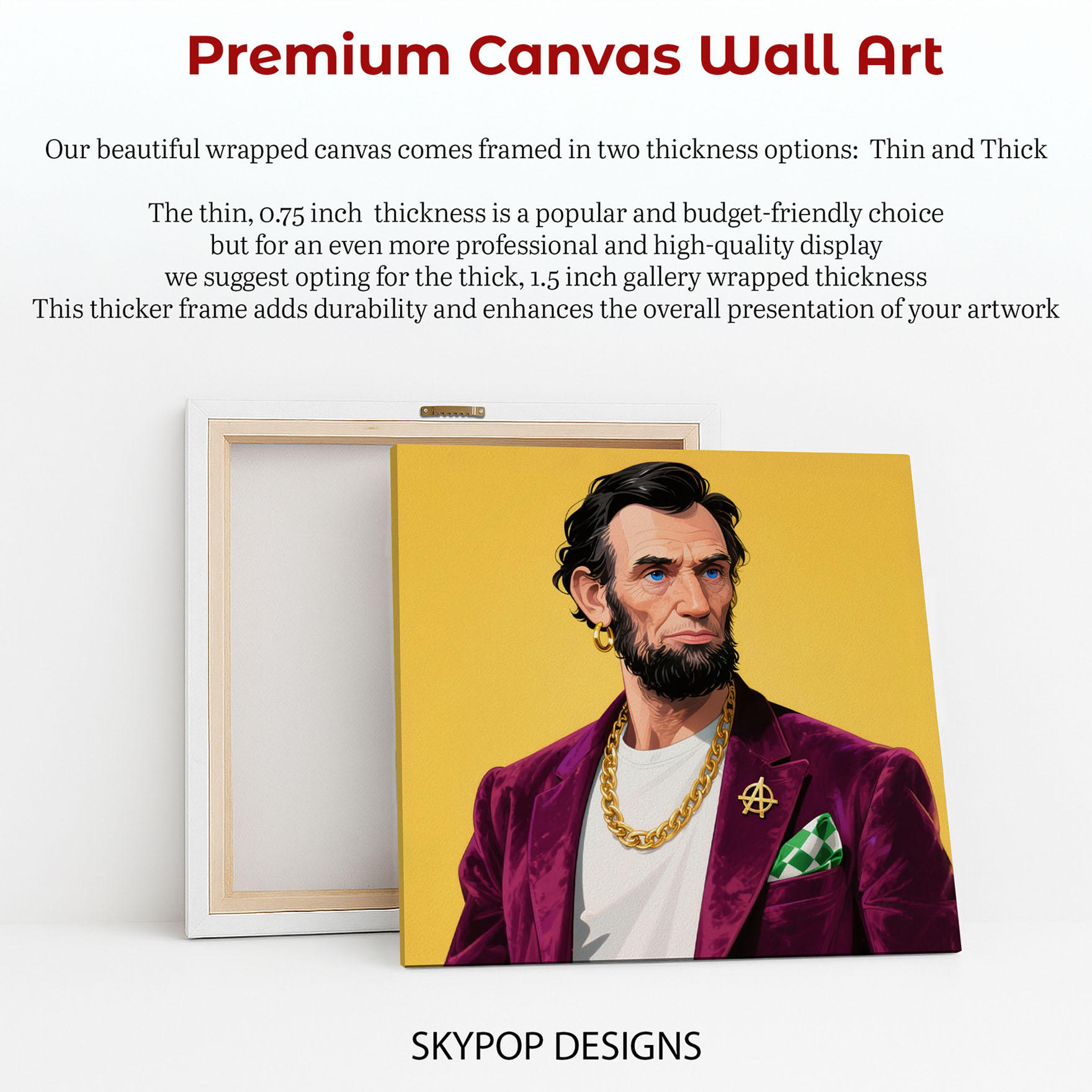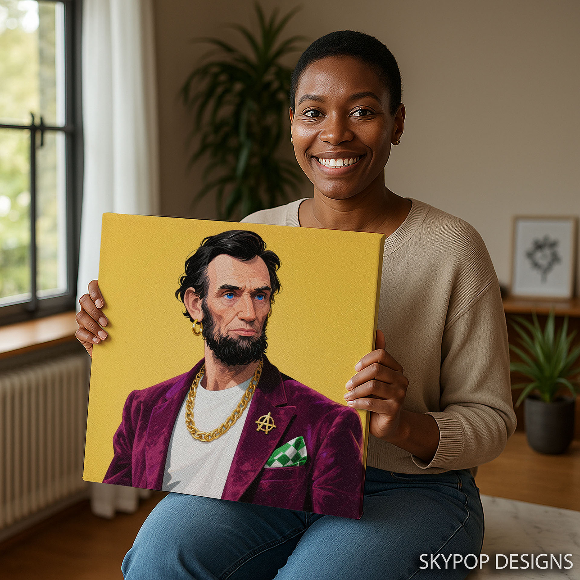 Transform your space with this striking Abraham Lincoln Pop Art canvas wall art, a unique twist on classic portraiture. This poster or canvas wall art is perfect for modern living rooms, bold game rooms, or creative office spaces that crave a statement piece. The vibrant yellow background pops against Lincoln’s iconic figure, enhanced by the rich purple velvet blazer and gleaming gold chain. This artwork elevates any decor style, from contemporary to bohemian, adding a touch of rebellious spirit. The juxtaposition of historical figure with modern street art elements creates a captivating visual narrative that sparks conversation. Ideal for those who appreciate bold design and a touch of edgy humor, this canvas wall art is a true conversation starter. High-quality printing ensures the sharp lines and vivid colors are captured with stunning clarity, making this poster a focal point in any room. The gold accents and distinctive anarchy symbol lapel pin add an unxpected, striking detail to this unique wall decor. Celebrate individuality and historical reimagining with this eye-catching piece. Whether you’re looking to energize your entryway or add personality to your workspace, this Abraham Lincoln canvas art delivers. Perfect as a memorable gift for birthdays or housewarmings for the history buff or art enthusiast with a sense of humor. Add this unique Abraham Lincoln poster to your collection and redefine your home’s aesthetic today.