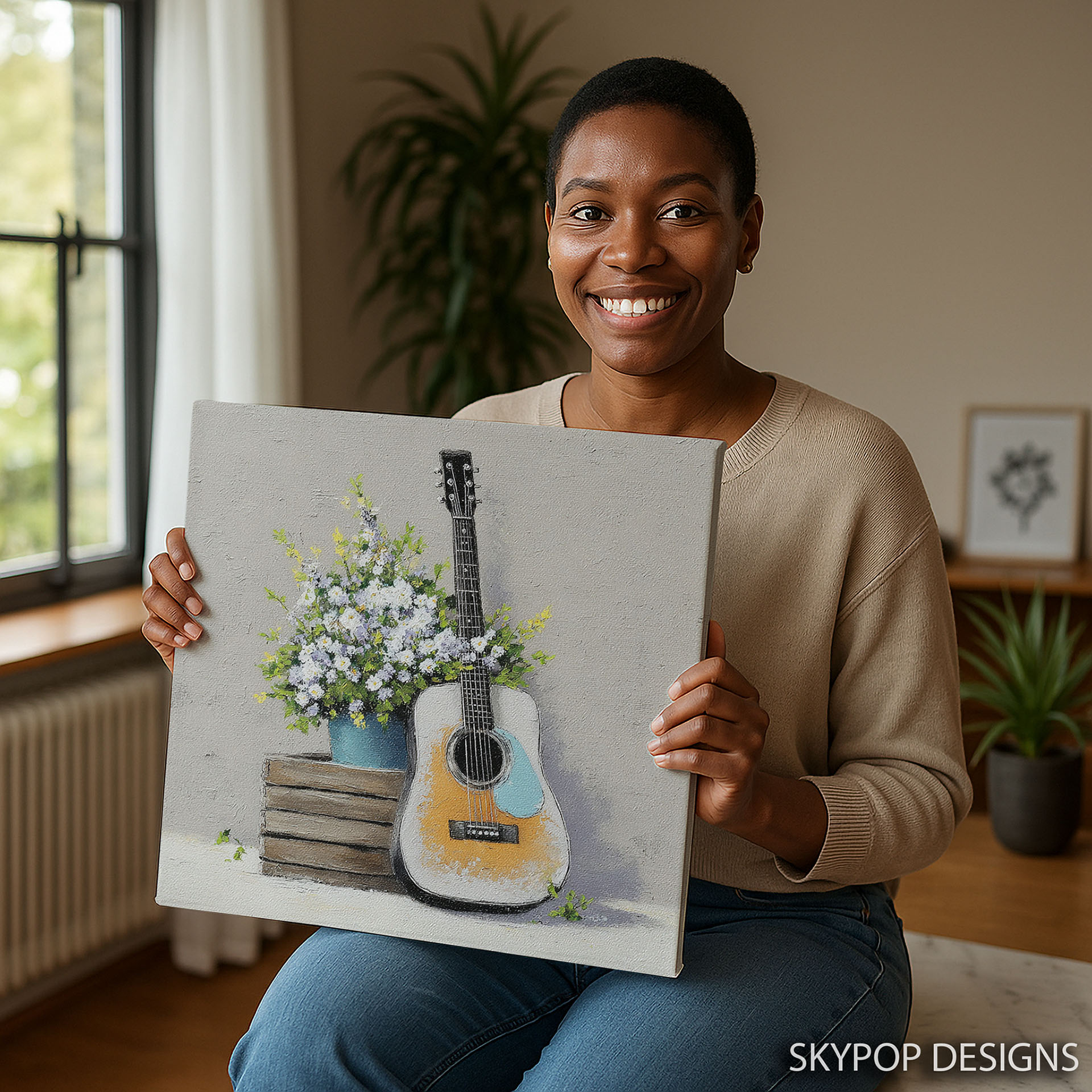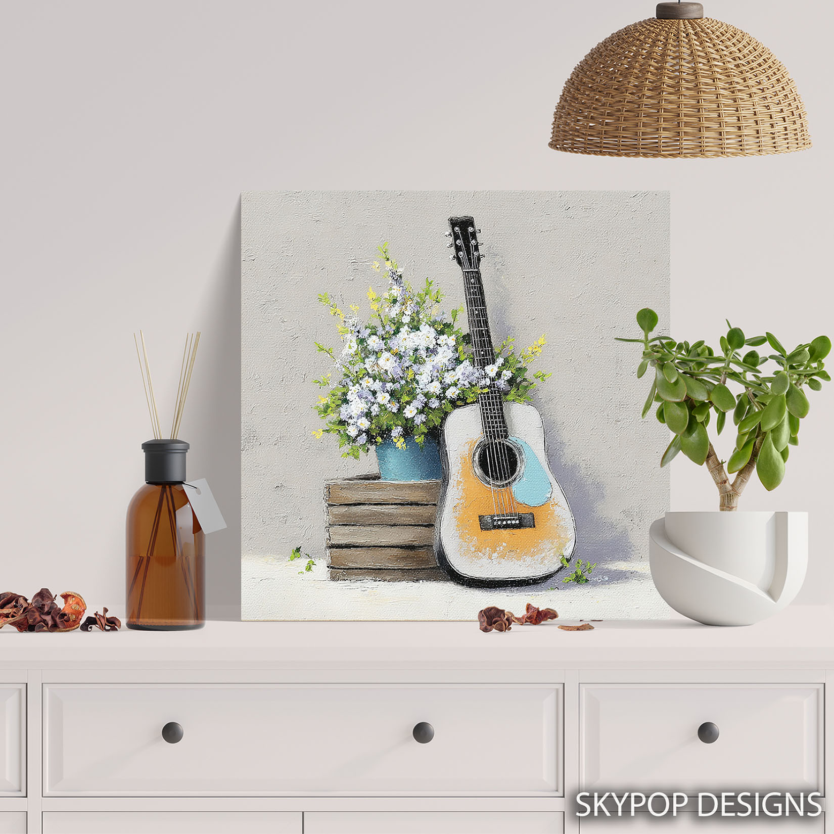 Elevate your home with this captivating acoustic blossom canvas wall art that beautifully blends the charm of a guitar with the freshness of nature. This striking poster or canvas wall art is perfect for transforming any living room into a more inviting space, making it ideal for farmhouse and rustic decor styles. The vibrant bouquet of white and yellow flowers, possibly daisies, arranged in a blue pot, adds a pop of color and life to the composition. This piece is also suitable for bohemian bedrooms or a welcoming entryway, bringing a touch of natural beauty indoors. The natural color palette creates a calming atmosphere, while the textured brushstrokes of the canvas art add depth and character. Celebrate the harmony of music and nature with this unique artwork that inspires creativity and tranquility. It’s a wonderful addition for music lovers or anyone seeking to enhance their home with artistic wall decor. This versatile poster is perfect for adding a personal touch to your walls or as a thoughtful gift for housewarmings, birthdays, or holidays. The high-quality print ensures that the intricate details of the guitar and flowers are vividly rendered, making it a stunning piece of wall art. Showcase your love for music and nature with this beautiful canvas wall art that promises to be a focal point in any room. Transform your space with this acoustic blossom artwork today.