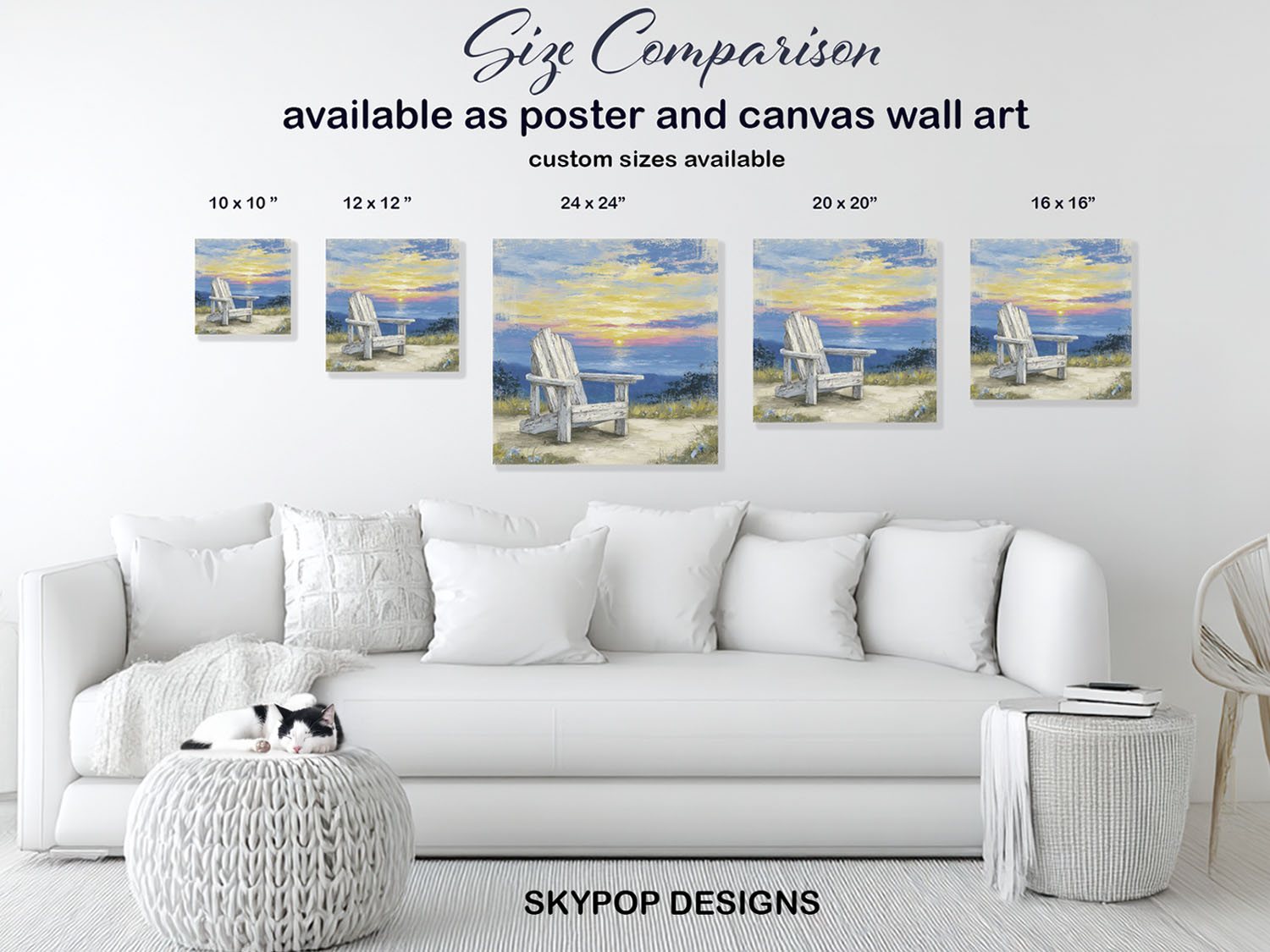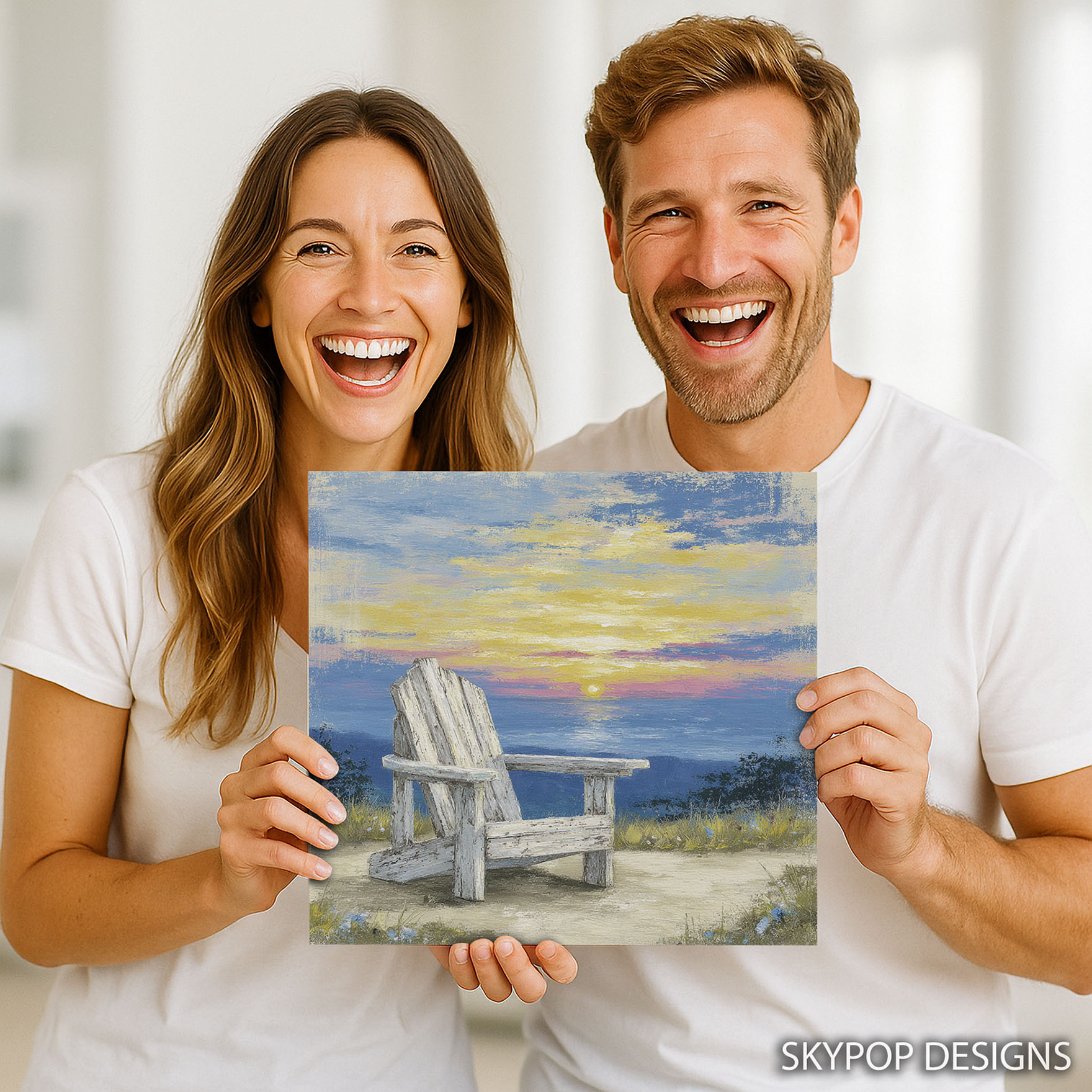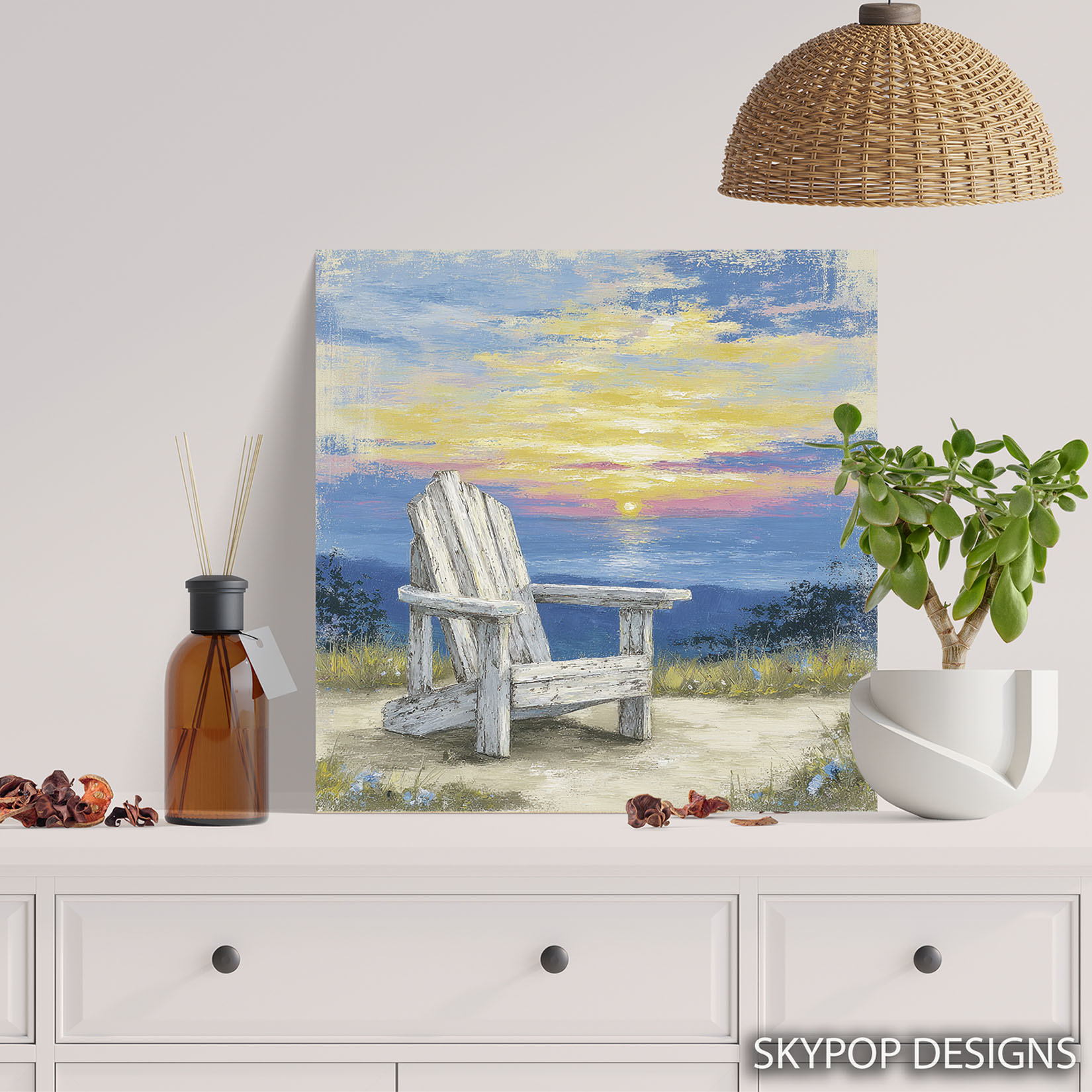 Capture the tranquility of a coastal sunset with this stunning Adirondack chair canvas wall art. This breathtaking poster or canvas wall art transforms any space into a serene retreat, perfect for coastal living rooms or relaxing sunrooms. The vibrant hues of the sunset, bathed in warm yellow and soft pinks, create an inviting and uplifting atmosphere, while the deep blues of the ocean add a sense of calm. This impressionistic nature art piece brings the beauty of the outdoors in, making it ideal for bohemian decor or rustic settings. The iconic Adirondack chair invites viewers to sit back and enjoy the view, symbolizing relaxation and peace. This canvas wall art is a beautiful addition to any bedroom, serving as a constant reminder of peaceful moments. High-quality printing ensures the rich textures and painterly strokes are vividly reproduced, making this artwork a captivating focal point. Whether you’re looking to enhance your outdoor living space or create a peaceful indoor sanctuary, this poster is a versatile choice. It’s an excellent gift for housewarmings, birthdays, or any occasion where you want to share a sense of calm and beauty. Elevate your home decor with this inspiring piece that celebrates the simple pleasures of nature. Add this coastal-inspired artwork to your collection and enjoy its soothing presence every day. Transform your wall into a serene escape with this captivating Adirondack chair sunset canvas art.