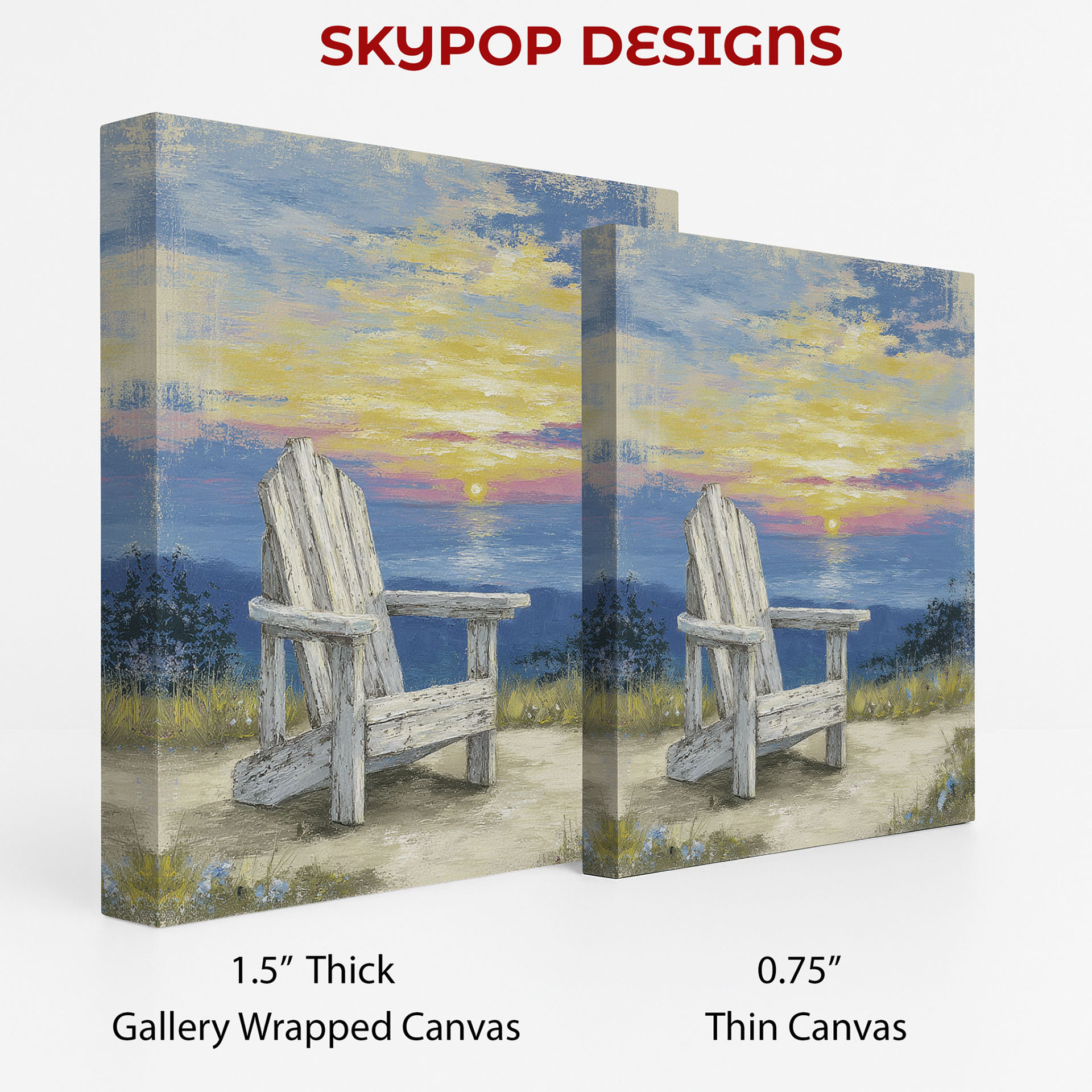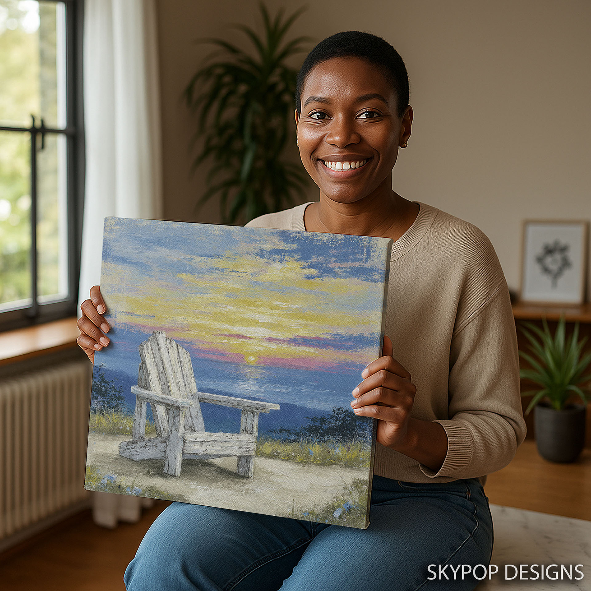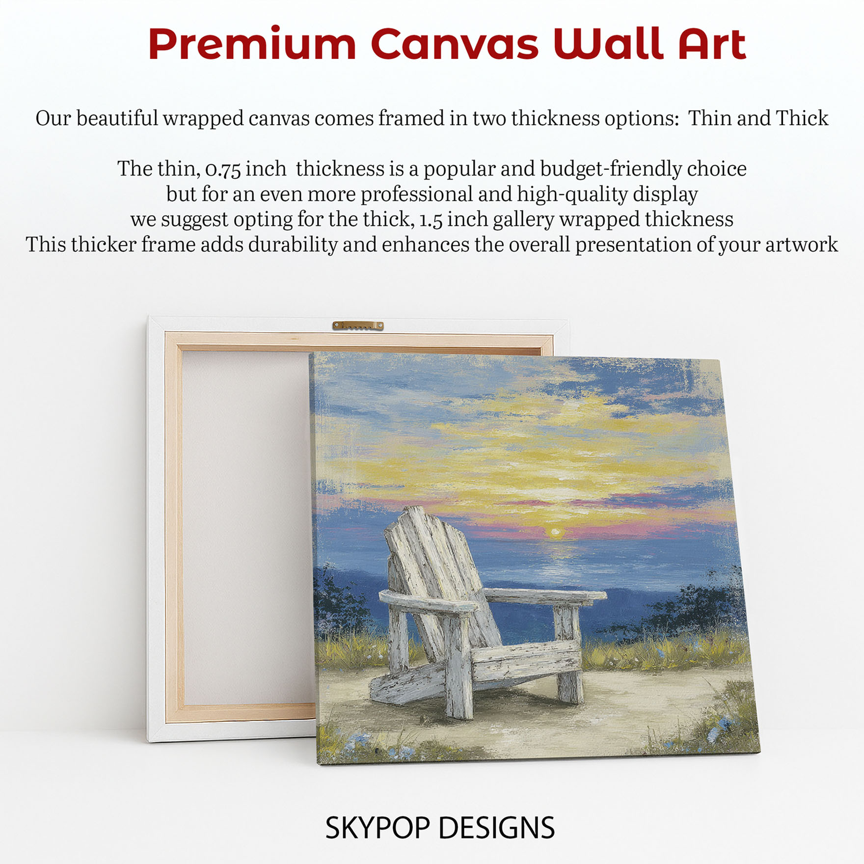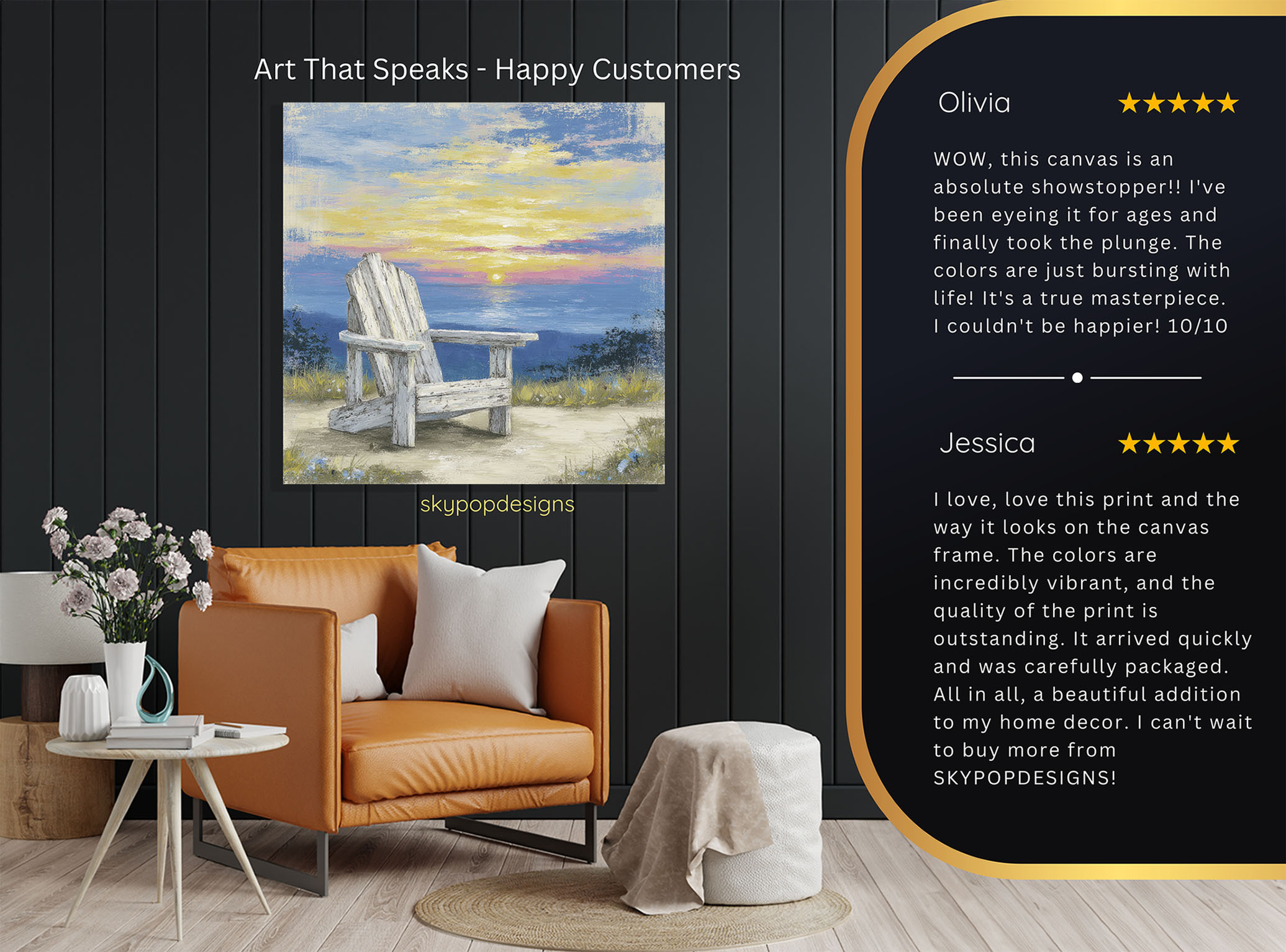 Capture the tranquility of a coastal sunset with this stunning Adirondack chair canvas wall art. This breathtaking poster or canvas wall art transforms any space into a serene retreat, perfect for coastal living rooms or relaxing sunrooms. The vibrant hues of the sunset, bathed in warm yellow and soft pinks, create an inviting and uplifting atmosphere, while the deep blues of the ocean add a sense of calm. This impressionistic nature art piece brings the beauty of the outdoors in, making it ideal for bohemian decor or rustic settings. The iconic Adirondack chair invites viewers to sit back and enjoy the view, symbolizing relaxation and peace. This canvas wall art is a beautiful addition to any bedroom, serving as a constant reminder of peaceful moments. High-quality printing ensures the rich textures and painterly strokes are vividly reproduced, making this artwork a captivating focal point. Whether you’re looking to enhance your outdoor living space or create a peaceful indoor sanctuary, this poster is a versatile choice. It’s an excellent gift for housewarmings, birthdays, or any occasion where you want to share a sense of calm and beauty. Elevate your home decor with this inspiring piece that celebrates the simple pleasures of nature. Add this coastal-inspired artwork to your collection and enjoy its soothing presence every day. Transform your wall into a serene escape with this captivating Adirondack chair sunset canvas art.
