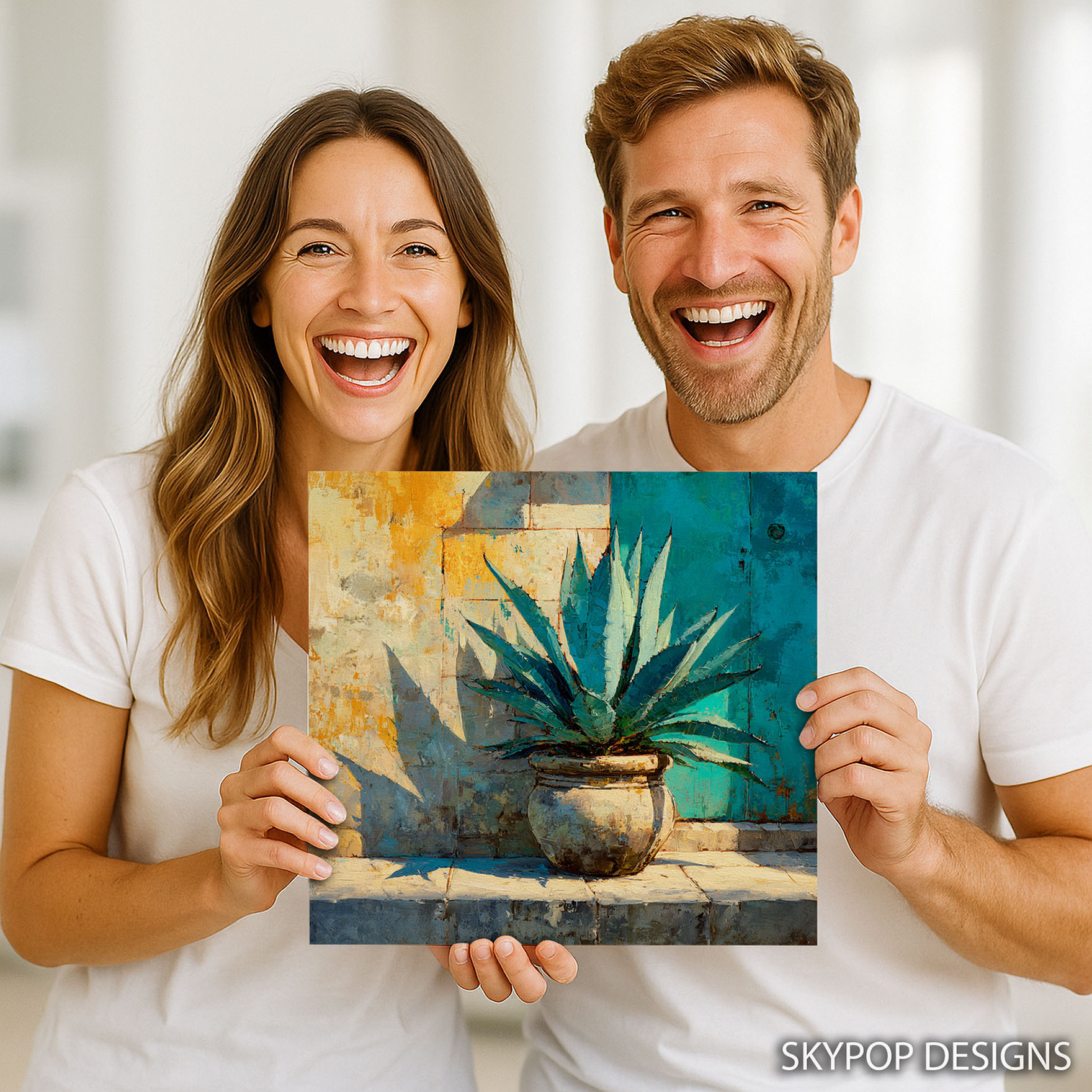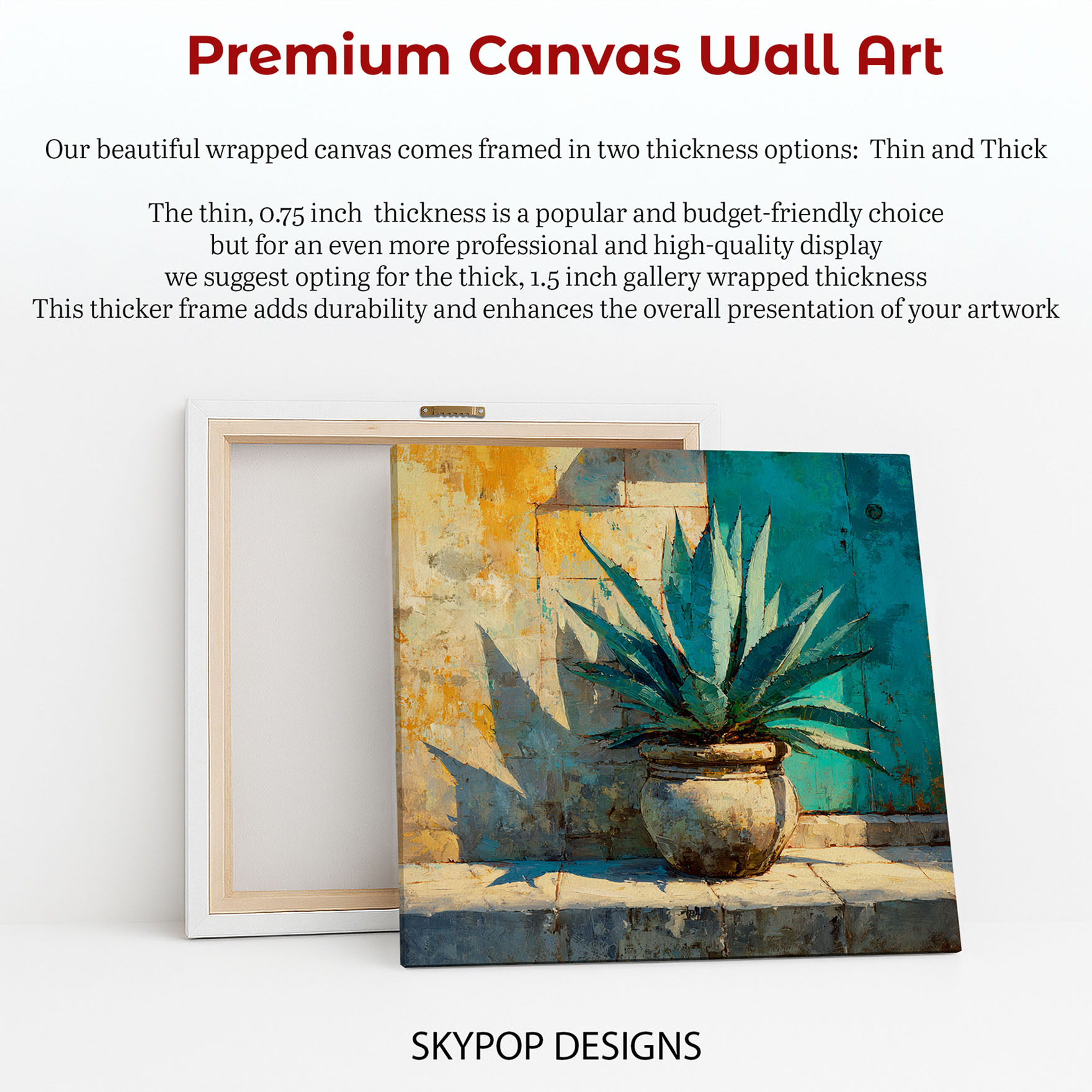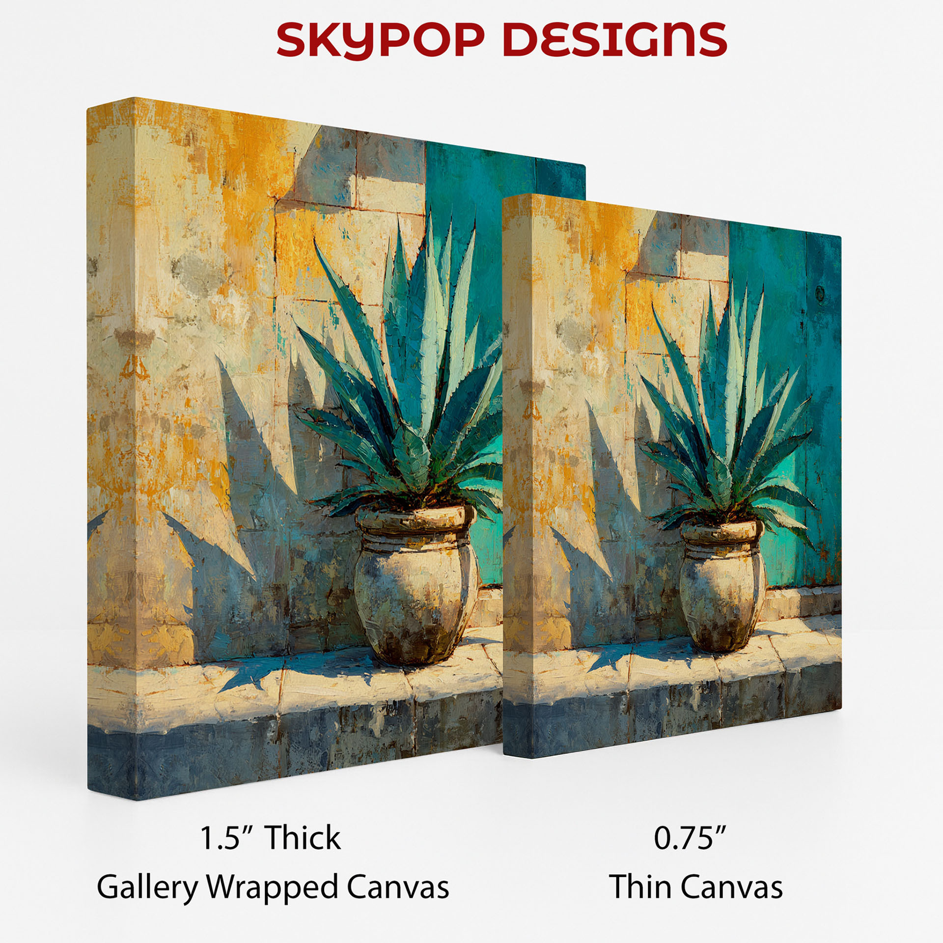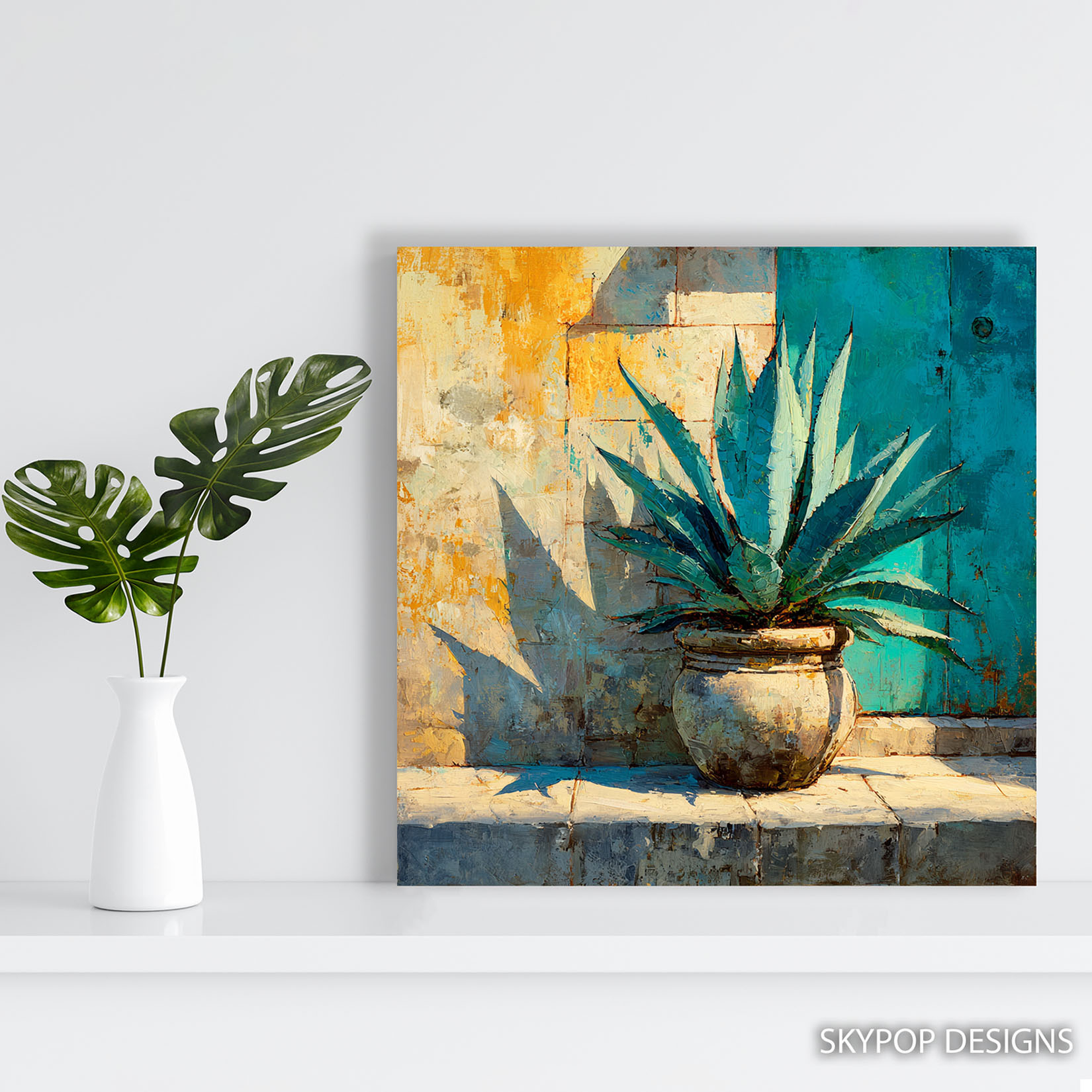 Add a touch of serene desert beauty to your home with this stunning agave canvas wall art. This captivating poster or canvas wall art features a vibrant agave plant in a rustic pot, set against a textured wall with a striking teal door. The abstract brushstrokes and warm color palette, featuring shades of gold, teal, and grey, create a visually dynamic piece that transforms any space. Perfect for living rooms, sunrooms, or entryways, this nature-inspired artwork brings a sense of calm and sophistication. Ideal for bohemian and coastal decor styles, this agave print enhances Tuscan settings with authentic charm. The striking contrast between the plant’s sharp lines and the soft textures of the wall makes this canvas wall art a captivating focal point. High-quality printing ensures the rich colors and painterly details are preserved, making each piece a unique work of art. This versatile wall decor piece adds a touch of the outdoors to your indoor living spaces, creating a relaxing ambiance. Whether displayed in a vibrant sunroom or a contemporary entryway, this artwork inspires tranquility and natural beauty. Elevate your home decor with this eye-catching agave canvas art, a perfect gift for housewarmings or birthdays. Embrace the beauty of nature and transform your walls with this exquisite agave poster. Let this striking piece bring a breath of fresh air and a warm, inviting feel to your home today.