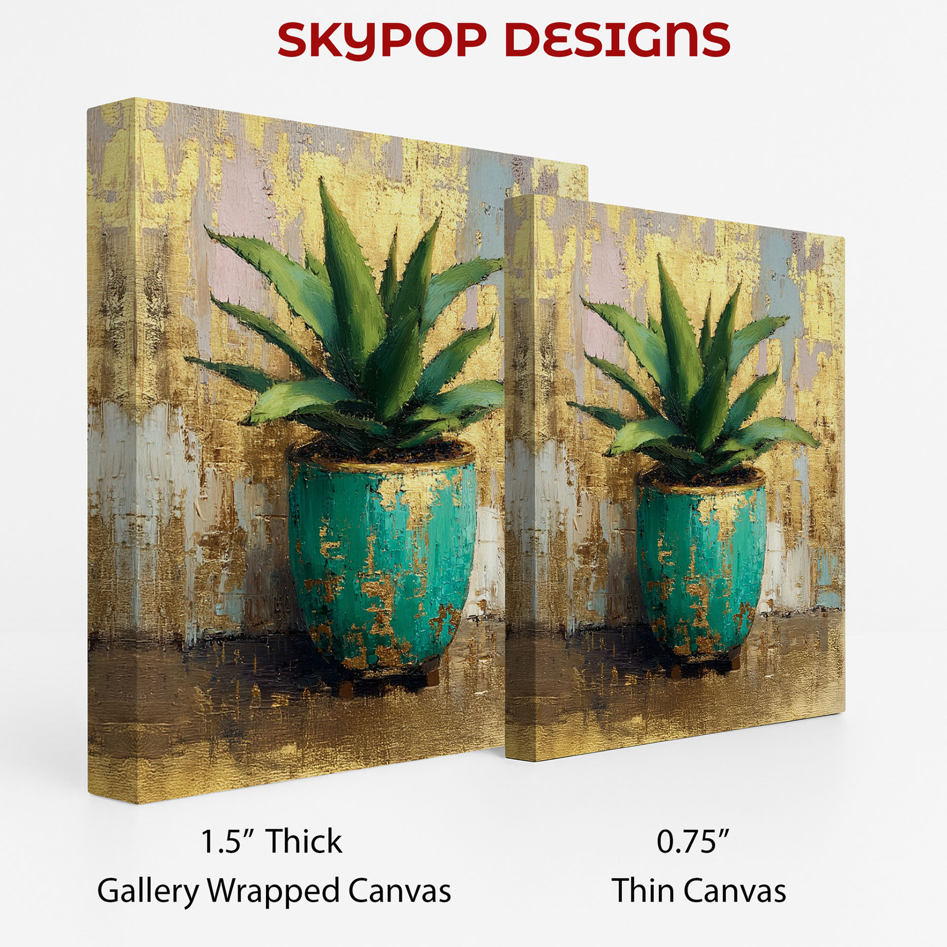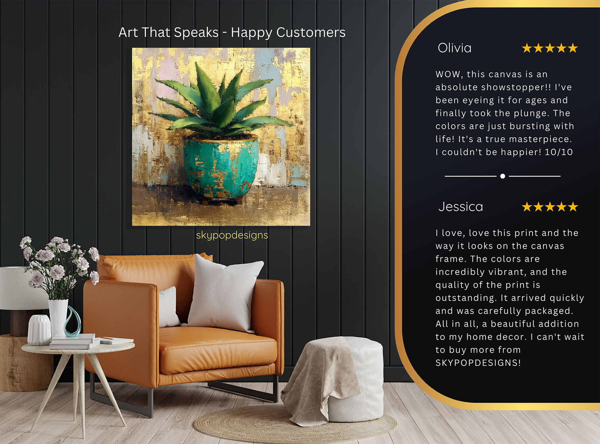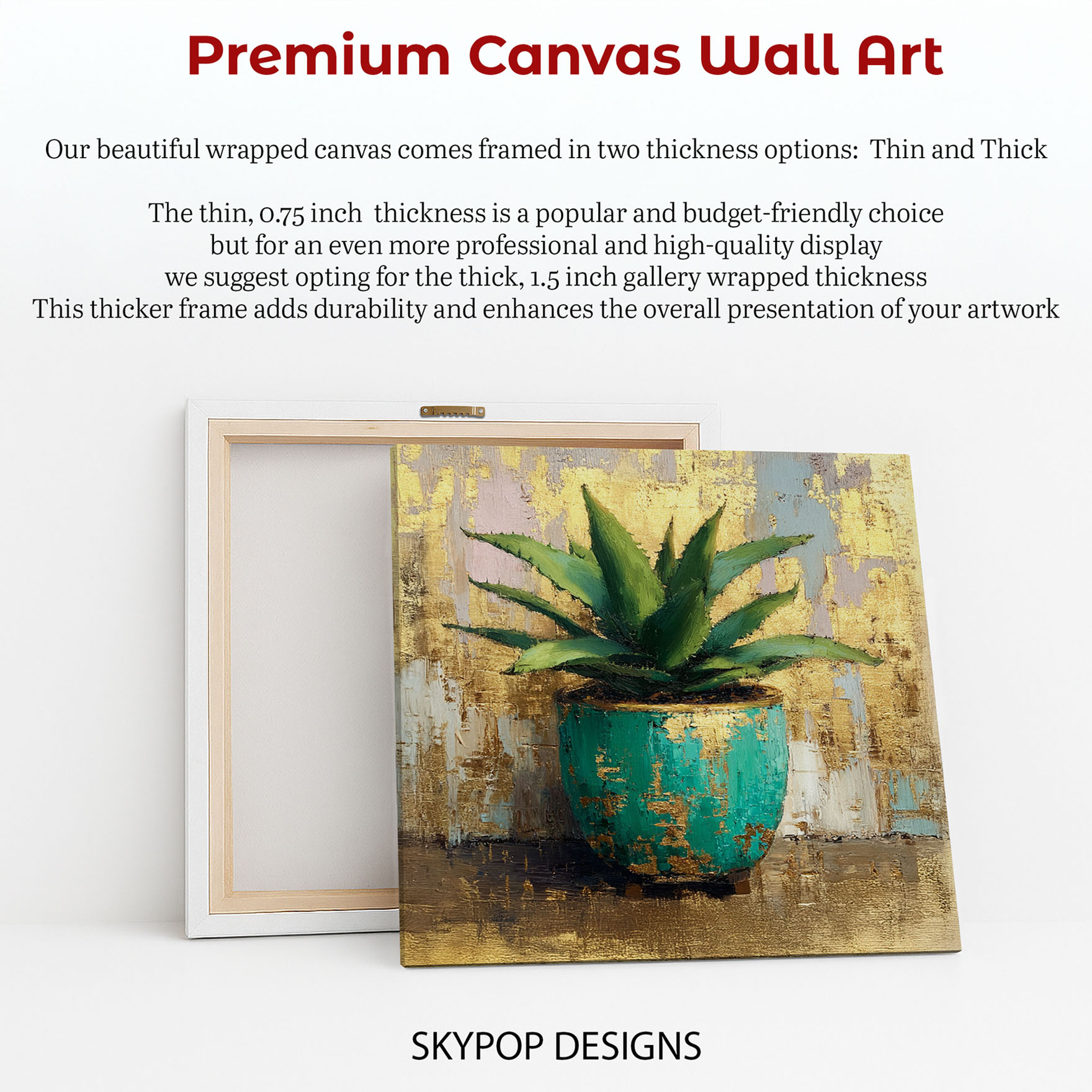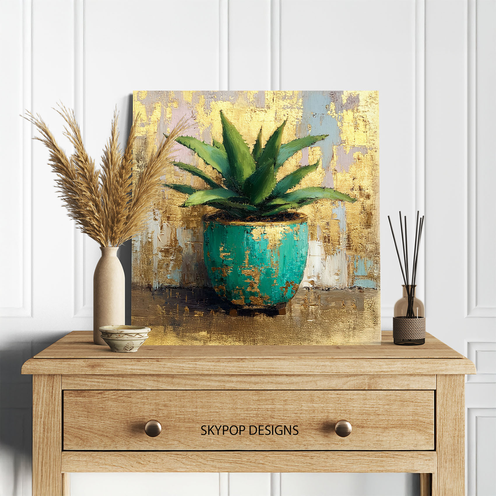 Elevate your home with this exquisite canvas wall art featuring a striking aloe vera plant in a vibrant teal pot. This poster or canvas wall art embodies modern contemporary style with a touch of glam, perfectly complementing bohemian decor. The rich gold textured background creates a luxurious feel, making this piece an ideal focal point for your living room or entryway wall art. The deep green aloe plant symbolizes resilience and growth, bringing a sense of natural calm and sophistication to any space. This eye-catching artwork is a perfect addition to a modern office or a serene bedroom, infusing the room with vibrant color and elegant design. The interplay of textures and colors in this canvas wall art adds depth and visual interest, making it a conversation starter. It serves as a beautiful, refreshing accent for any home, enhancing your wall decor with its unique artistic expression. This versatile plant art is also a fantastic housewarming gift or a special birthday present for lovers of stunning wall art. The high-quality printing ensures the vibrant teal of the pot and the lush green of the plant are captured with exceptional detail. Transform your home’s atmosphere with this captivating piece that combines nature and abstract elements for timeless appeal. Add a touch of modern artistry and refined elegance to your interior design today with this stunning canvas print.