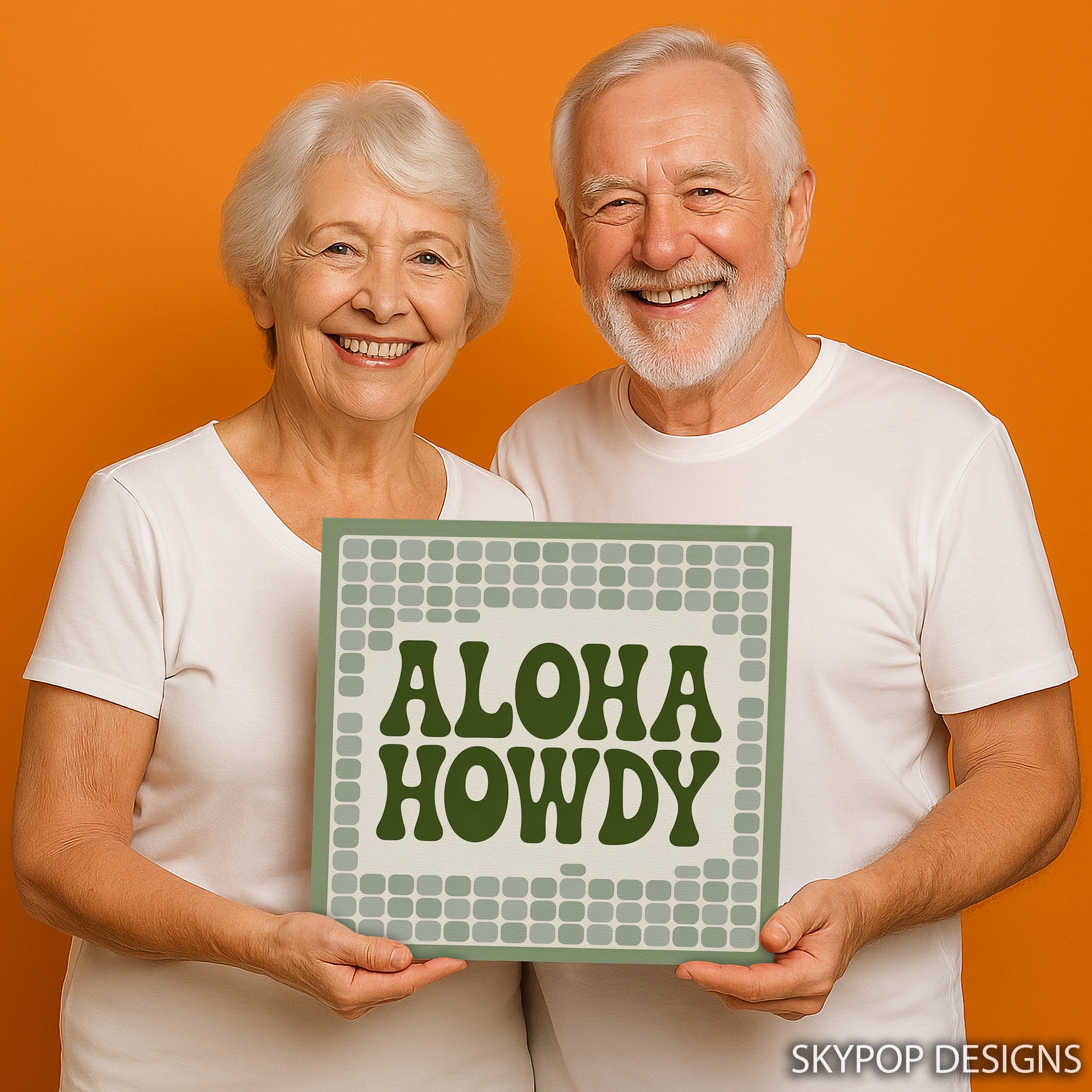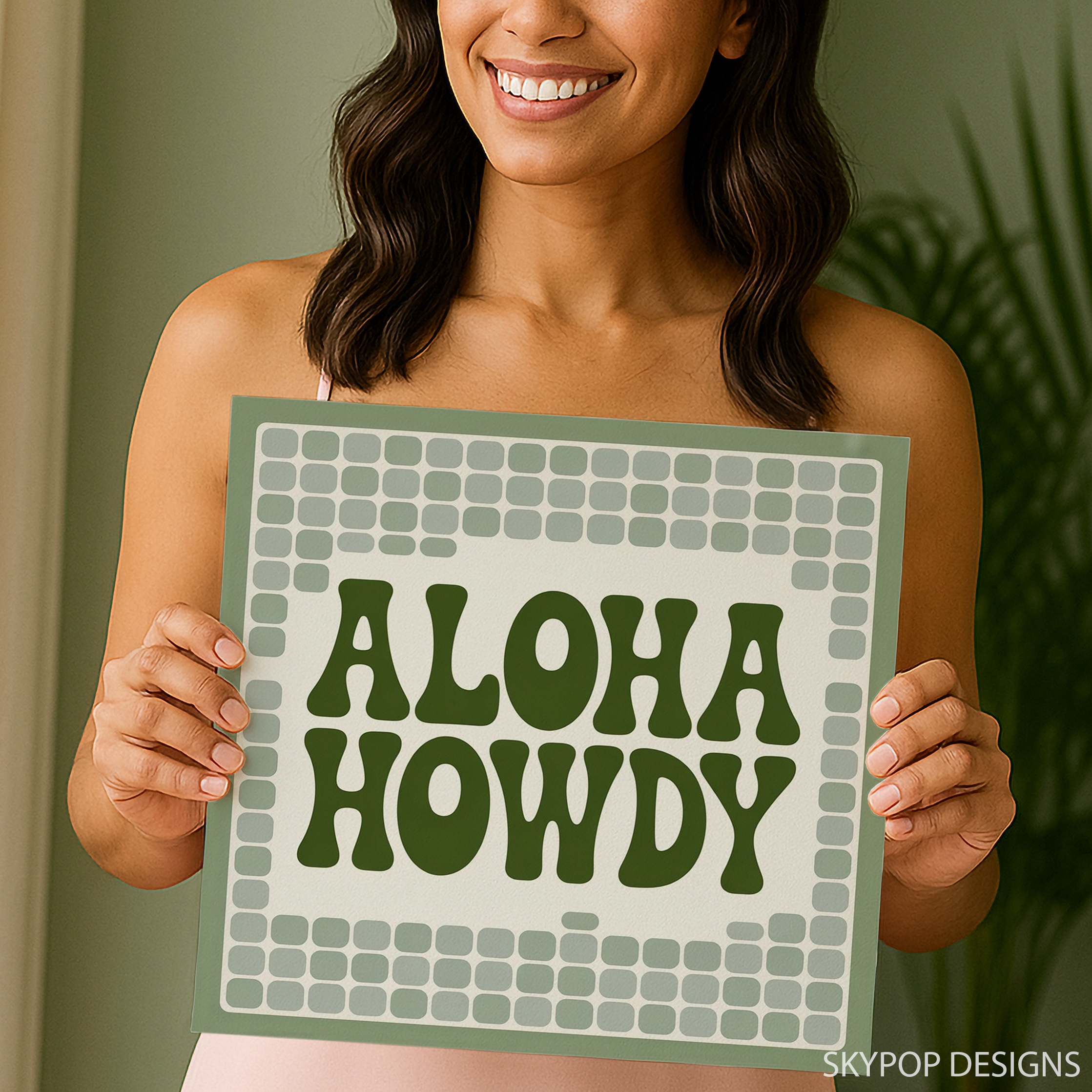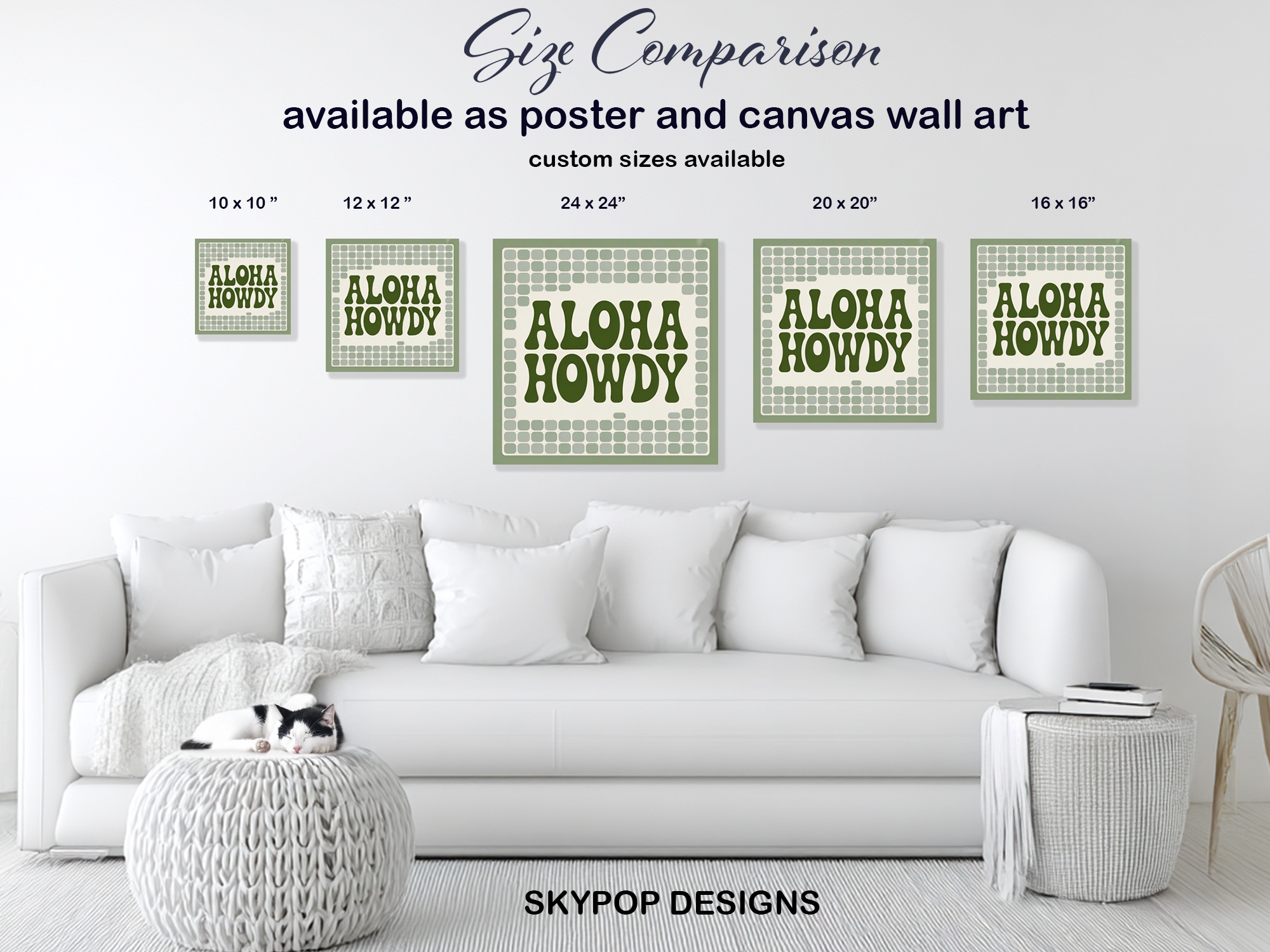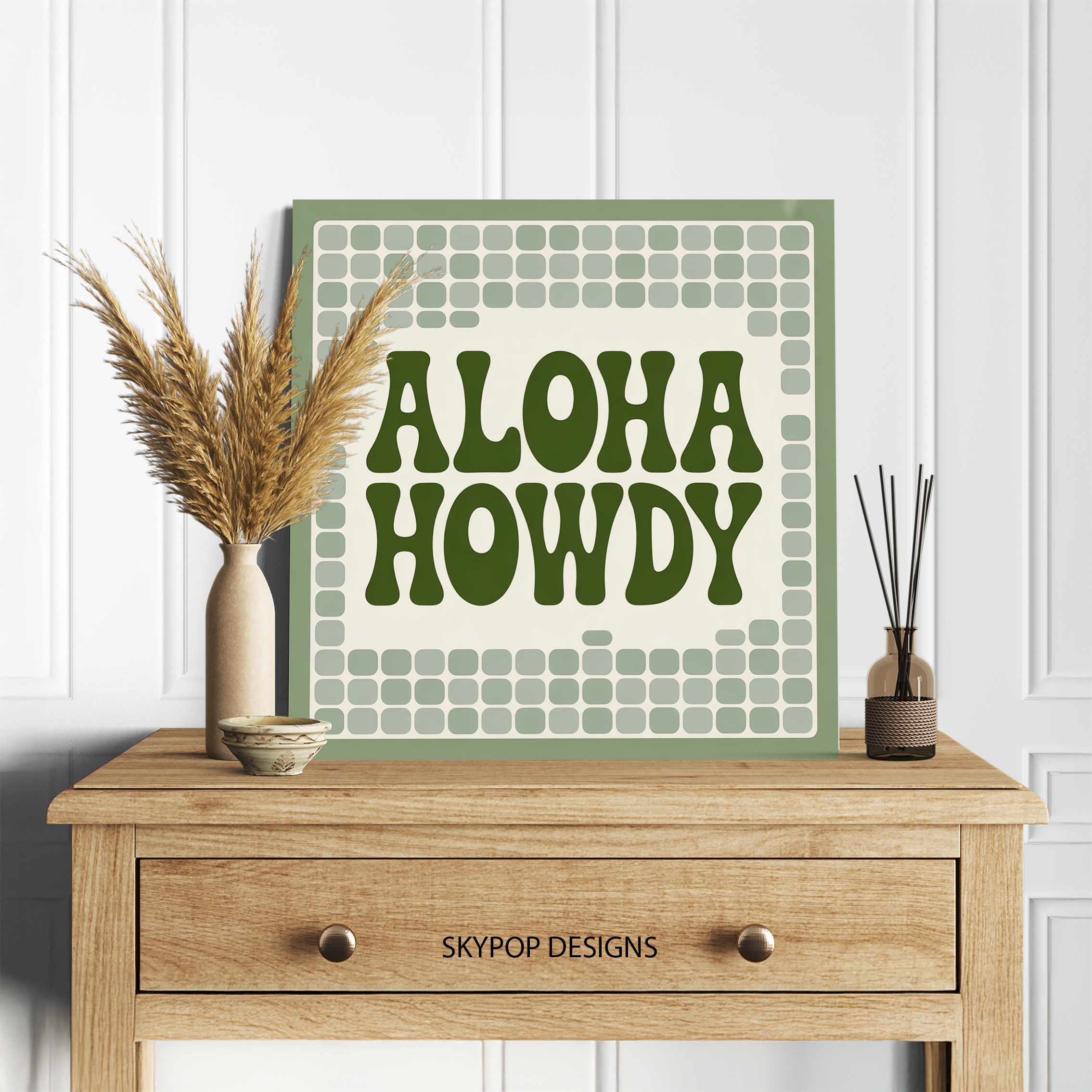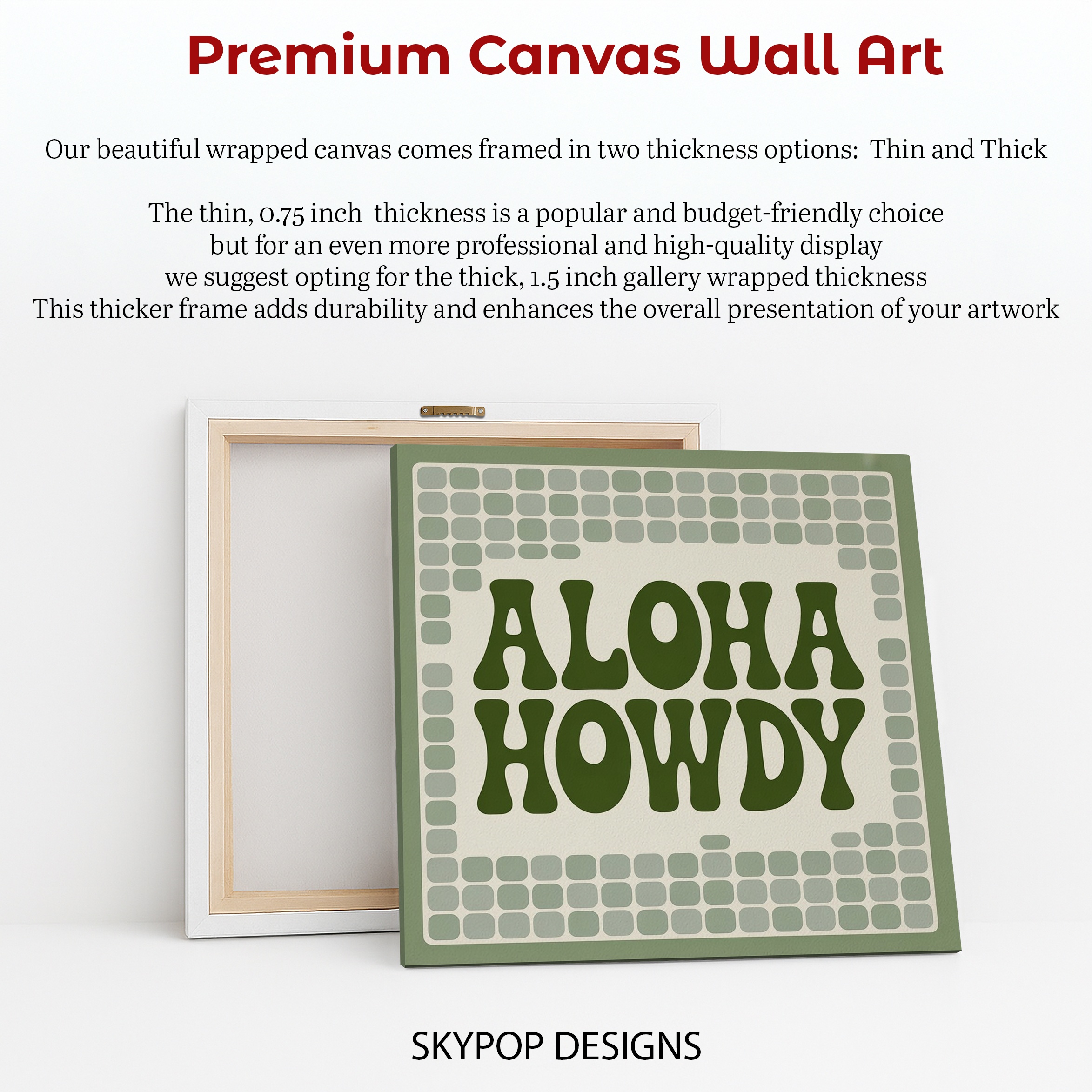 Bring a fun retro vibe to your space with this eye-catching Aloha Howdy canvas wall art. The quirky blend of Hawaiian and Western greetings creates an instant conversation starter that adds personality to any room. Perfect for mid-century modern enthusiasts or those looking to inject some vintage charm into their contemporary decor, this poster combines bold typography with a muted color palette for a stylish impact. The chunky, groovy lettering in deep green pops against the light background, creating a focal point that draws the eye and lifts the mood. Ideal for livening up a neutral living room, adding character to a bedroom, or bringing a touch of whimsy to a home office. The retro-inspired design evokes nostalgia while remaining fresh and relevant, making it a versatile piece that works in various interior styles. Whether you’re a fan of bohemian eclectic decor or prefer clean, modern lines, this canvas art adapts effortlessly. The playful message spreads good vibes and creates a welcoming atmosphere, perfect for entryways or as a cheerful addition to gallery walls. High-quality printing ensures crisp details and rich colors that will last for years. Elevate your wall decor with this unique blend of aloha spirit and howdy charm – it’s sure to make you and your guests smile every time you see it. Transform your space with this delightful retro-inspired artwork today!