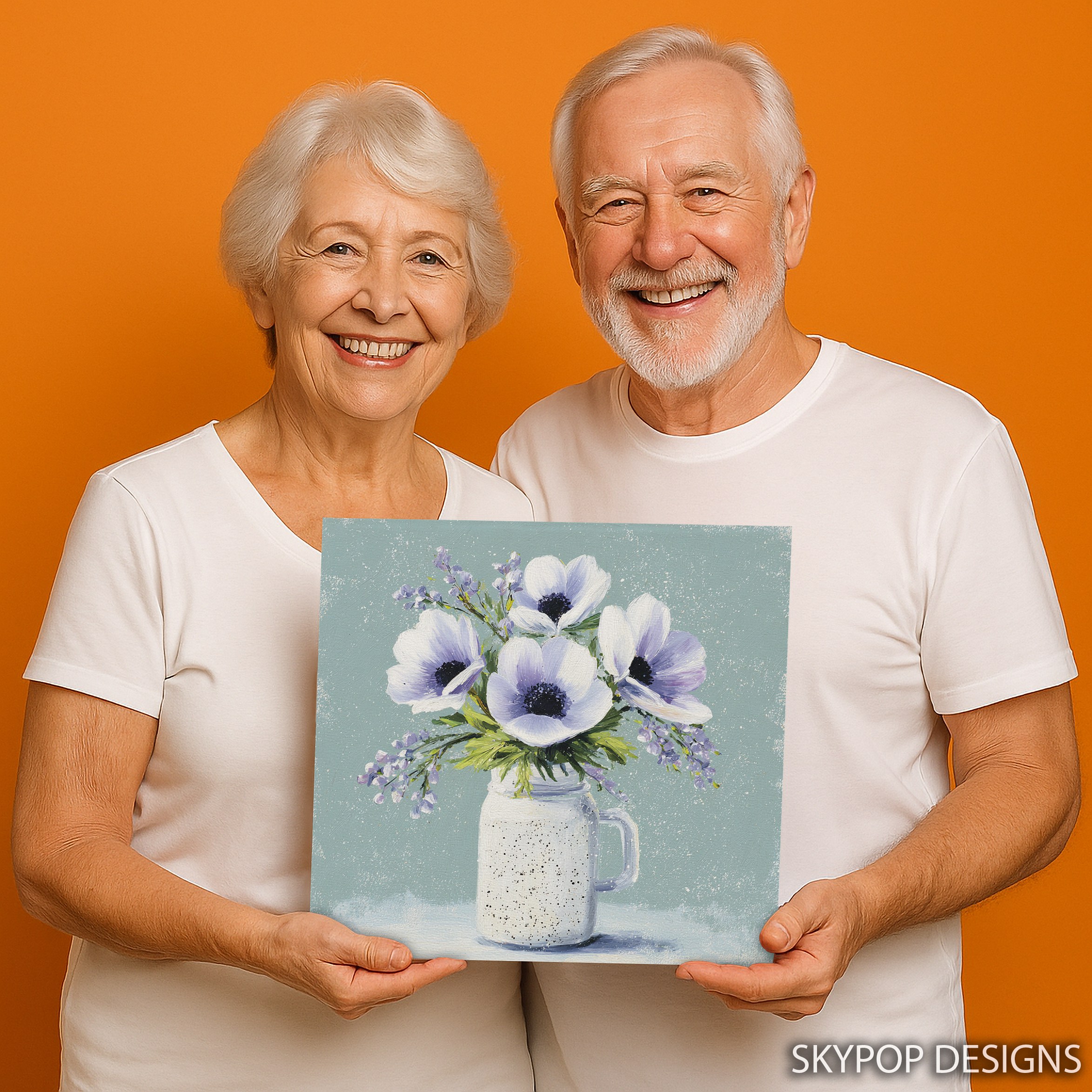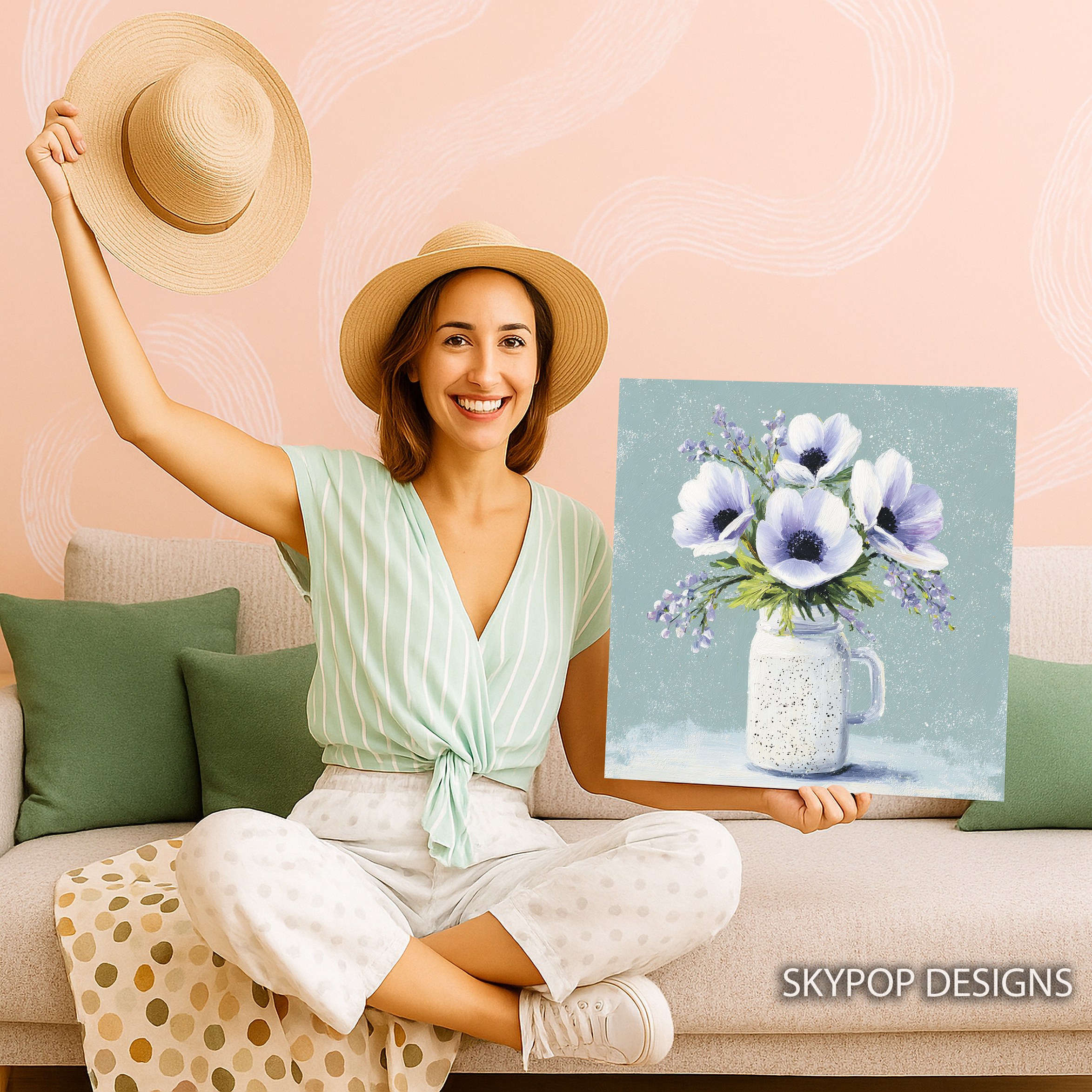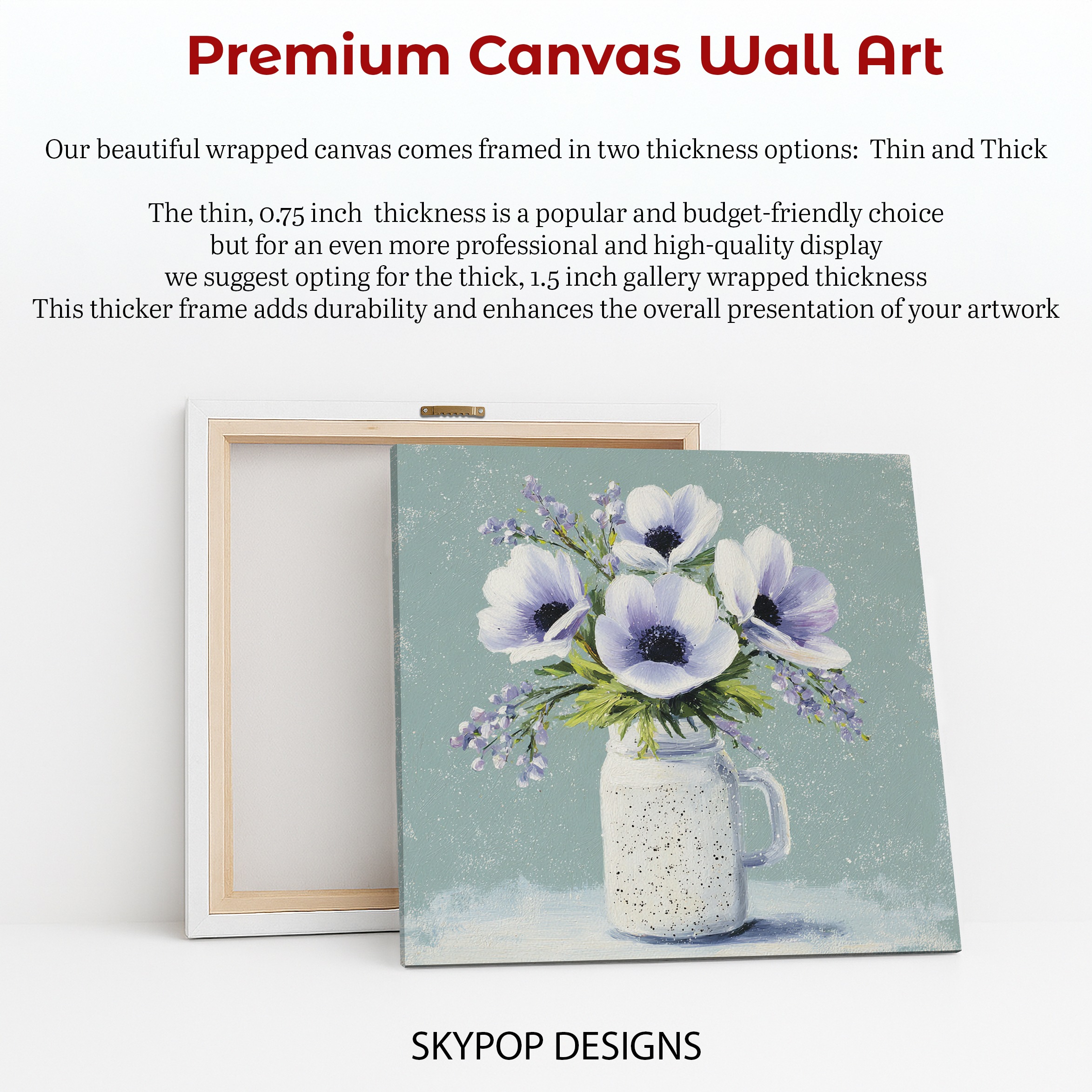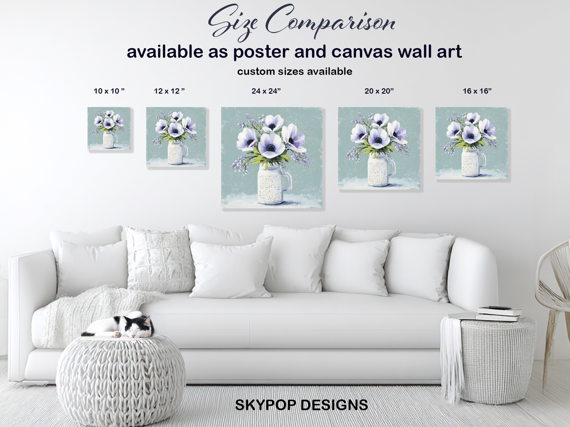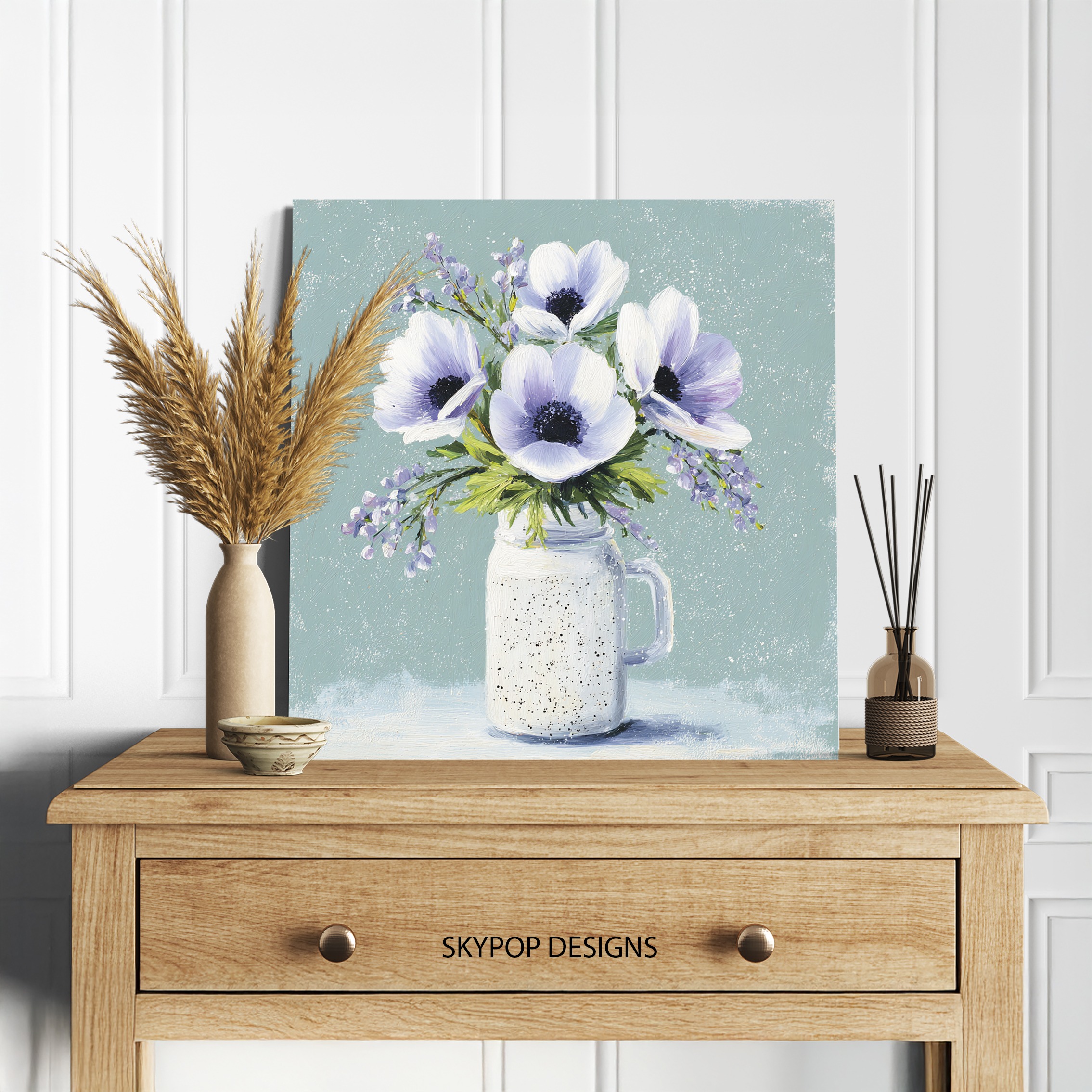 Bring a touch of springtime elegance into your home with this stunning anemone bouquet canvas wall art. The delicate white and purple anemone flowers pop against a soft blue-green background, creating a serene and inviting atmosphere in any room. This beautiful poster or canvas print showcases a charming farmhouse-style arrangement in a speckled white pitcher, perfect for adding a cozy, rustic touch to your living room or bedroom decor. The subtle color palette of whites, purples, and greens harmonizes effortlessly with various interior styles, from shabby chic to contemporary Scandinavian. Ideal for brightening up a dining room or adding a fresh, natural element to a bathroom, this versatile piece of wall art brings the beauty of nature indoors. The textured brushstrokes and soft, dreamy quality of the painting create a soothing ambiance, making it a perfect addition to spaces where you want to relax and unwind. Whether you’re looking for a housewarming gift or wanting to refresh your own space, this anemone bouquet artwork offers timeless appeal and versatility. The high-quality print captures every delicate petal and leaf, ensuring this piece remains a captivating focal point from any angle. Transform your home with this charming floral canvas art that celebrates the simple beauty of freshly picked flowers, adding a touch of romance and tranquility to your everyday surroundings.