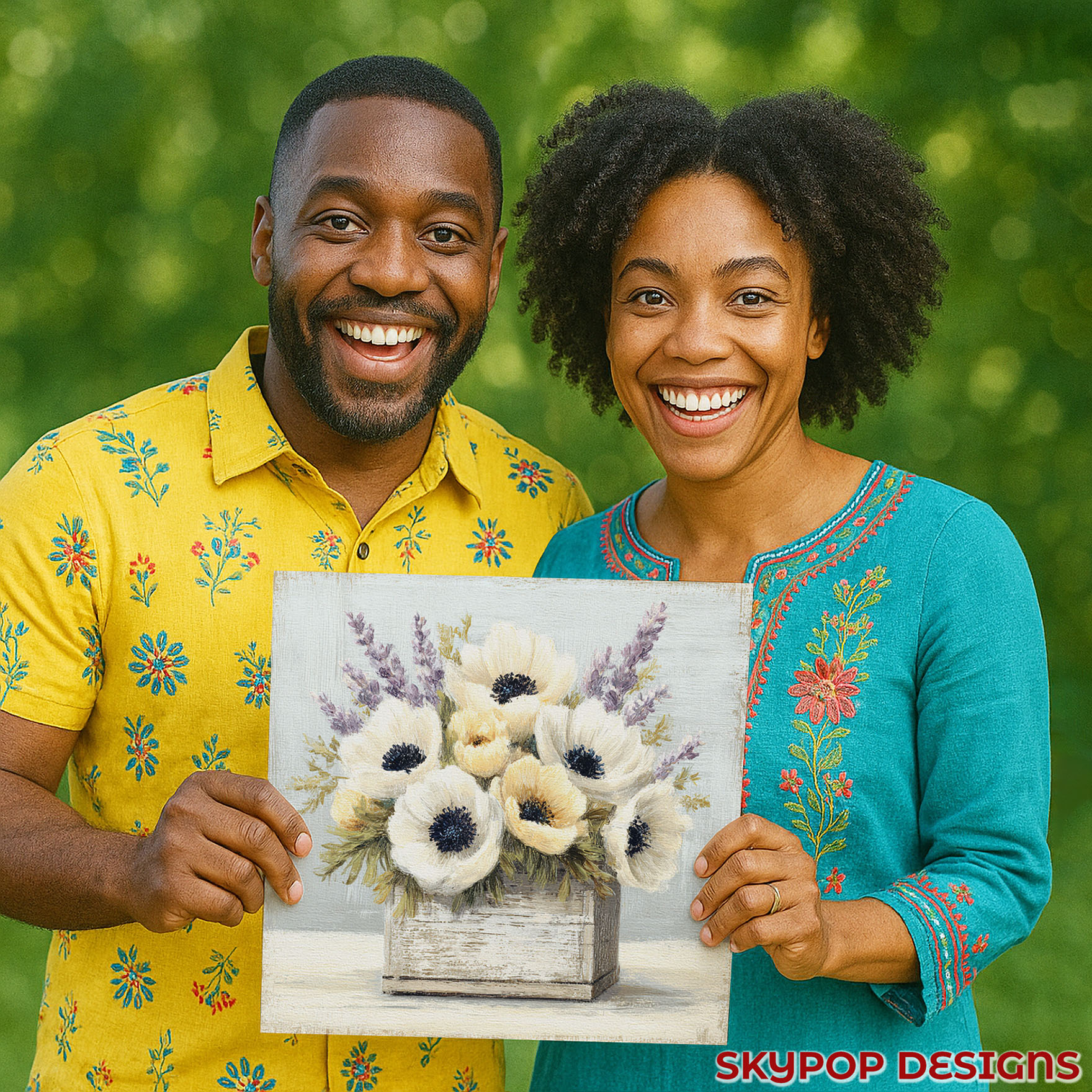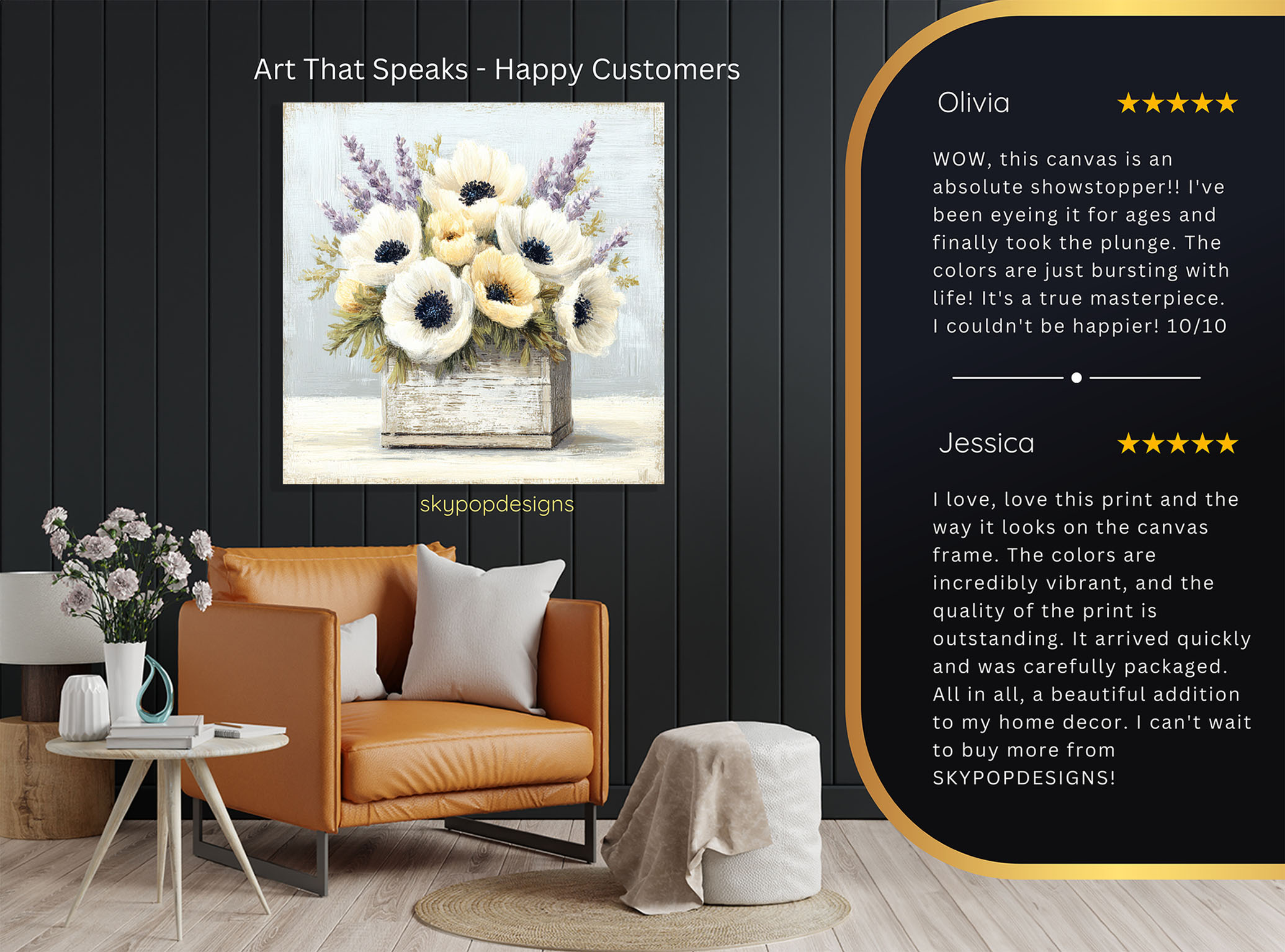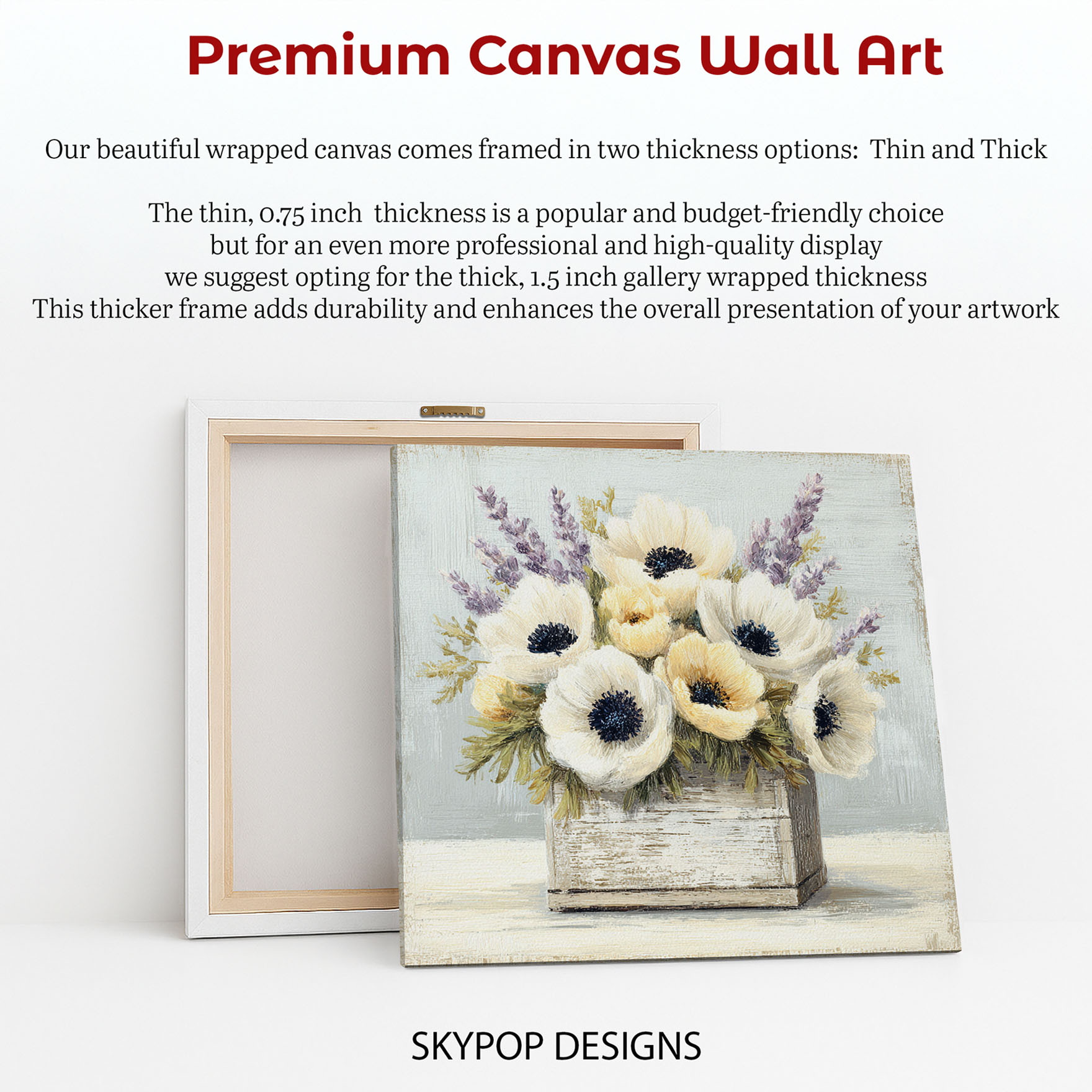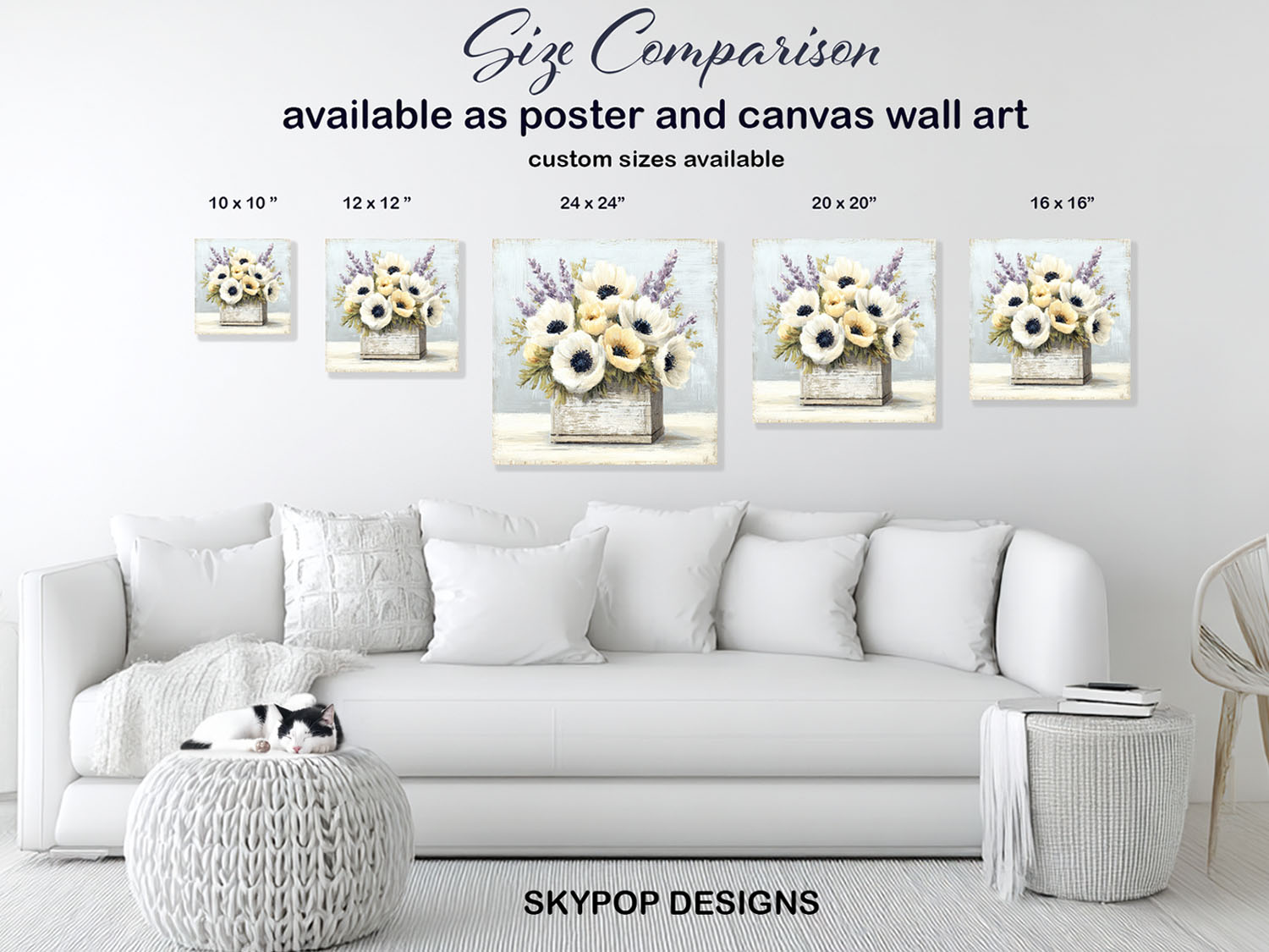Transform your space with this beautiful anemone wall art, a stunning canvas that brings the gentle beauty of nature indoors. This poster or canvas wall art features a charming arrangement of white anemones and soft lavender stems nestled in a rustic wooden box, perfect for elevating your living room decor. The delicate white petals and muted purple hues create a serene and inviting atmosphere, ideal for farmhouse or coastal style homes. This floral art piece is a lovely addition to any bedroom or dining room, bringing a touch of timeless elegance and natural charm. The soft, natural color palette of white, beige, and subtle blues promotes a sense of tranquility and peace, making it a perfect focal point for relaxation. This high-quality canvas wall art captures the painterly texture and intricate details of each bloom, offering a captivating visual experience. Whether you’re refreshing your home decor or searching for a thoughtful housewarming or birthday gift, this versatile floral artwork suits various tastes and occasions. Enhance your entryway or any wall with this eye-catching anemone artwork, a reminder of nature’s simple wonders. Embrace the rustic charm and serene beauty of this unique poster and canvas wall art selection. Elevate your home’s aesthetic with this captivating floral canvas art today.