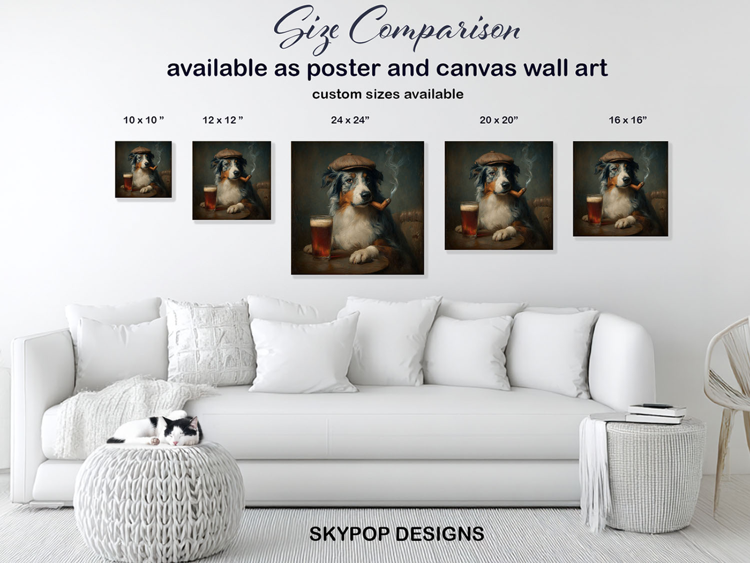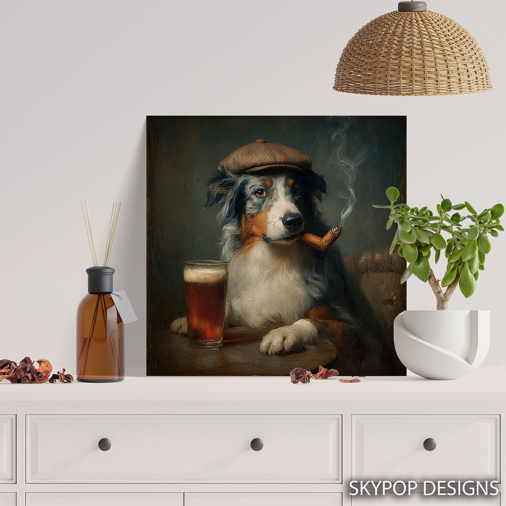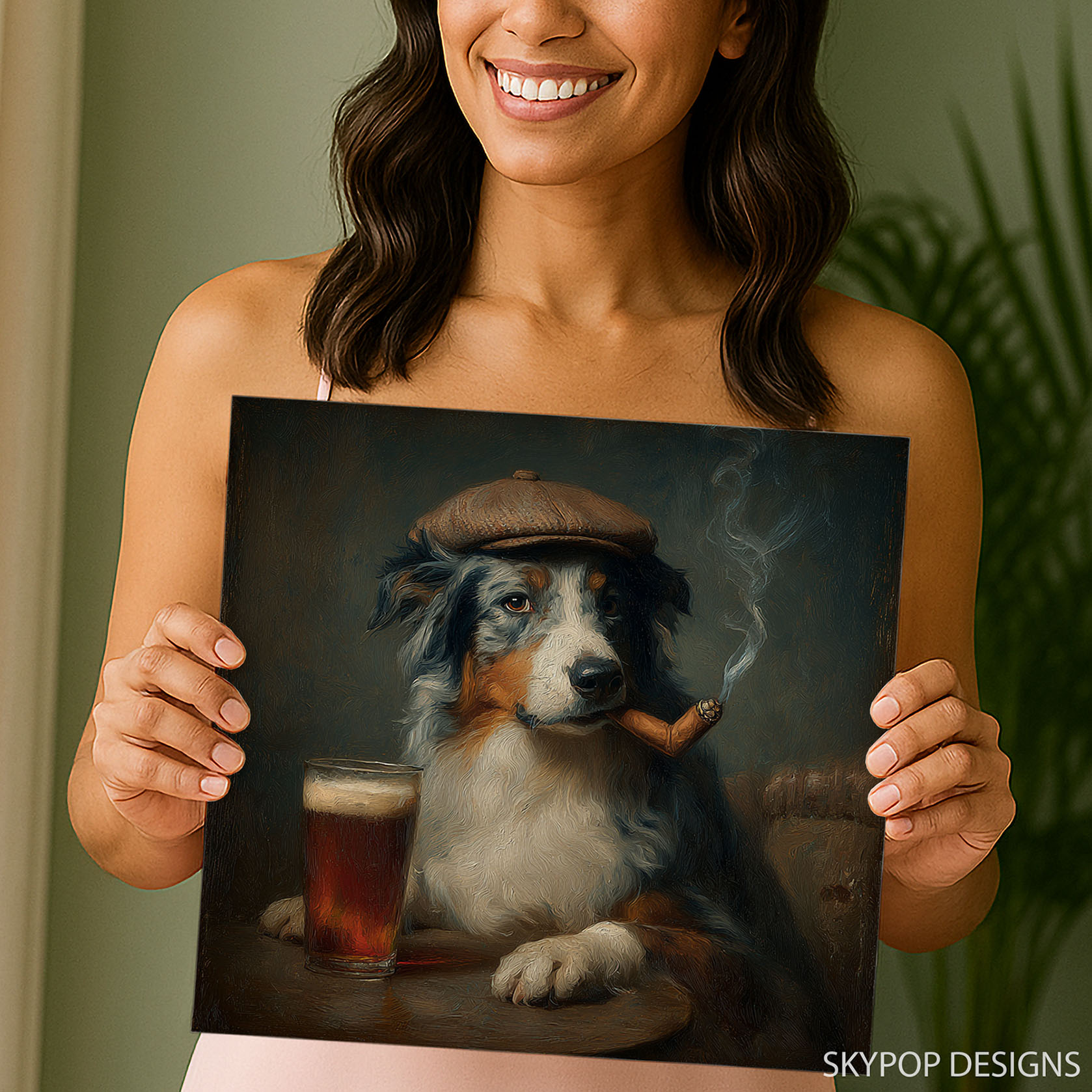 Transform your space with this distinguished gentleman dog canvas wall art, featuring a charming Australian Shepherd enjoying a cigar and a pint. This classic art piece or poster is ideal for creating a sophisticated atmosphere in your living room, study, or game room. The rich brown and gold tones exude warmth and character, perfect for traditional or Victorian decor styles. This animal art will elevate any office space, offering a unique blend of humor and elegance. The Australian Shepherd, depicted with a cap and cigar, brings a touch of vintage charm and personality to your home, making it a captivating conversation starter. This poster or canvas wall art showcases a playful yet refined aesthetic, celebrating the joy of relaxation and good company. High-quality printing ensures every brushstroke and subtle detail of the dog’s fur and the beer’s foam are masterfully captured. Its striking composition makes it a perfect focal point for rustic interiors or a distinctive addition to eclectic decor. Whether you’re looking for a unique housewarming gift, a birthday present for a dog lover, or simply want to enhance your wall decor, this artwork is a standout choice. Its timeless appeal and artisanal quality make it a cherished addition to any art collection. Enhance your home’s charm and character with this whimsical yet classic portrayal of a canine companion. Embrace the artistry and personality that this unique canvas wall art brings to your everyday life. Add this distinguished gentleman to your wall art collection today.