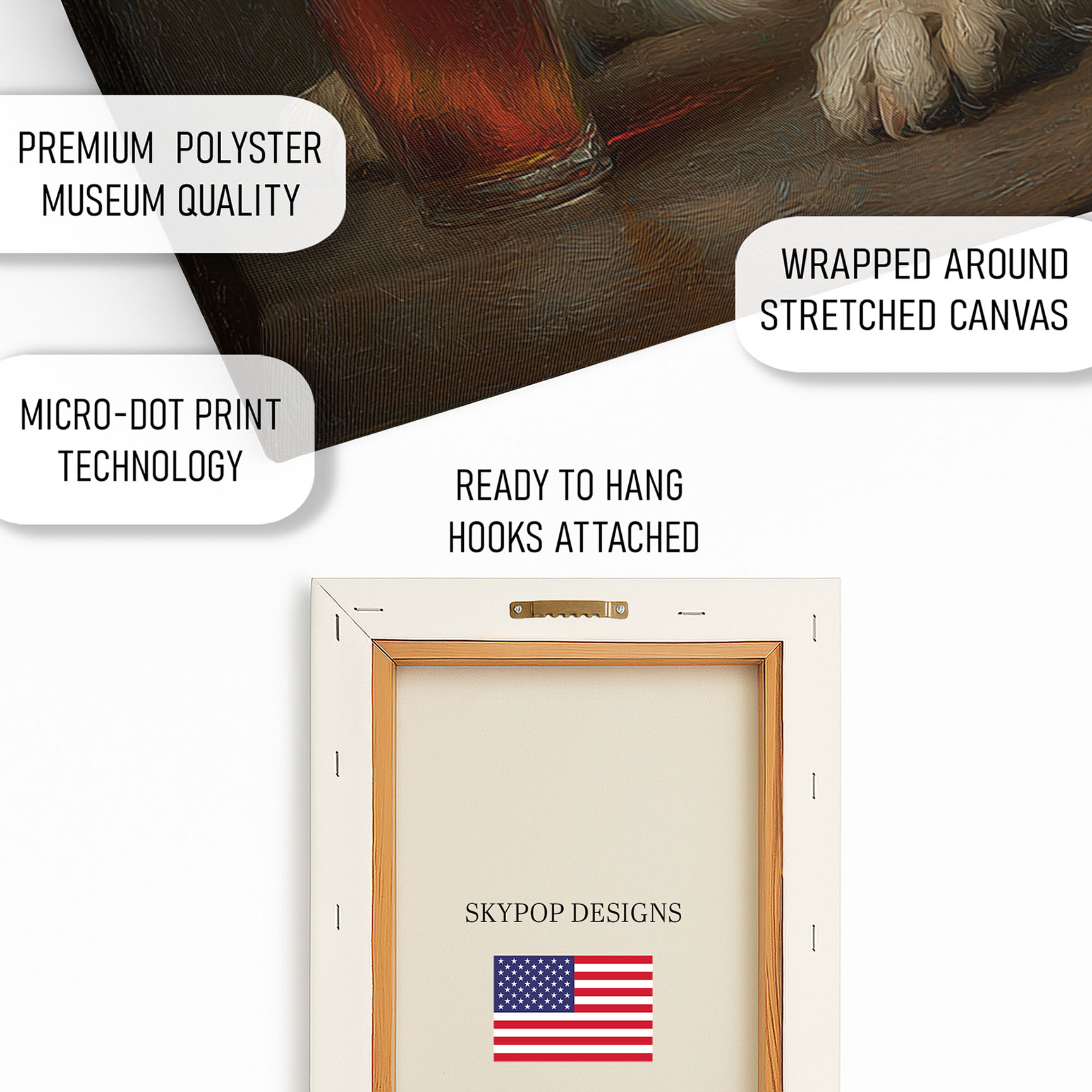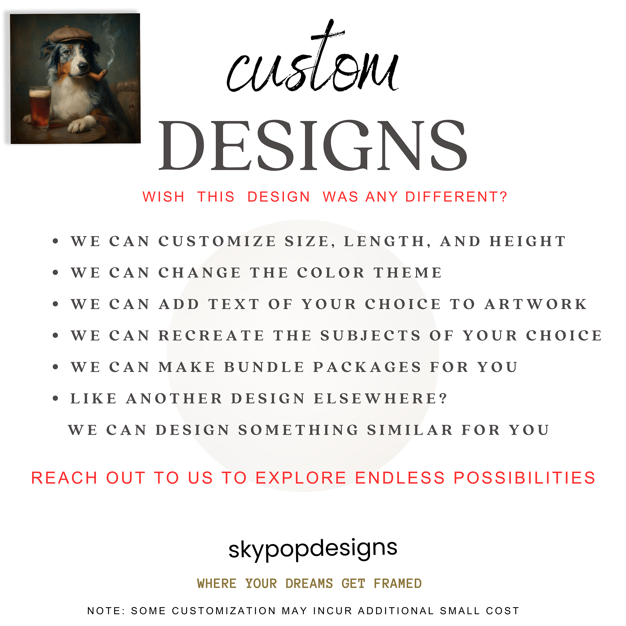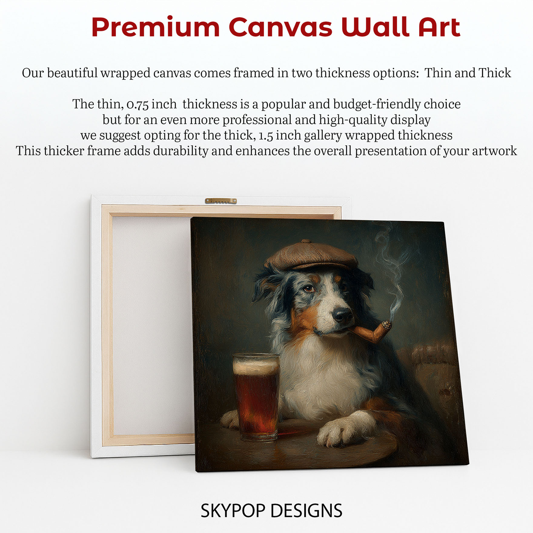 Transform your space with this distinguished gentleman dog canvas wall art, featuring a charming Australian Shepherd enjoying a cigar and a pint. This classic art piece or poster is ideal for creating a sophisticated atmosphere in your living room, study, or game room. The rich brown and gold tones exude warmth and character, perfect for traditional or Victorian decor styles. This animal art will elevate any office space, offering a unique blend of humor and elegance. The Australian Shepherd, depicted with a cap and cigar, brings a touch of vintage charm and personality to your home, making it a captivating conversation starter. This poster or canvas wall art showcases a playful yet refined aesthetic, celebrating the joy of relaxation and good company. High-quality printing ensures every brushstroke and subtle detail of the dog’s fur and the beer’s foam are masterfully captured. Its striking composition makes it a perfect focal point for rustic interiors or a distinctive addition to eclectic decor. Whether you’re looking for a unique housewarming gift, a birthday present for a dog lover, or simply want to enhance your wall decor, this artwork is a standout choice. Its timeless appeal and artisanal quality make it a cherished addition to any art collection. Enhance your home’s charm and character with this whimsical yet classic portrayal of a canine companion. Embrace the artistry and personality that this unique canvas wall art brings to your everyday life. Add this distinguished gentleman to your wall art collection today.