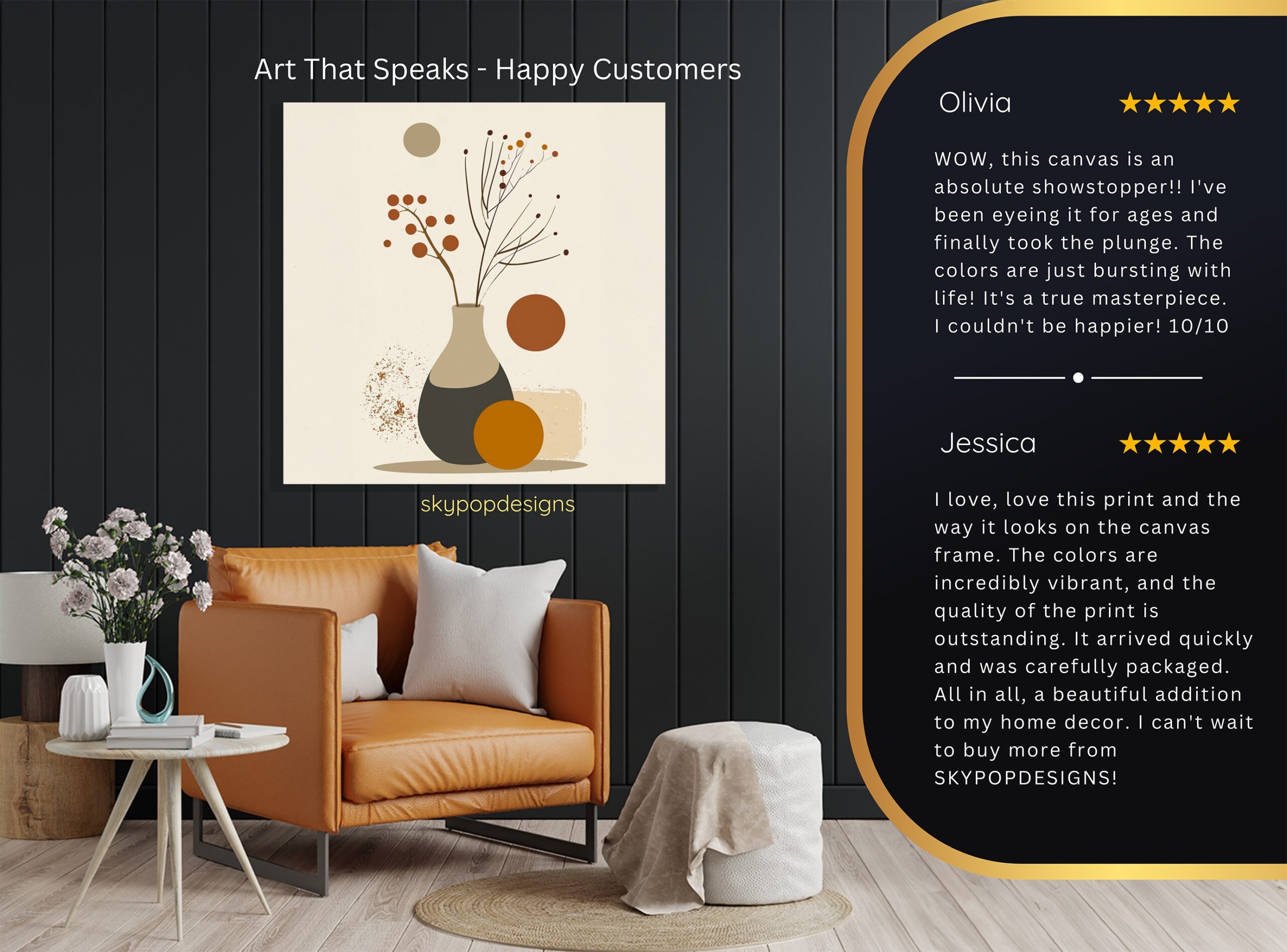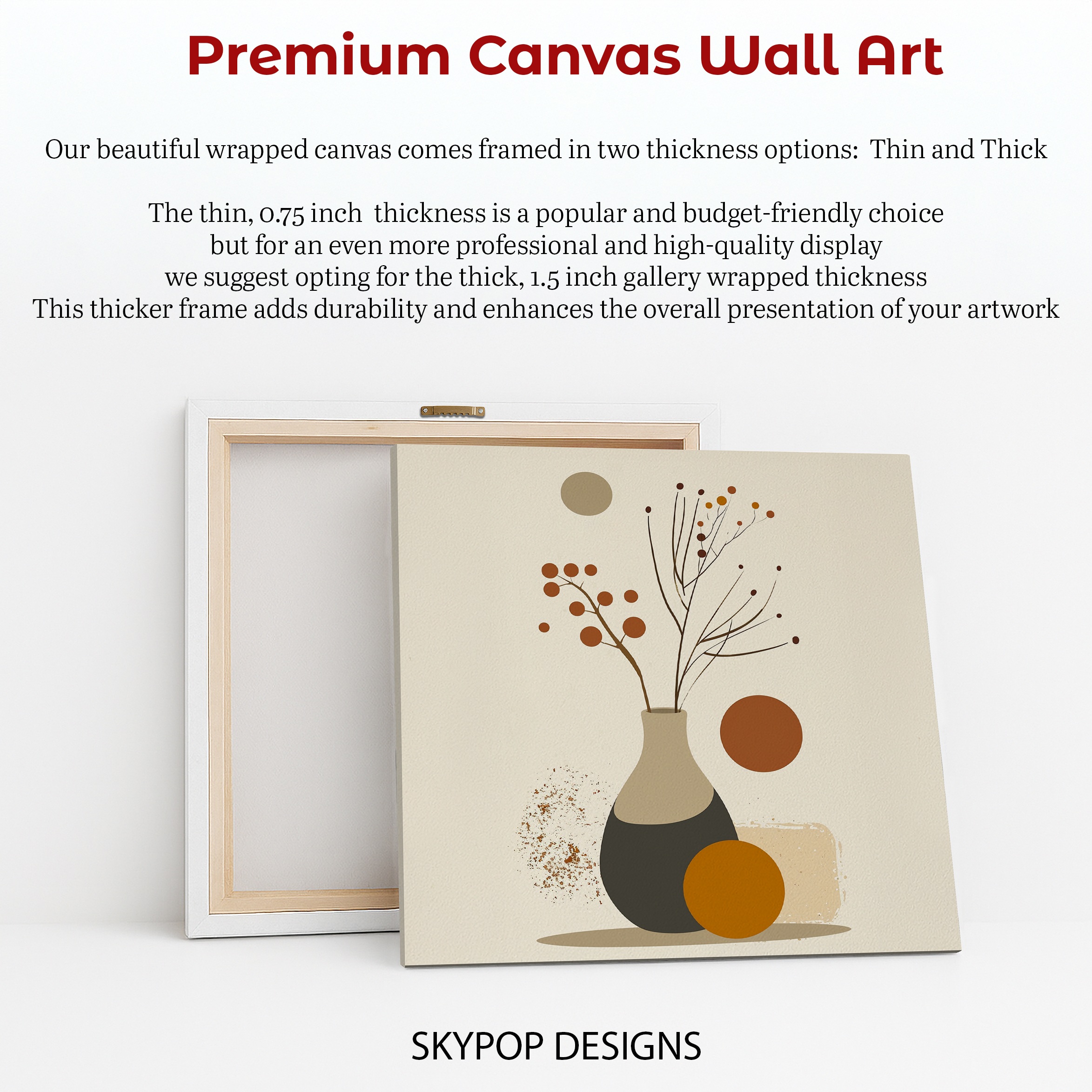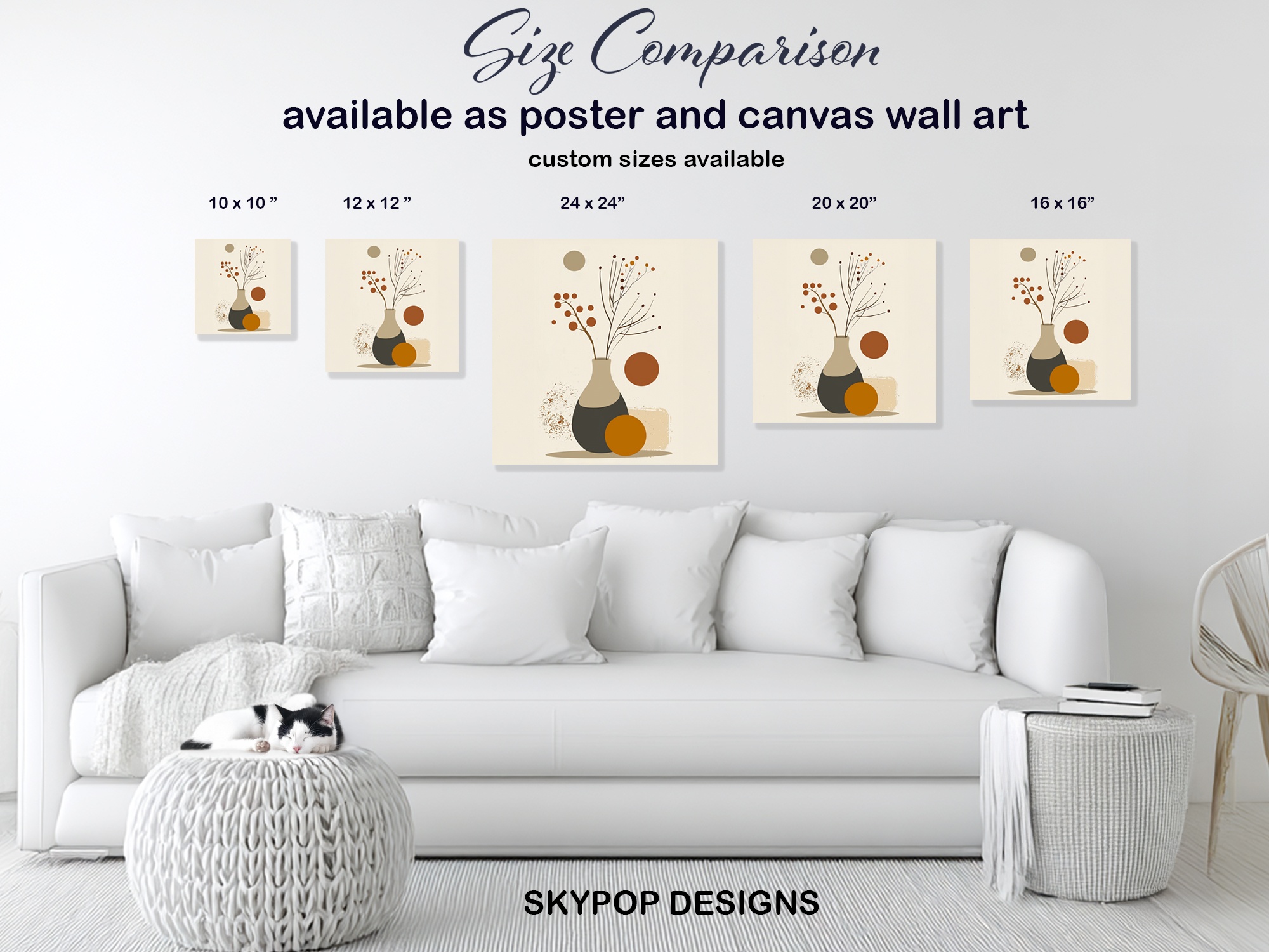 Elevate your space with this striking autumn-inspired canvas wall art, featuring a sleek vase with delicate branches and berries. This contemporary poster transforms any room with its warm, earthy palette and minimalist design. Perfect for modern living rooms or Scandinavian-style bedrooms, this piece adds a touch of nature-inspired elegance to your decor. The abstract representation of fall foliage in shades of orange and brown creates a cozy, inviting atmosphere. Ideal for those who love minimalist wall art with a natural twist, this canvas seamlessly blends with various interior styles. The geometric shapes and clean lines offer a fresh take on botanical art, making it a versatile choice for dining rooms or home offices. This eye-catching poster serves as a focal point, sparking conversations and adding visual interest to neutral spaces. High-quality printing ensures every detail of the textured background and delicate branch work stands out. Whether you’re redecorating for the season or searching for the perfect housewarming gift, this modern wall art fits the bill. The abstract nature scene brings a sense of calm and balance to any room, making it an excellent choice for meditation spaces or reading nooks. Enhance your home’s ambiance with this contemporary take on fall decor. Add this stunning autumn branches vase art to your wall collection today and breathe new life into your living space.