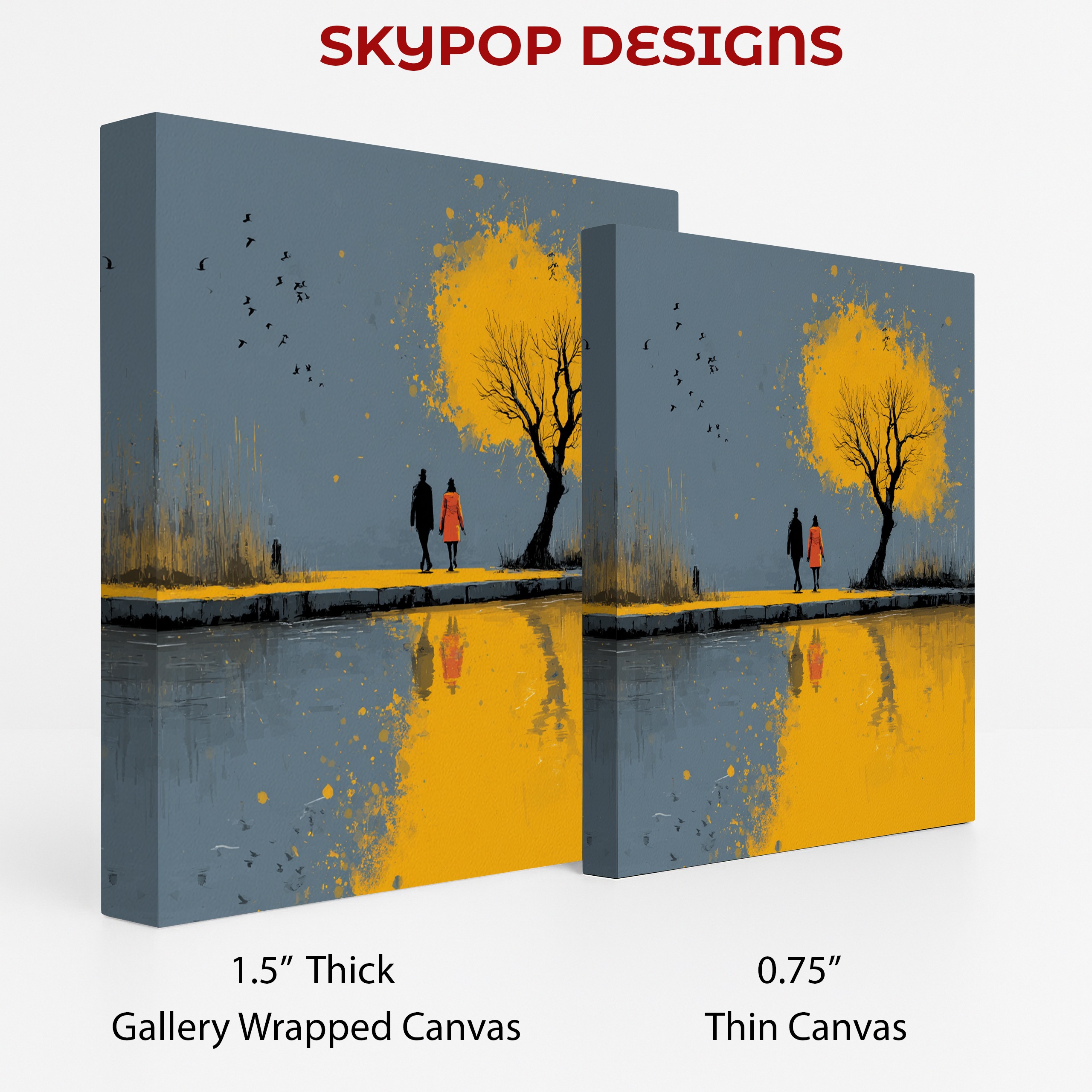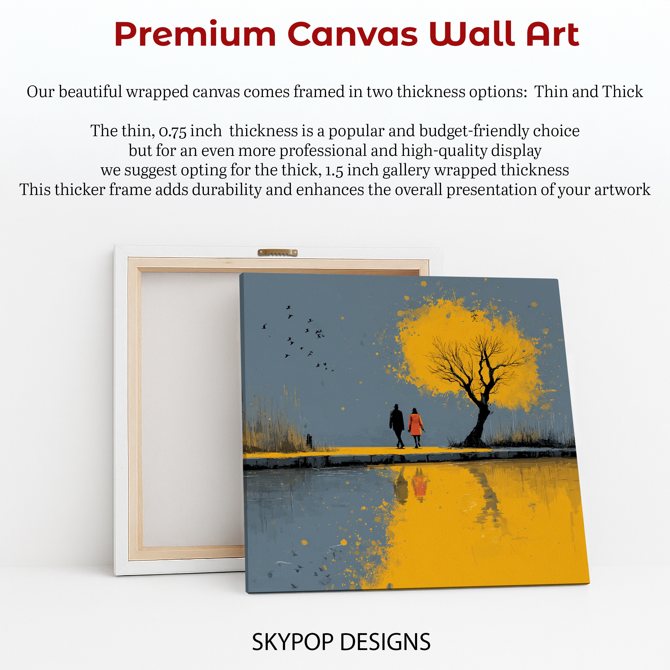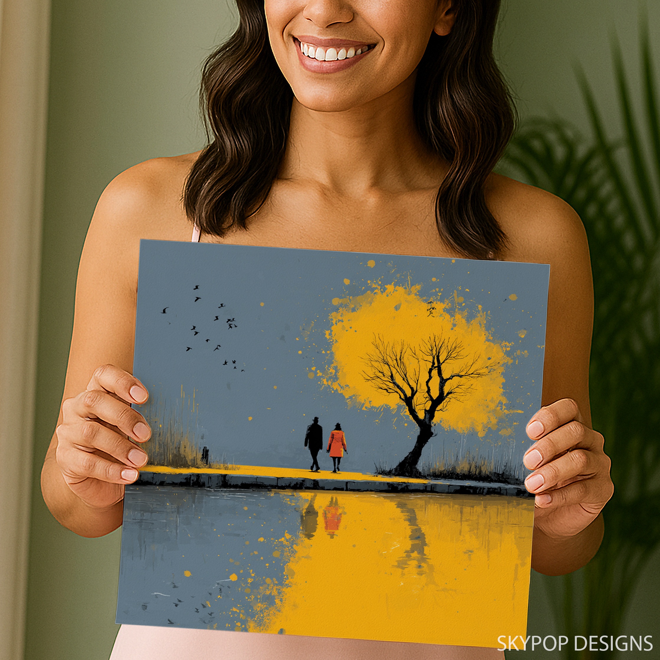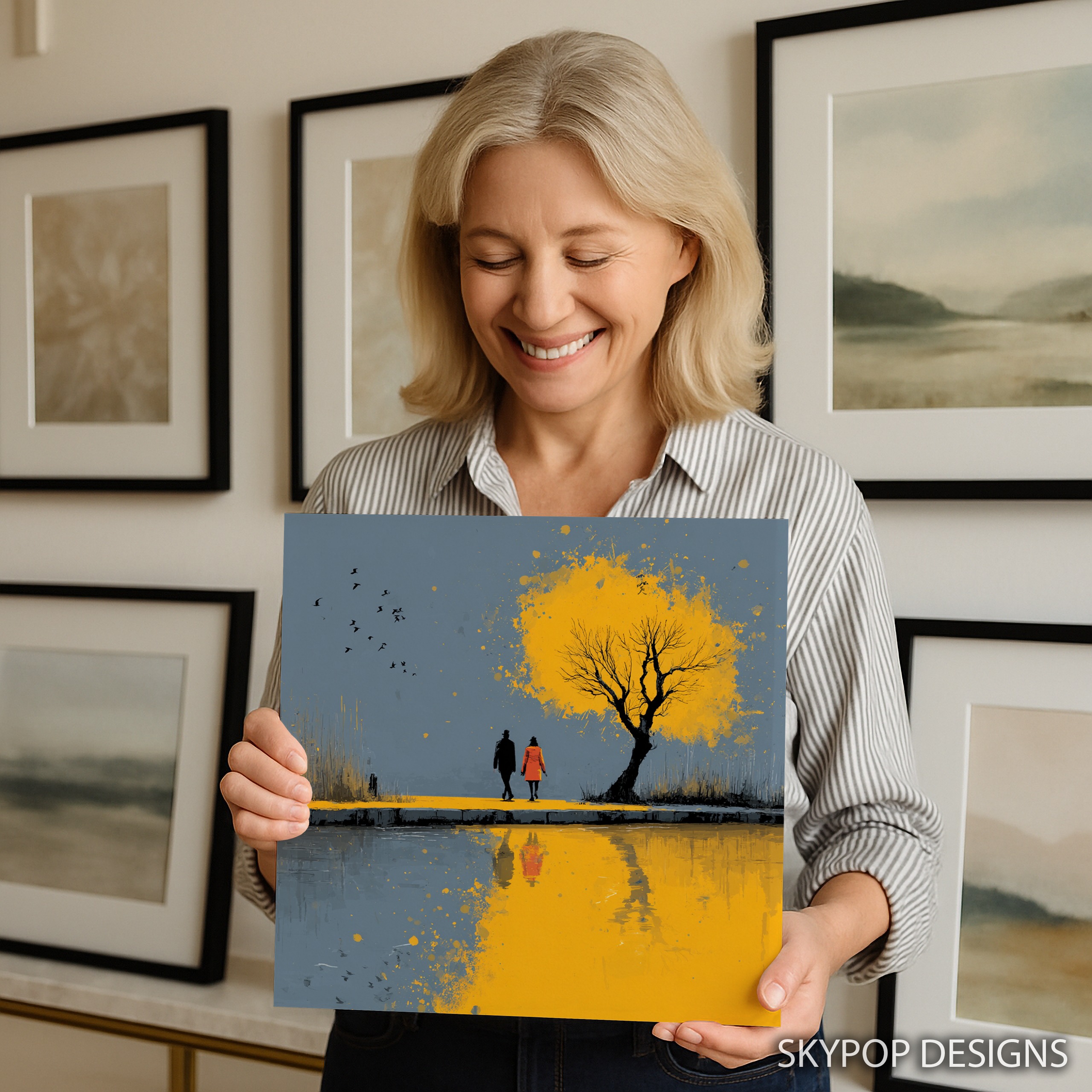 Transform your space with this captivating canvas wall art featuring a serene autumn scene. This striking poster showcases a minimalist landscape with a lone tree silhouetted against a vibrant yellow sun, creating a powerful focal point. The artwork’s reflection in still waters adds depth and intrigue, perfect for modern living room wall decor or a minimalist bedroom art piece. The contrasting colors – bold yellow against cool grey – evoke a sense of warmth and tranquility, ideal for enhancing your home’s atmosphere. This contemporary canvas art captures the essence of fall with its bare tree branches and flying birds, making it a versatile addition to any room seeking a touch of nature. The clean lines and simplified forms align beautifully with Scandinavian decor styles, while the emotional impact of the scene appeals to art lovers of all tastes. Whether displayed in a spacious dining room or a cozy office, this wall art brings the outdoors inside, creating a calming yet inspiring environment. The high-quality print ensures every detail, from the splattered paint effect to the delicate bird silhouettes, is rendered with clarity and precision. Gift this stunning piece for a housewarming or to celebrate the changing seasons. Elevate your space today with this modern, nature-inspired canvas that seamlessly blends artistic expression with contemporary design.