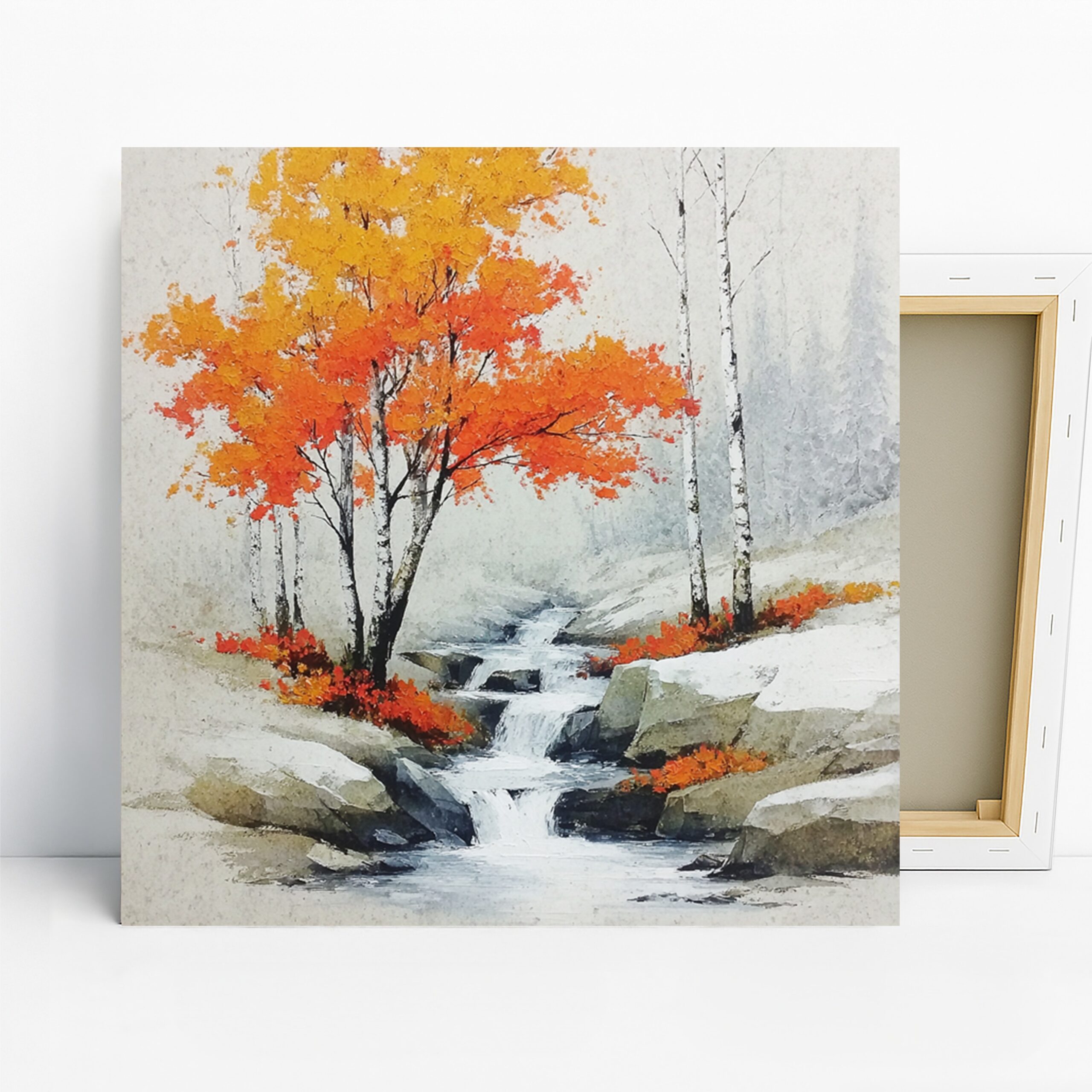 Transform your space with this captivating autumn stream canvas wall art, bringing the serene beauty of nature indoors. This striking poster showcases a vibrant fall scene with a central tree ablaze in fiery orange and yellow foliage, contrasting beautifully against a misty grey background. The gentle cascade of a rocky stream adds movement and tranquility to the composition, making it perfect for creating a calming atmosphere in your living room or bedroom. Ideal for rustic or modern decor styles, this canvas wall art celebrates the changing seasons and natural beauty. The impressionistic brushstrokes give depth and texture to the image, enhancing its visual appeal and making it a focal point in any room. Whether you’re looking to add warmth to a minimalist office or create a cozy retreat in your bathroom, this versatile piece adapts seamlessly to various interior designs. The high-quality printing captures every detail, from the delicate birch trees to the subtle reflections in the water. This autumn landscape art is not just decor; it’s a window to nature that can elevate your mood and inspire creativity. Perfect as a housewarming gift or to refresh your seasonal decor, this canvas brings the outdoors inside, allowing you to enjoy the beauty of fall year-round. Enhance your living space today with this stunning autumn stream artwork and experience the transformative power of nature-inspired wall art.