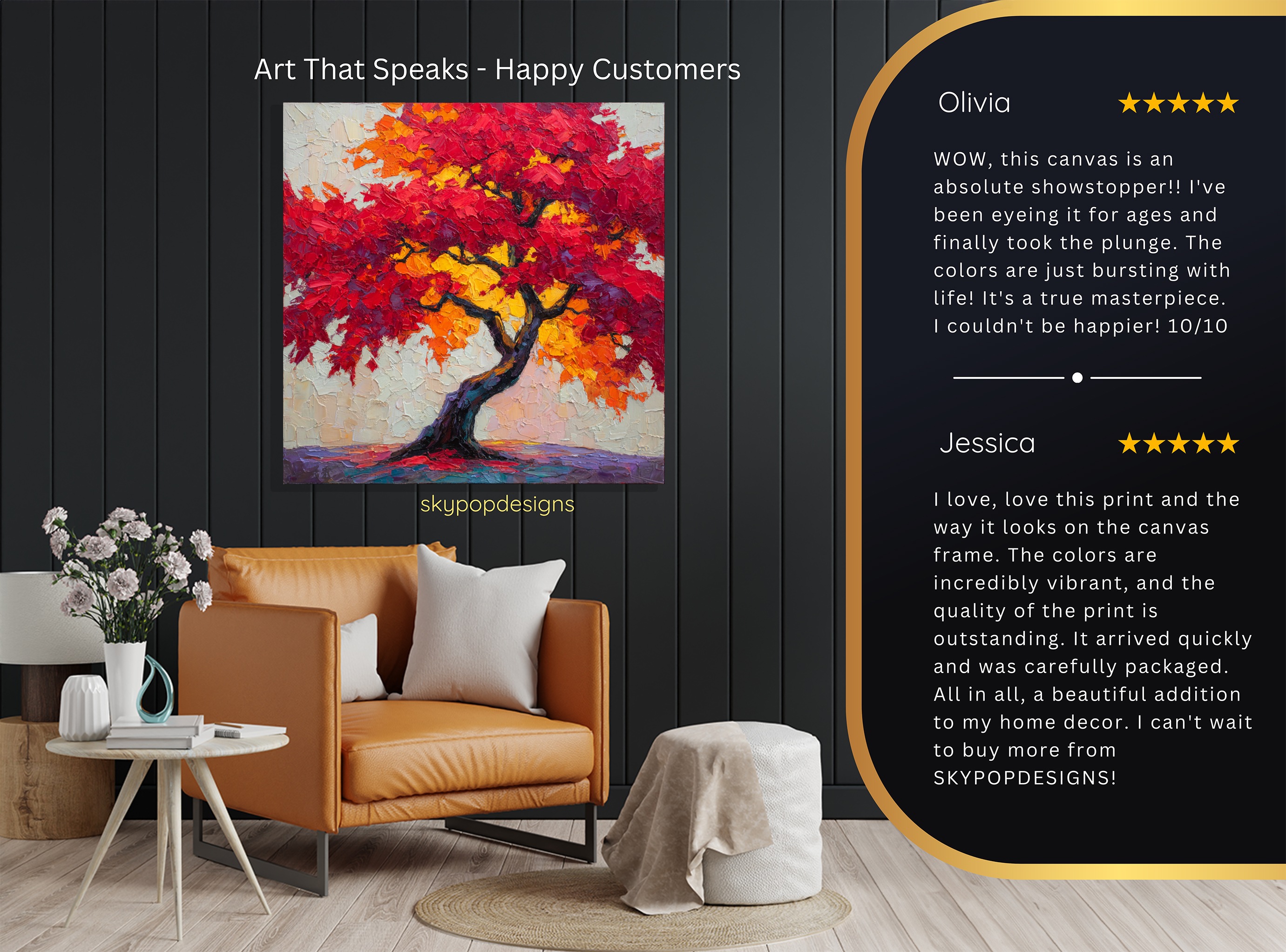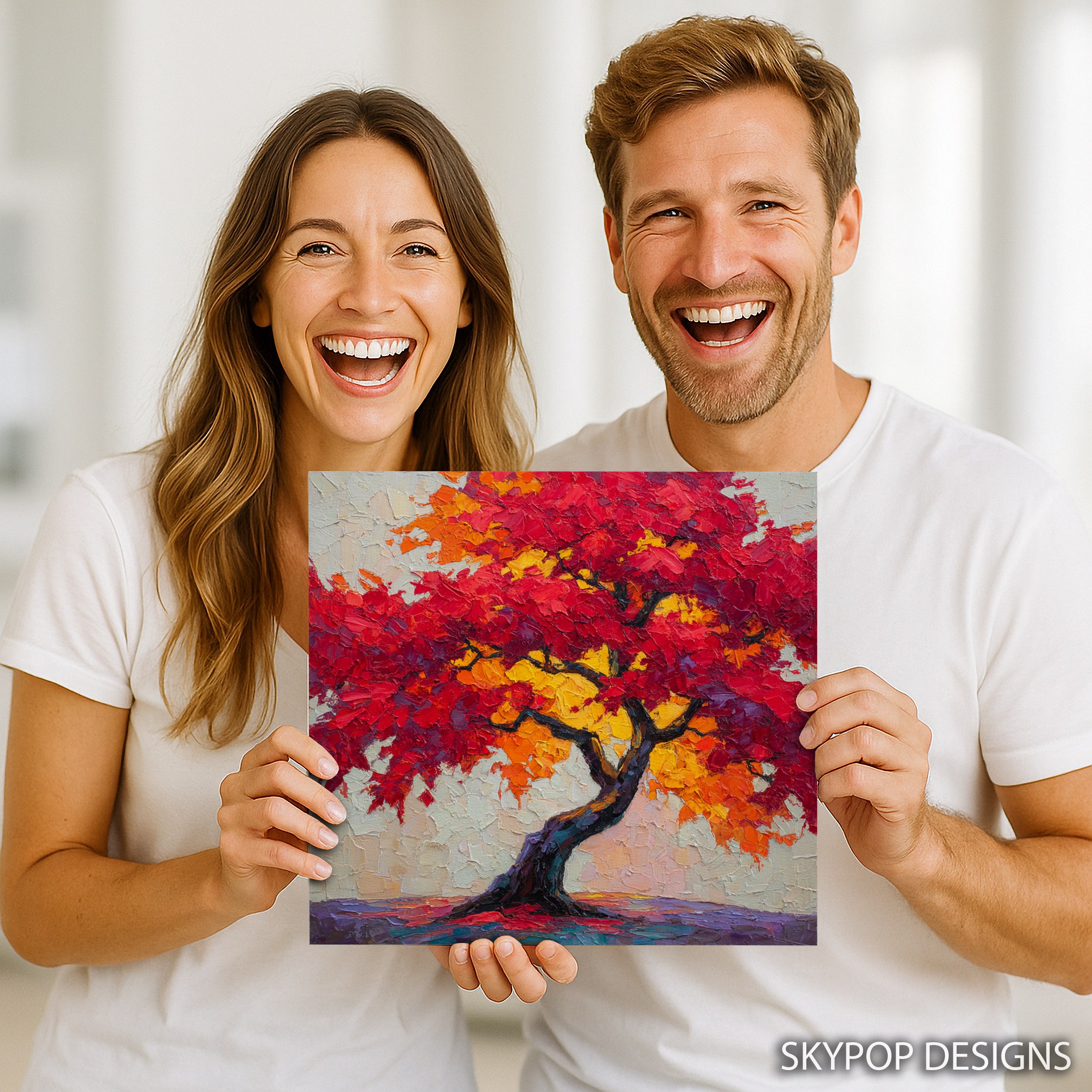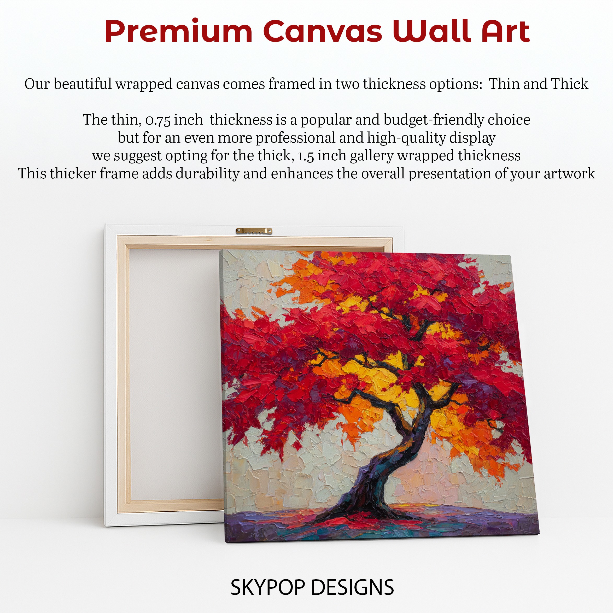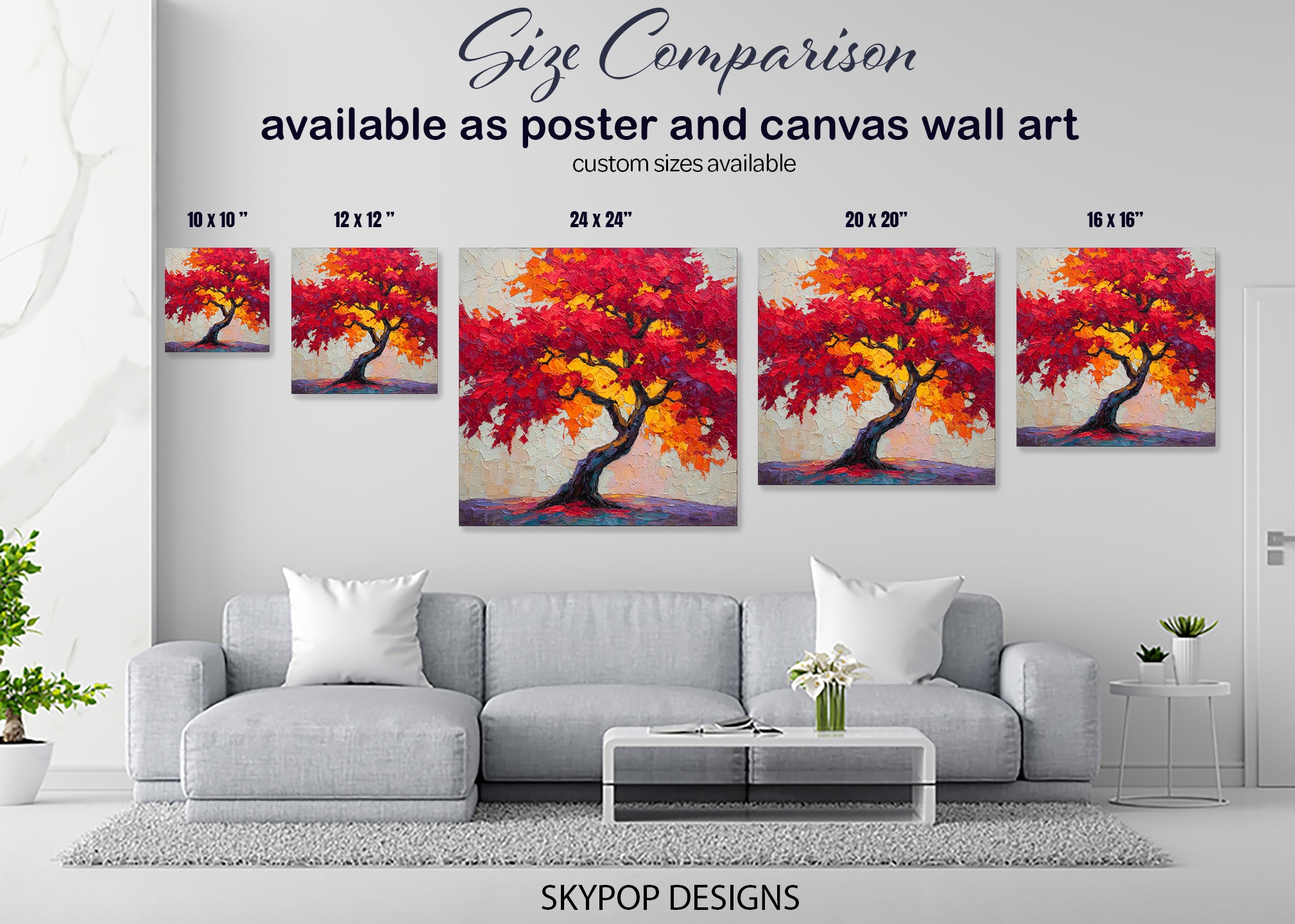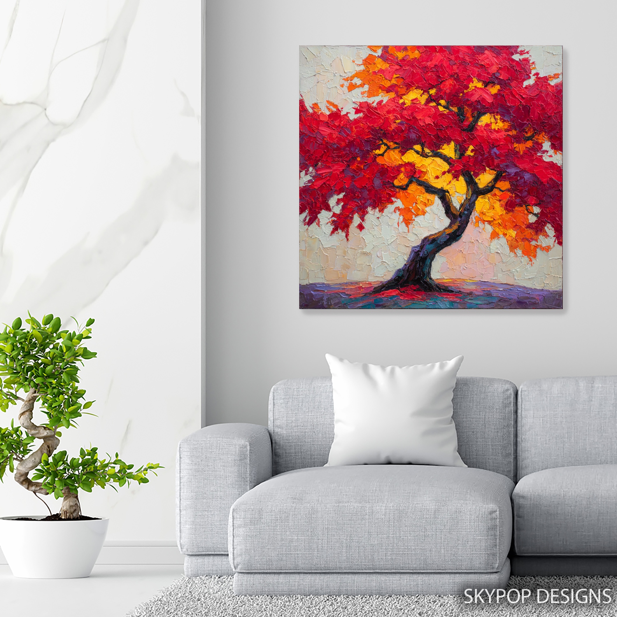 Transform your space with this stunning autumn tree canvas wall art that captures the fiery beauty of fall foliage. This eye-catching poster features a bold, twisted tree trunk bursting with vibrant red, orange, and yellow leaves against a textured background. Perfect for modern living rooms or rustic bedrooms, this contemporary nature art piece adds a splash of warm color and dynamic energy to any wall. The thick, expressive brushstrokes create a captivating texture that draws the eye and invites closer inspection, making it an ideal focal point for your home decor. Whether you’re looking to bring the outdoors in or create a cozy autumn atmosphere year-round, this versatile canvas art adapts beautifully to various interior styles. The rich color palette evokes feelings of warmth and transformation, making it a powerful mood enhancer in any space. Ideal as a statement piece in a dining room or as inspiring wall decor for a home office, this autumn tree artwork celebrates the changing seasons and the beauty of nature. The high-quality printing ensures every detail of the impasto technique is captured, from the swirling branches to the delicate leaf shapes. Elevate your home’s ambiance with this striking blend of impressionistic style and contemporary flair. Add a touch of autumnal magic to your wall art collection today and watch your room come alive with the spirit of fall.