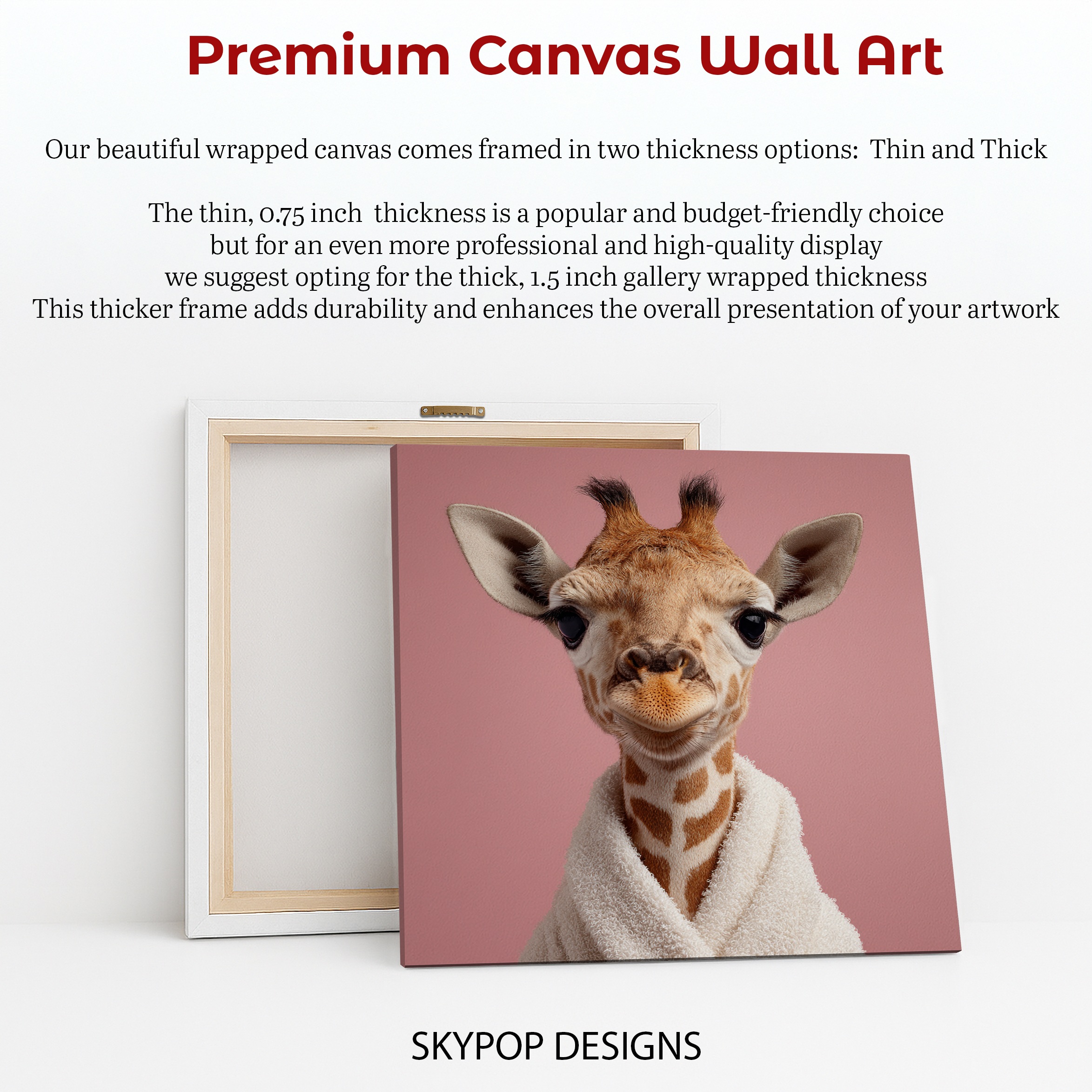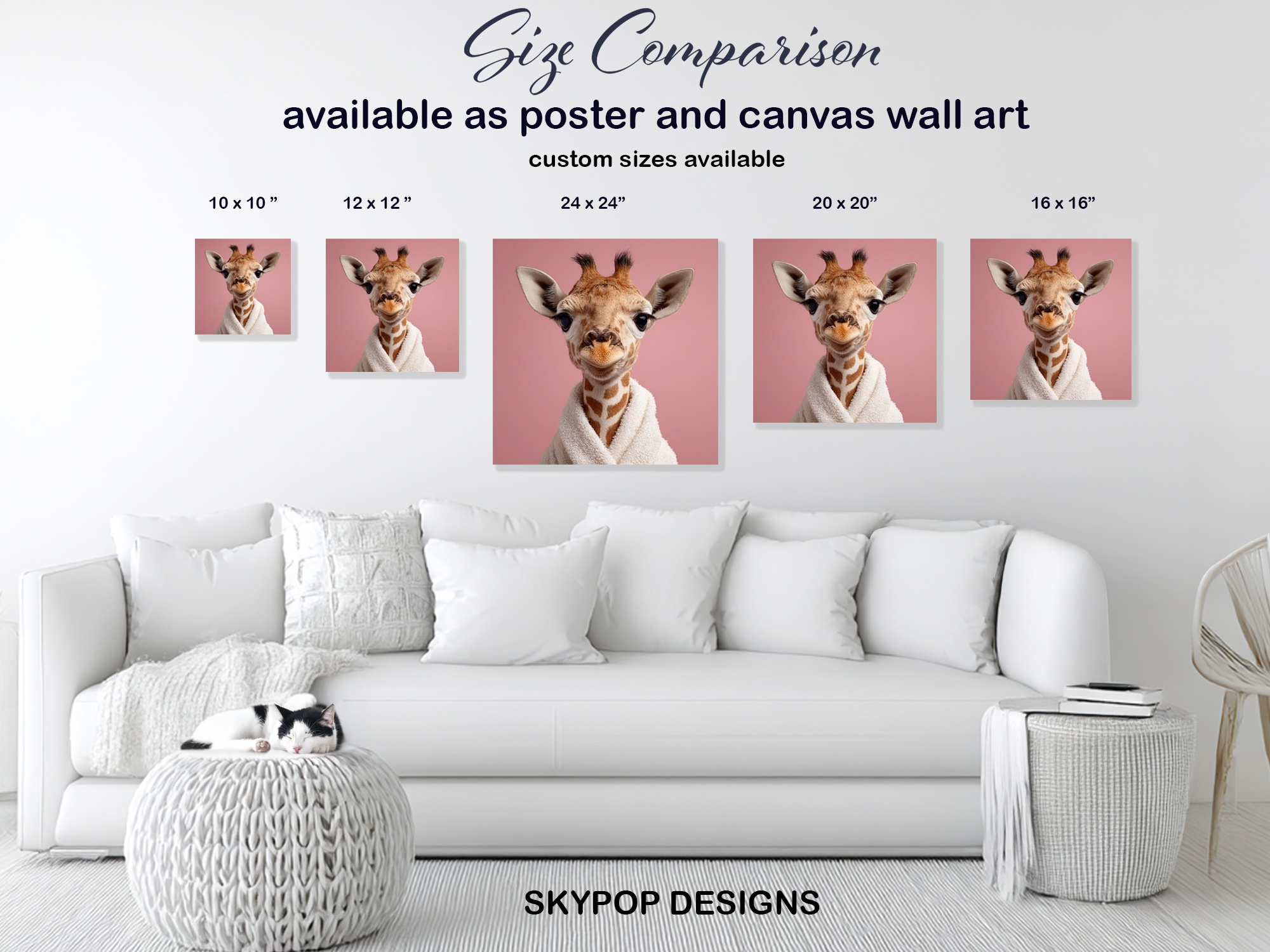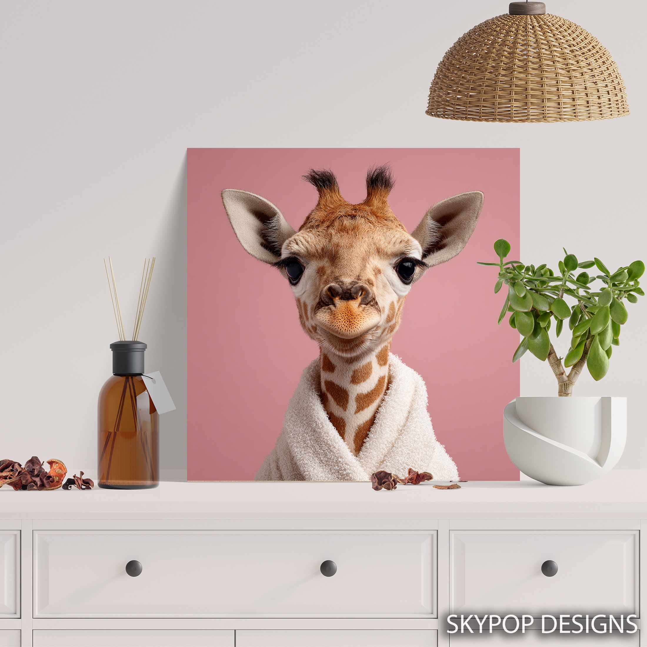 Bring a touch of whimsy to your walls with this adorable baby giraffe canvas wall art. This charming poster features a close-up of a young giraffe wrapped in a cozy white towel, set against a soft pink background. Perfect for nurseries or children’s rooms, this playful piece adds warmth and character to any space. The giraffe’s big, expressive eyes and fuzzy ears create an instant emotional connection, making it a standout addition to your home decor. Ideal for contemporary or modern interiors, this canvas wall art works beautifully in living rooms, bedrooms, or even bathrooms for a quirky touch. The neutral color palette of brown, white, and pink complements a variety of design schemes, while the minimalist composition keeps it fresh and on-trend. This versatile artwork makes a thoughtful baby shower or new parent gift, celebrating the innocence and wonder of young animals. High-quality printing ensures every detail is captured, from the giraffe’s delicate eyelashes to the texture of the towel. Whether you’re creating a safari-themed nursery or simply love unique animal art, this giraffe poster adds personality and joy to your walls. Elevate your space with this sweet and stylish piece that’s sure to spark smiles and conversations. Transform your room with this irresistible giraffe wall art today and bring the charm of the savanna into your home.
