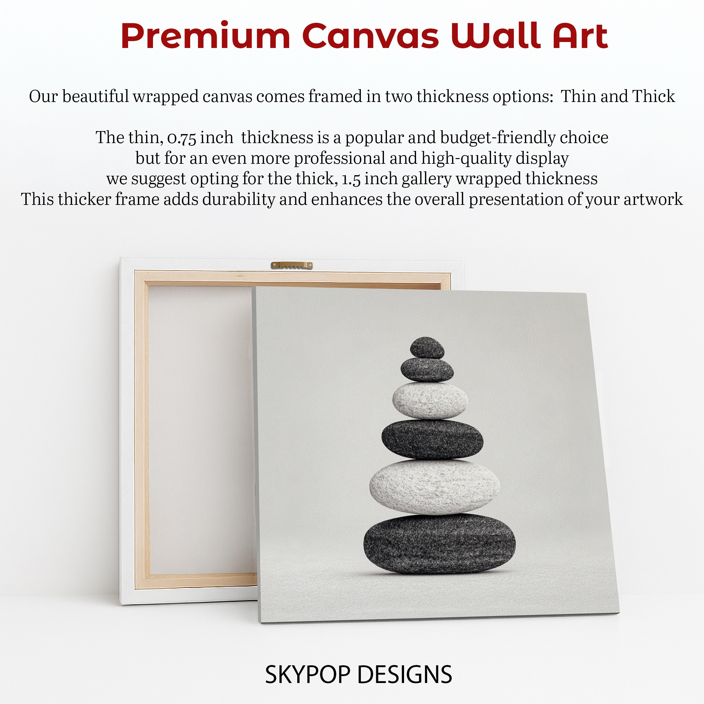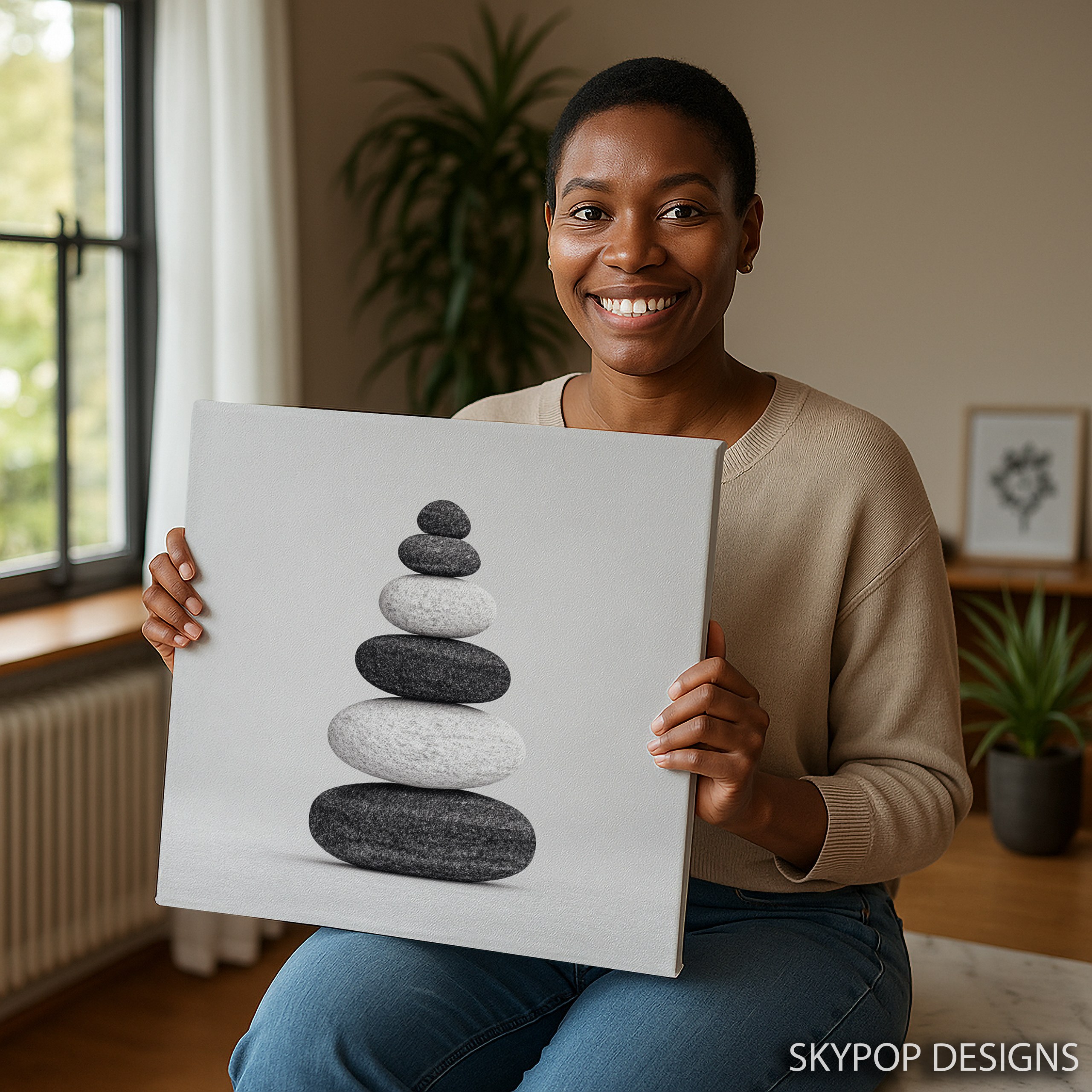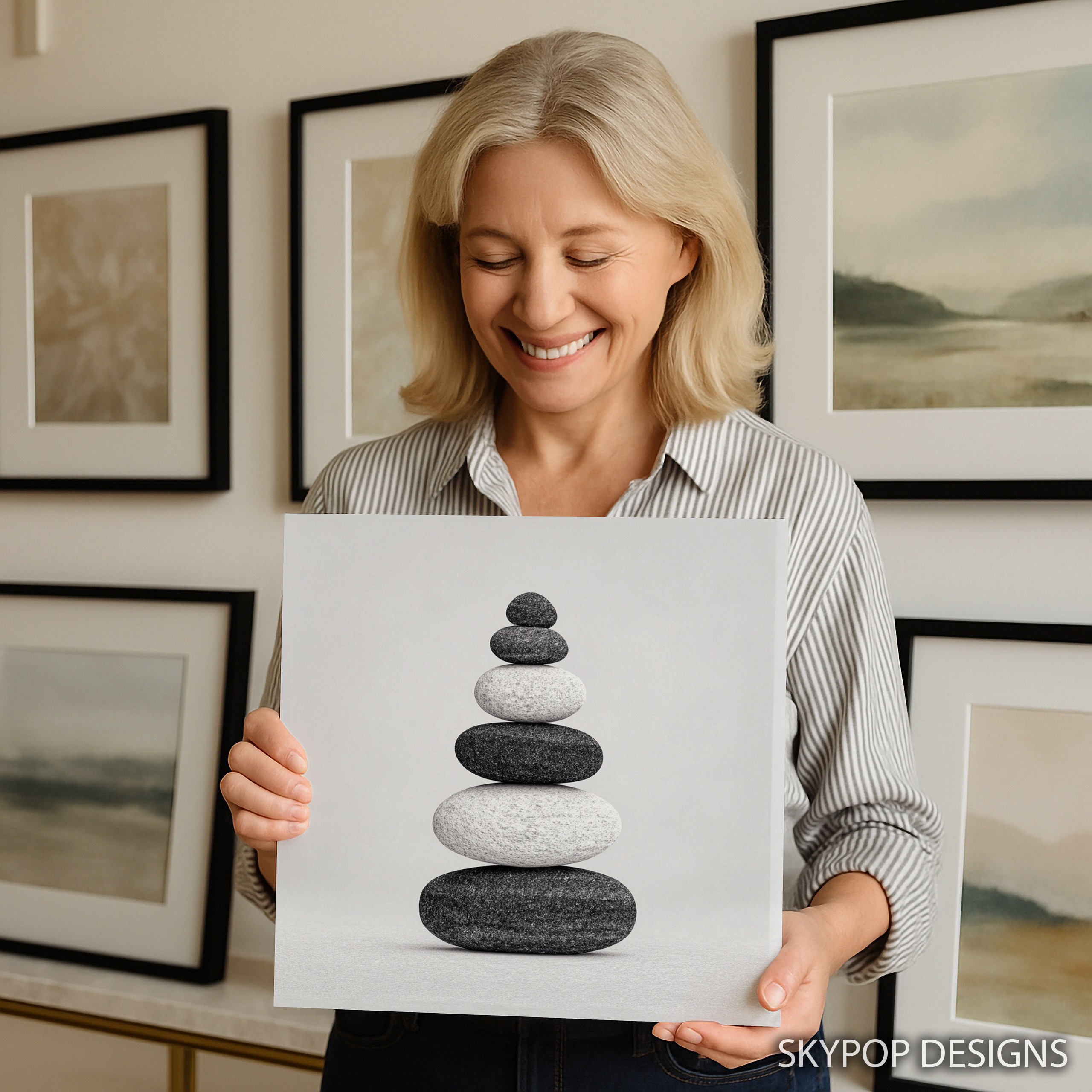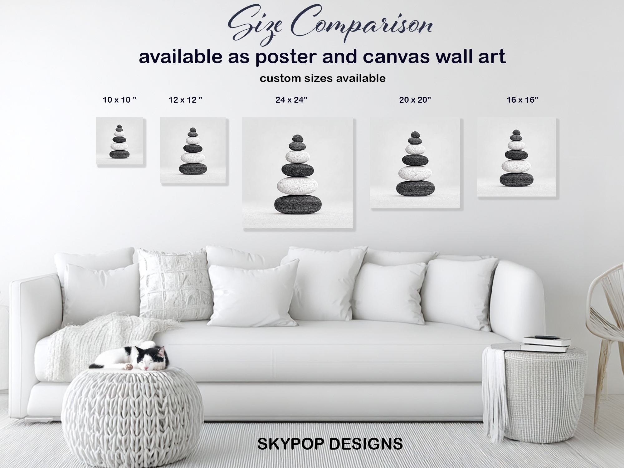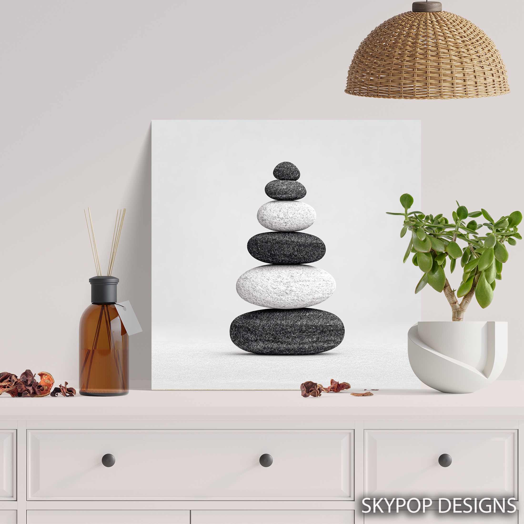 Transform your space with this striking balanced stones canvas wall art, perfect for creating a serene atmosphere in any room. The minimalist black and white design showcases a carefully stacked arrangement of smooth river rocks, symbolizing balance, harmony, and inner peace. This contemporary poster or canvas print instantly elevates your decor, adding a touch of zen-inspired elegance to modern living rooms, tranquil bedrooms, or professional office spaces. The contrasting tones of black, white, and grey create a visually appealing composition that complements a wide range of color schemes and interior styles. Ideal for those seeking minimalist wall decor, this piece serves as a calming focal point and conversation starter. The high-quality printing captures every subtle texture and shadow, bringing depth and dimension to your walls. Whether you’re practicing meditation, creating a spa-like bathroom retreat, or simply want to add a touch of nature-inspired art to your home, this balanced stones artwork delivers. It’s also a thoughtful housewarming or wellness gift for friends and family. Available in various sizes, this versatile canvas art adapts seamlessly to different spaces, from cozy corners to large feature walls. Bring a sense of balance and mindfulness to your daily life with this captivating stone stack wall art. Transform your living space today and create a haven of tranquility with this timeless piece.