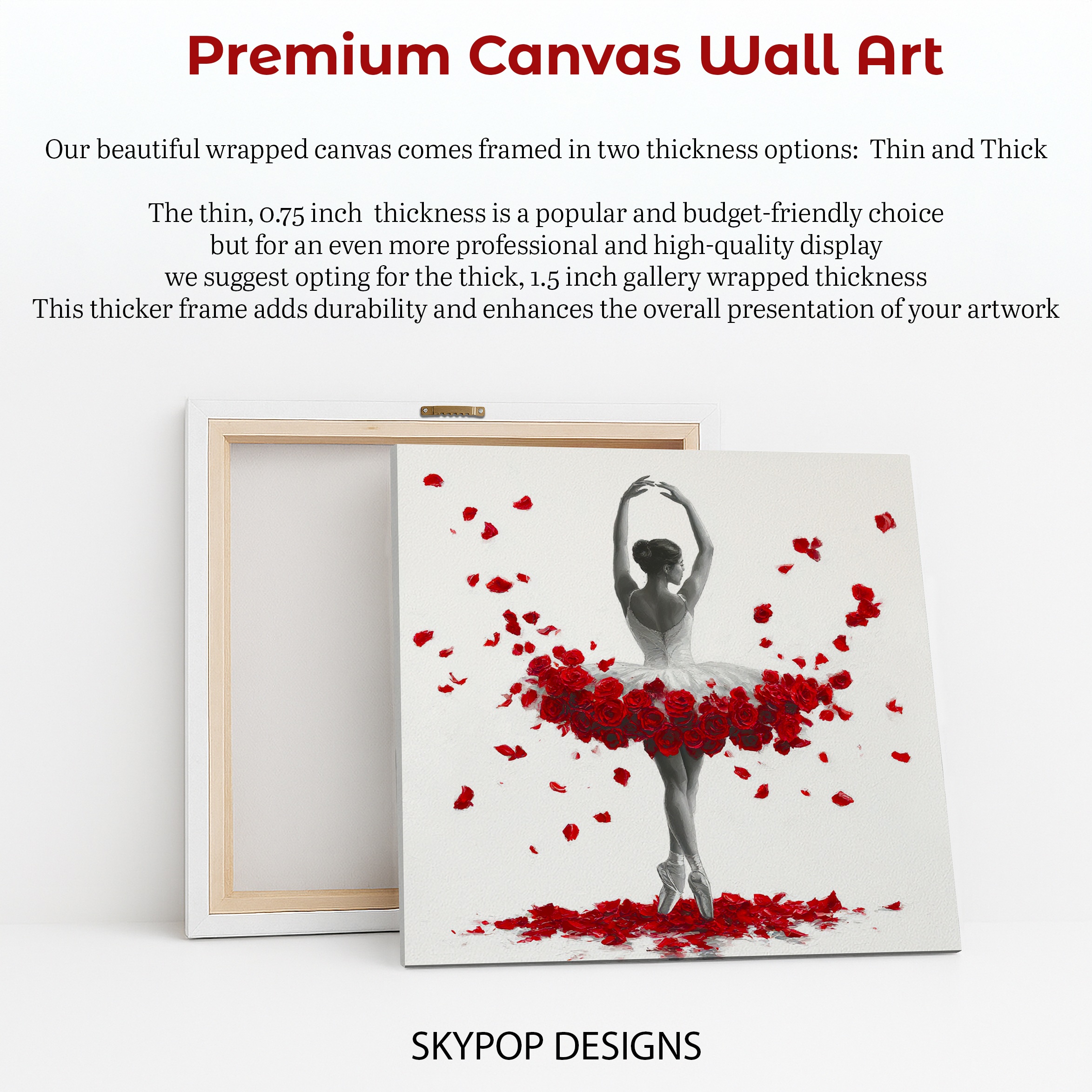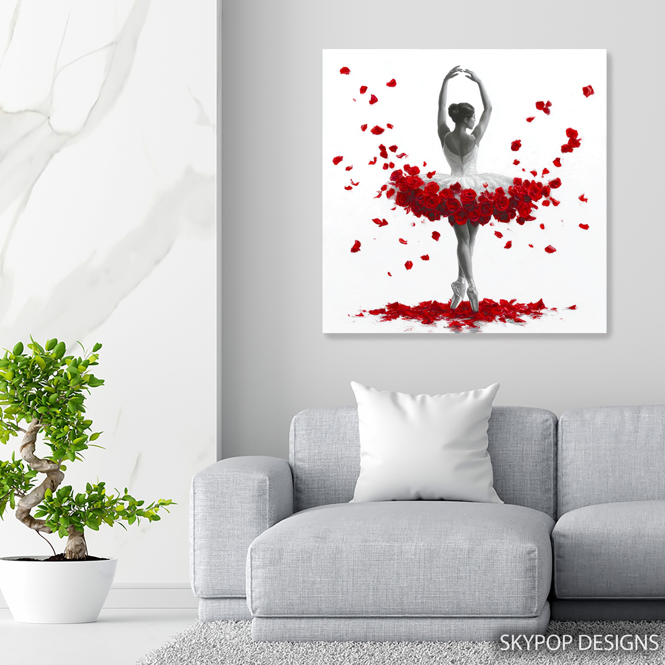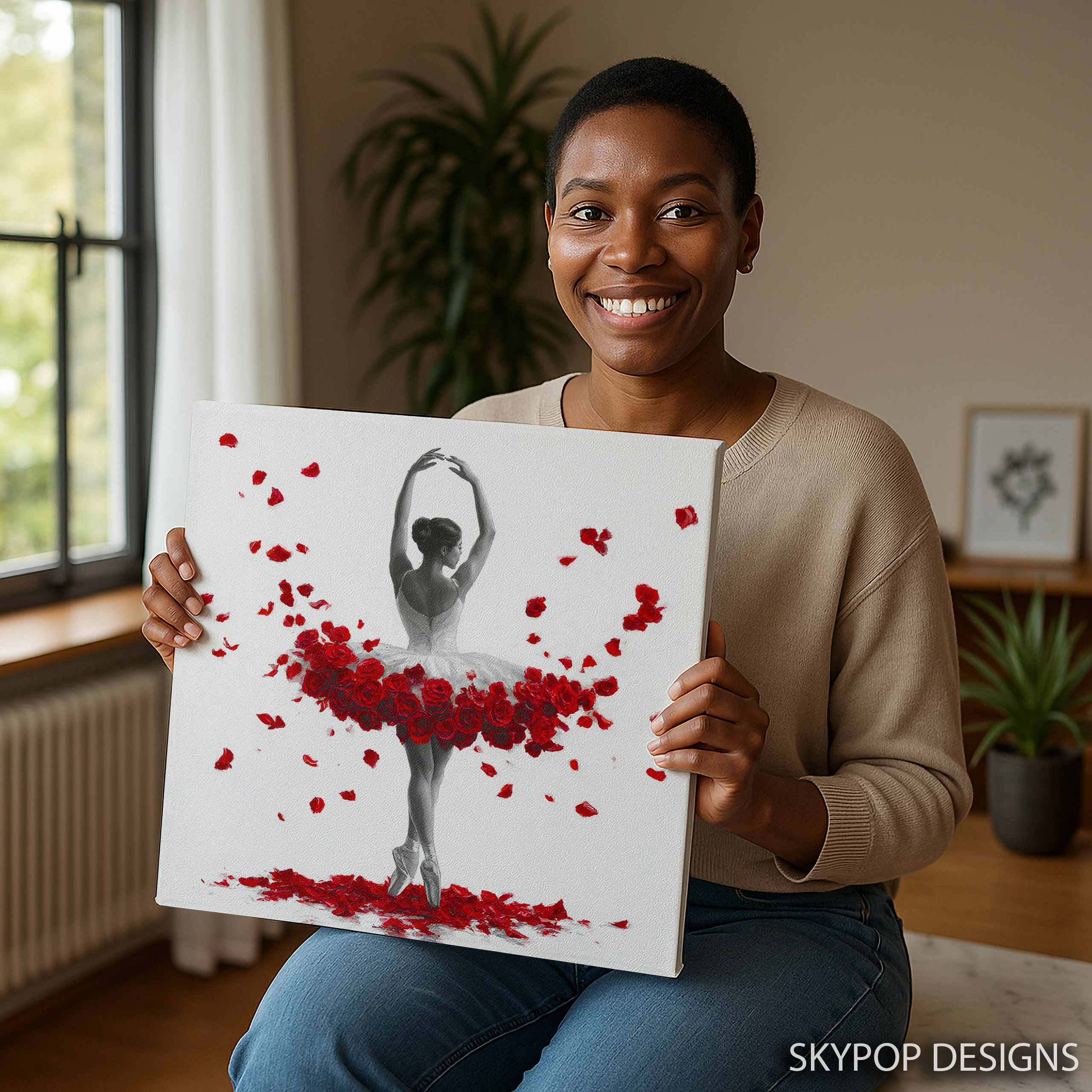 Elevate your space with this stunning ballerina canvas wall art, blending the grace of dance with the beauty of nature. This captivating piece showcases a graceful dancer in a classic white tutu, her pose accentuated by a burst of vibrant red roses. Perfect for contemporary living rooms or modern bedrooms, this poster brings an air of elegance and sophistication to any interior. The striking contrast between the black and white figure and the rich red florals creates a visually arresting focal point that demands attention. Ideal for dance enthusiasts, this canvas wall art celebrates the artistry of ballet while adding a touch of romantic allure to your decor. The minimalist background allows the central image to shine, making it a versatile addition to various design styles from glam to modern. Imagine this piece as the centerpiece in a home dance studio, inspiring creativity and movement. The high-quality printing captures every delicate detail, from the intricate lace of the tutu to the soft petals of the roses. Whether you’re looking to refresh your seasonal decor or searching for the perfect housewarming gift, this artwork offers timeless appeal. The emotional power of dance combined with the symbolism of red roses creates a statement piece that transforms any room. Enhance your wall art collection with this beautiful fusion of figurative and floral art that celebrates the human form and nature’s beauty. Bring the passion of dance and the romance of roses into your home today with this exceptional canvas wall art.