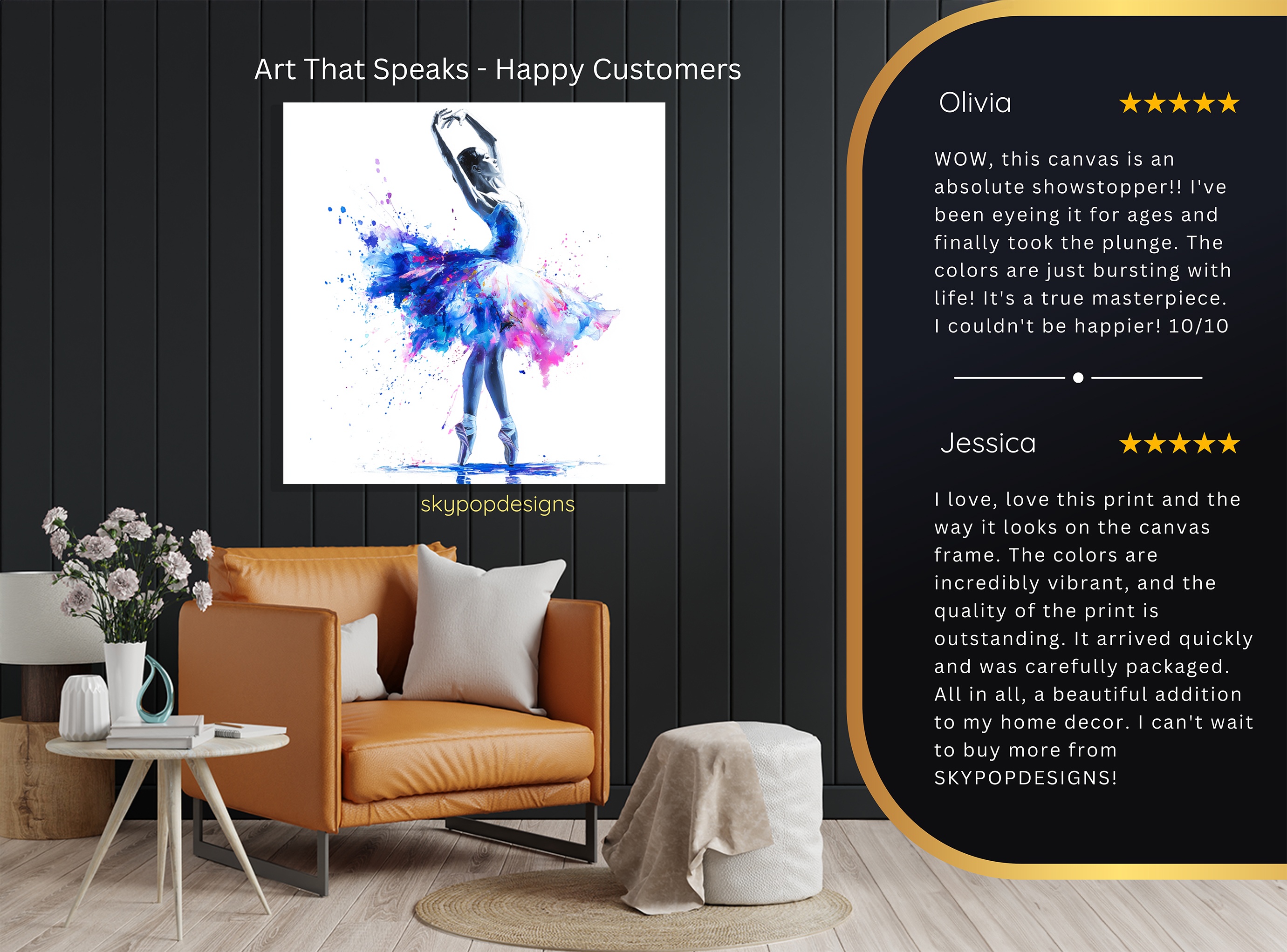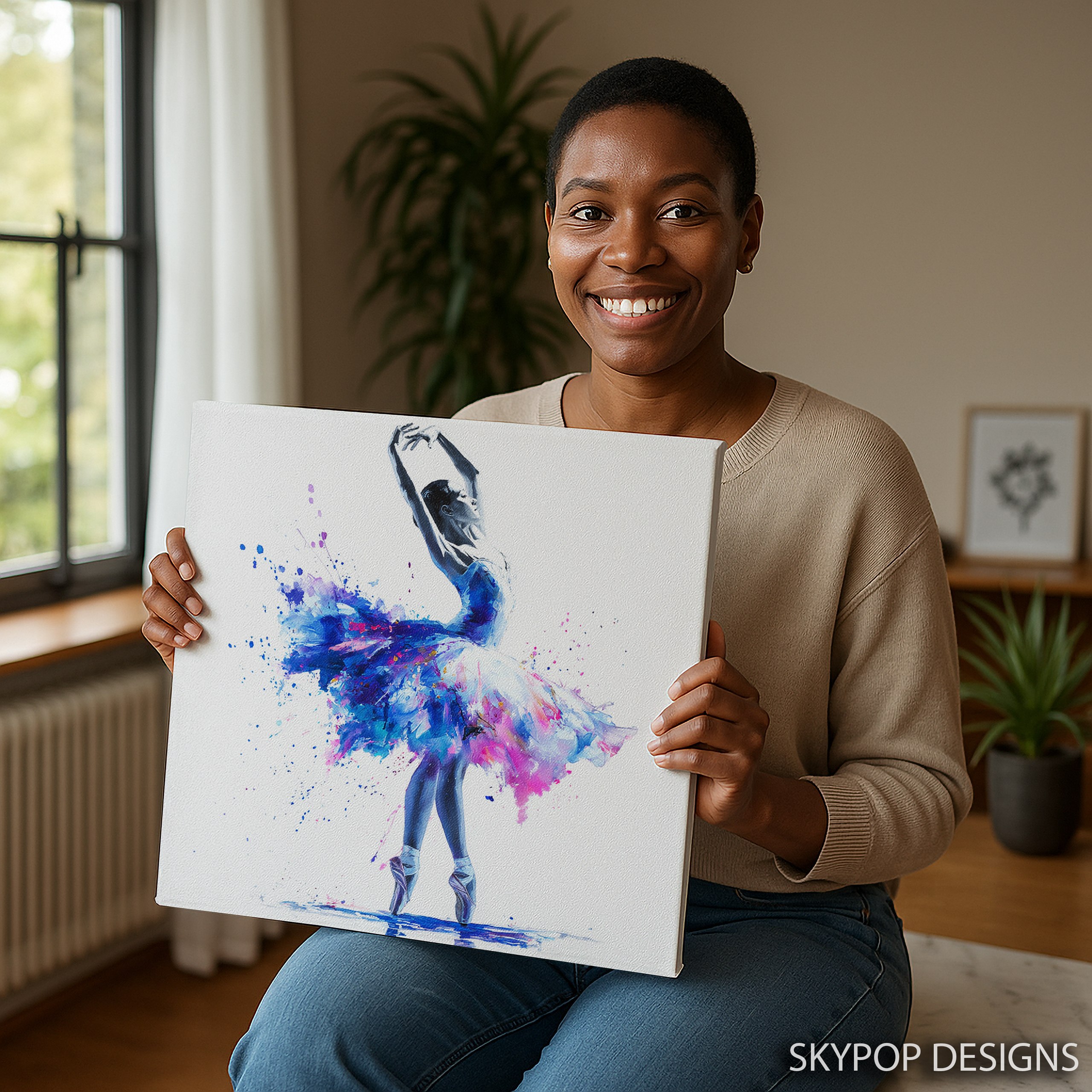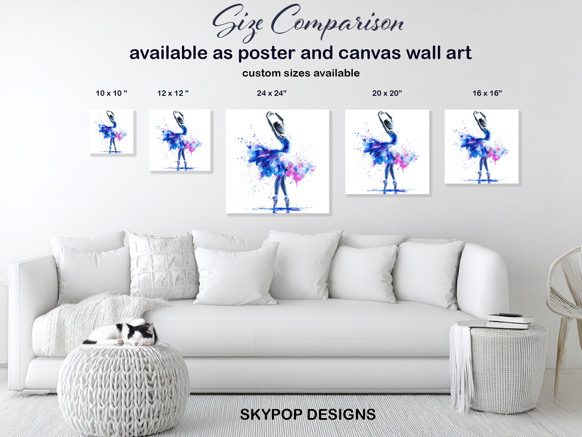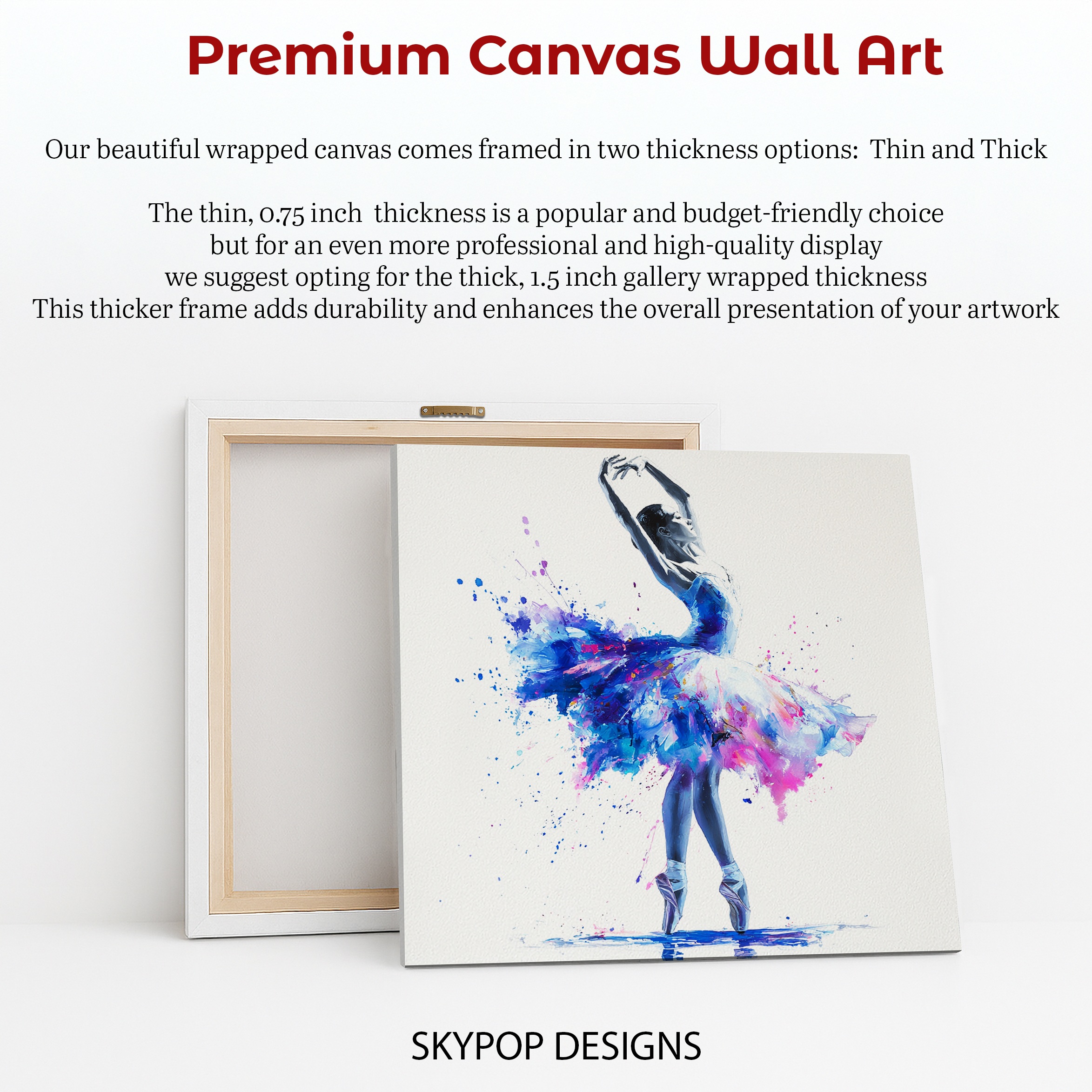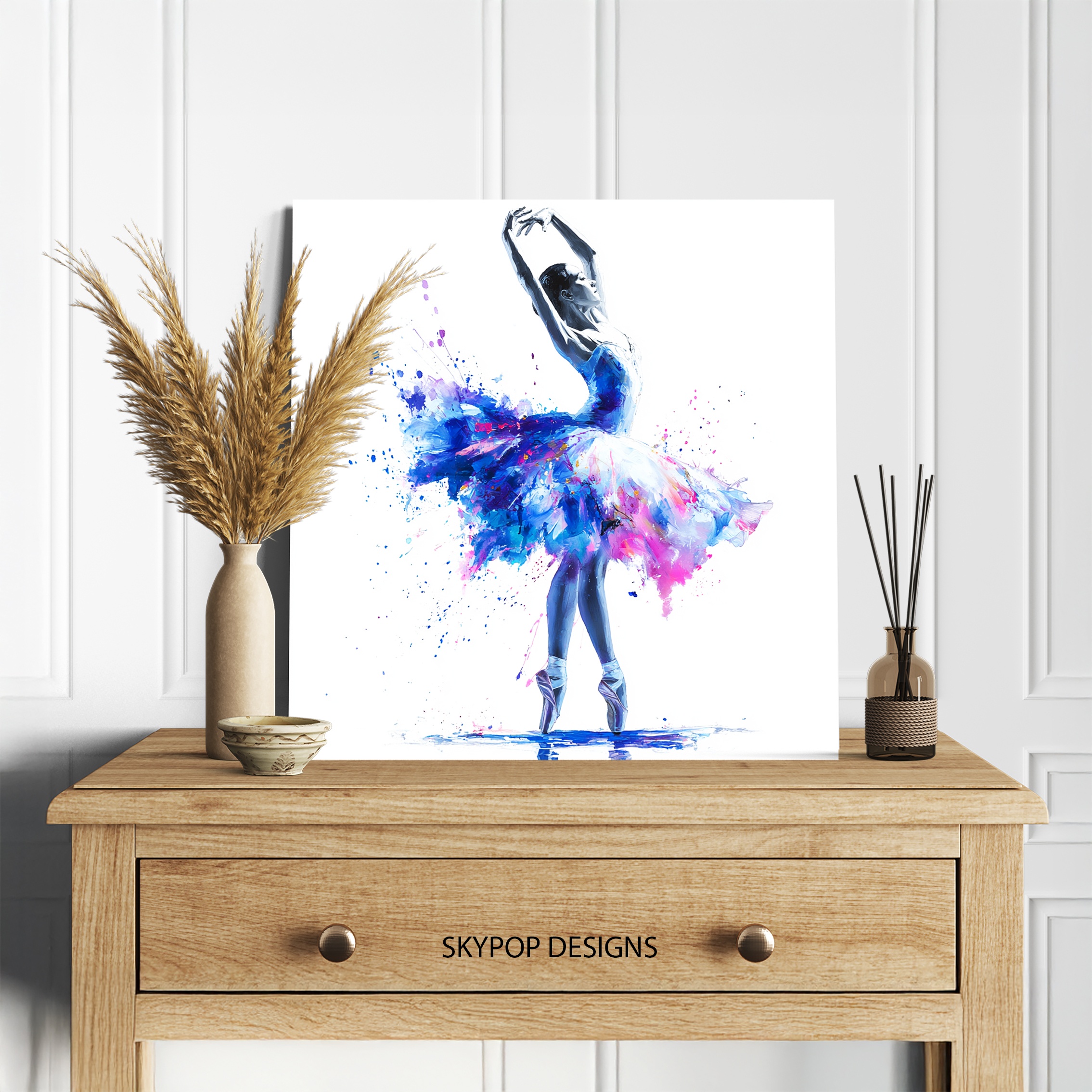 Elevate your space with this stunning ballerina canvas wall art that captures the grace and energy of dance in a burst of vibrant colors. This eye-catching poster transforms any room into a gallery of movement and emotion. The contemporary style blends abstract elements with a recognizable dancer silhouette, creating a dynamic focal point perfect for modern living rooms or bohemian bedrooms. Splashes of blue, pink, and purple dance across the canvas, symbolizing the passion and fluidity of ballet. This piece is ideal for dance enthusiasts, fitness lovers, or anyone seeking to add a touch of elegance and movement to their decor. The watercolor-like technique gives a sense of lightness and spontaneity, making it a versatile addition to minimalist or eclectic interiors. Whether displayed in a home gym to inspire your workouts or in a bedroom to add a dreamy quality, this canvas art brings life and energy to any wall. The high-quality printing ensures every brushstroke and color splash is captured in vivid detail, making it a long-lasting piece of wall decor. Perfect as a gift for dancers, art lovers, or as a statement piece in your own home, this ballerina artwork celebrates the beauty of movement and artistic expression. Add a touch of grace and color to your space with this captivating ballerina wall art today.