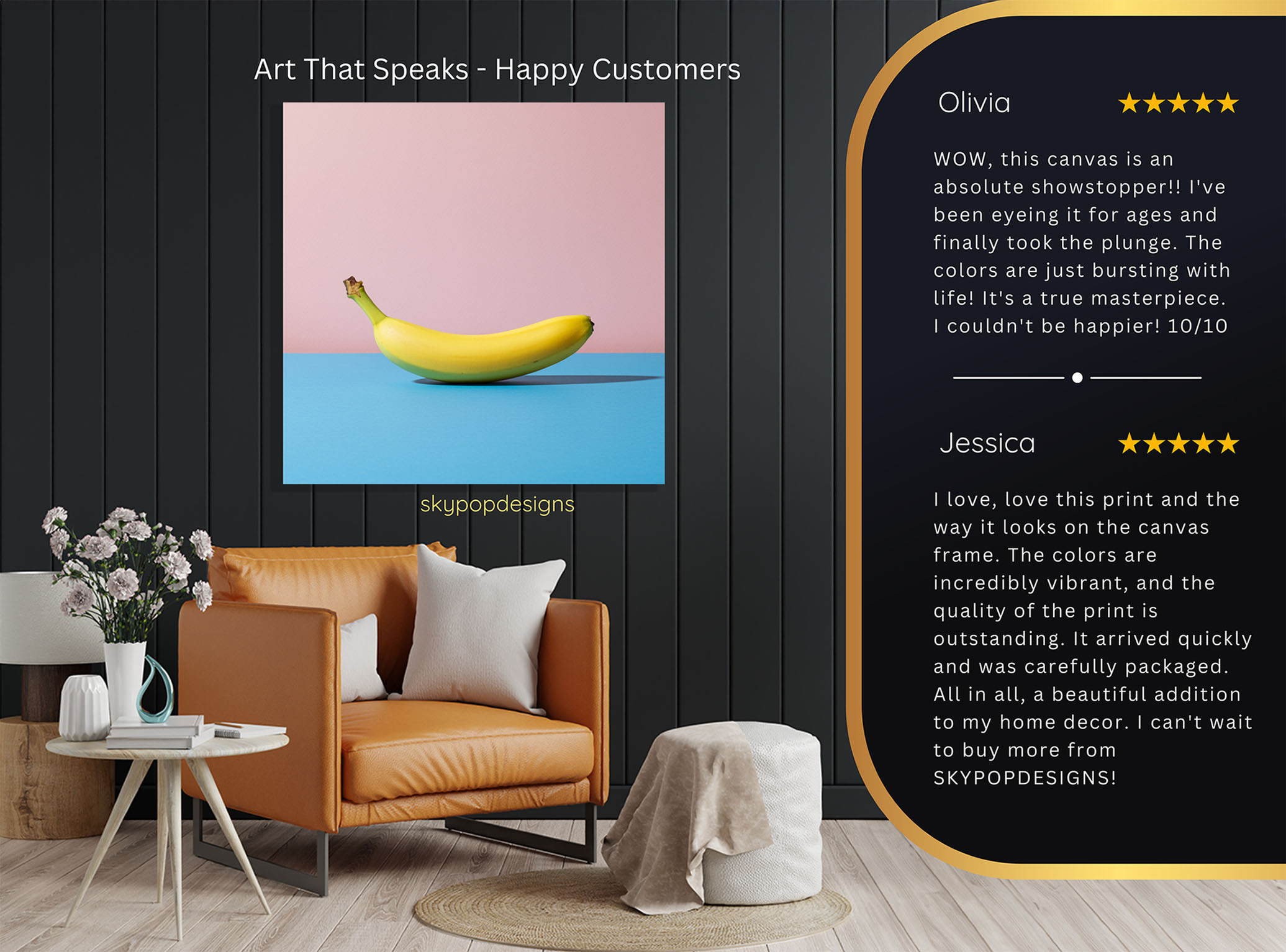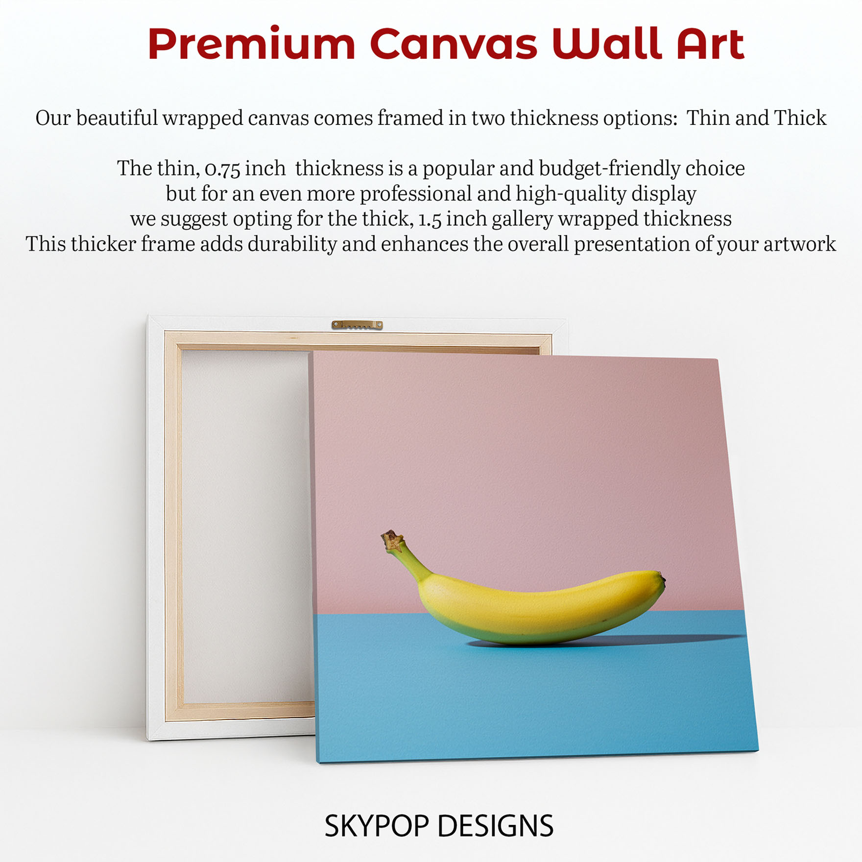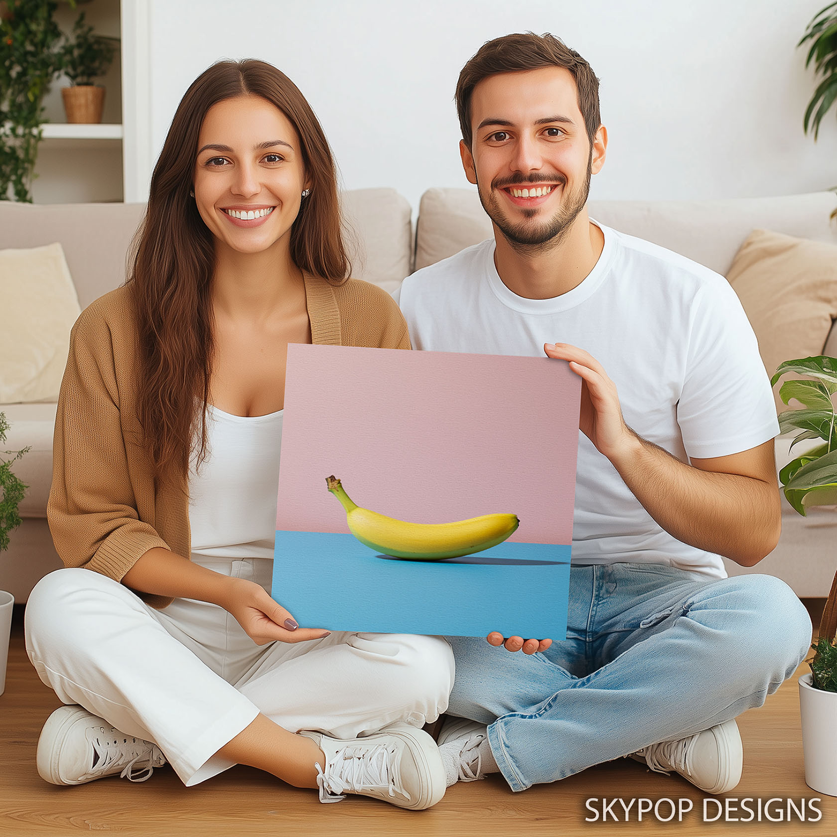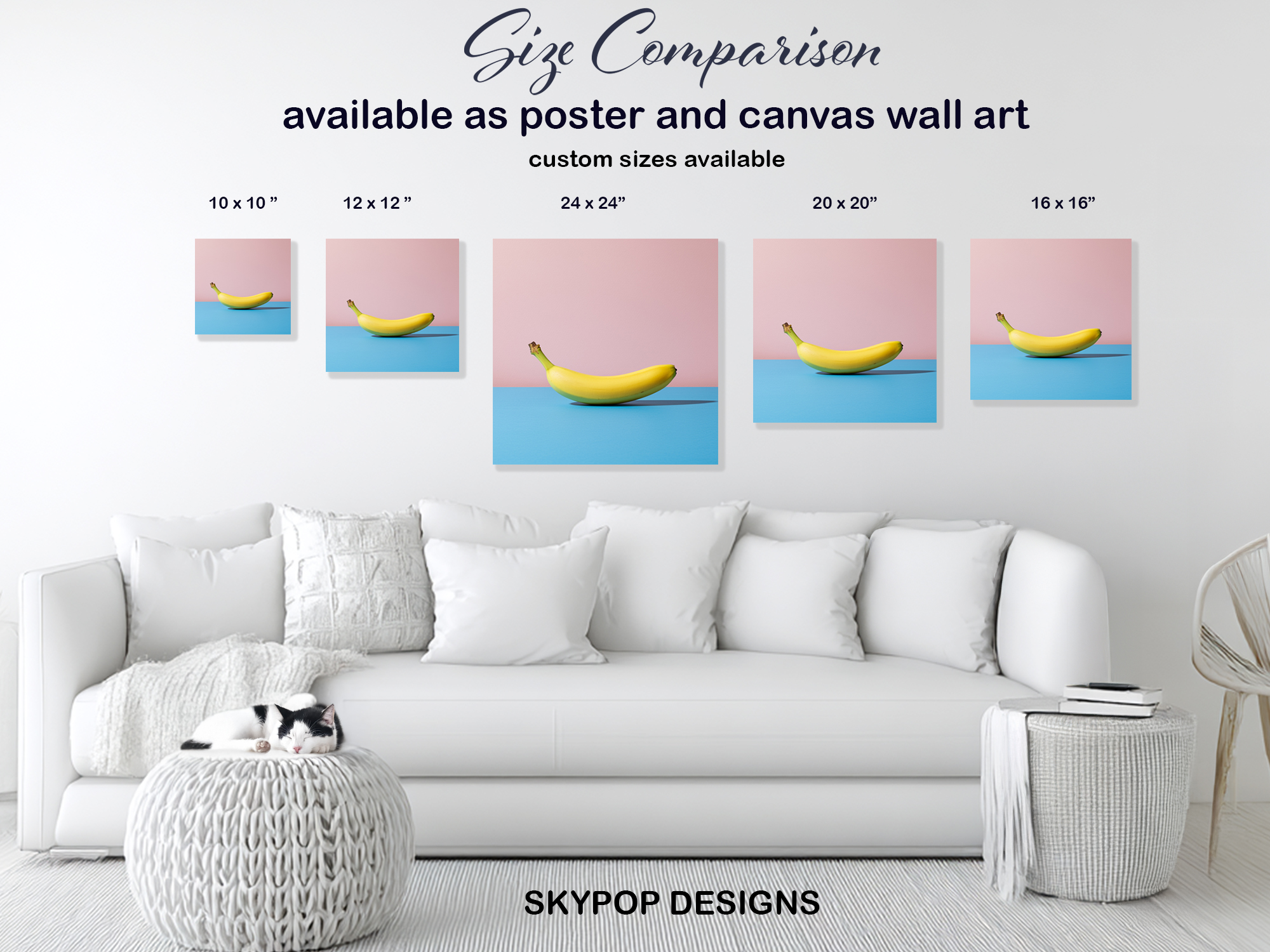 Energize your space with this eye-catching banana canvas wall art, a vibrant pop art statement piece that brings a burst of color and fun into any room. This poster or canvas wall art is the perfect addition to modern kitchens or lively living rooms, showcasing a single, bold banana against a contrasting backdrop. The playful yellow of the banana pops against the soft pink and cool blue hues, creating a captivating visual that sparks joy and stimulates conversation. Ideal for bohemian decor enthusiasts or those looking to add a modern touch, this minimalist artwork delivers maximum impact. Its striking simplicity makes it a versatile choice for children’s rooms or a contemporary dining area, adding a cheerful vibe to everyday life. The clean lines and bright colors evoke a sense of optimism, making this canvas wall art a delightful focal point. This piece is excellent for creating a fresh and modern aesthetic, enhancing your wall decor with a playful yet sophisticated appeal. Whether you’re seeking a unique gift for a housewarming or birthday, or simply want to refresh your home’s atmosphere, this banana art offers unparalleled style. High-quality printing ensures the vibrant yellow and subtle green undertones of the banana are rendered with stunning clarity. Elevate your home with this trending piece of pop art and celebrate the simple pleasure of a perfectly ripe banana. Transform your home into a vibrant gallery today with this statement canvas wall art.
