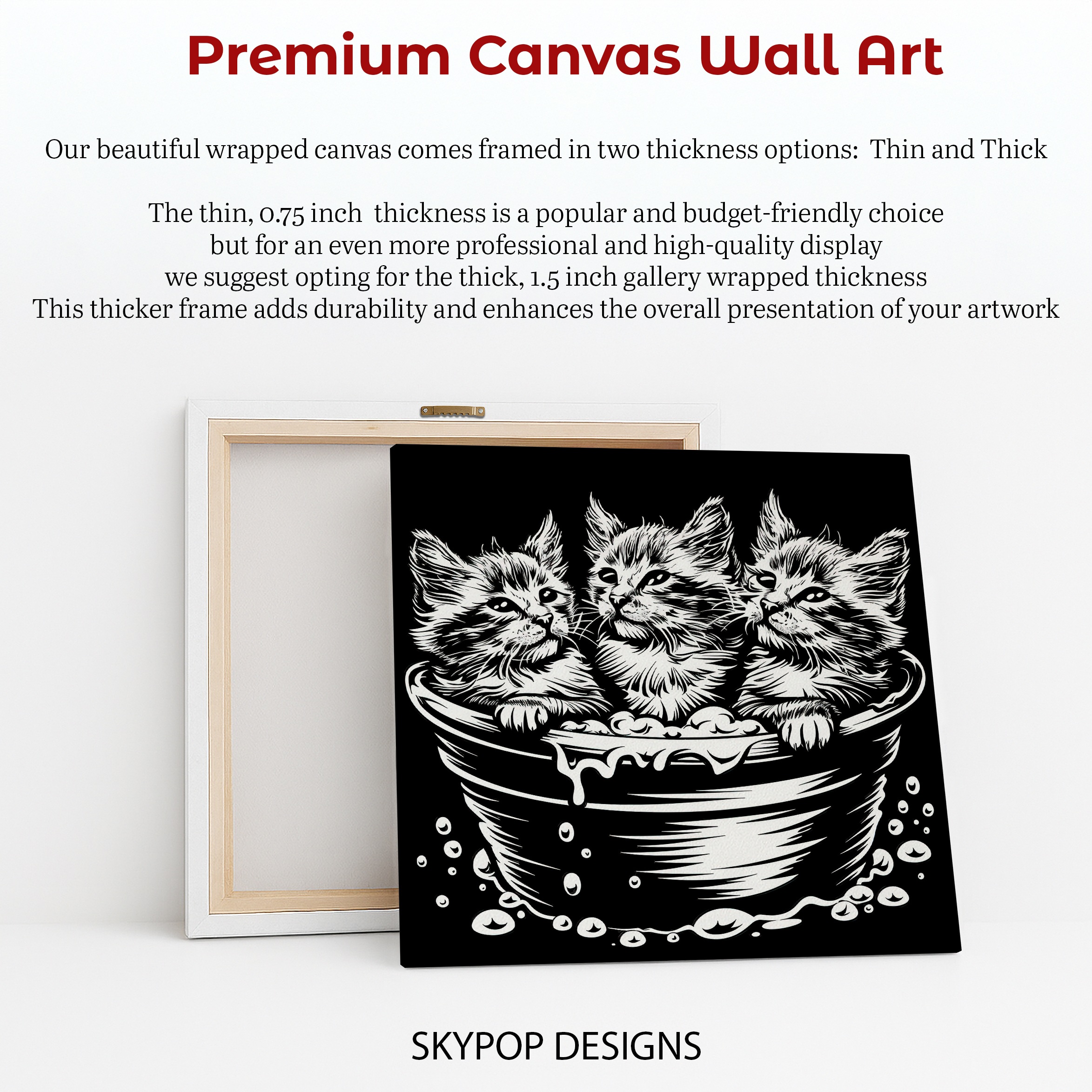 Transform your space with this adorable cat canvas wall art featuring three fluffy kittens enjoying a bubble bath. The striking black and white design with a playful touch of multicolor in the bubbles will immediately catch the eye, creating a charming focal point in any room. This captivating poster or canvas wall art is perfect for adding personality to modern living rooms, cozy bedrooms, or even a quirky kitchen. The high-contrast graphic style, reminiscent of street art, makes this piece a unique statement for bohemian decor enthusiasts looking to inject fun and character into their homes. Its simplicity and adorable subject matter also make it ideal for children’s rooms or nurseries, bringing a sense of playful joy and warmth. This versatile artwork can easily enhance a minimalist aesthetic or complement a more eclectic decor style. The dynamic play of light and shadow from the bold linework gives this canvas wall art a professional, polished look. It’s a fantastic housewarming gift or a delightful way to brighten a birthday celebration. You can elevate your space today with this captivating blend of animal art and graphic design. Celebrate the simple pleasures of life with this heartwarming feline-themed wall art. This stunning piece offers a unique visual appeal that adds a touch of whimsy and charm to your home decor. Discover the perfect finishing touch for your walls with this delightful cat artwork.