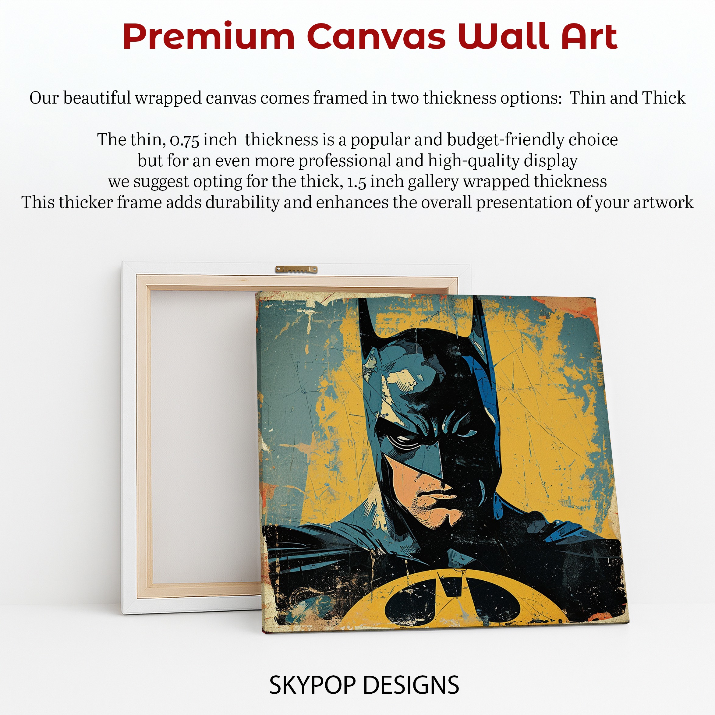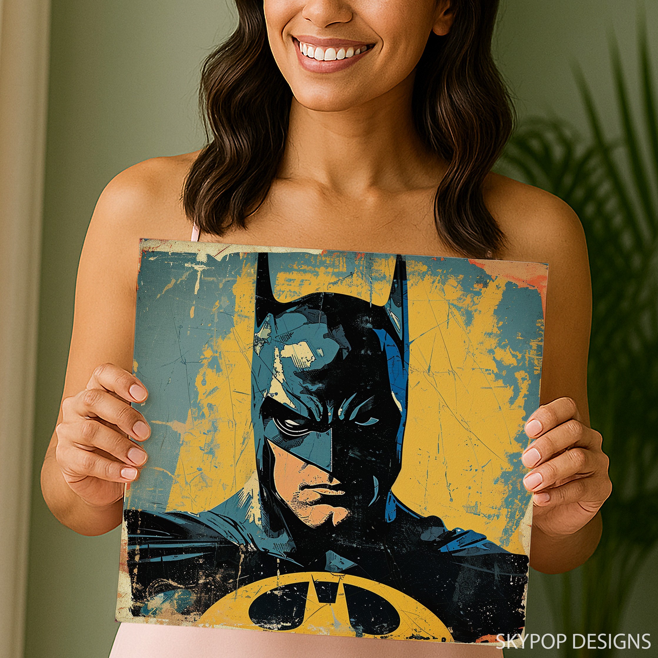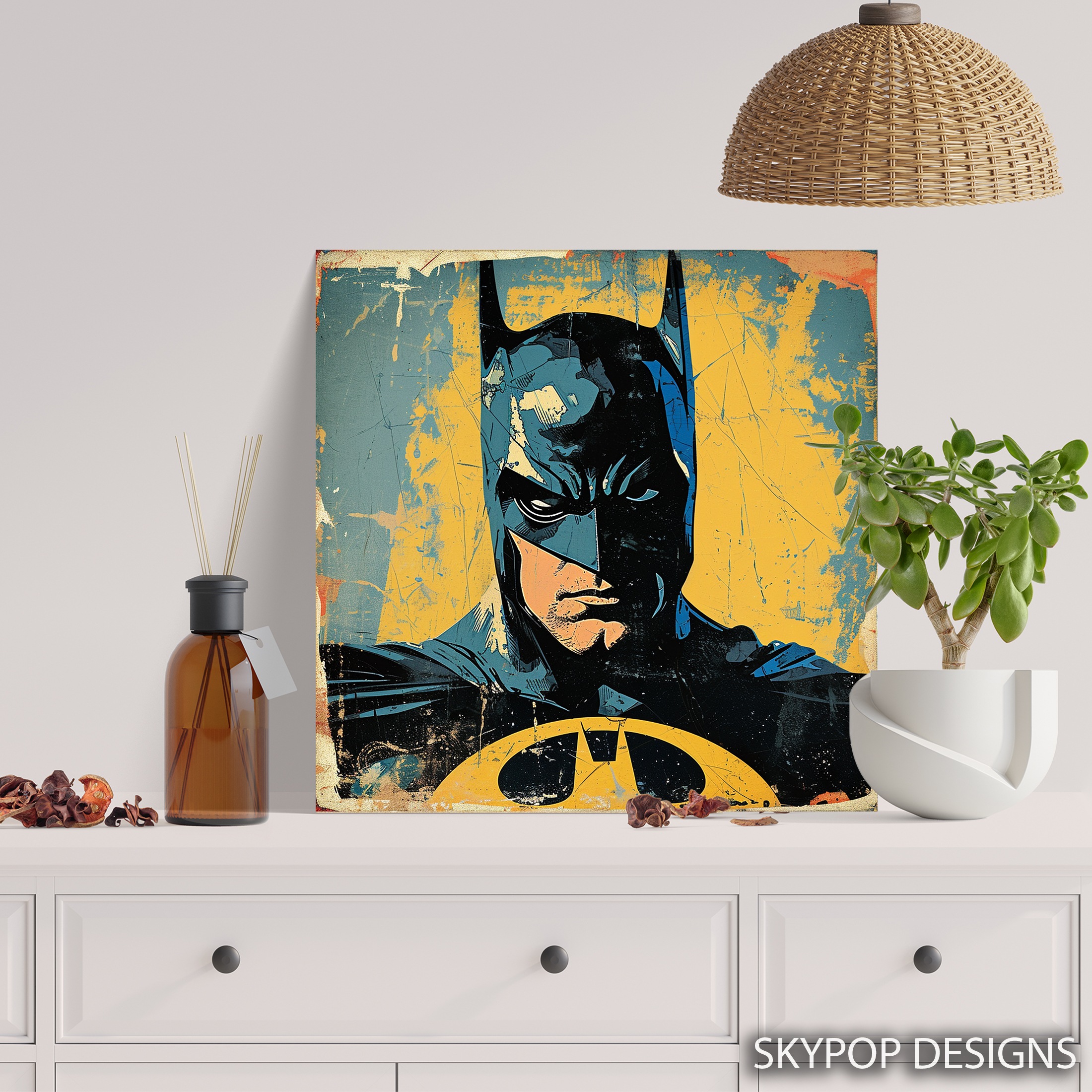 Elevate your space with this striking Batman canvas wall art that brings iconic superhero energy to any room. This eye-catching poster features a bold, pop art-inspired design of the Dark Knight, perfect for comic book fans and modern art enthusiasts alike. The vibrant yellow background contrasts dramatically with Batman’s signature black mask and suit, creating a powerful visual impact that commands attention. Ideal for contemporary living rooms or as a standout piece in a minimalist office, this canvas art adds a touch of urban cool to your decor. The gritty, street art-style treatment gives the classic character a fresh, edgy look that resonates with today’s design trends. Whether you’re a longtime Batman follower or simply appreciate striking graphic art, this piece offers versatile appeal. The high-quality printing captures every detail, from the intense expression to the iconic bat emblem. Transform your game room into a superhero haven or make a bold statement in your home theater with this dynamic wall art. The retro-meets-modern aesthetic works well in various interior styles, making it a great conversation starter. Upgrade your wall decor today with this captivating Batman artwork that celebrates pop culture and artistic expression in one powerful package.