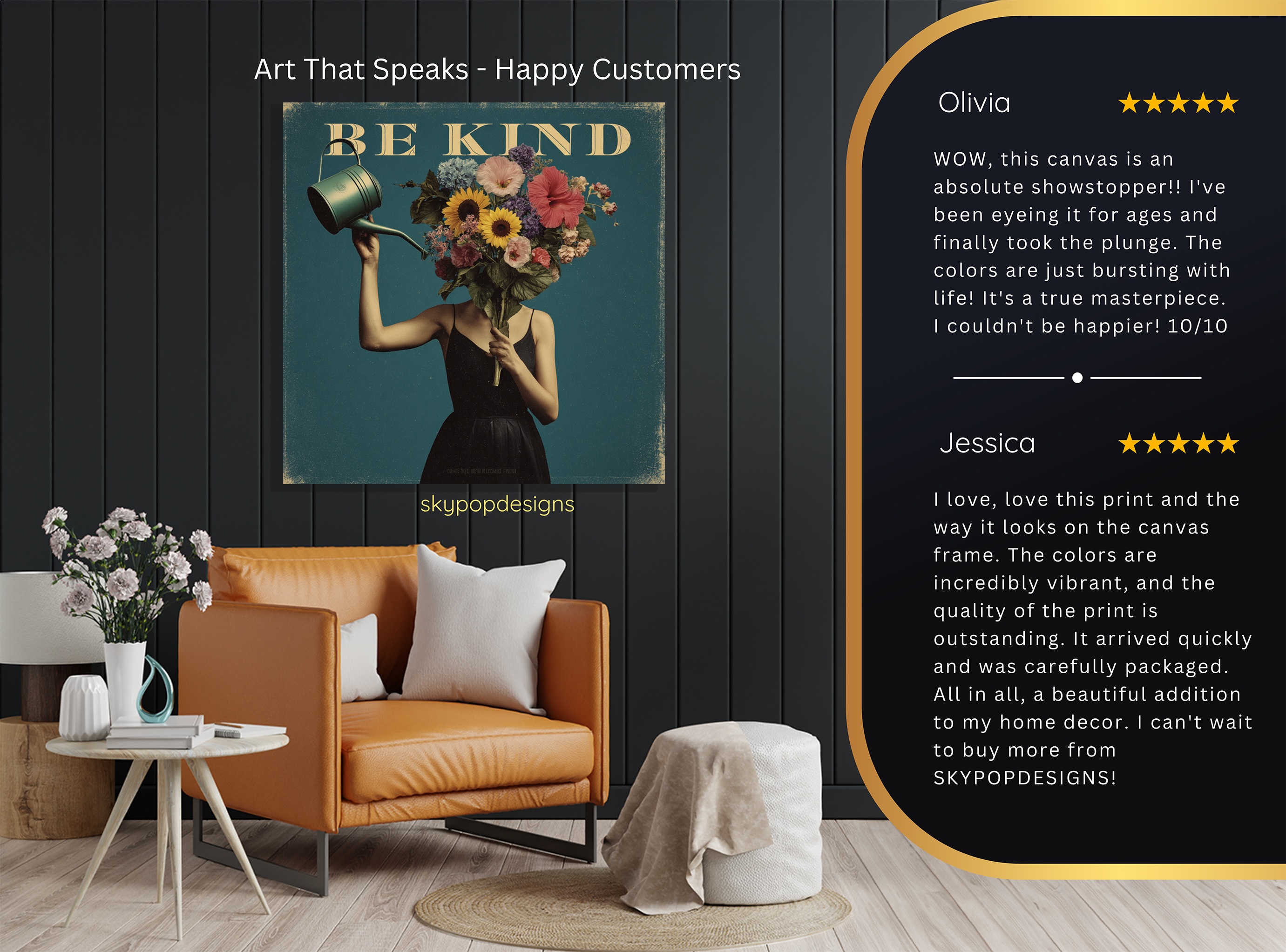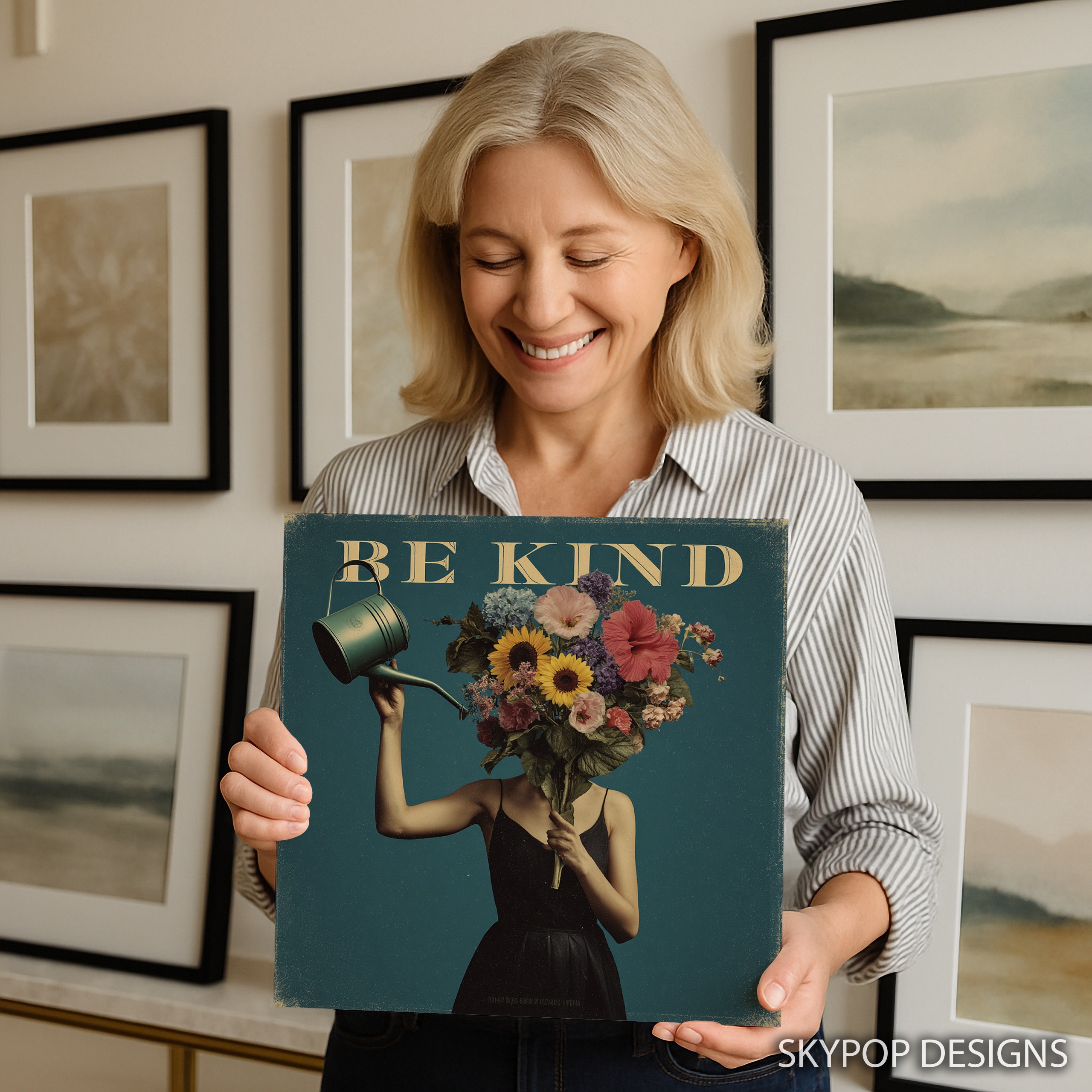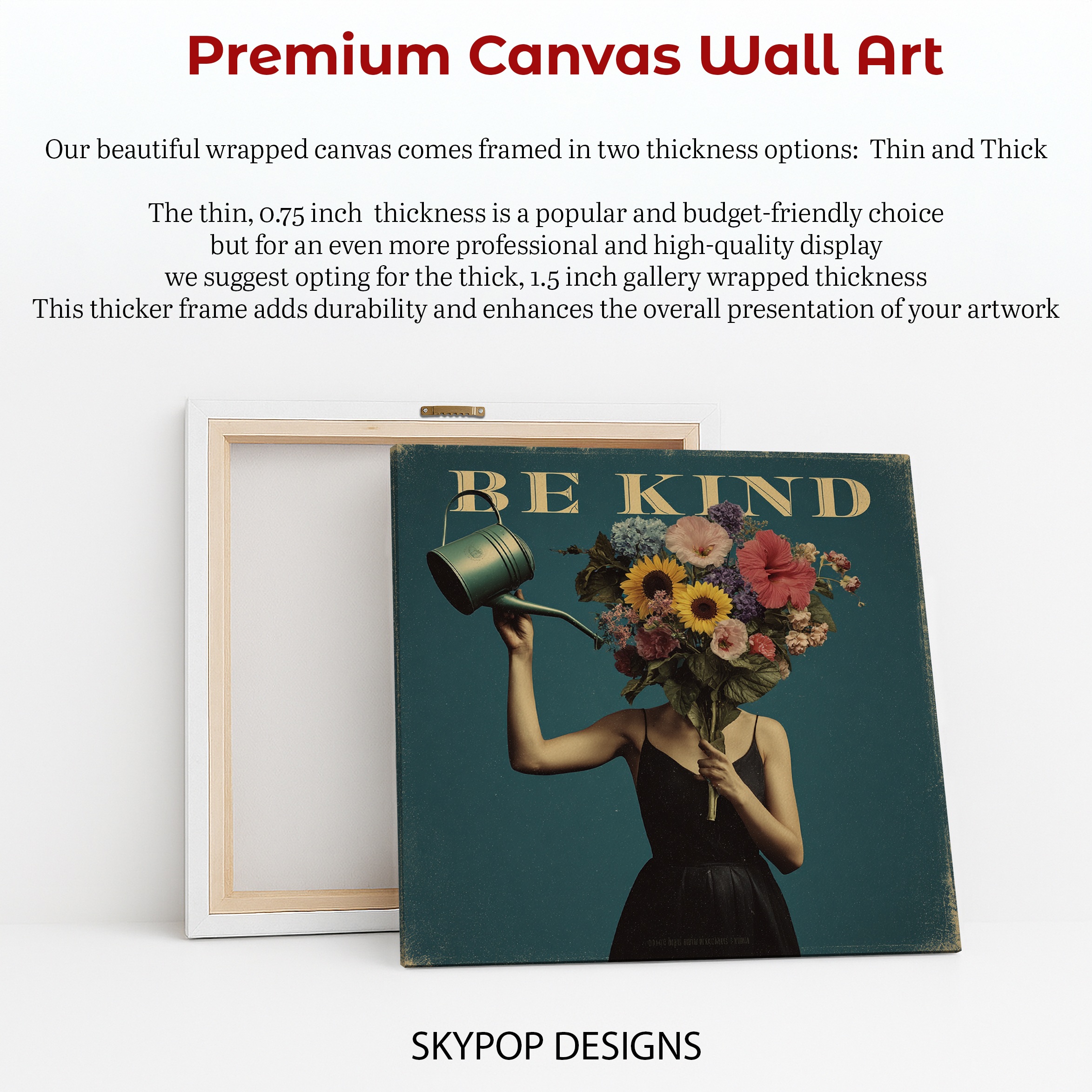 Transform your space with this thought-provoking “Be Kind” canvas wall art, blending vintage charm with a powerful modern message. This stunning poster features a vibrant bouquet of flowers replacing a figure’s head, symbolizing growth, beauty, and the blossoming of kindness. The teal background adds a contemporary pop, making it perfect for bohemian living rooms or modern office spaces. Sunflowers, hibiscus, and hydrangeas burst with life, creating a colorful focal point that instantly uplifts any room. The watering can held aloft represents nurturing kindness, ideal for mindful home decor. This versatile canvas art works beautifully in bedrooms, dining rooms, or entryways, reminding us daily to cultivate compassion. The distressed edges give a nostalgic feel, appealing to vintage art lovers while maintaining a fresh, relevant message. High-quality printing ensures every petal and leaf is captured in vivid detail, making this a long-lasting addition to your wall decor. Whether you’re redecorating or searching for a meaningful housewarming gift, this “Be Kind” artwork speaks volumes. Elevate your space and inspire positivity with this unique blend of floral beauty and mindful living. Add this captivating canvas to your collection and let kindness bloom in your home today.