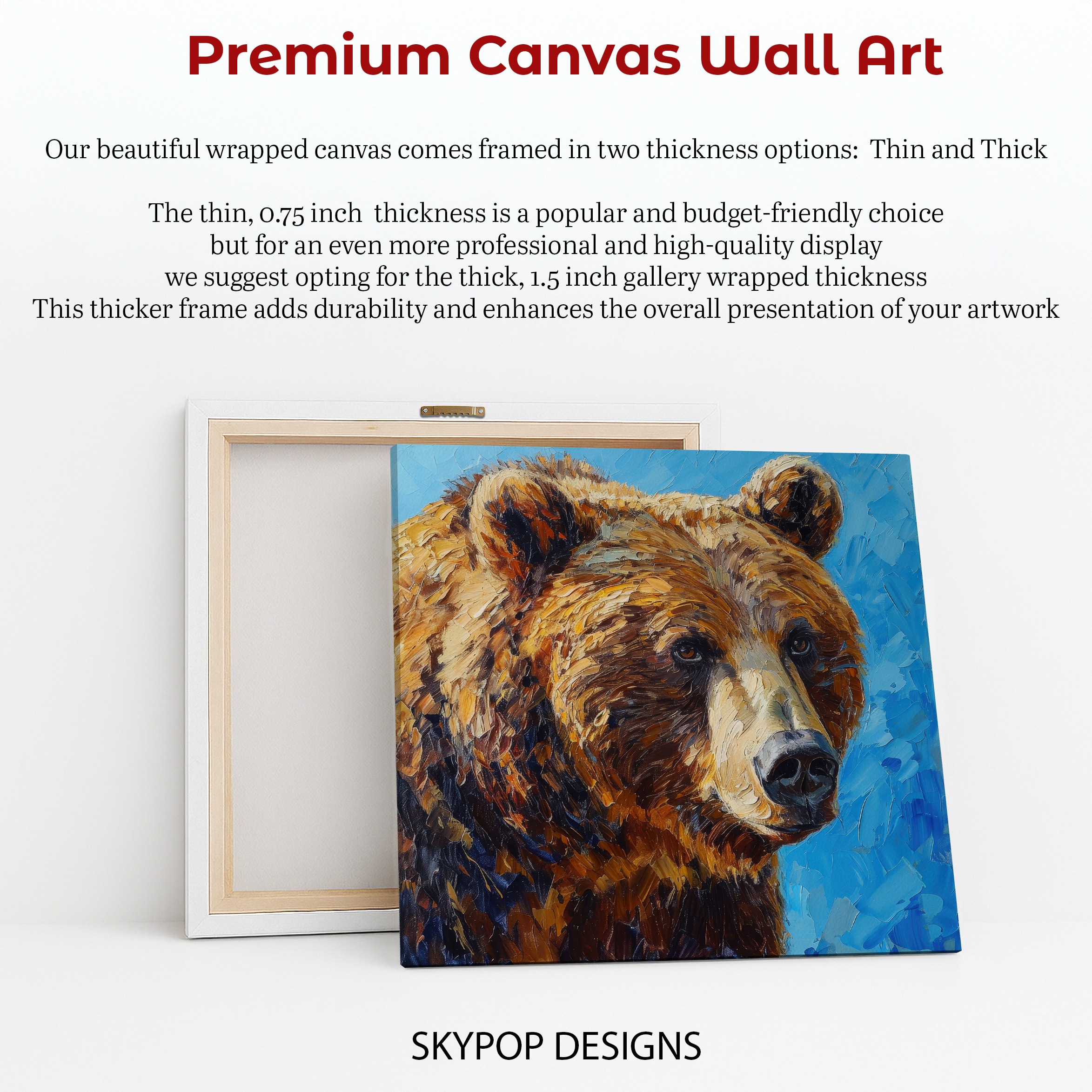 Keywords: bear canvas art, majestic bear art, nature wall art, animal print, wildlife art, contemporary art, modern decor, rustic decor, traditional decor, living room art, bedroom wall art, entryway decor, office wall art, brown art, blue art, multicolor art, black art, bear portrait, impressionist art, statement piece, home decor, wall decor, framed art, canvas paintings, textured art, painterly art, gift for wildlife lover, birthday gift, holiday gift, housewarming gift