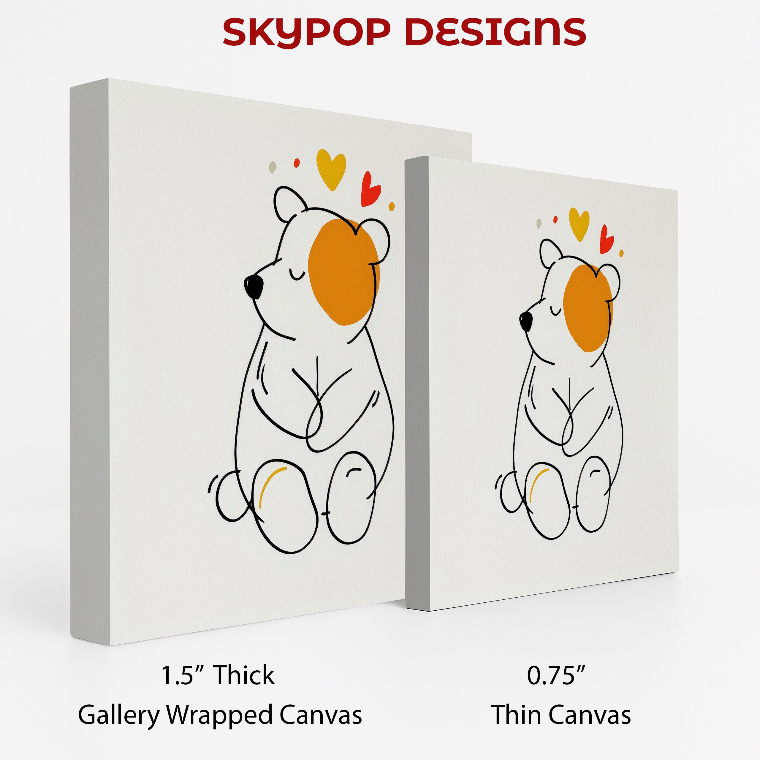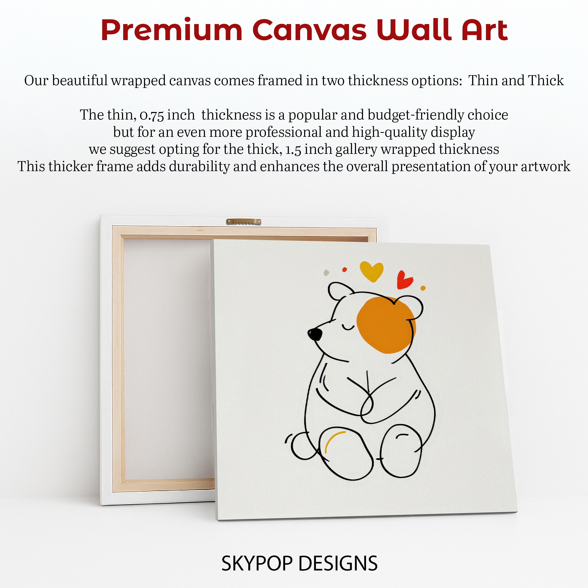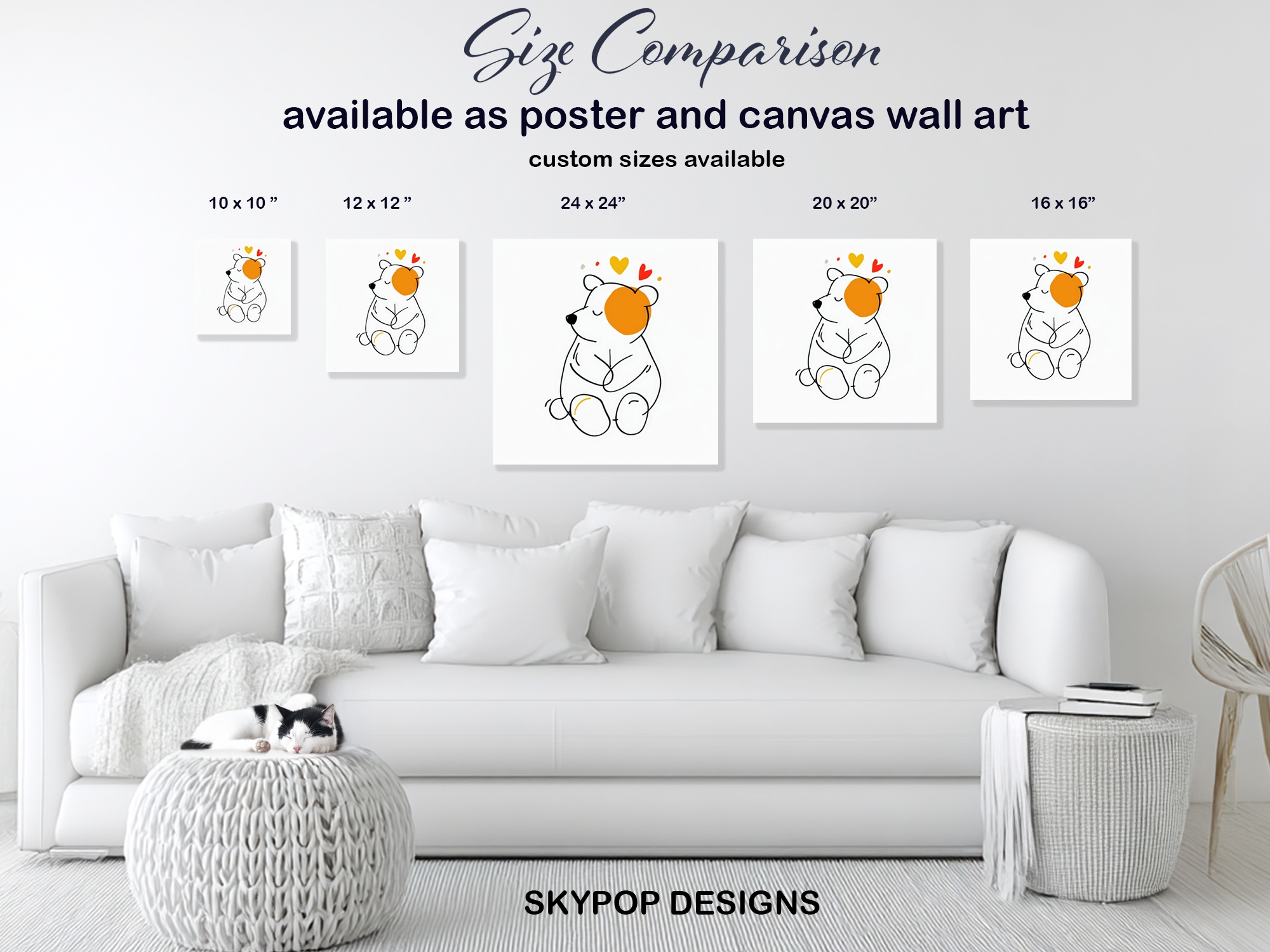 Capture hearts with this adorable bear canvas wall art, featuring a sweet bear illustration radiating love. This charming poster or canvas wall art seamlessly blends abstract elements with whimsical animal art, creating a captivating focal point. Perfect for transforming a child’s room into a cozy sanctuary or adding a touch of warmth to a modern living room, this piece inspires joy and tenderness. The vibrant pops of orange and red from the hearts evoke feelings of affection and happiness, making this canvas wall art an ideal choice for bohemian or minimalist decor. Its clean lines and simple design allow it to complement a wide range of interior styles, from playful nurseries to serene adult bedrooms. This versatile artwork can also serve as a thoughtful housewarming gift or a special present for birthdays and holidays. The high-quality printing ensures the rich colors and delicate details of this bear print are showcased beautifully. Elevate your home’s ambiance with this delightful bear art, a perfect addition to your collection of wall decor. Make your space shine with this heartwarming piece of canvas wall art today.
