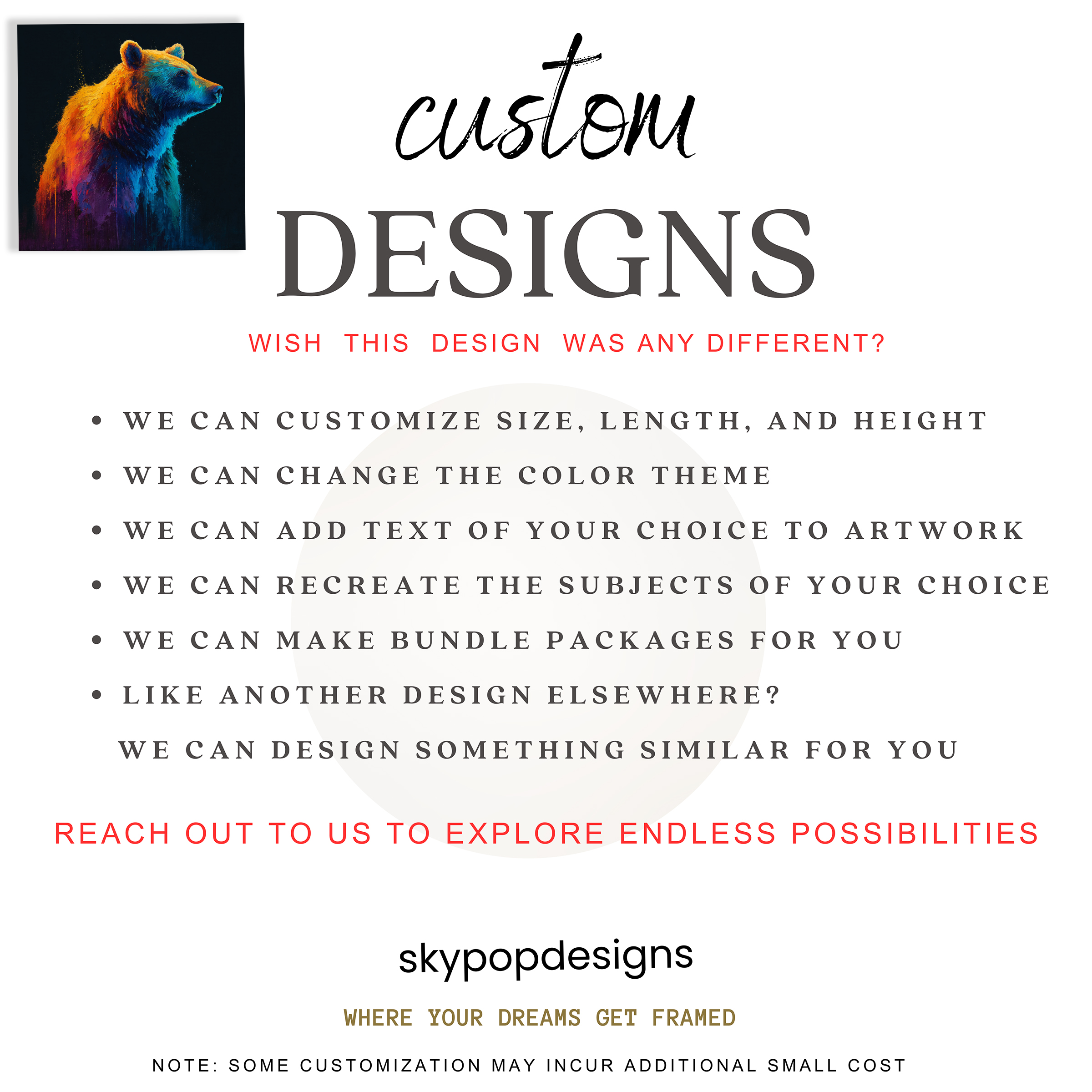 At SKYPOPDESIGNS, we specialize in high-quality canvas and poster prints designed to bring sophistication and style to your space. Please note that our designs are not created with 3D textures or as original oil, acrylic, or watercolor paintings; they are instead HD reproductions of original artwork. This approach allows us to offer these visually stunning pieces at competitive prices, ensuring you receive top-tier, maintenance-free art that’s easy to enjoy.
