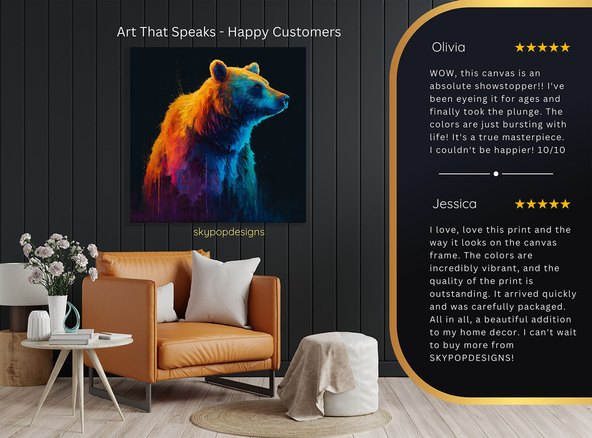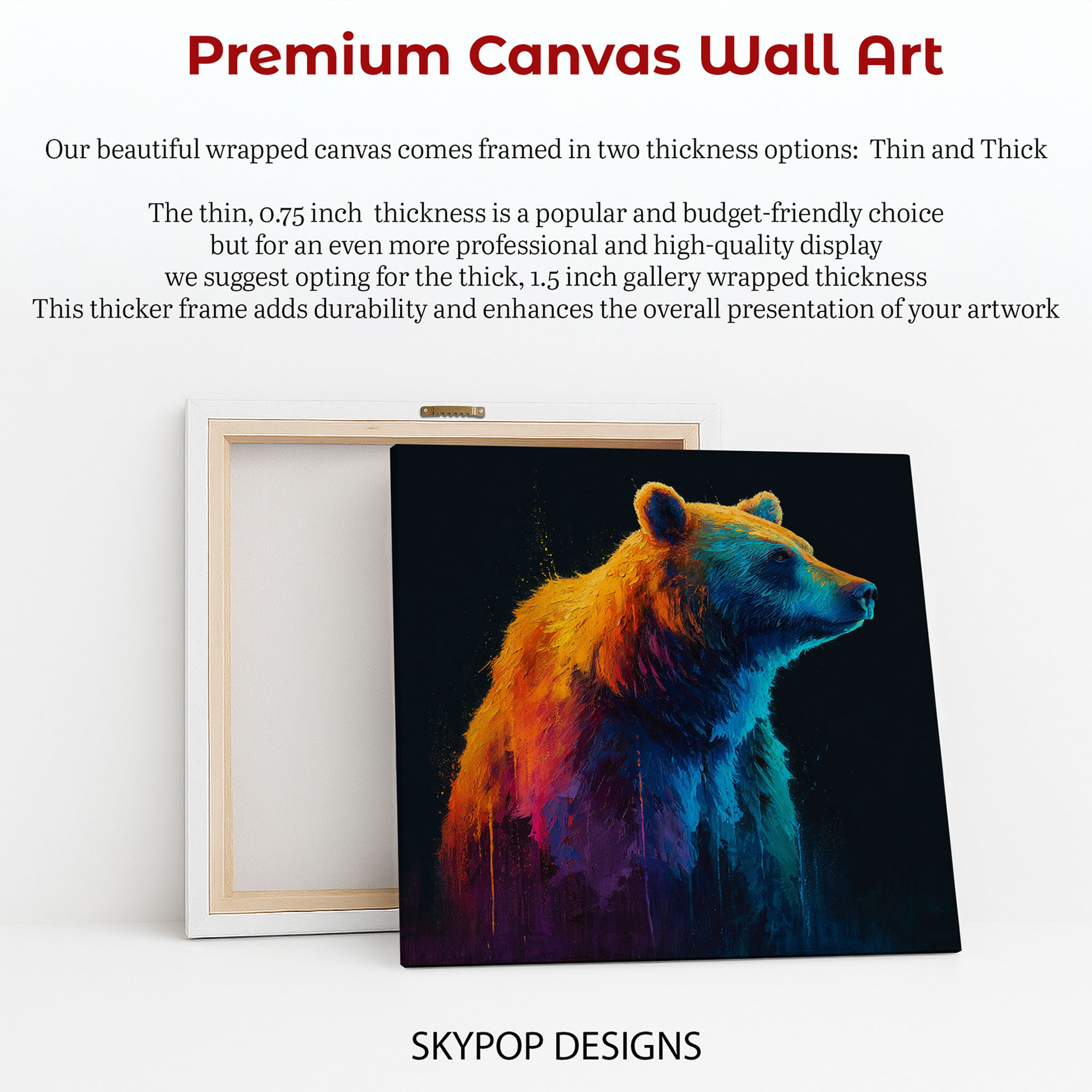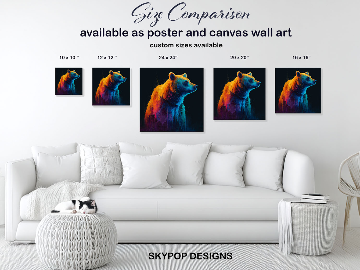 Transform your space with this striking bear canvas wall art, featuring a vibrant portrait in a contemporary abstract style. This poster or canvas wall art is perfect for modern living room decor, adding a bold splash of color and personality. The interplay of fiery oranges and cool blues creates a captivating visual energy, making it an ideal focal point for any home. This animal art piece is also a fantastic addition to a sophisticated office or a stylish entryway, elevating the atmosphere instantly. The striking color palette, including rich purples and deep blacks, evokes a sense of power and mystery that complements minimalist decor beautifully. High-quality printing ensures the textured brushstrokes and vivid hues of this bear canvas wall art are captured with exceptional detail. Whether you’re looking to inspire creativity in your workspace or make a statement in your main living area, this artwork delivers. It’s the perfect gift for nature lovers, art enthusiasts, or anyone looking to enhance their home with unique wall decor. Celebrate the raw beauty of wildlife with this stunning poster that brings a touch of modern artistry to your everyday life. Elevate your interior design with this versatile canvas wall art that promises to spark conversation and admiration. Discover the power and allure of this vivid bear artwork today.