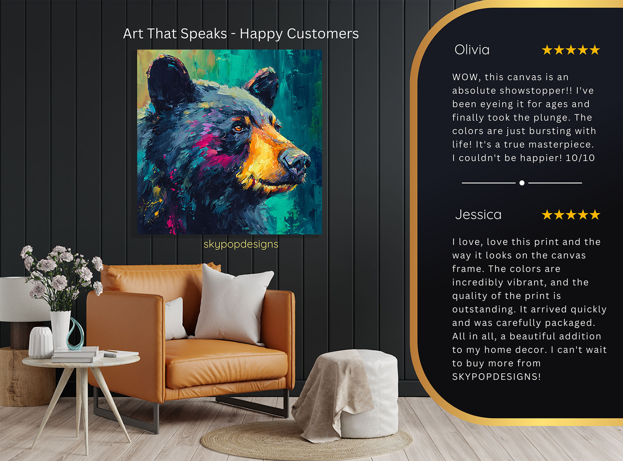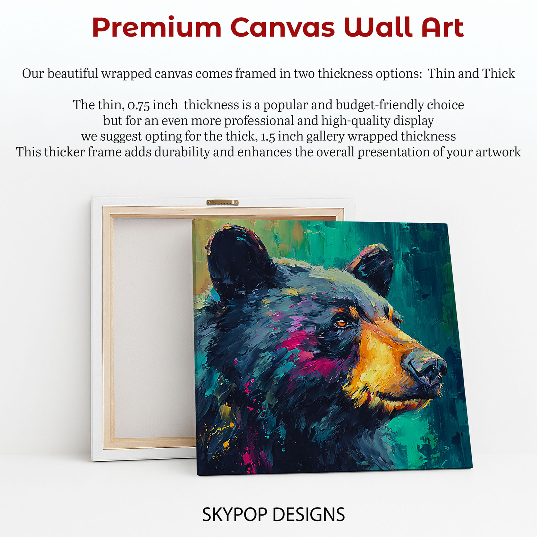Transform your space with this captivating bear canvas wall art that showcases the wild beauty of nature in a striking contemporary style. This poster or canvas wall art brings a powerful and unique energy to any room, making it a perfect statement piece for modern living room wall decor. The vibrant multicolor palette, with accents of teal, black, and yellow, creates a dynamic and eye-catching composition that celebrates the raw essence of the bear. This animal art is ideal for rustic decor enthusiasts, adding a touch of wild charm to bohemian settings, or enhancing the bold aesthetic of a modern office. The thick, impasto brushstrokes give the artwork a sense of depth and texture, making each glance a new discovery. This wall art is perfect for creating an inspiring atmosphere in your bedroom or a welcoming focal point in your entryway. High-quality printing ensures the rich colors and dramatic textures are vividly preserved on canvas. A fantastic gift for nature lovers, birthdays, or housewarming celebrations, this piece adds a distinctive character to any home. Elevate your interior design with this stunning bear artwork that embodies strength and natural allure. This canvas wall art is a conversation starter and a reminder of the untamed spirit of the wild. Make your walls come alive with this impressive bear poster today.