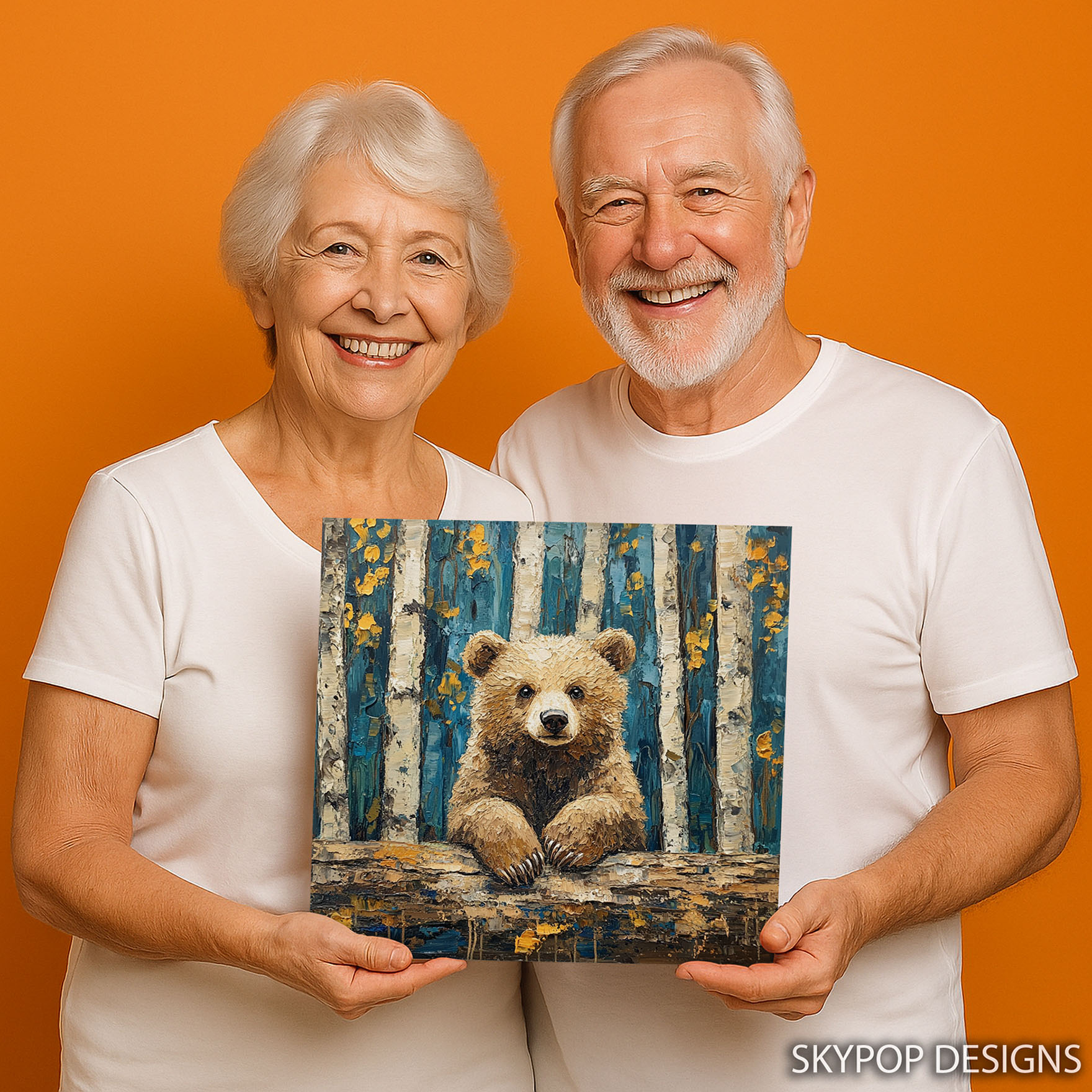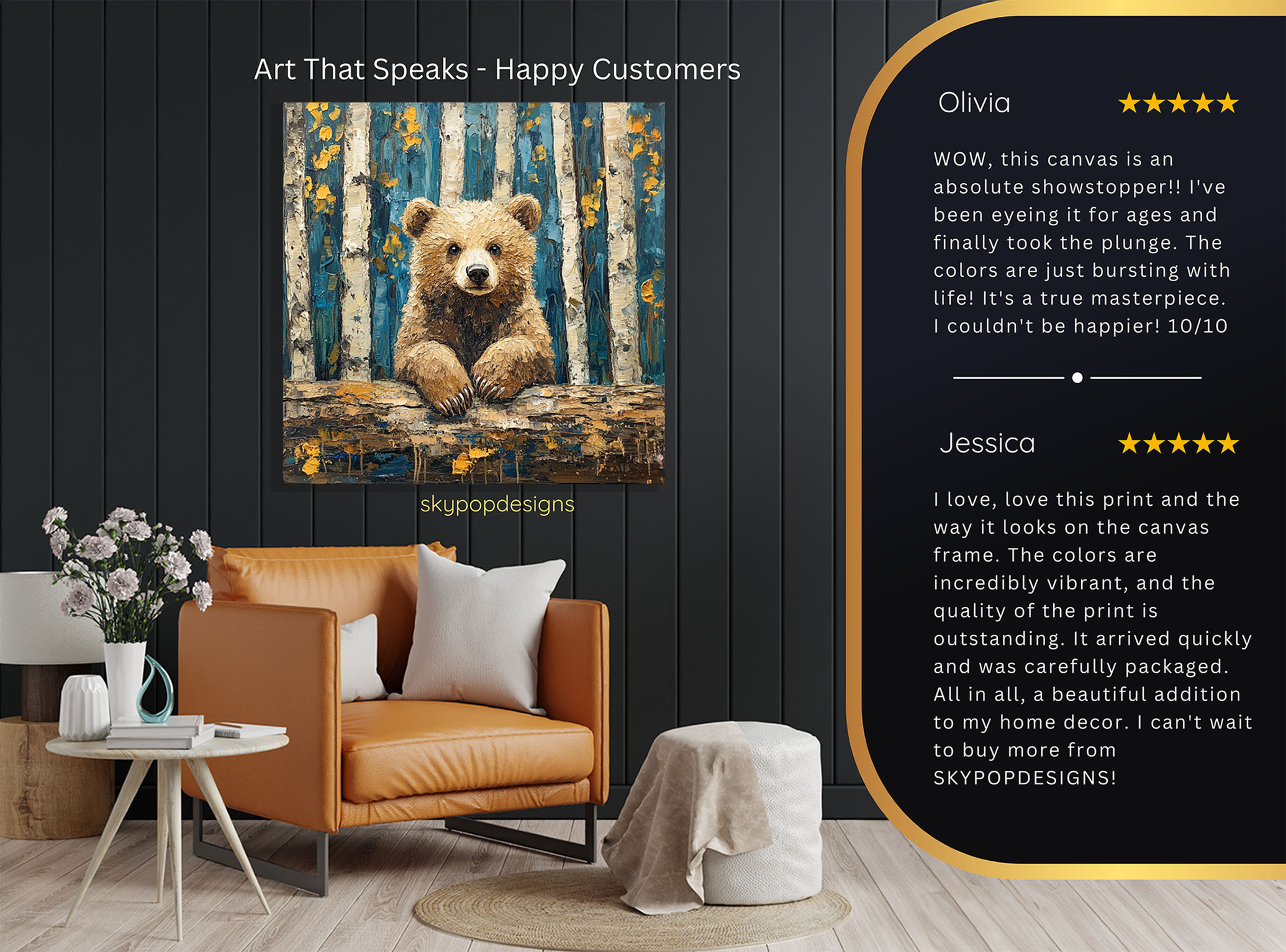 Discover the charm of this adorable bear canvas wall art, a perfect addition to any nature-themed collection. This vibrant poster or canvas wall art brings the wild beauty of the forest into your home with its playful bear and striking birch tree background. The textured brushstrokes and rich color palette, featuring warm browns, deep blues, and pops of yellow, create a captivating visual experience. Ideal for rustic and farmhouse decor styles, this animal art piece also complements bohemian spaces looking for a touch of cozy charm. This bear artwork is perfect for a living room wall decor, a whimsical children’s room, or a welcoming entryway statement piece. The captivating gaze of the bear and the dynamic forest backdrop inspire a sense of wonder and connection to nature. High-quality printing ensures the intricate details of the bear’s fur and the texturized foliage are beautifully rendered, making this canvas wall art a true work of art. This versatile poster or canvas wall art offers a heartwarming piece that can be a focal point in your bedroom or add personality to your guest room. It’s also a wonderful gift for birthdays, housewarmings, or any occasion for nature lovers. Elevate your space with this stunning bear canvas art that brings the outdoors in, celebrating the beauty of wildlife in a contemporary style. Transform your home with the enchanting presence of this captivating bear artwork today.