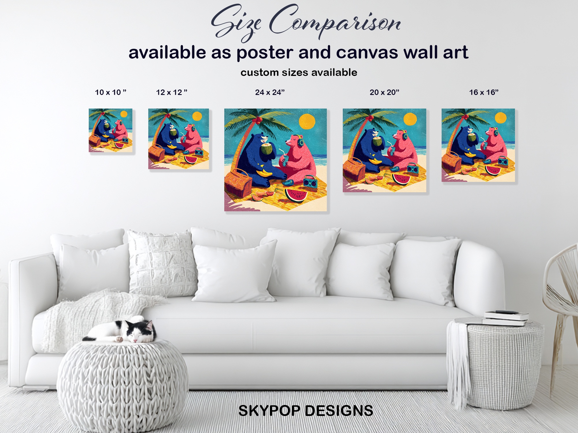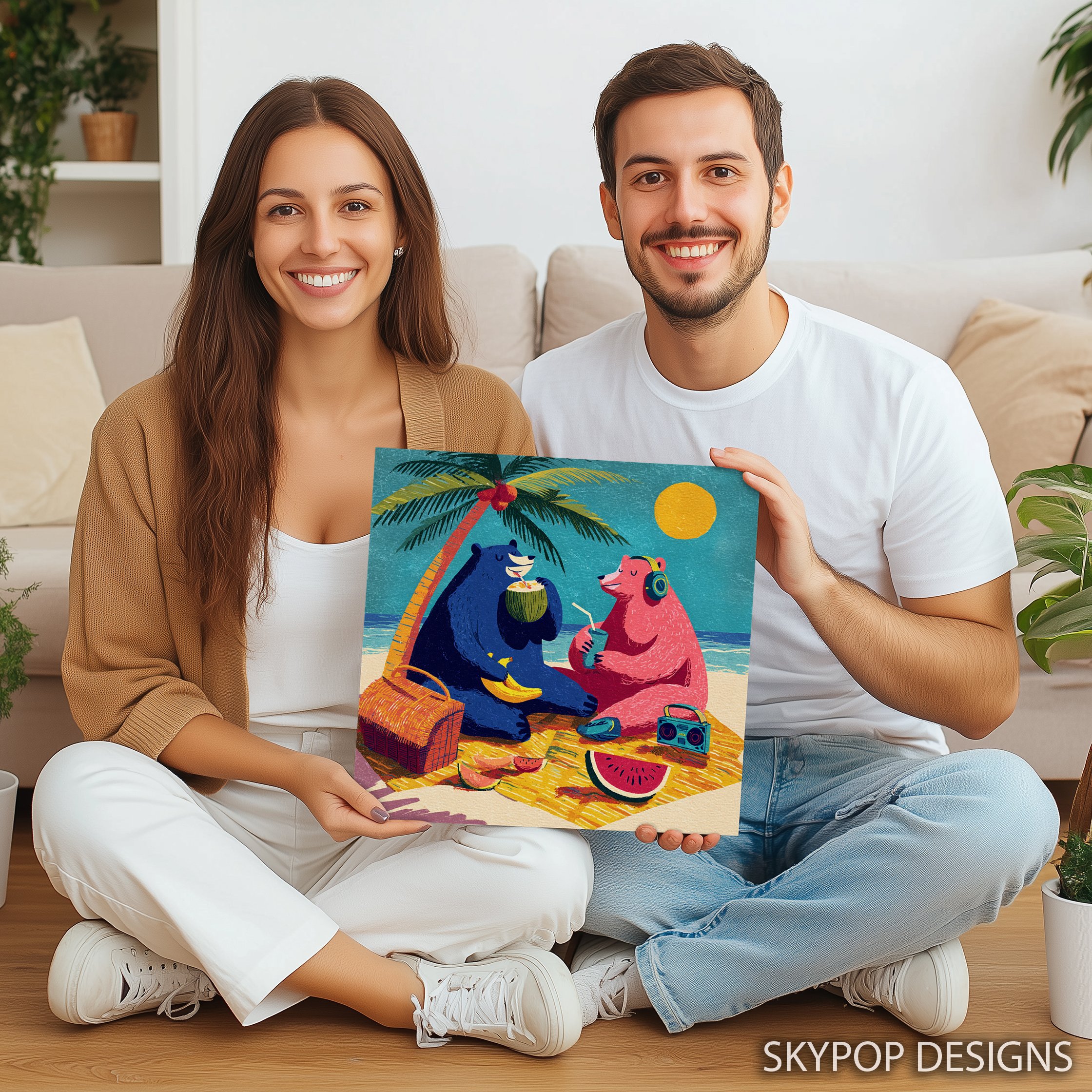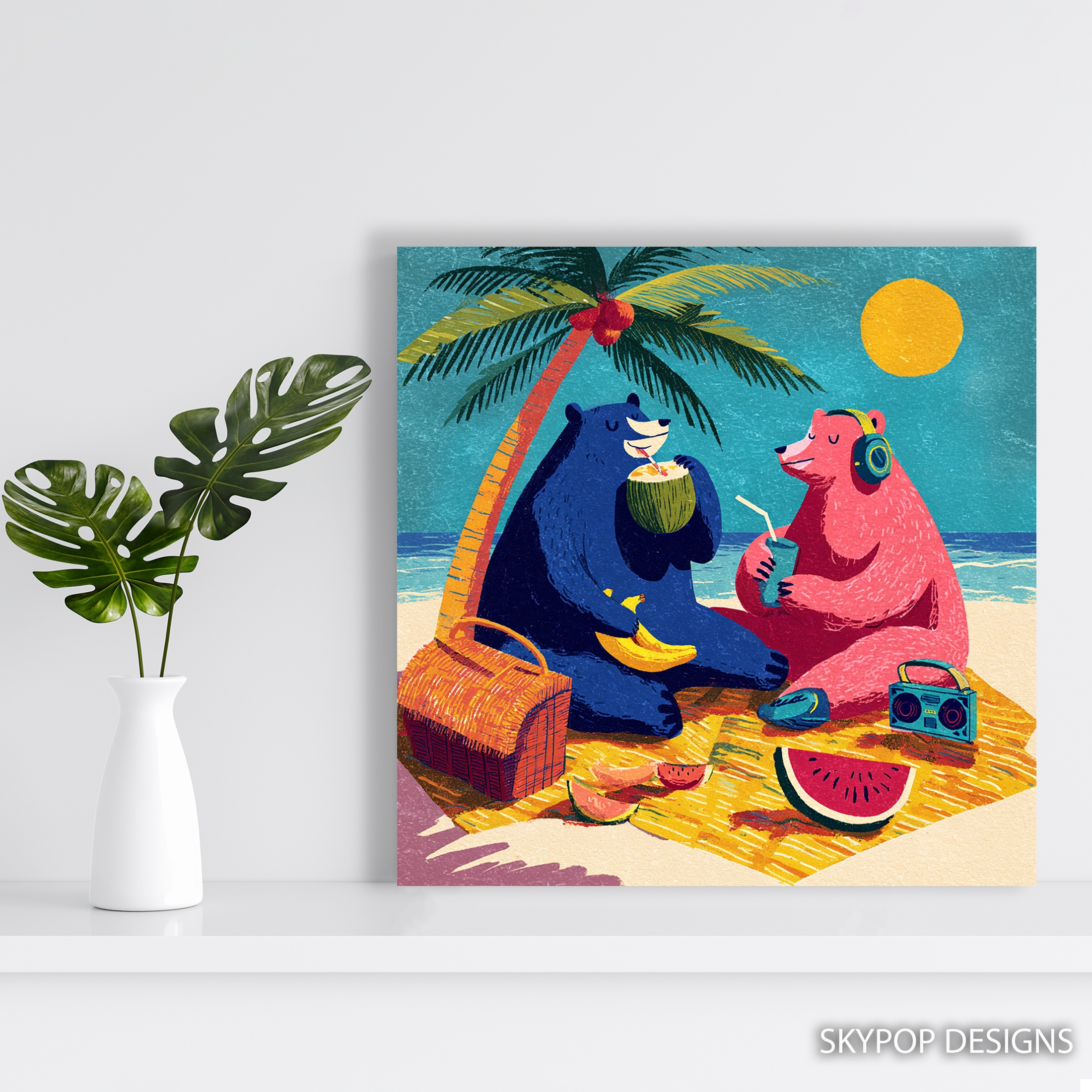 Bring the fun of a tropical beach party to your walls with this playful bear canvas wall art. This vibrant poster features two colorful bears enjoying a sunny day by the sea, perfect for adding a cheerful touch to any room. The whimsical illustration style and bold color palette make this piece an ideal focal point for contemporary living rooms or beach-themed bedrooms. Watch as the blue bear sips from a coconut while the pink bear enjoys a refreshing drink, both surrounded by summery elements like a palm tree, watermelon, and a bright yellow sun. This canvas wall art captures the essence of a carefree vacation, bringing that relaxed coastal vibe into your home. The retro-inspired design adds a nostalgic feel, making it a great conversation starter for guests. Ideal for bohemian decor lovers, this artwork injects personality and warmth into any space. The textured look of the illustration gives depth to the piece, ensuring it remains engaging from every angle. Whether you’re decorating a beach house, children’s room, or want to add a pop of color to your bedroom, this versatile wall art adapts to various interior styles. High-quality printing ensures every charming detail is captured, from the bears’ expressions to the texture of the sand. Perfect as a housewarming gift or to brighten up your own space, this bear-themed canvas celebrates friendship, relaxation, and the joy of summer. Transform your room into a beachy paradise with this unique and cheerful animal art today!