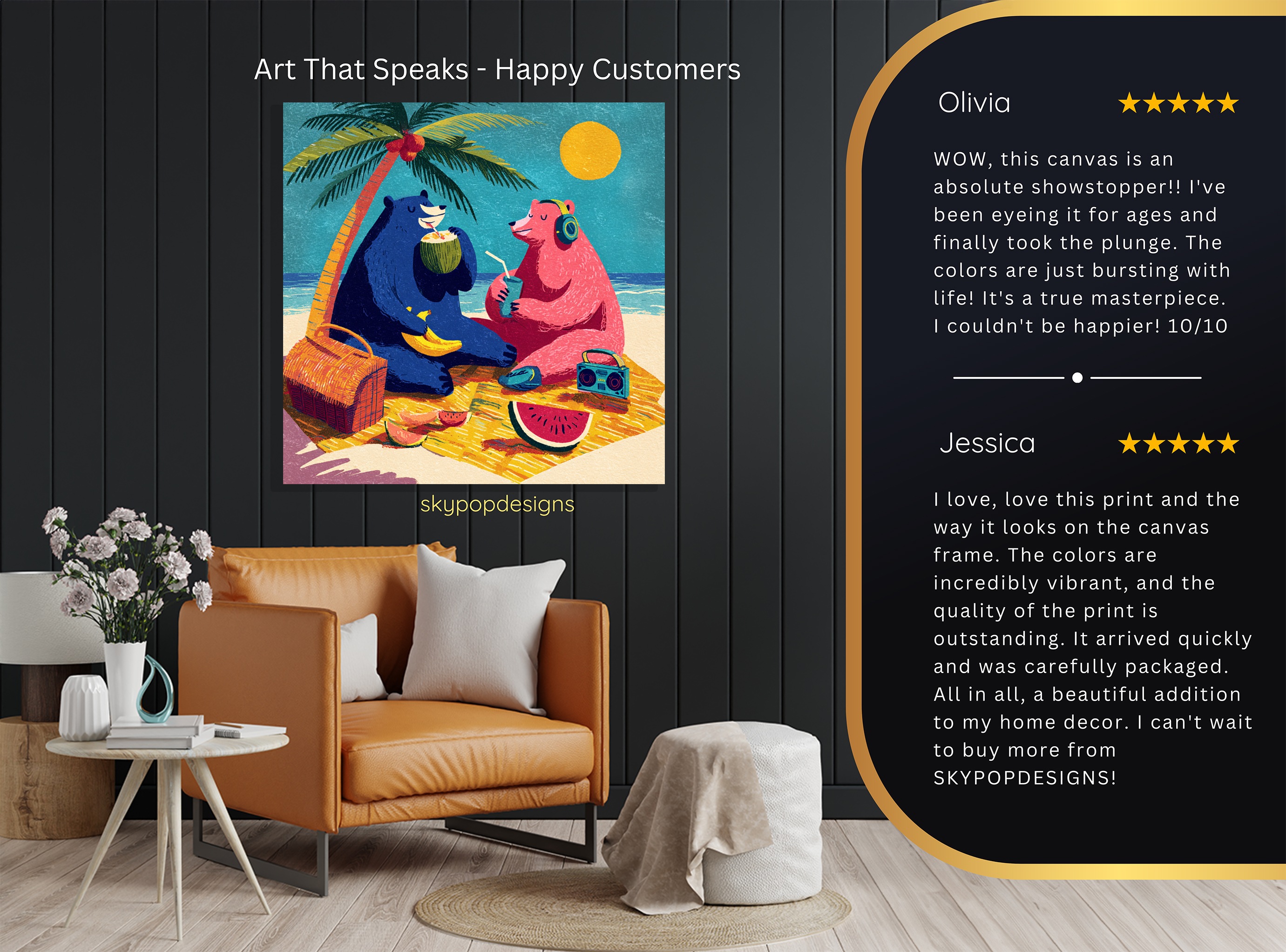 At SKYPOPDESIGNS, we specialize in high-quality canvas and poster prints designed to bring sophistication and style to your space. Please note that our designs are not created with 3D textures or as original oil, acrylic, or watercolor paintings; they are instead HD reproductions of original artwork. This approach allows us to offer these visually stunning pieces at competitive prices, ensuring you receive top-tier, maintenance-free art that’s easy to enjoy.