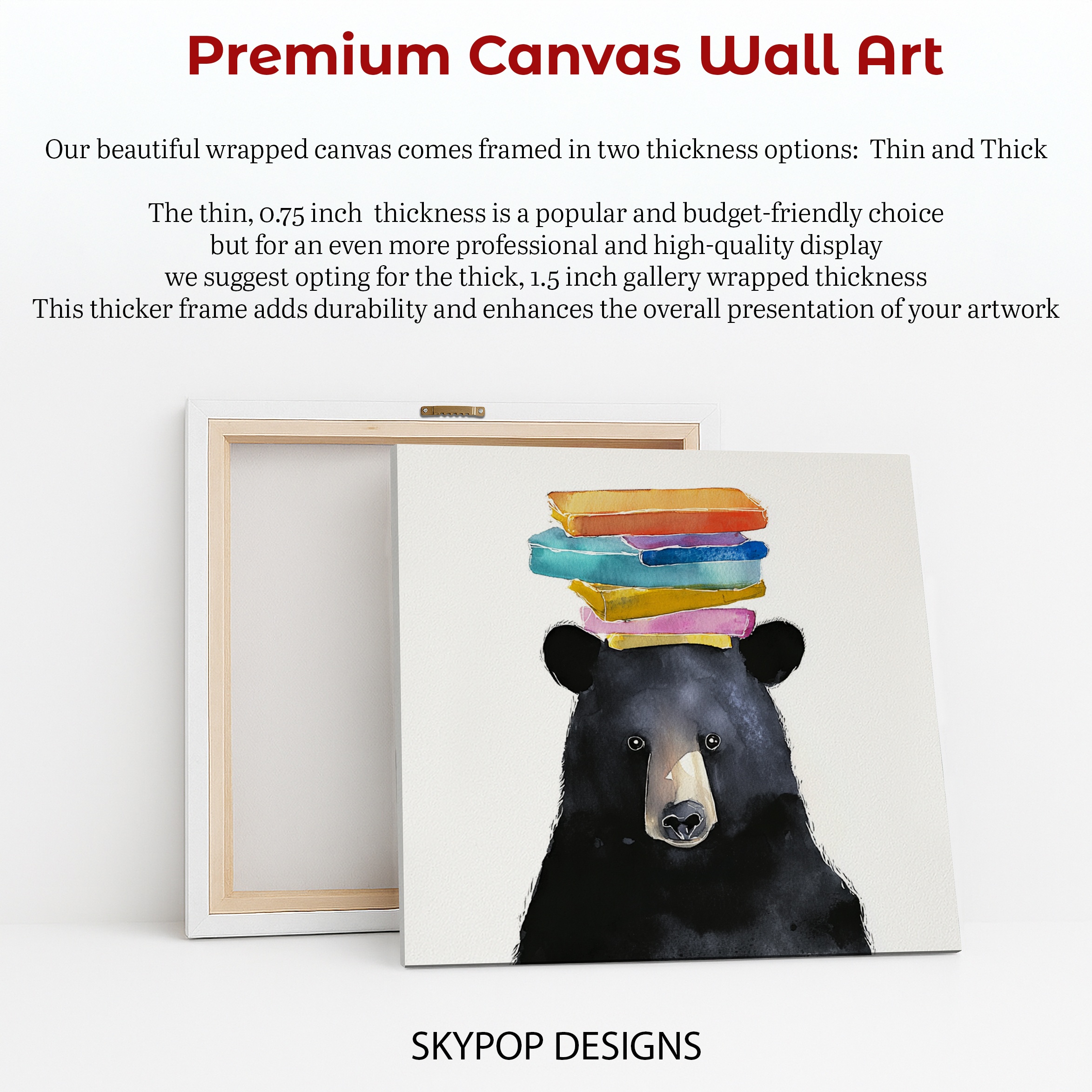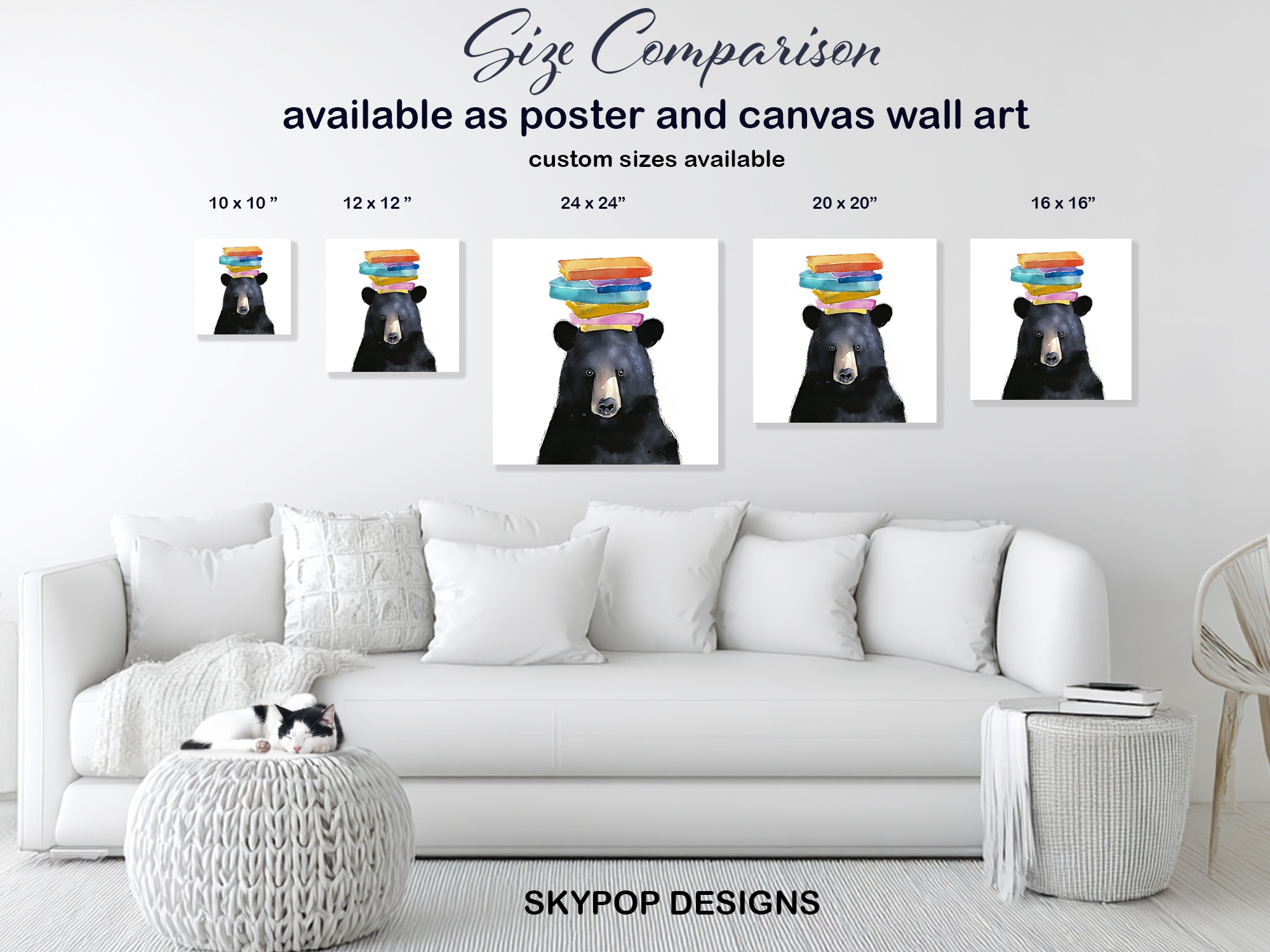 Elevate your space with this charming bear canvas wall art, featuring a playful black bear balancing a colorful stack of books on its head. This whimsical poster transforms any room with its blend of nature-inspired imagery and vibrant colors. Perfect for modern living rooms, cozy reading nooks, or children’s bedrooms, this eye-catching piece adds a touch of warmth and personality to your walls. The contrasting colors of the books against the bear’s dark fur create a striking visual impact, making it an ideal focal point for minimalist decor styles. This versatile canvas art celebrates the joy of reading while bringing a touch of the wild indoors. Ideal for book lovers, nature enthusiasts, or anyone looking to add a conversation starter to their home or office. The high-quality printing captures every detail, from the bear’s expressive eyes to the texture of the book spines. Whether you’re decorating a nursery, sprucing up a study area, or looking for unique housewarming gifts, this bear wall art fits the bill. The combination of cute animal imagery and literary themes makes it a thoughtful present for teachers, librarians, or avid readers. Bring a touch of whimsy and woodland charm to your space with this delightful bear and books canvas. Transform your walls today with this playful and inspiring piece of art that’s sure to spark joy and imagination in any room.