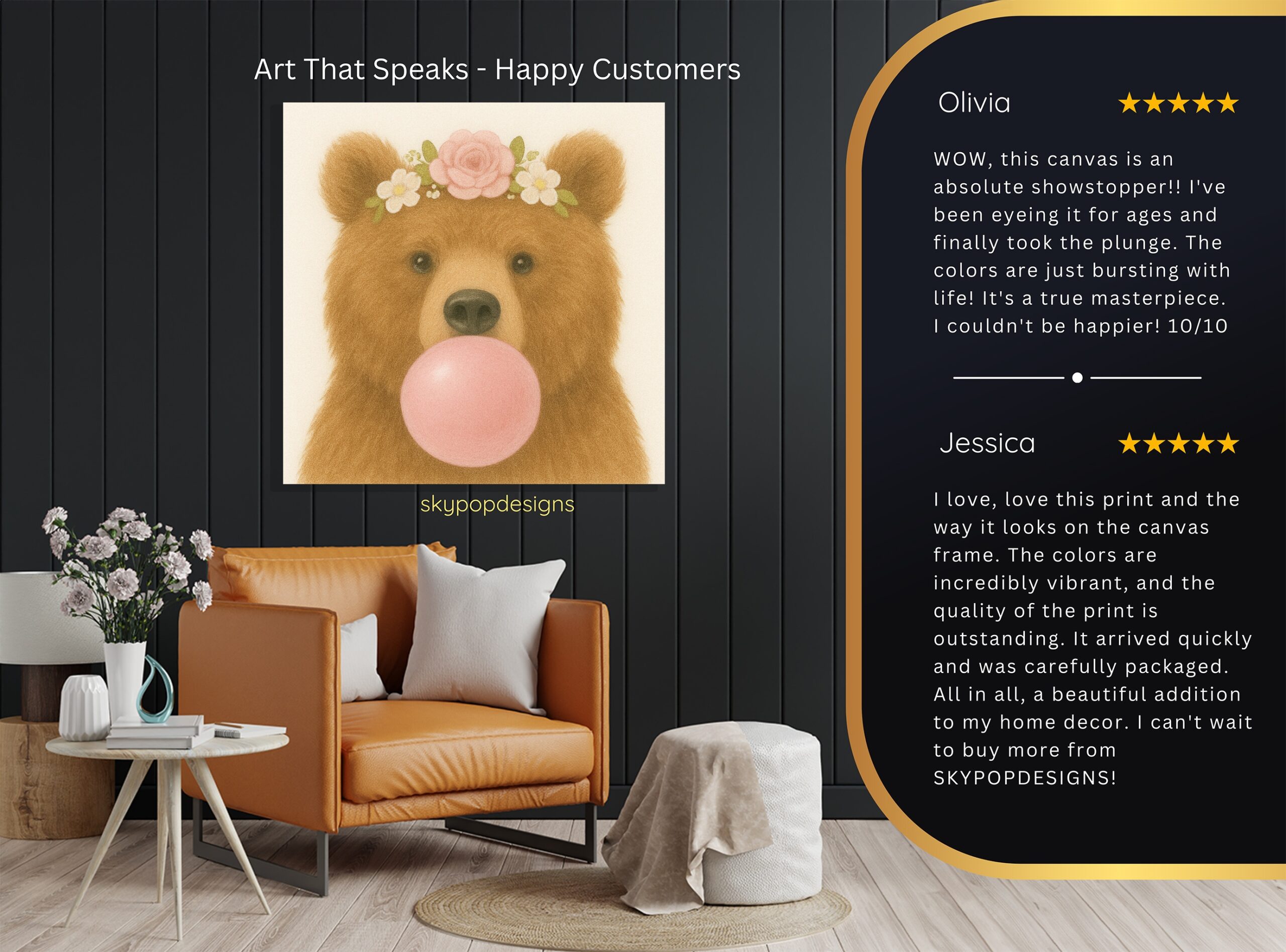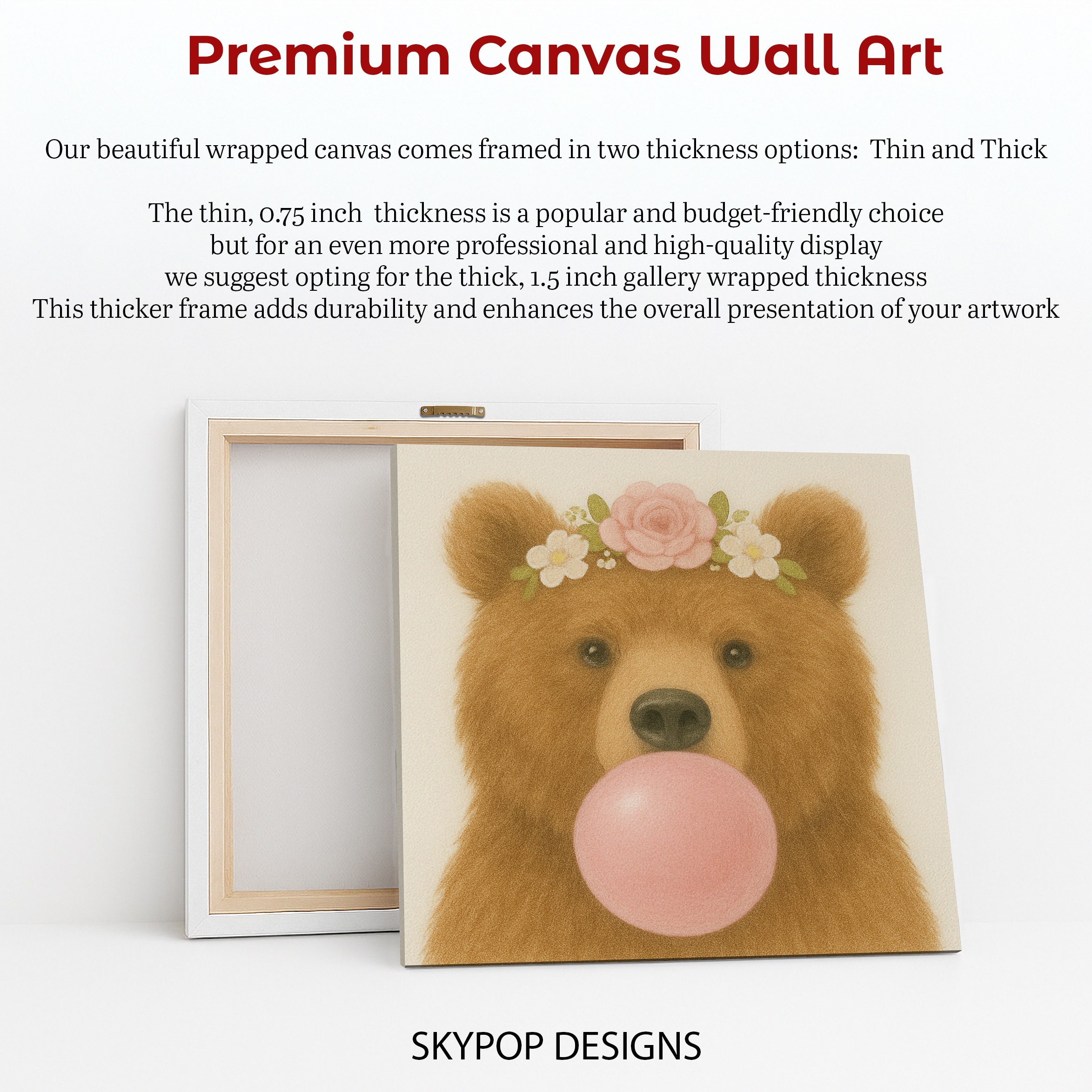 Bring a touch of whimsy to your space with this adorable bear canvas wall art. This charming poster features a fluffy brown bear blowing a big pink bubble gum bubble, crowned with a delicate floral wreath. Perfect for nurseries, children’s rooms, or any space needing a pop of fun, this canvas print combines cute animal art with a touch of nature. The soft, muted color palette of brown, pink, and green creates a soothing atmosphere, ideal for contemporary or bohemian decor styles. This versatile wall art works beautifully as a focal point in bedrooms or as a playful accent in living rooms. The bear’s expression is captivating, drawing viewers in with its gentle eyes and the unexpected bubble gum twist. Ideal as a baby shower gift or to celebrate a child’s birthday, this artwork adds personality and warmth to any room. The high-quality printing captures every fuzzy detail of the bear’s fur and the delicate petals of the floral crown. Whether you’re creating a woodland-themed nursery or adding a touch of whimsy to a rustic living space, this bear bubble gum art is sure to bring smiles. Transform your walls with this unique blend of cute and quirky – a conversation starter that appeals to both kids and adults alike. Elevate your home decor with this playful yet stylish canvas wall art today.