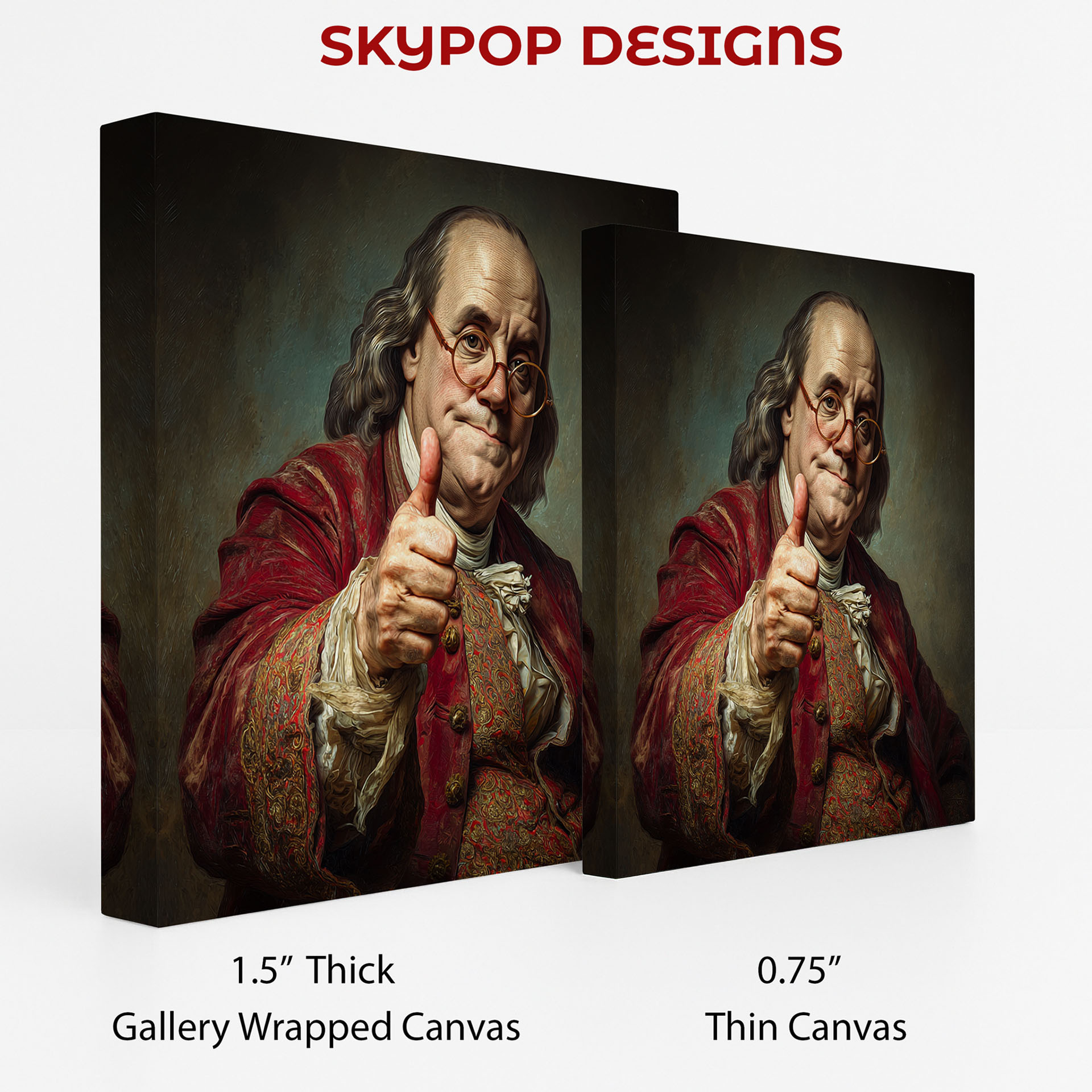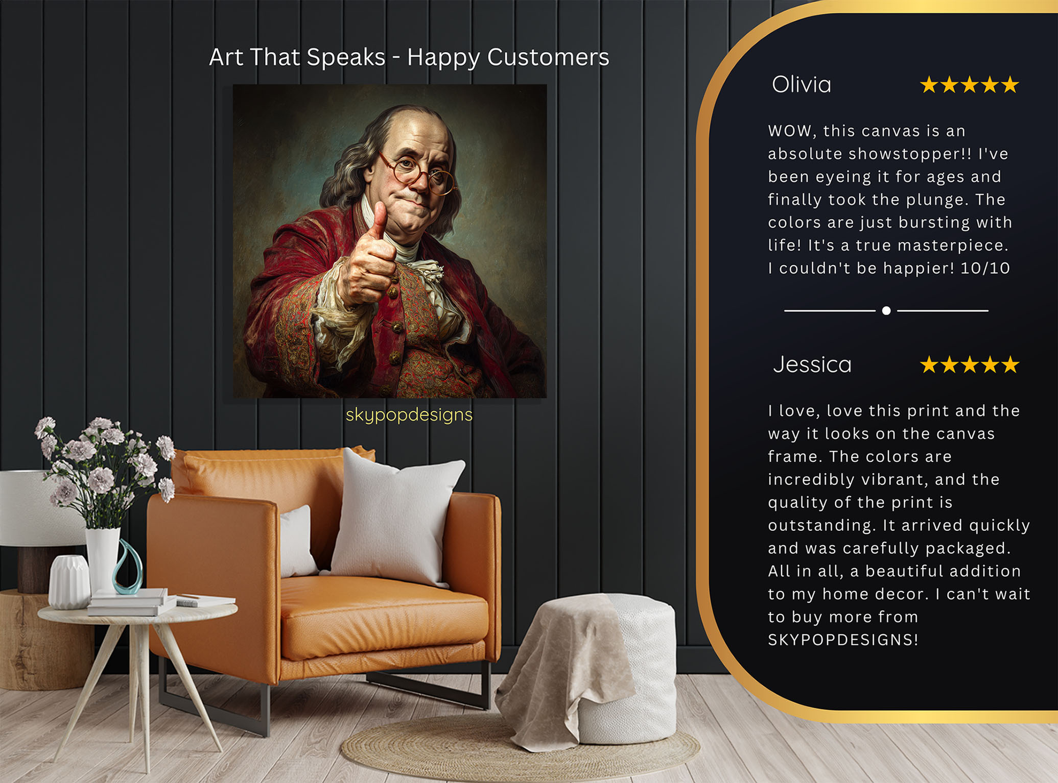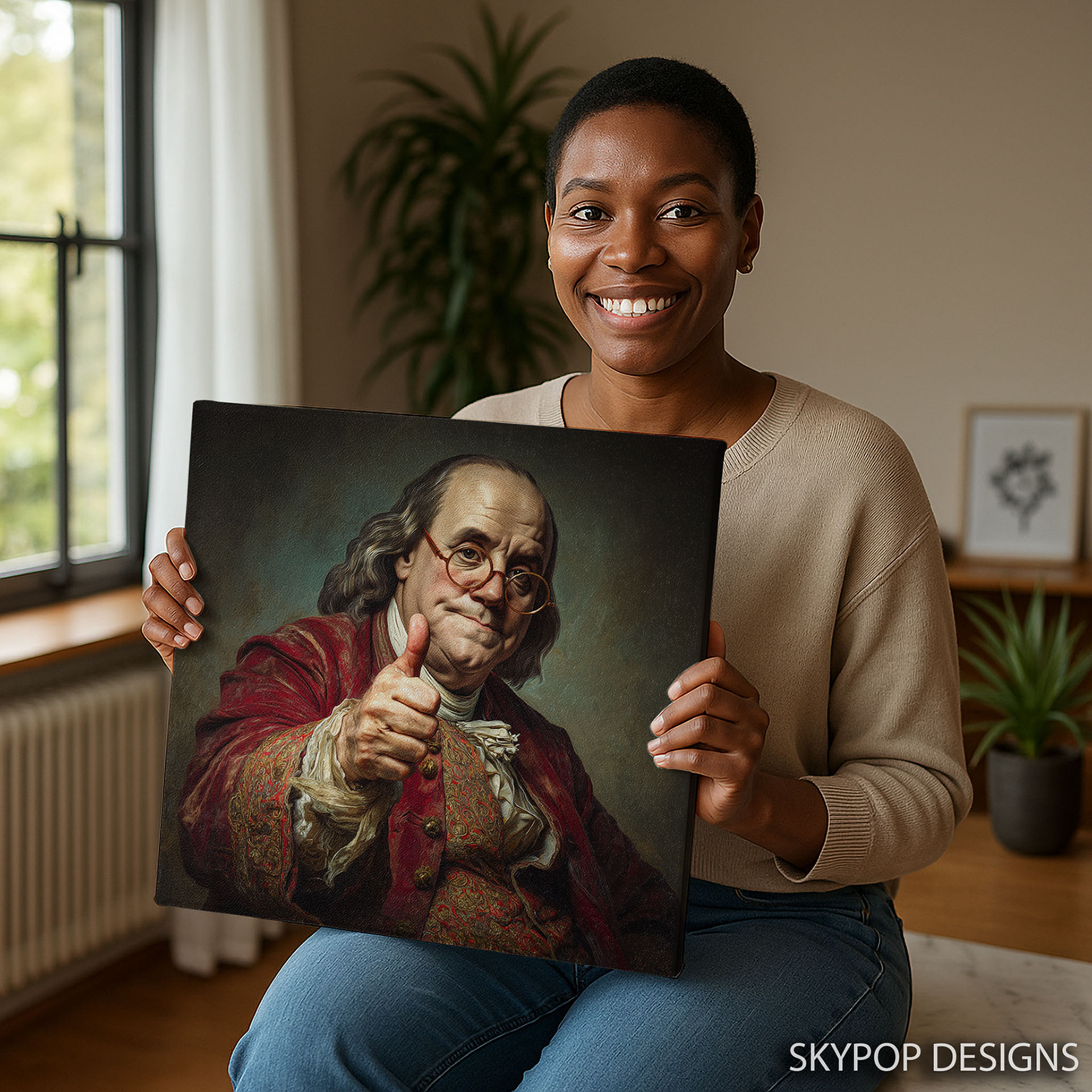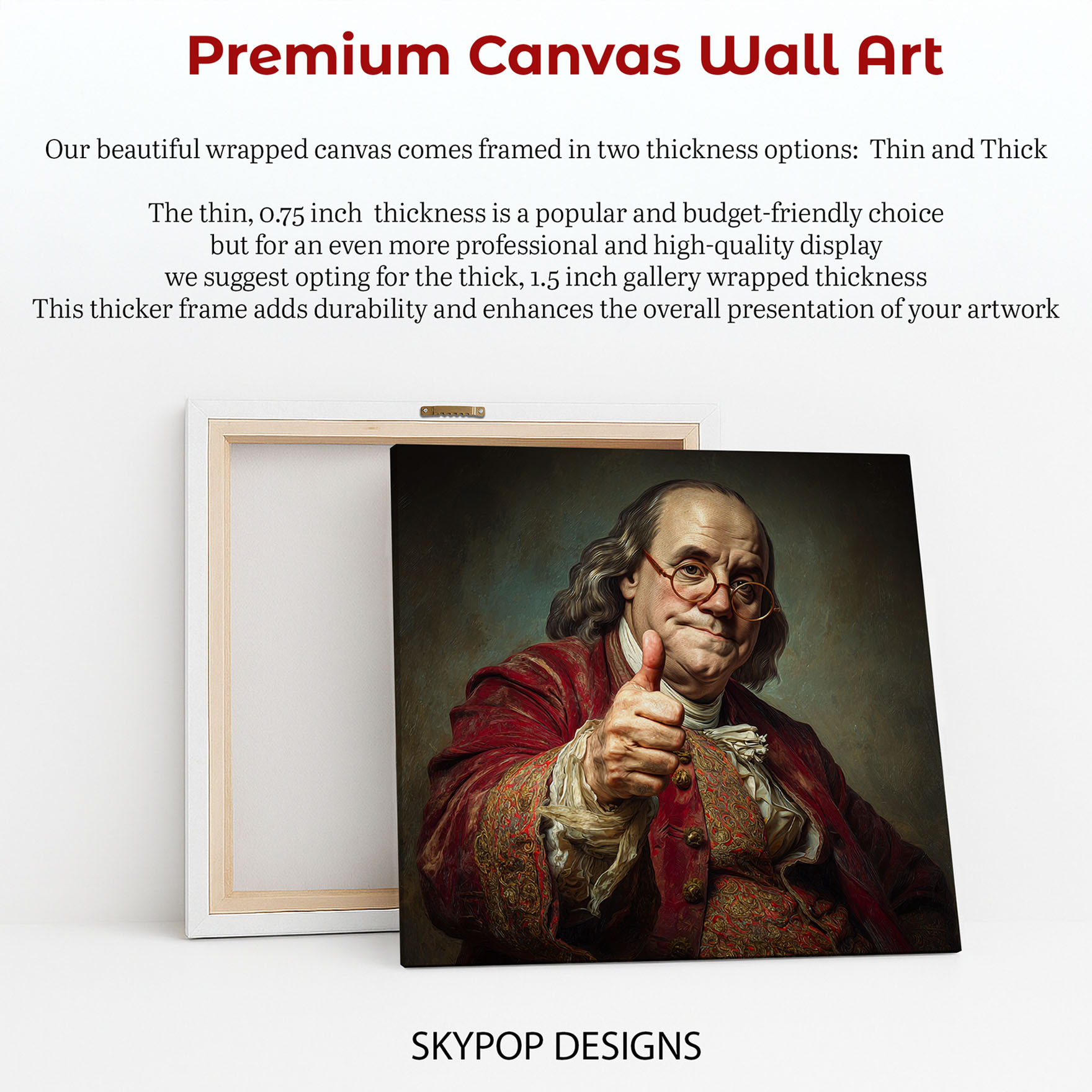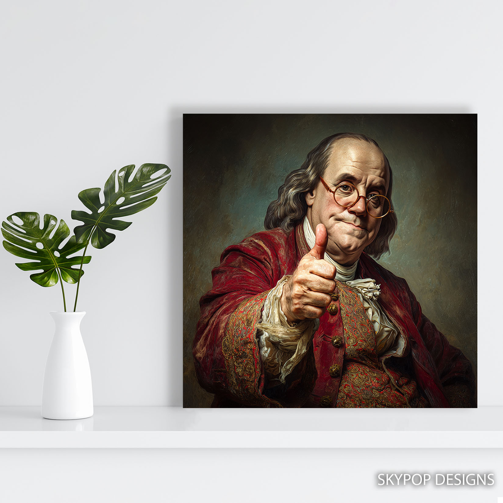 Celebrate American history with this striking Benjamin Franklin canvas wall art, a piece that instantly elevates any space. This classic portrait, rendered in a contemporary style, showcases Benjamin Franklin giving a confident thumbs up, making a bold statement as poster or canvas wall art. Perfect for your office, library, or entryway, this artwork brings a touch of historical gravitas and an air of approval to modern living room decor. The rich red of his attire, accented by gold embroidery, combined with the classic white of his ruffled shirt, creates a vibrant yet sophisticated palette. This figuritive art piece is ideal for traditional and neoclassical decor styles, adding a regal and impactful element to your walls. The detailed brushwork and the iconic figure of Benjamin Franklin infuse the artwork with personality and historical narrative, making it a captivating focal point. High-quality printing ensures the textures and rich colors of this canvas wall art are faithfully reproduced, bringing this historical moment to life. This statement piece is perfect for history buffs, entrepreneurs, or anyone seeking inspiring wall decor. Whether displayed as a poster or premium canvas wall art, it serves as a fantastic conversation starter and a symbol of encouragement. Transform your home with this unique historical art that blends classic portraiture with a universally positive gesture. This Benjamin Franklin artwork is a perfect gift for housewarmings, birthdays, or any occasion marking achievement. Add a touch of distinguished flair and motivational energy to your decor today.