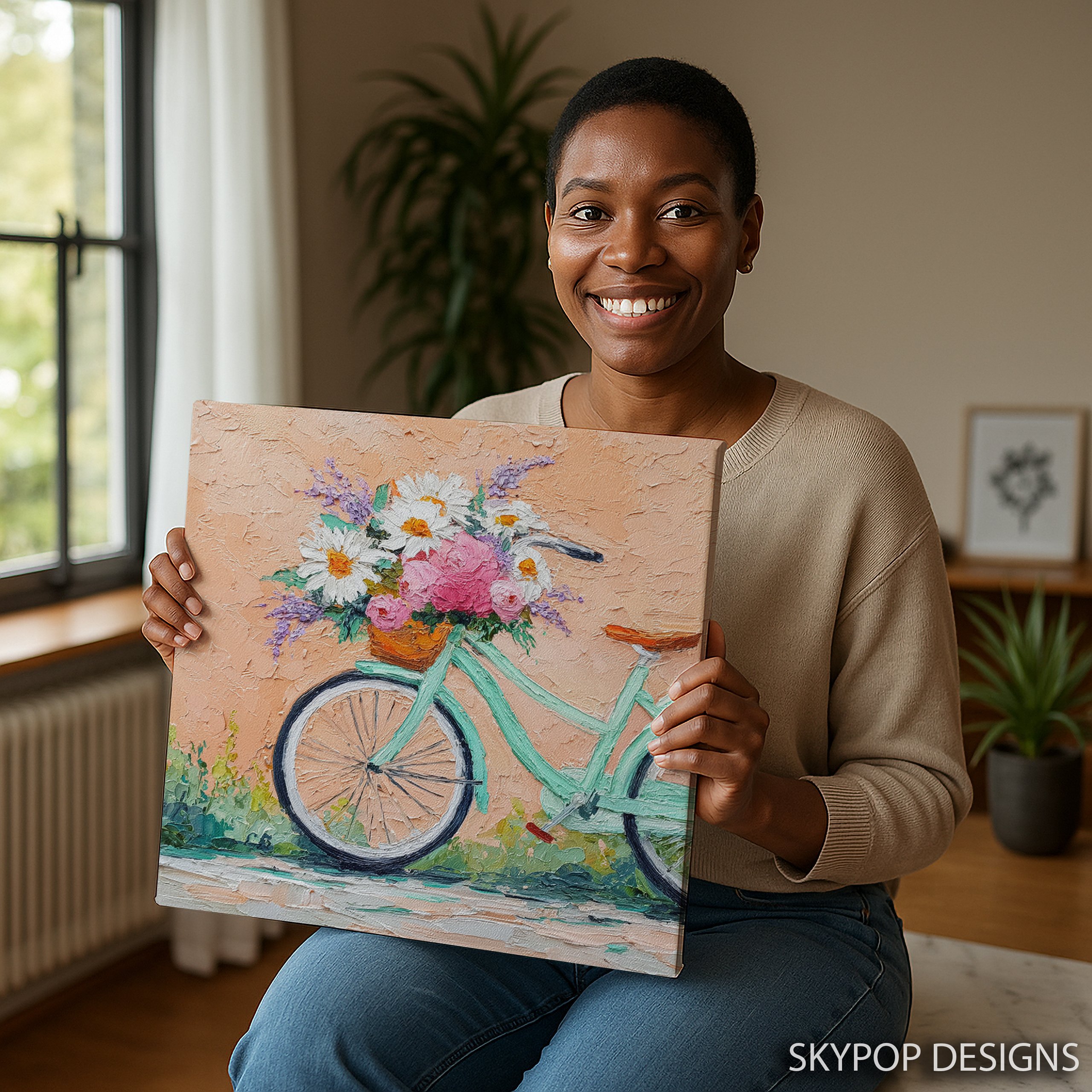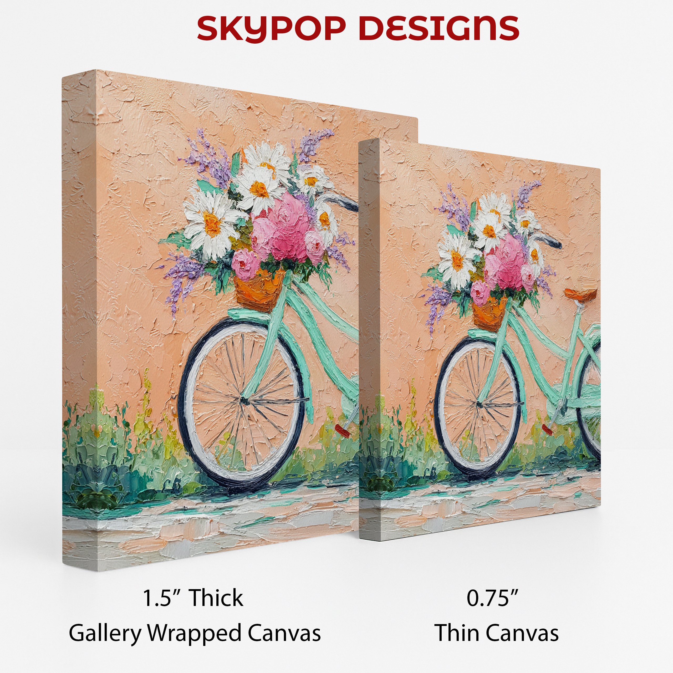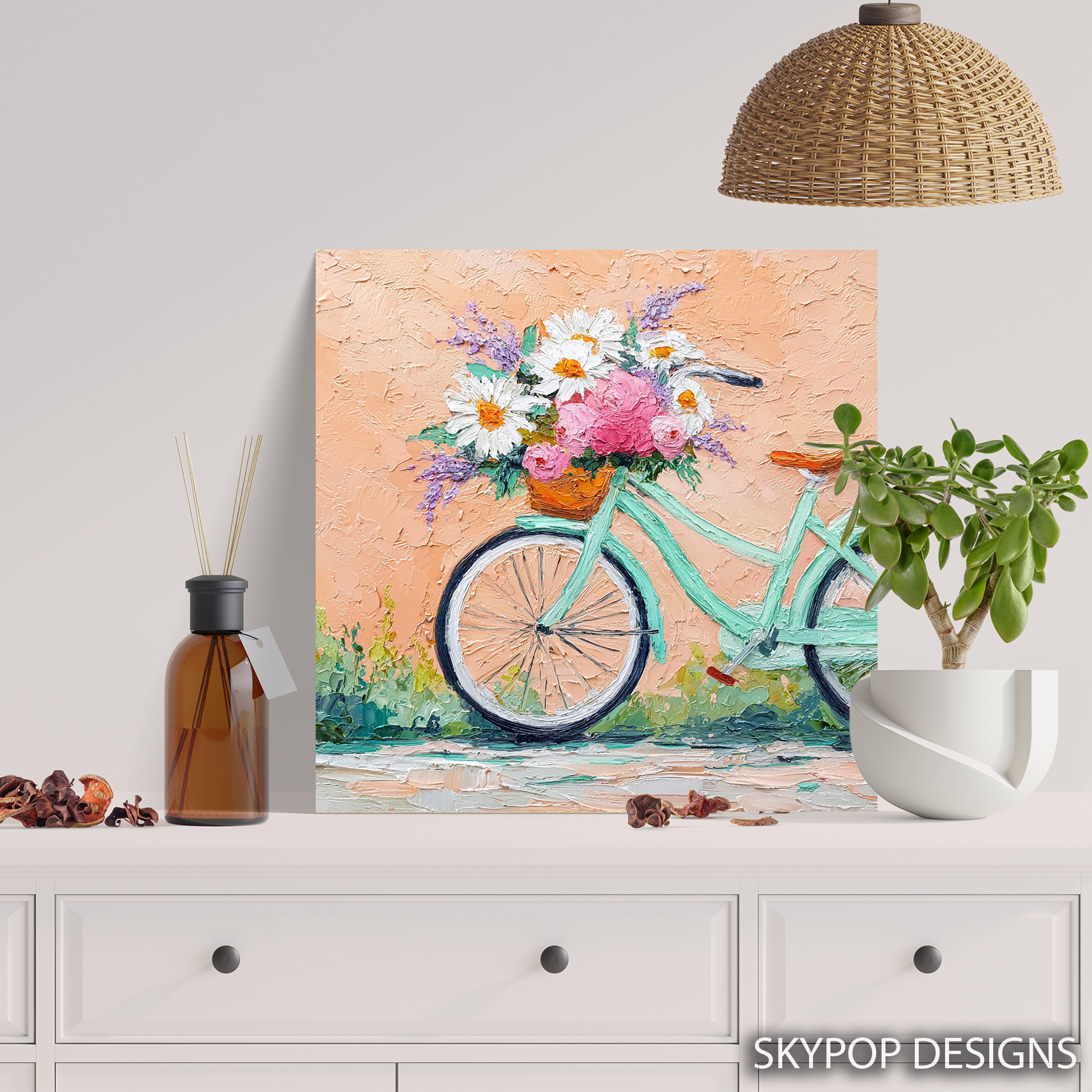 Bring a touch of whimsical charm to your home with this delightful bicycle flower basket canvas wall art. This stunning poster captures the essence of a carefree summer day, featuring a mint green vintage bicycle adorned with a basket overflowing with vibrant blooms. The textured impasto technique gives depth and life to each brushstroke, making the daisies, roses, and lavender sprigs pop against the warm peach background. Perfect for shabby chic or farmhouse decor, this piece adds a romantic and nostalgic flair to any living room, bedroom, or entryway. The soft color palette of pinks, whites, and purples creates a soothing atmosphere, while the touches of green add a fresh, natural element. Ideal for those who love floral art with a twist, this canvas brings the outdoors in, celebrating the simple joys of nature and cycling. The attention to detail in the bicycle’s spokes and the delicate flower petals showcases superior craftsmanship, ensuring this art piece becomes a cherished focal point in your home. Whether you’re looking to refresh your spring decor or searching for the perfect housewarming gift, this versatile artwork fits seamlessly into various interior styles. Transform your space today with this charming bicycle and flower composition that’s sure to spark joy and conversation.
