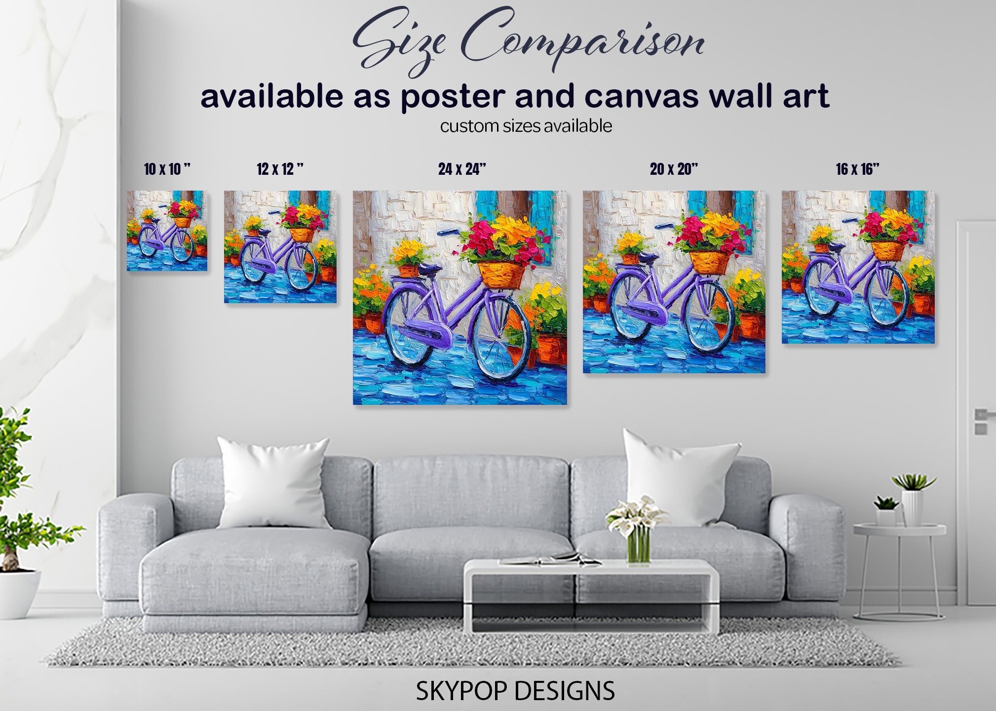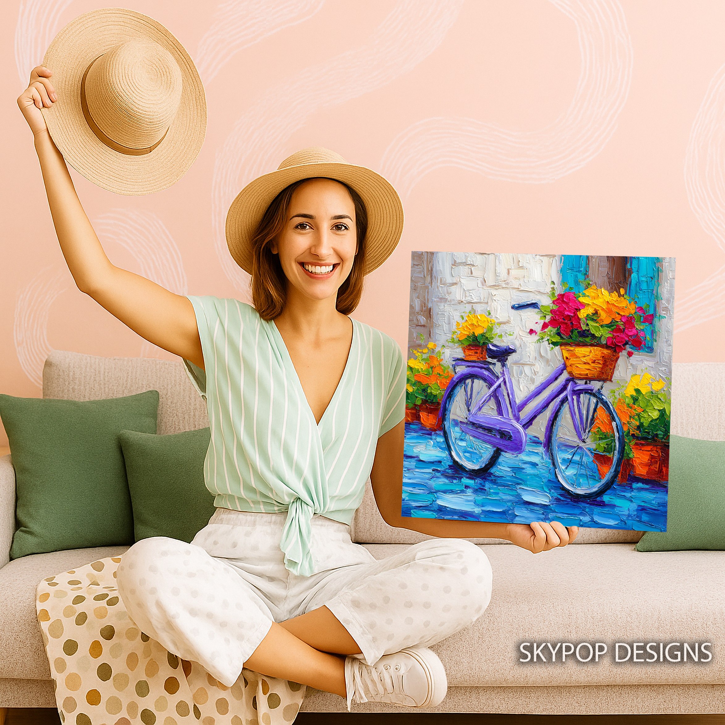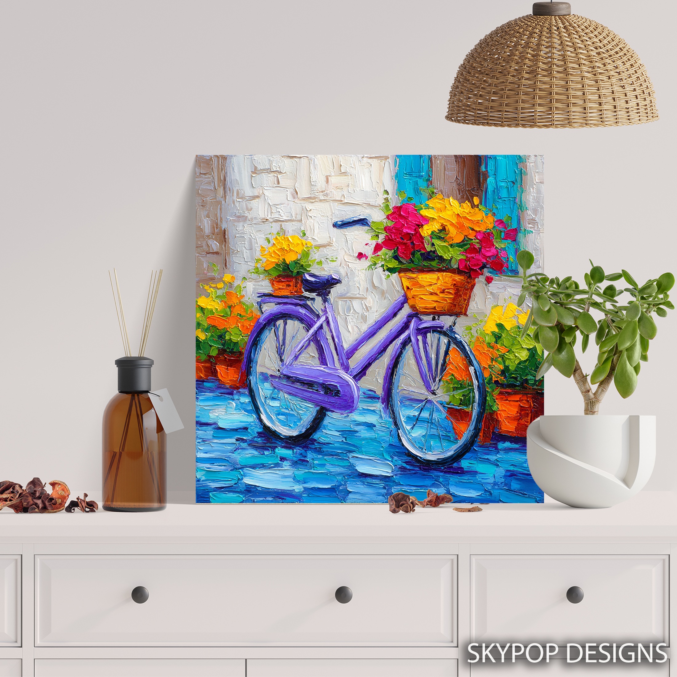 Bring a burst of color and charm to your space with this vibrant bicycle canvas wall art. This stunning poster captures the essence of a carefree summer day, featuring a purple bicycle adorned with baskets overflowing with cheerful flowers. The impressionistic brushstrokes and bold color palette create a captivating focal point that instantly brightens any room. Perfect for bohemian living rooms or rustic bedrooms, this canvas wall art combines floral beauty with a touch of nostalgia. The contrast of the purple bike against the textured white background adds depth and visual interest, while the colorful blooms evoke feelings of joy and serenity. Ideal for farmhouse decor enthusiasts, this piece adds personality and warmth to contemporary spaces while maintaining a timeless appeal. The textured canvas brings the scene to life, making you feel as if you could reach out and touch the delicate petals. Whether displayed in a cozy entryway, sunny kitchen, or tranquil sunroom, this versatile artwork adapts to various interior styles. High-quality printing ensures every vibrant detail is captured, from the intricate spokes of the wheels to the lush greenery surrounding the flowers. Transform your home with this unique blend of floral art and vintage charm that celebrates the simple pleasures of life. Elevate your wall decor and infuse your space with the spirit of summer all year round with this enchanting bicycle and flower canvas art.