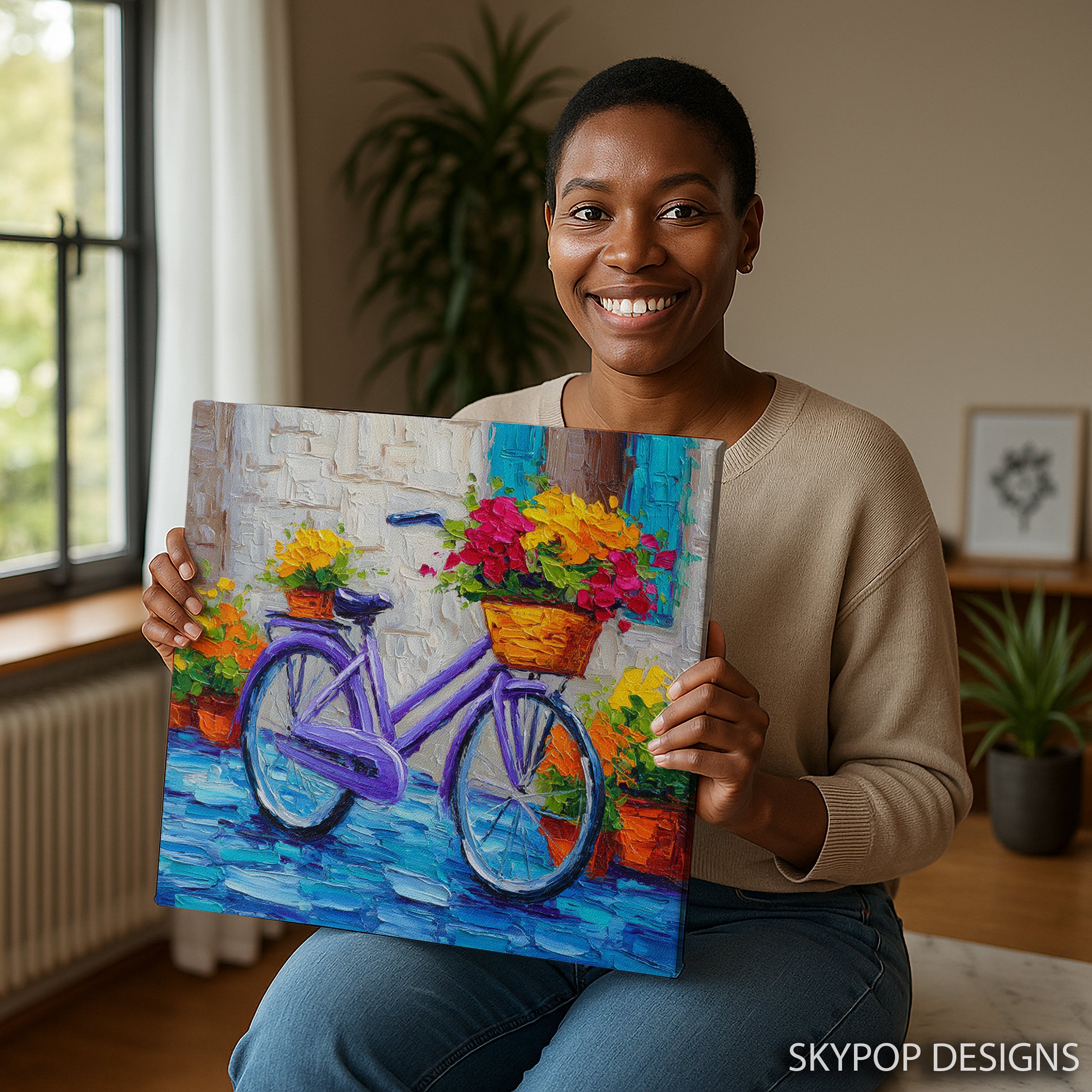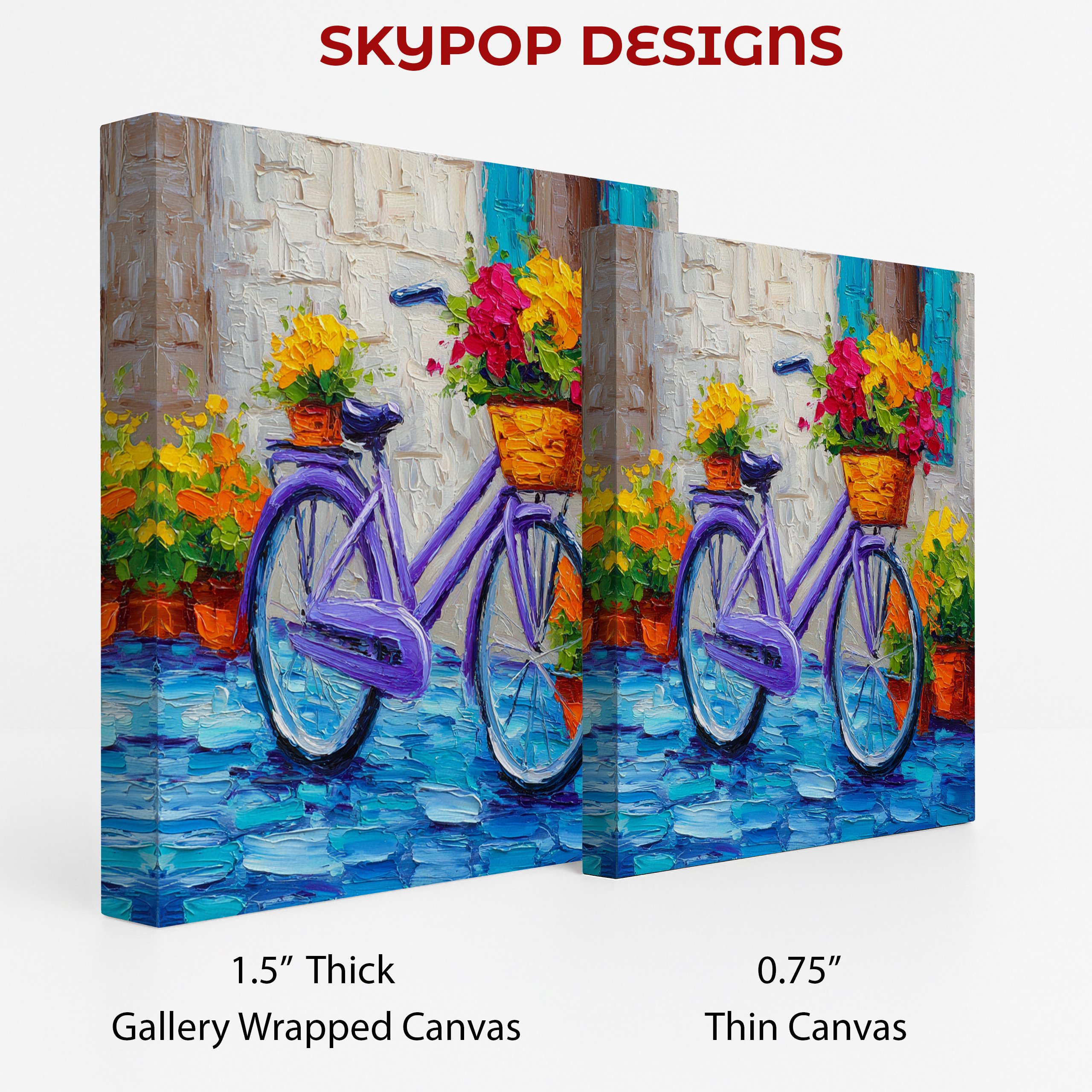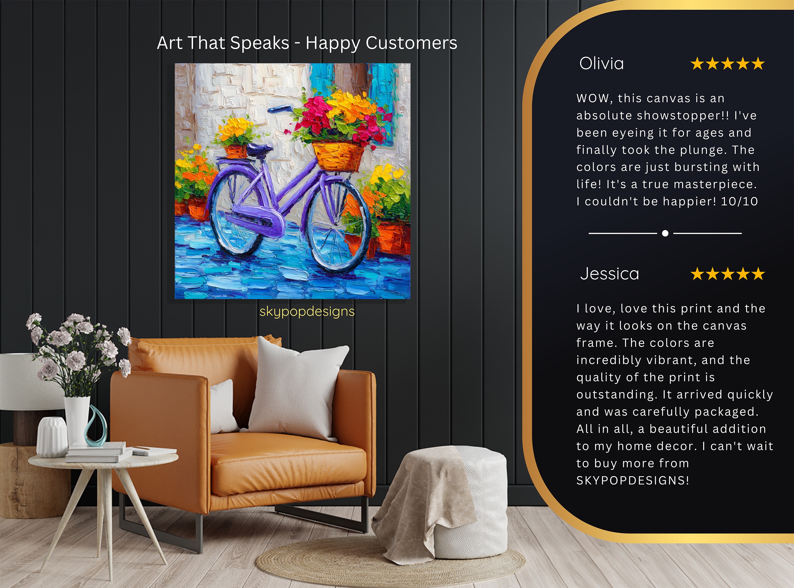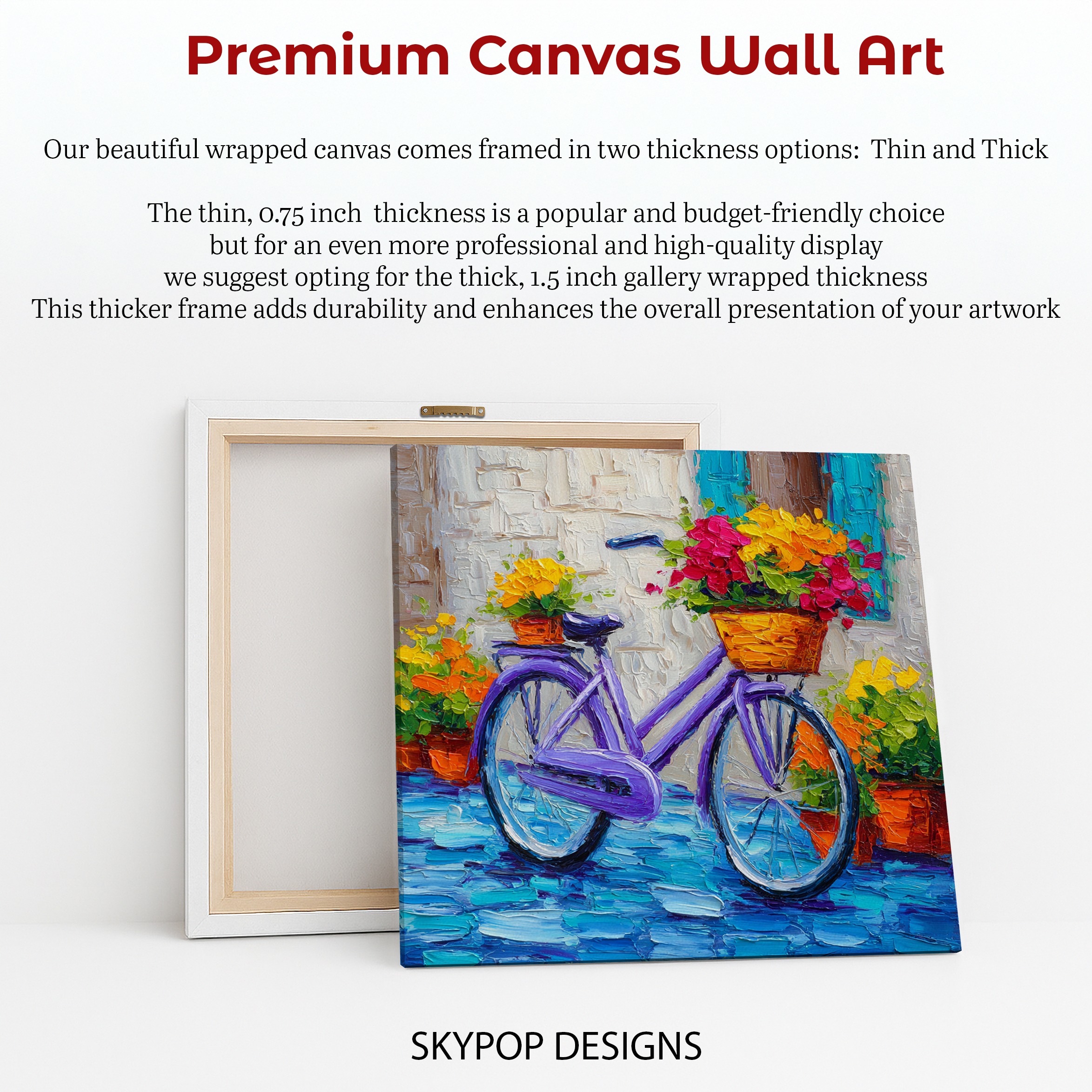 Bring a burst of color and charm to your space with this vibrant bicycle canvas wall art. This stunning poster captures the essence of a carefree summer day, featuring a purple bicycle adorned with baskets overflowing with cheerful flowers. The impressionistic brushstrokes and bold color palette create a captivating focal point that instantly brightens any room. Perfect for bohemian living rooms or rustic bedrooms, this canvas wall art combines floral beauty with a touch of nostalgia. The contrast of the purple bike against the textured white background adds depth and visual interest, while the colorful blooms evoke feelings of joy and serenity. Ideal for farmhouse decor enthusiasts, this piece adds personality and warmth to contemporary spaces while maintaining a timeless appeal. The textured canvas brings the scene to life, making you feel as if you could reach out and touch the delicate petals. Whether displayed in a cozy entryway, sunny kitchen, or tranquil sunroom, this versatile artwork adapts to various interior styles. High-quality printing ensures every vibrant detail is captured, from the intricate spokes of the wheels to the lush greenery surrounding the flowers. Transform your home with this unique blend of floral art and vintage charm that celebrates the simple pleasures of life. Elevate your wall decor and infuse your space with the spirit of summer all year round with this enchanting bicycle and flower canvas art.