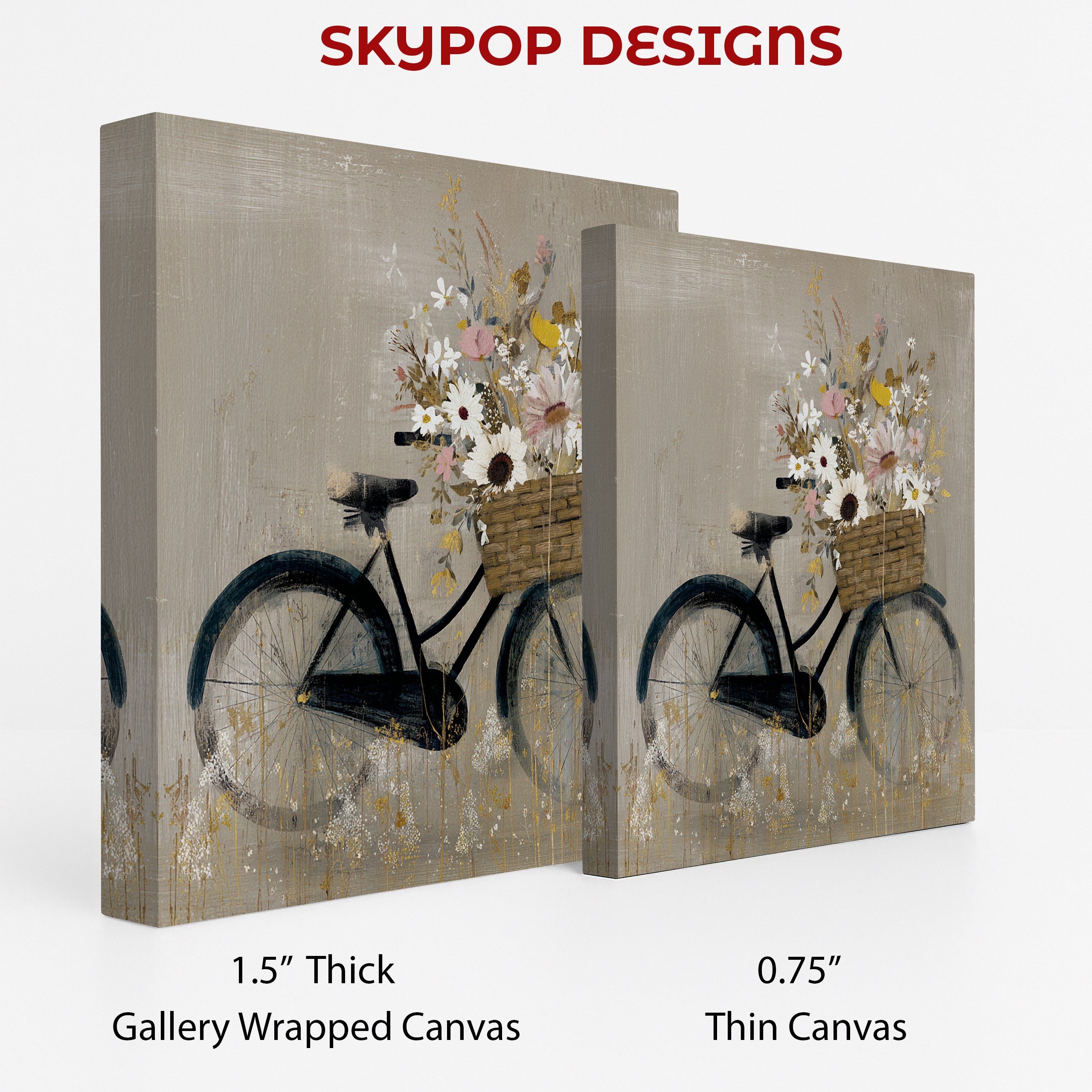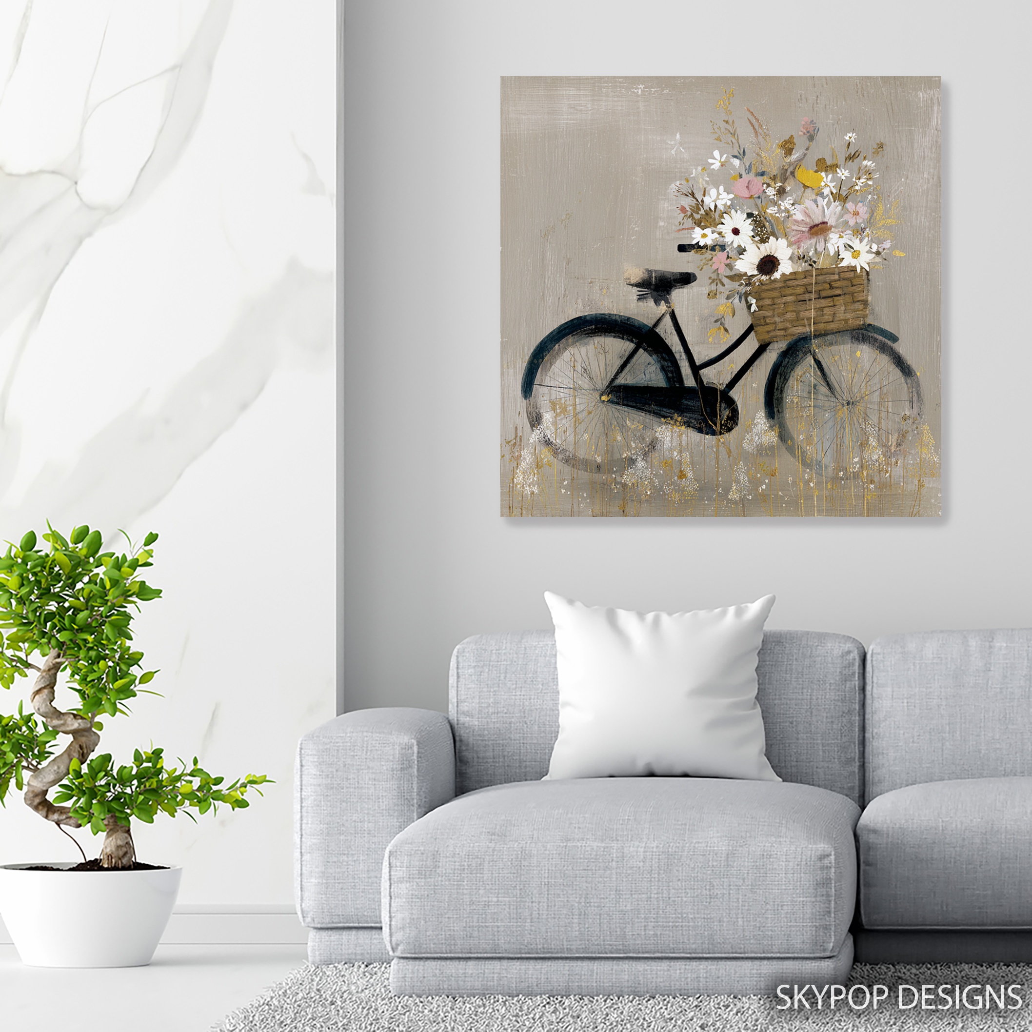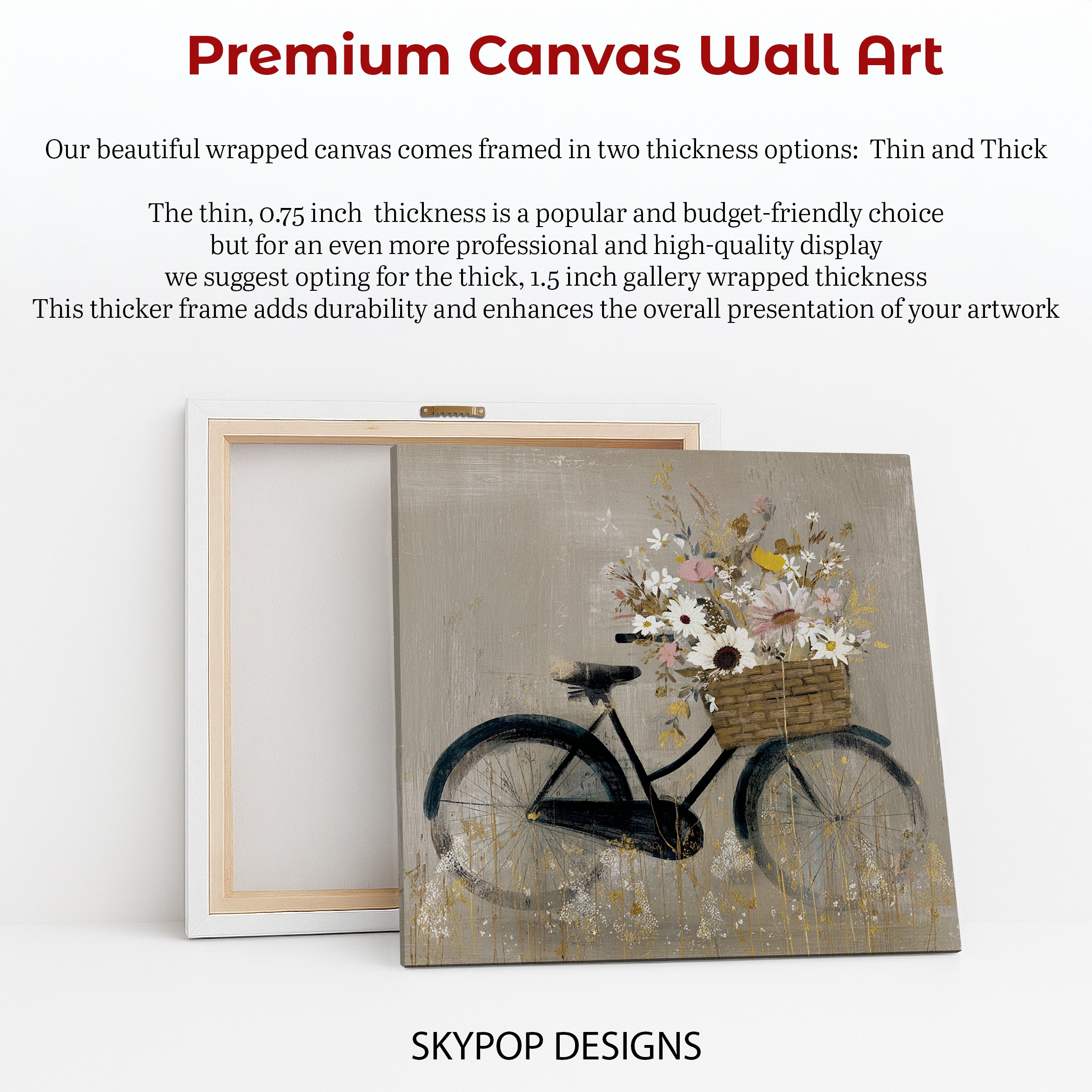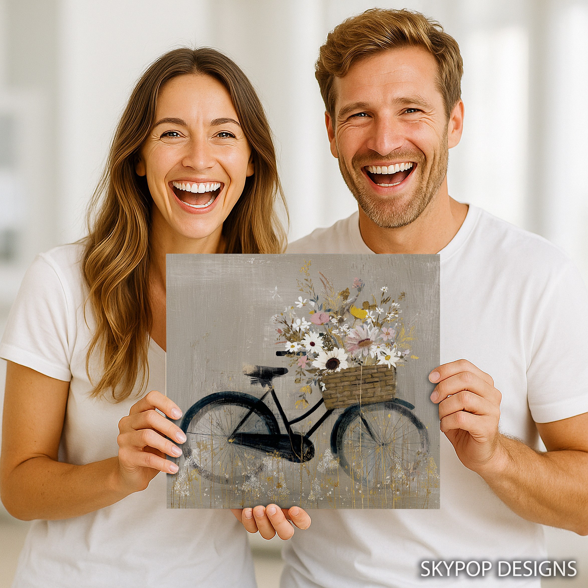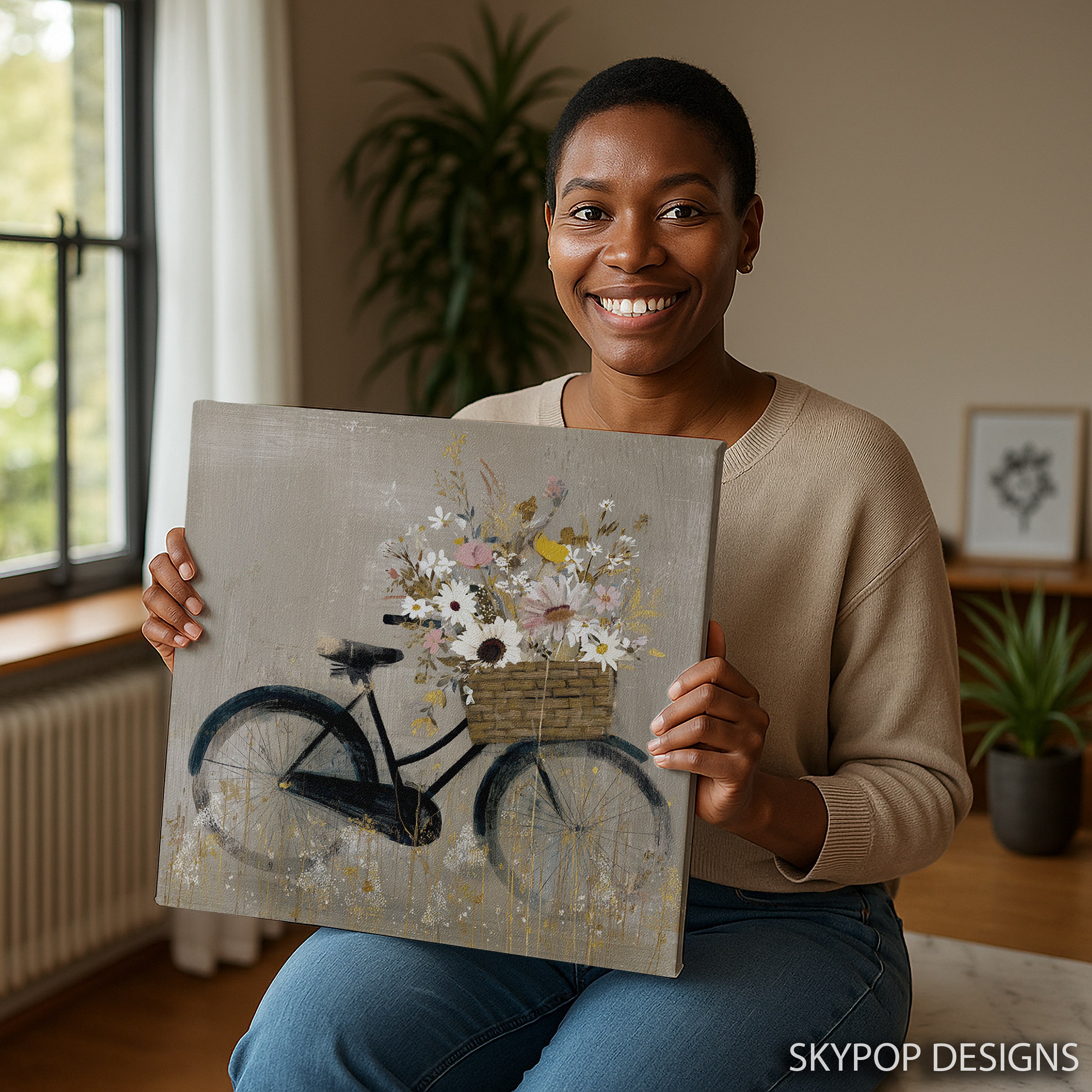Bring a touch of rustic charm to your home with this enchanting bicycle canvas wall art. The vintage-inspired design features a classic black bicycle adorned with a beautiful basket overflowing with vibrant wildflowers. This stunning poster transforms any space into a cozy farmhouse retreat, perfect for living rooms, bedrooms, or entryways. The delicate blend of white daisies, pink roses, and yellow blooms creates a soft, romantic atmosphere that instantly brightens your decor. Ideal for shabby chic enthusiasts, this canvas art piece adds a nostalgic and whimsical element to your walls. The textured background enhances the depth and character of the artwork, making it a captivating focal point in any room. Whether you’re looking to refresh your seasonal decor or searching for the perfect housewarming gift, this versatile piece adapts beautifully to various interior styles. The high-quality printing captures every intricate detail, from the woven texture of the bicycle basket to the delicate petals of each flower. Elevate your home’s ambiance with this charming blend of nature-inspired art and vintage aesthetics. The soft color palette of whites, pinks, and yellows against the neutral background creates a soothing yet eye-catching display. Make this delightful bicycle and flower artwork the centerpiece of your wall art collection today and bring the beauty of a summer garden indoors all year round.