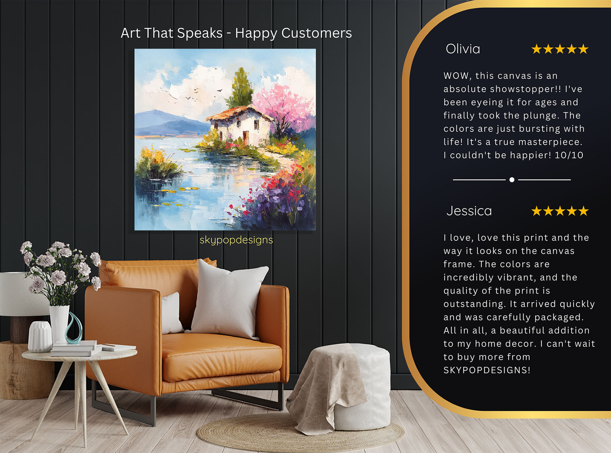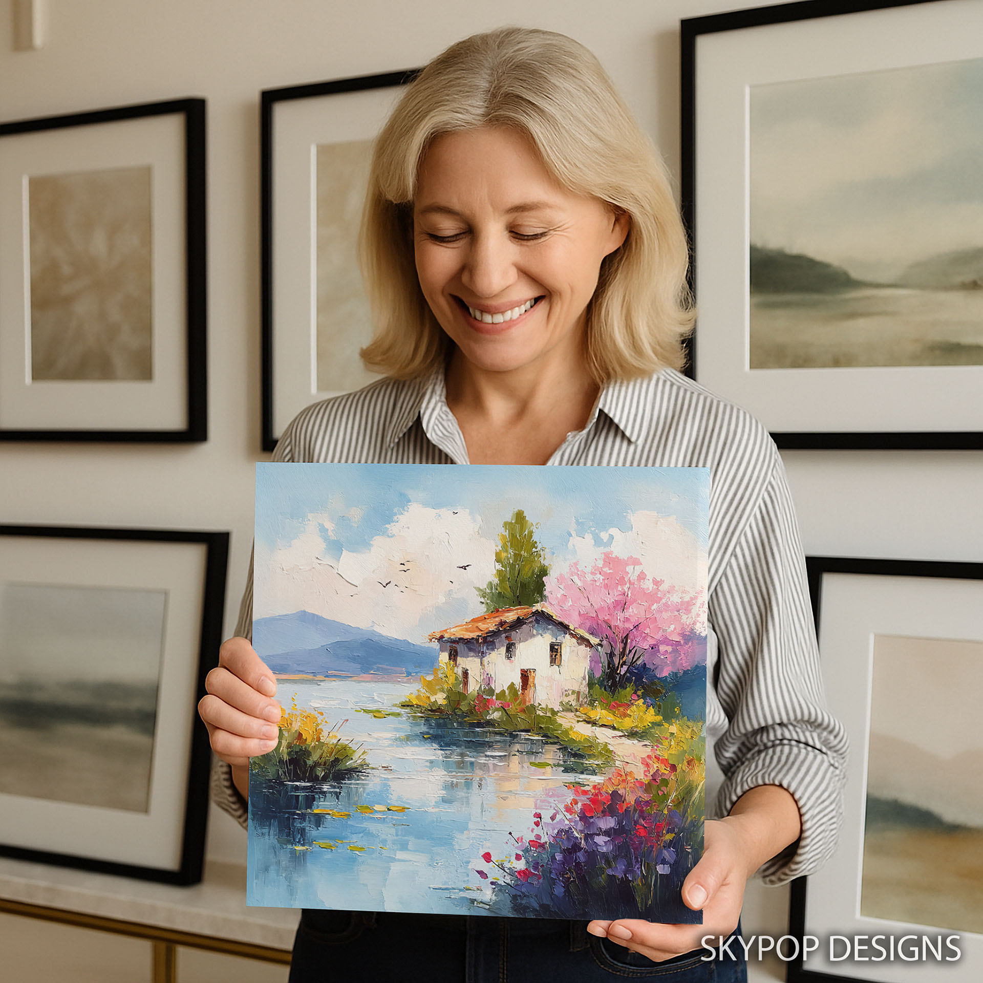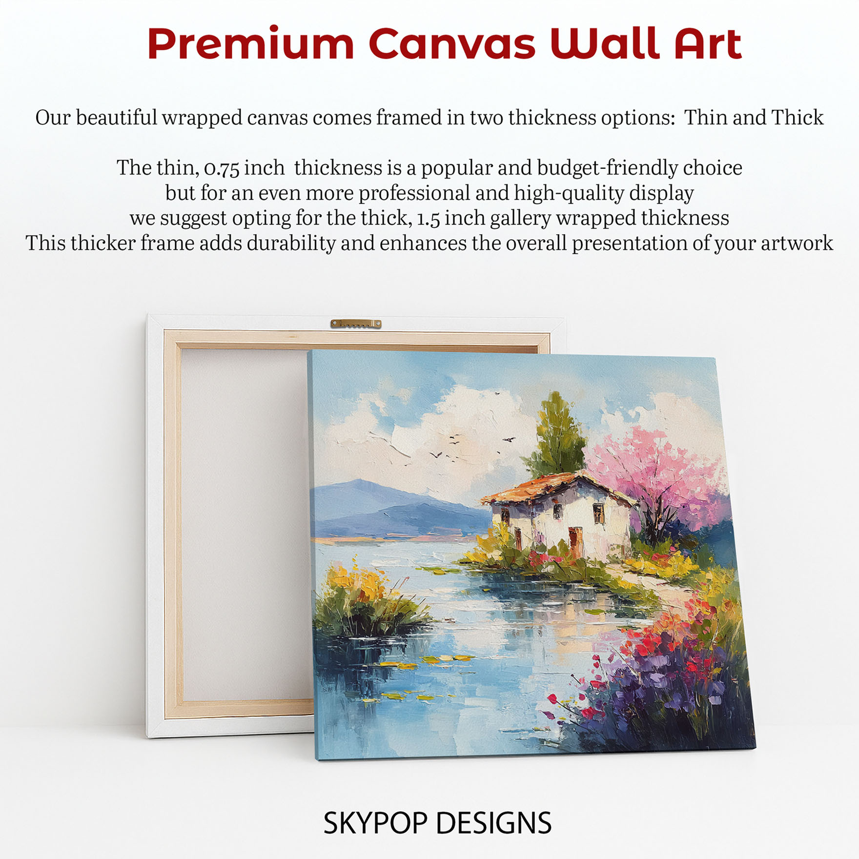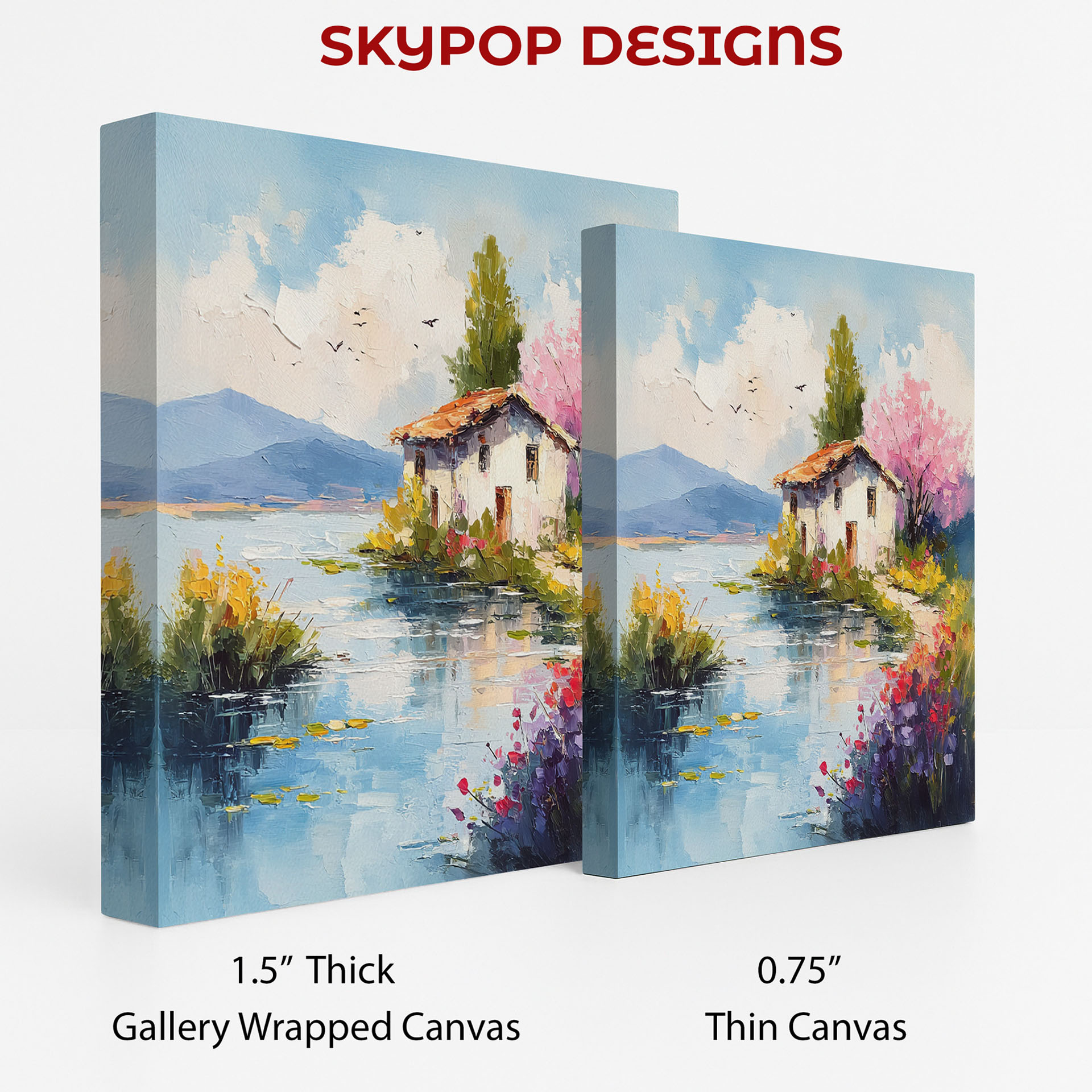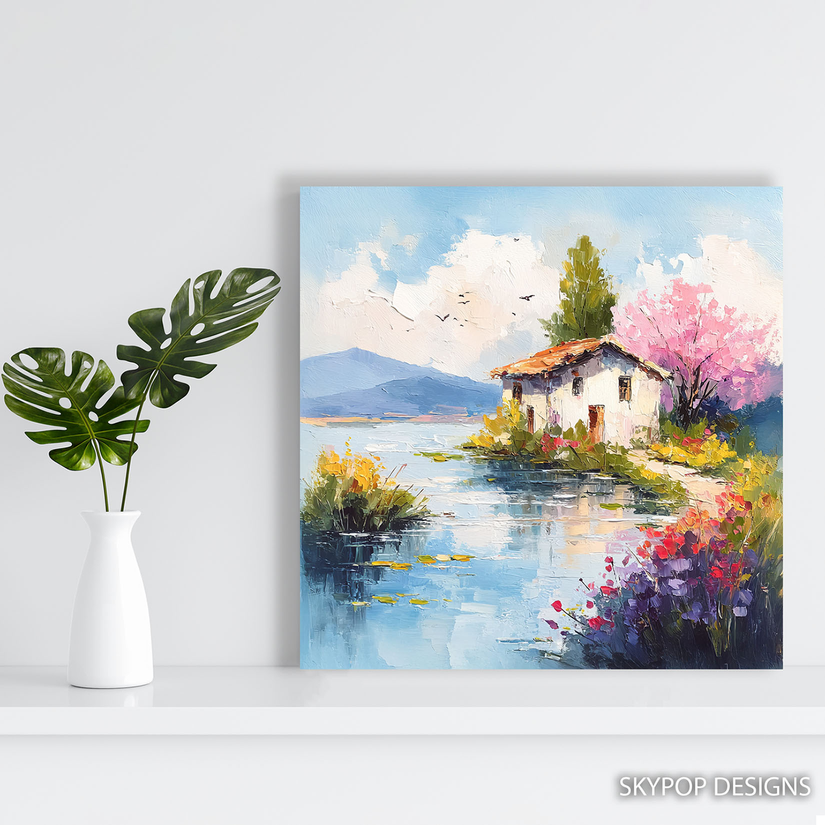 Transform your home with this breathtaking Lakeside Cottage canvas wall art, capturing the serene beauty of nature in a vibrant Impressionist style.