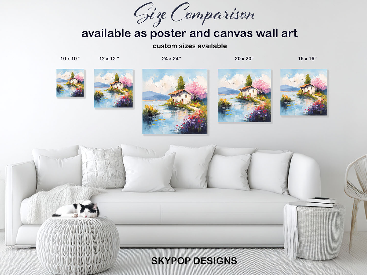 Transform your home with this breathtaking Lakeside Cottage canvas wall art, capturing the serene beauty of nature in a vibrant Impressionist style. This captivating poster or canvas wall art brings the tranquility of a waterside landscape directly into your living room or dining room. The striking blues of the water and sky, contrasted with the rich greens and multicolor floral accents, create a peaceful and inviting atmosphere. This piece is perfect for those embracing Tuscan, rustic, or farmhouse decor styles, adding a touch of nature-inspired charm to any space. The textured brushstrokes evoke a sense of movement and depth, making this artwork a stunning focal point in your entryway or kitchen. The gentle depiction of the cottage nestled amongst blooming flowers and beside calm waters inspires relaxation and a connection to the outdoors. Ideal for those seeking to enhance their home decor with versatile and uplifting wall art, this piece offers a timeless appeal. High-quality printing ensures the vibrant colors and painterly details are preserved, bringing the scene to life on your wall. Whether as a housewarming gift or to refresh your own living space, this canvas wall art complements various interior designs. Celebrate the beauty of the countryside and elevate your home’s ambiance with this captivating Lakeside Cottage painting. Add this stunning piece to your wall art collection and create a sanctuary of peace and natural beauty today. Experience the charm and artistry of this gorgeous canvas art.