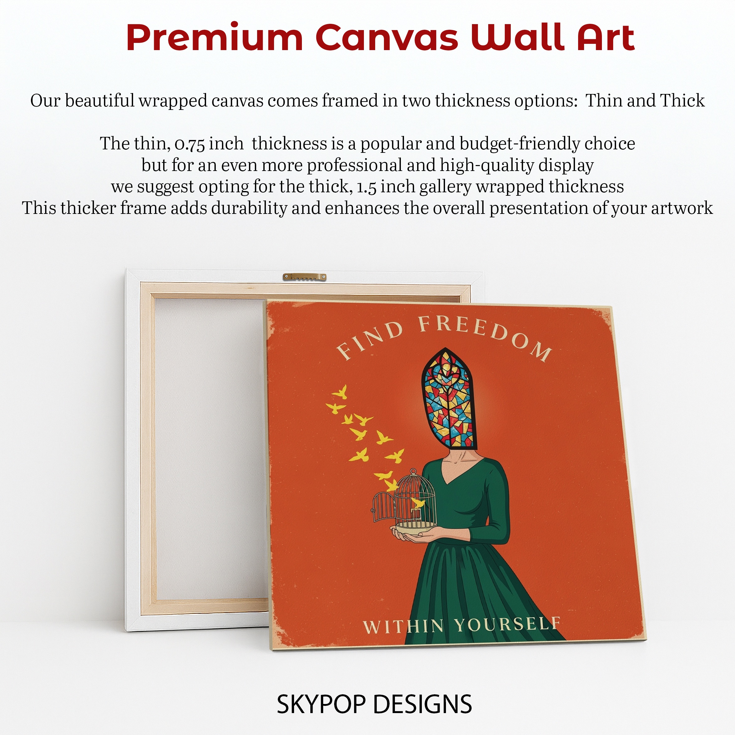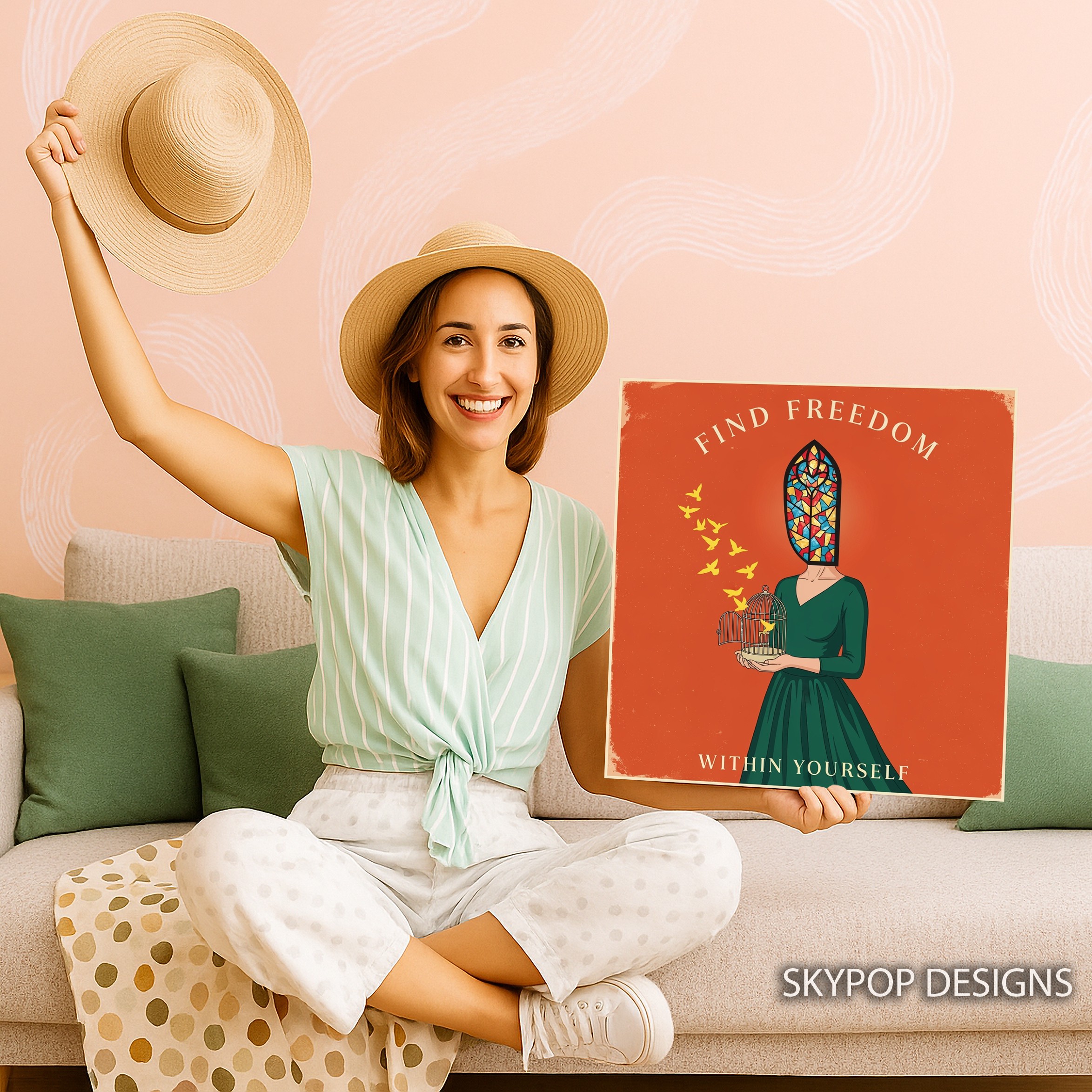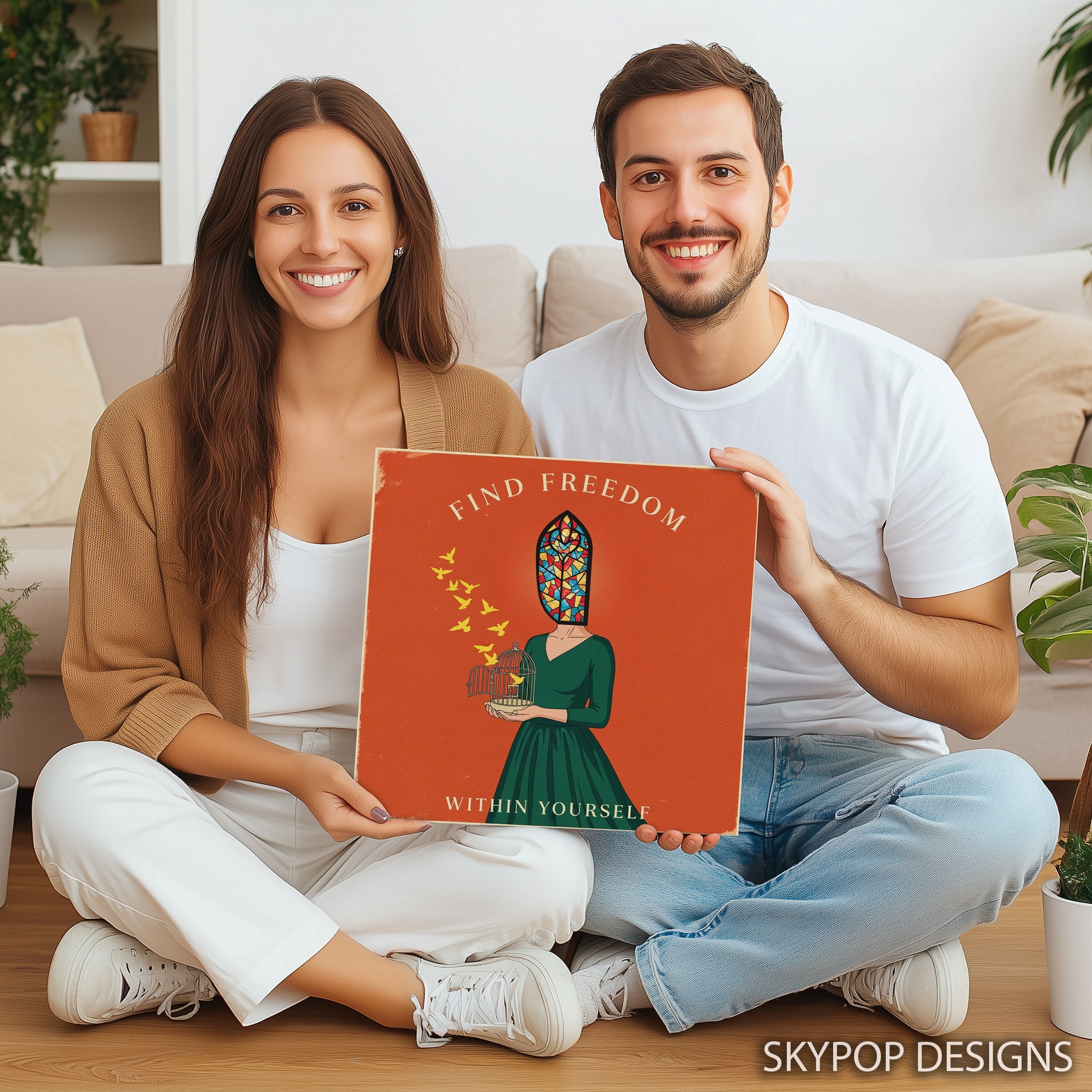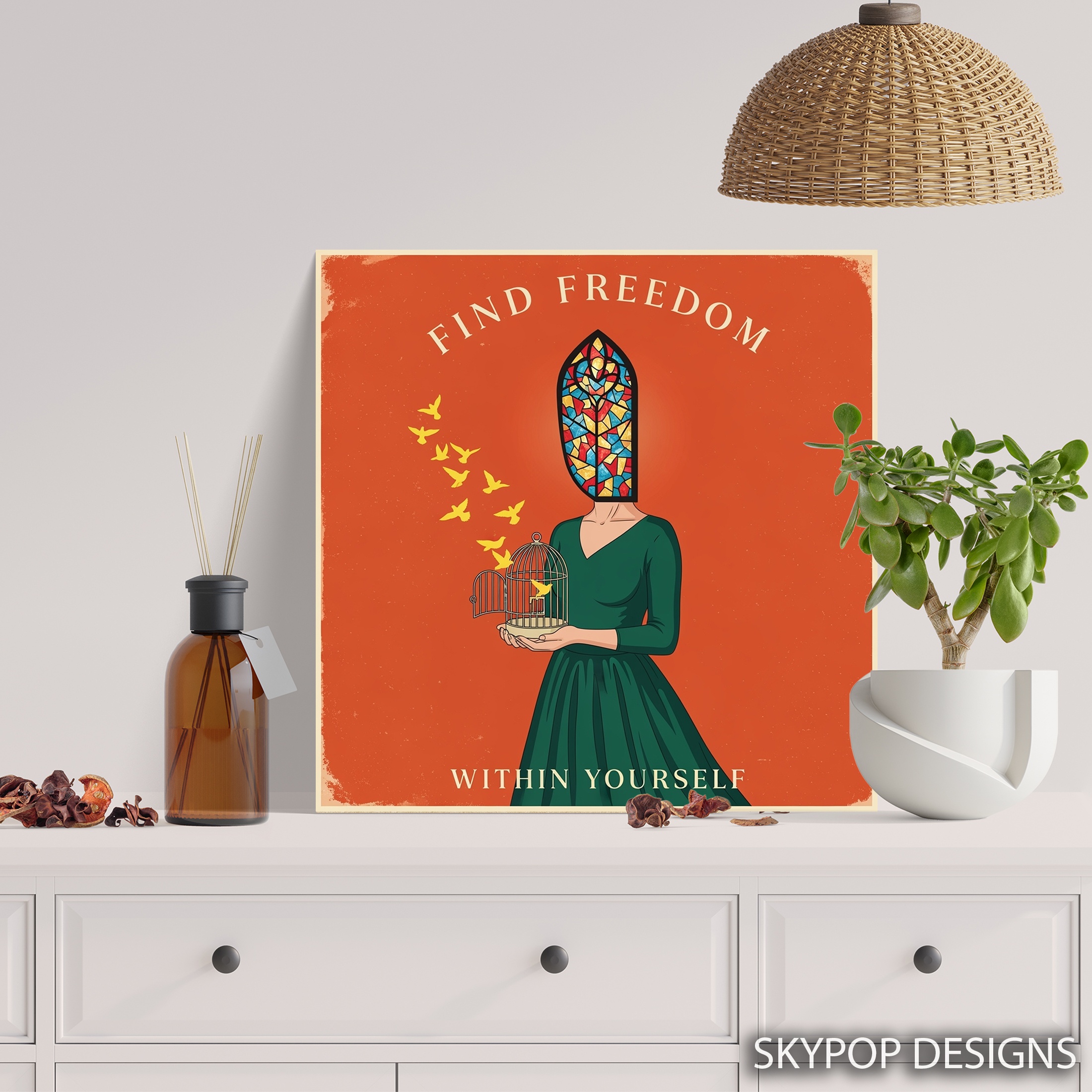 Elevate your space with this thought-provoking canvas wall art that beautifully captures the essence of personal freedom. The striking image features a figure with a vibrant stained glass window for a head, holding a birdcage with a yellow bird taking flight. This unique poster blends vintage and contemporary styles, making it a perfect addition to bohemian living rooms or minimalist bedrooms. The warm orange background creates a sense of energy and optimism, while the green dress adds a touch of harmony and growth. Ideal for meditation rooms or home offices, this canvas art inspires creativity and self-reflection. The multicolored stained glass effect symbolizes the diverse facets of human personality, while the freed bird represents the journey to inner peace. This wall art serves as a daily reminder to find freedom within yourself, making it a thoughtful gift for friends seeking personal growth or a meaningful addition to your own space. The intricate details and rich symbolism ensure this piece remains captivating, sparking conversations and encouraging mindfulness. Whether you’re drawn to the vintage-inspired design or the contemporary message, this freedom-themed canvas wall art adapts beautifully to various decor styles. Transform your room with this visually stunning and emotionally resonant artwork that celebrates the power of self-discovery and personal liberation.