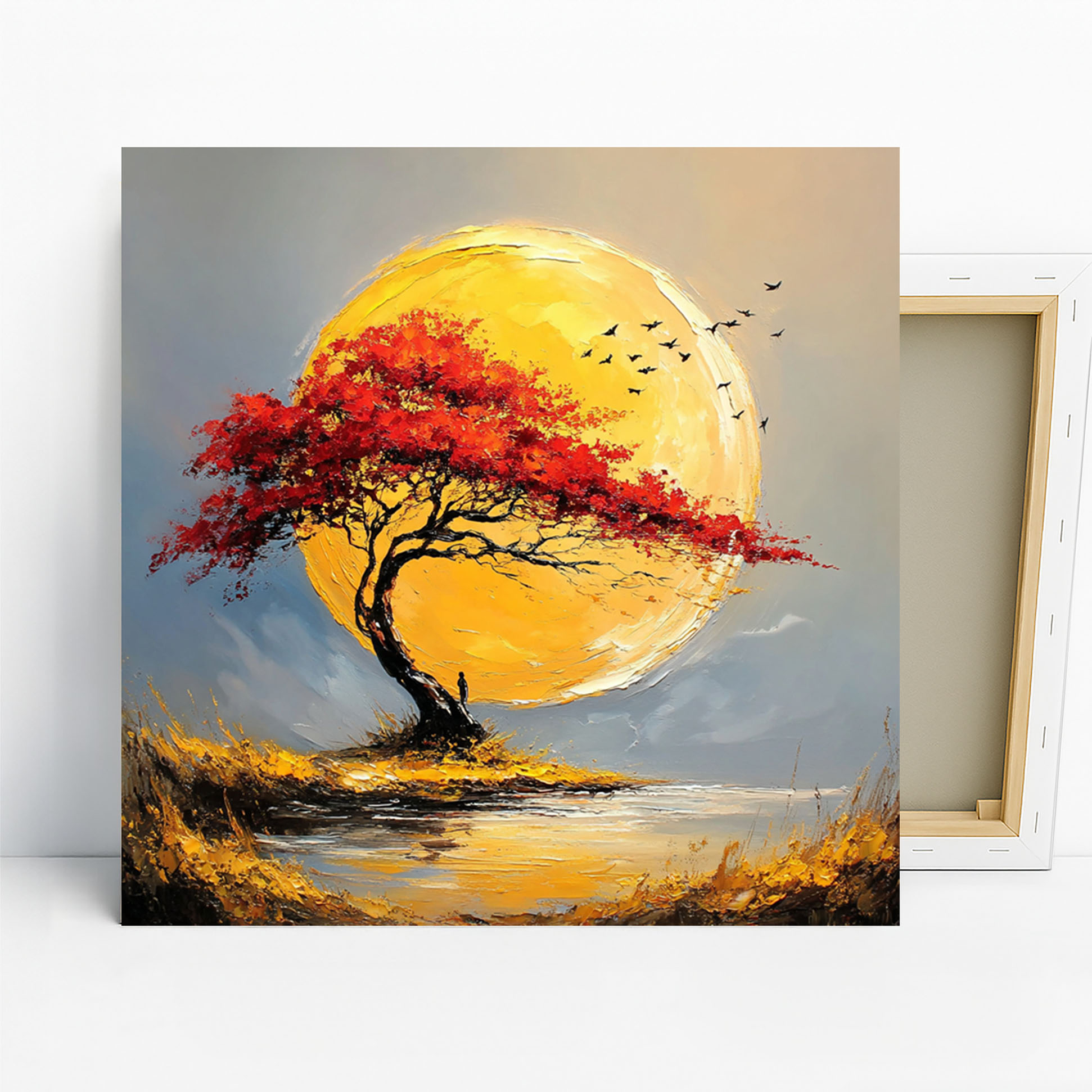 Transform your home with this striking Tree and Sun canvas wall art, a breathtaking piece that captures the essence of nature’s beauty. This vibrant poster or canvas wall art features a solitary tree with fiery red leaves set against a luminous, oversized yellow sun, creating a captivating focal point for any space. The textured brushstrokes and bold colors in this contemporary nature art evoke a sense of wonder and tranquility, making it an ideal choice for modern living room wall decor or a peaceful bedroom atmosphere. The interplay of warm yellows and oranges with the cool grey sky and the deep black of the tree adds a dynamic contrast that will elevate your interior design. This impressionist-style artwork, with its flowing textures and rich palette, is perfect for creating a statement in your office or a welcoming entryway. It showcases the power of natural elements, inspiring a sense of calm and reflection. This canvas wall art is perfect for those who appreciate minimalist decor seeking to add a splash of vivid color and a touch of modern flair. It also makes an exceptional gift for housewarmings, birthdays, or holidays, offering a unique piece of art that brings joy and warmth. The high-quality printing ensures the rich textures and stunning colors of this Tree and Sun poster are preserved, creating a lasting impression. Elevate your space with this exceptional canvas art that blends modern design with the timeless allure of nature. Add this beautiful wall art to your collection and enjoy its inspiring presence every day.