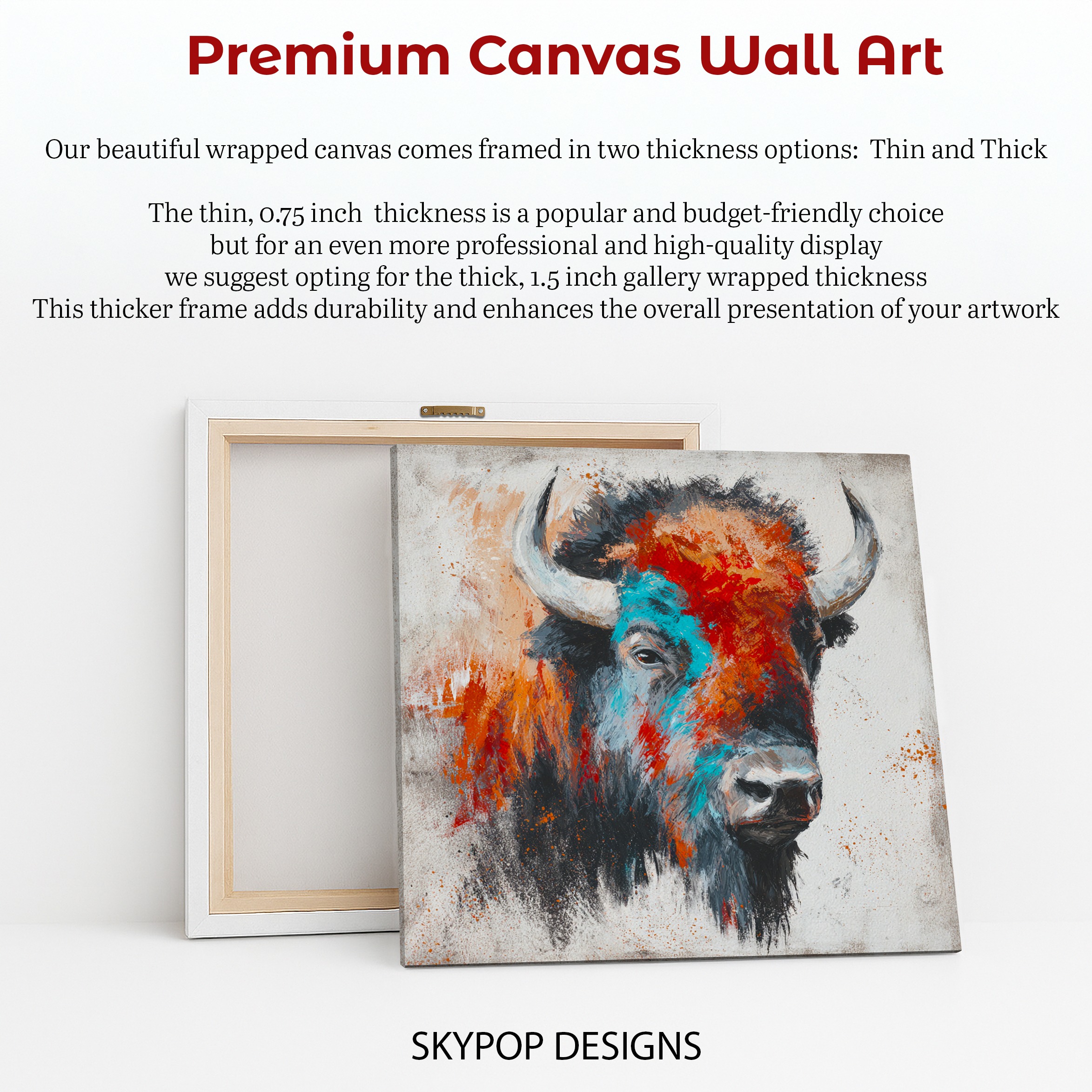 Bring the spirit of the wild into your home with this striking bison canvas wall art. This eye-catching piece features a vibrant, contemporary portrayal of a majestic bison, painted in bold splashes of red, blue, and orange against a neutral background. Perfect for nature lovers and modern art enthusiasts alike, this poster transforms any space with its dynamic energy and rustic charm. The expressive brushstrokes and vibrant color palette make this canvas a standout addition to living rooms, offices, or bedrooms, instantly elevating your decor with a touch of the untamed wilderness. Ideal for those seeking to add a pop of color and character to their walls, this bison artwork seamlessly blends with both modern and bohemian interiors. The large, piercing eye of the bison draws viewers in, creating a focal point that sparks conversation and admiration. Whether you’re looking to refresh your home office or add a statement piece to your dining room, this versatile canvas adapts to various settings with ease. The high-quality printing captures every detail of the original artwork, from the textured fur to the bold horns, ensuring a lasting impression. Gift this unique bison wall art to animal lovers or use it to celebrate the beauty of wildlife in your own space. With its mix of contemporary style and timeless subject matter, this canvas print is sure to become a cherished part of your home decor for years to come.