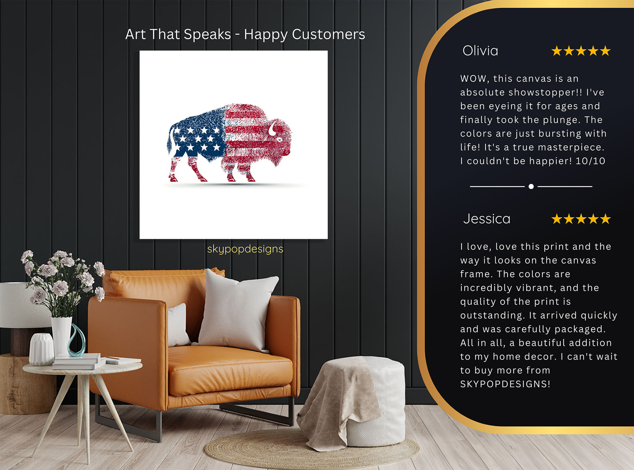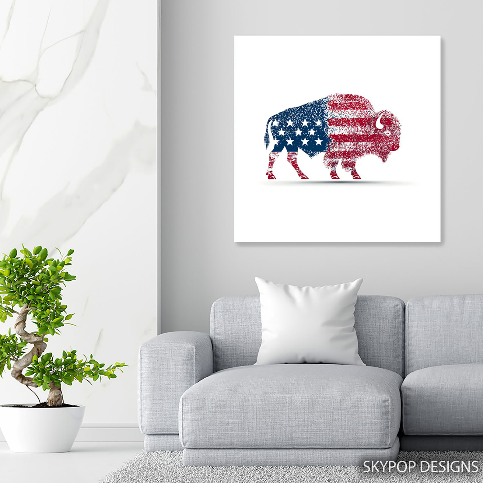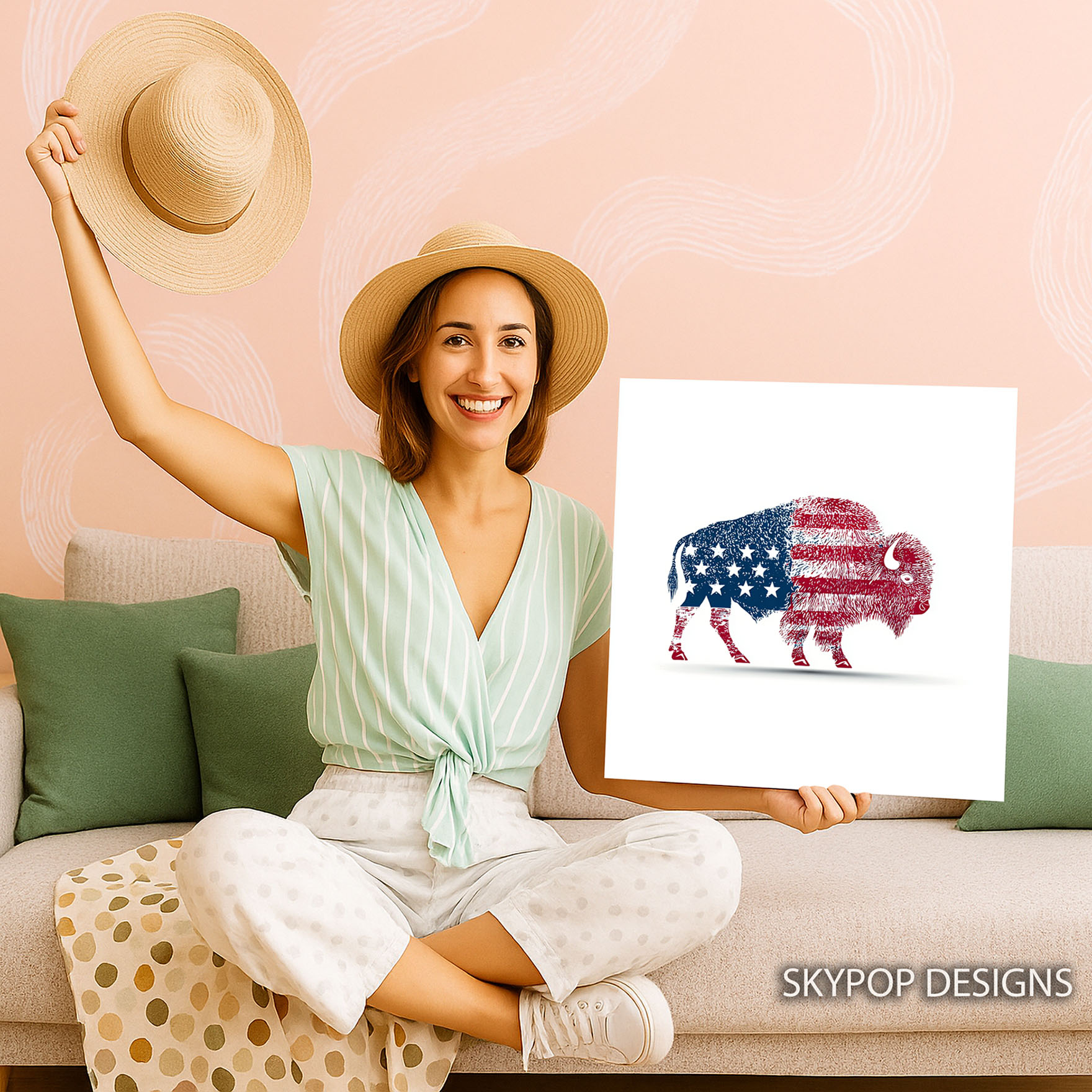 Showcase your American pride with this striking Bison canvas wall art, featuring a powerful bison rendered in the iconic colors and stripes of the American flag. This captivating poster or canvas wall art is perfect for adding a statement piece to modern living room decor or creating a patriotic focal point in your office. The dynamic blend of red, white, and blue creates a vibrant and impactful visual that celebrates heritage and strength, making this a unique piece of wall art. Ideal for rustic or farmhouse settings, this animal art adds a touch of rugged charm and contemporary flair to any space. The detailed texture in the artwork evokes a sense of the wild and the enduring spirit of the American West. Use this canvas wall art to transform your game room into a space of inspiration or to enhance your entryway with a bold welcome. High-quality printing ensures that every detail, from the textured fur of the bison to the sharp lines of the flag, is rendered with clarity and vibrancy. This versatile artwork is a fantastic gift for housewarmings, birthdays, or national holidays, resonating with anyone who appreciates American symbolism and striking animal art. Elevate your home decor with this patriotic canvas wall art that seamlessly blends nature’s power with national identity. Bring the spirit of the frontier into your home with this unforgettable Bison canvas art. Make a bold statement and inspire conversations with this exceptional piece of American-themed wall art today.