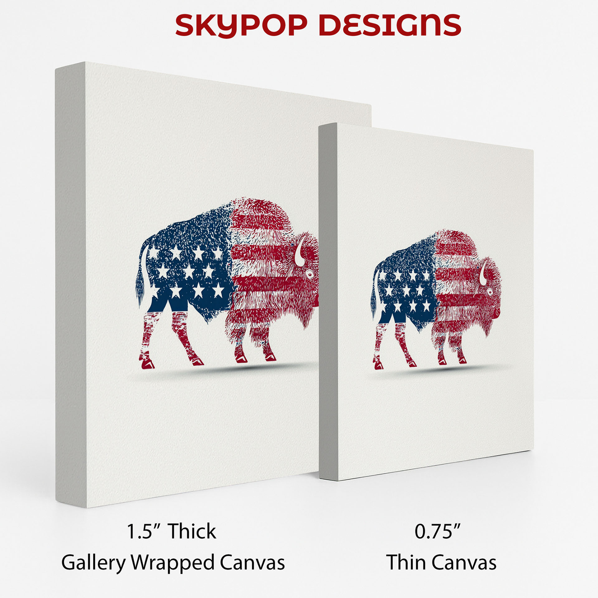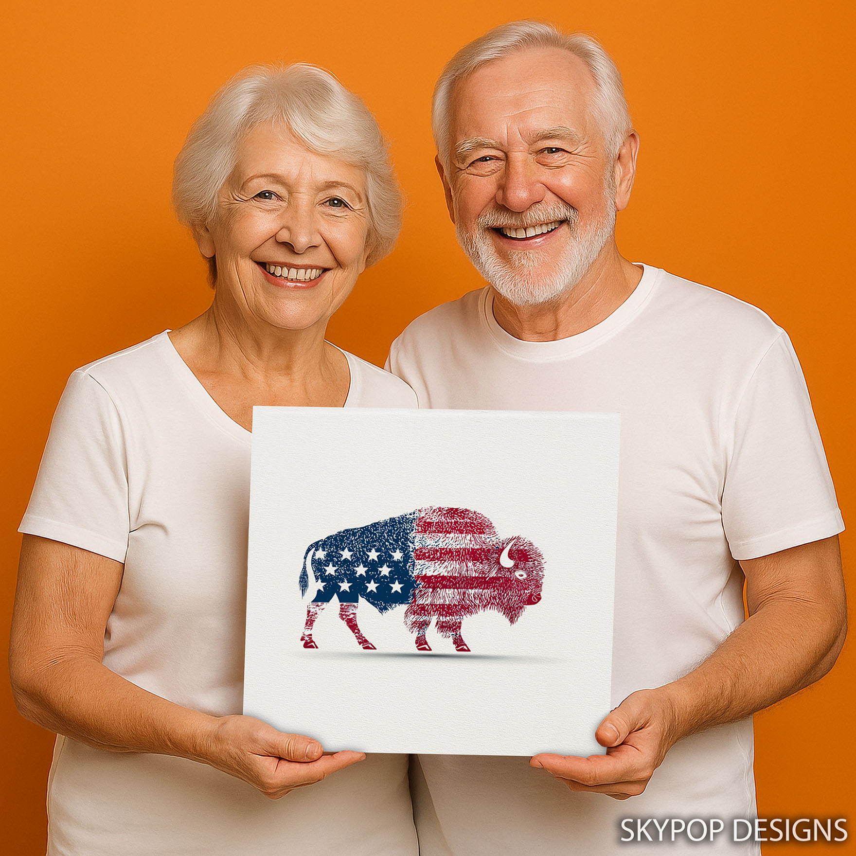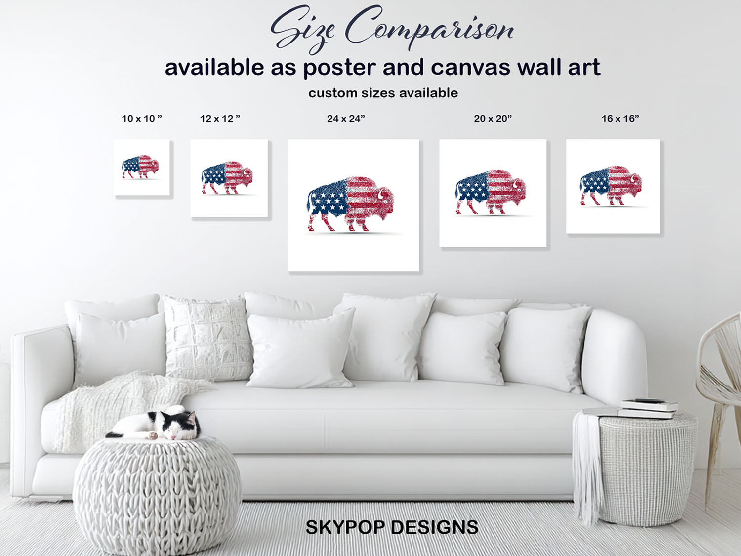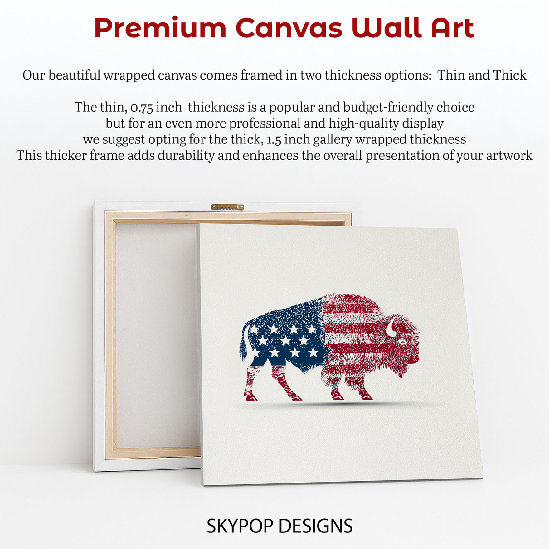 Showcase your American pride with this striking Bison canvas wall art, featuring a powerful bison rendered in the iconic colors and stripes of the American flag. This captivating poster or canvas wall art is perfect for adding a statement piece to modern living room decor or creating a patriotic focal point in your office. The dynamic blend of red, white, and blue creates a vibrant and impactful visual that celebrates heritage and strength, making this a unique piece of wall art. Ideal for rustic or farmhouse settings, this animal art adds a touch of rugged charm and contemporary flair to any space. The detailed texture in the artwork evokes a sense of the wild and the enduring spirit of the American West. Use this canvas wall art to transform your game room into a space of inspiration or to enhance your entryway with a bold welcome. High-quality printing ensures that every detail, from the textured fur of the bison to the sharp lines of the flag, is rendered with clarity and vibrancy. This versatile artwork is a fantastic gift for housewarmings, birthdays, or national holidays, resonating with anyone who appreciates American symbolism and striking animal art. Elevate your home decor with this patriotic canvas wall art that seamlessly blends nature’s power with national identity. Bring the spirit of the frontier into your home with this unforgettable Bison canvas art. Make a bold statement and inspire conversations with this exceptional piece of American-themed wall art today.
