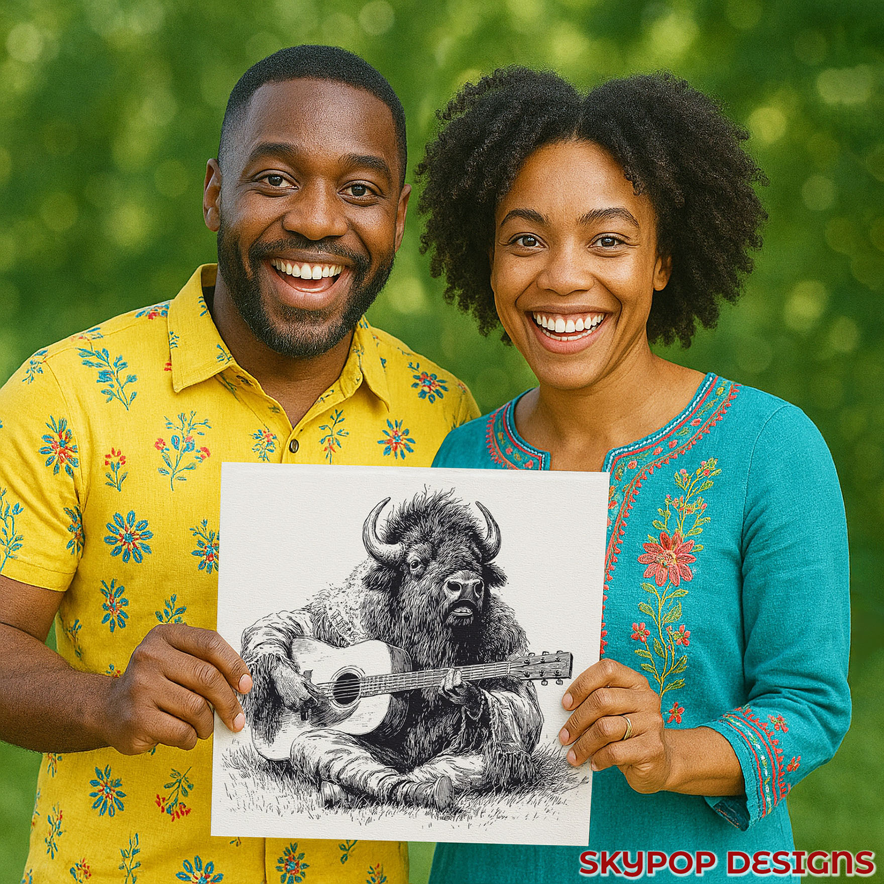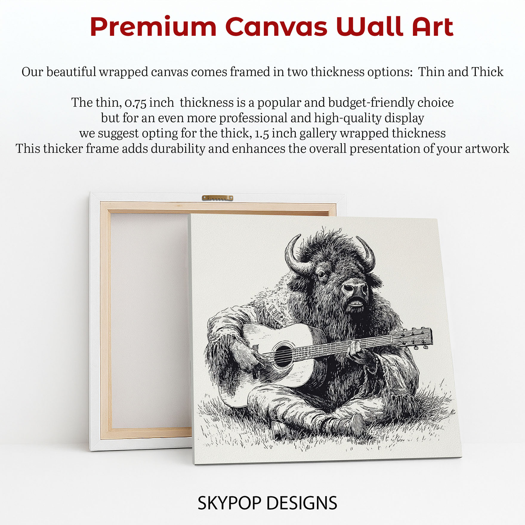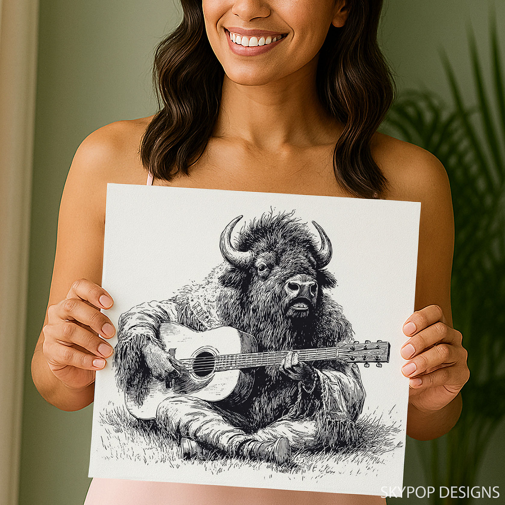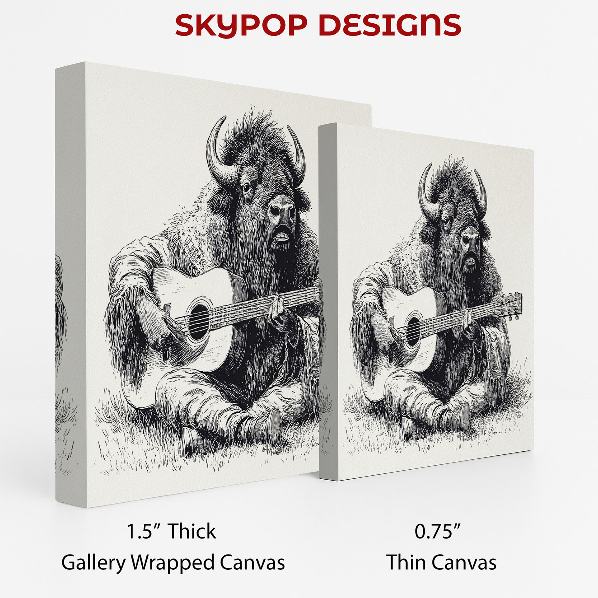 Transform your space with this captivating Bison Serenade canvas wall art, featuring a unique and whimsical portrayal of a bison playing a guitar.