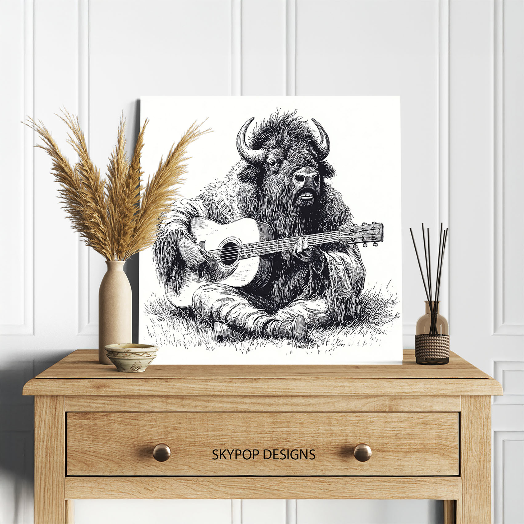 Transform your space with this captivating Bison Serenade canvas wall art, featuring a unique and whimsical portrayal of a bison playing a guitar. This striking poster or canvas wall art is perfect for adding a touch of personality to your living room or creating a fun focal point in a game room. The black and white tones offer a classic yet contemporary feel, making this animal art piece a versatile addition to rustic or bohemian decor styles. The detailed linework and the unexpected subject matter make this a conversation starter, ideal for an entryway or guest room. This artwork’s charm lies in its ability to blend traditional animal subjects with a playful, modern aesthetic. High-quality printing ensures the intricate details of the bison’s fur and the guitar’s strings are captured with stunning clarity. This canvas wall art elevates any space, bringing a sense of joy and unconventional beauty. It’s a perfect gift for music lovers, animal enthusiasts, or anyone looking to add a unique piece to their home decor. Whether you’re aiming for a bold statement or a subtle nod to nature-inspired art, this bison poster delivers. Celebrate individuality and artistic expression with this memorable artwork. Elevate your wall decor with this exceptional bison canvas art today.