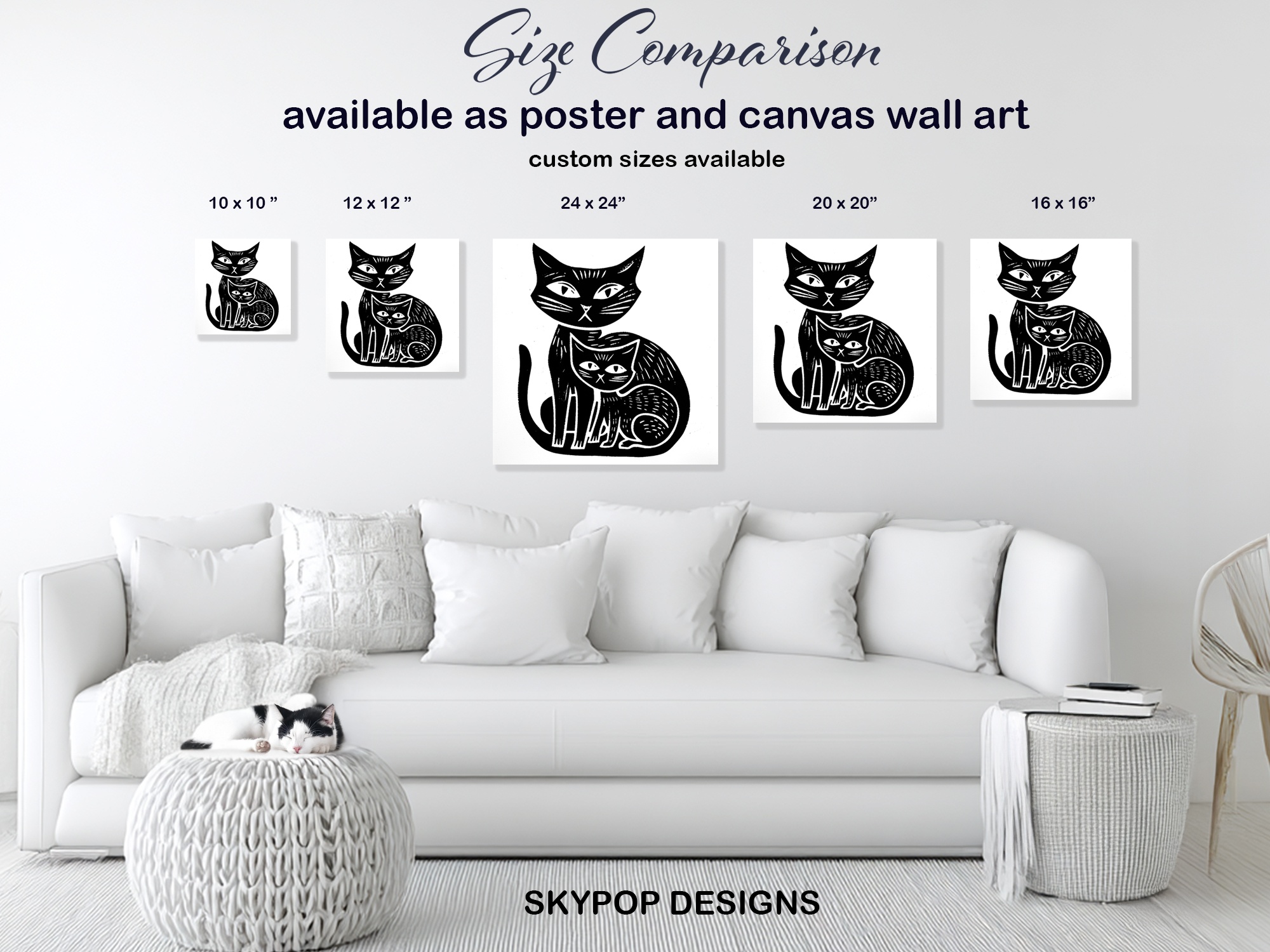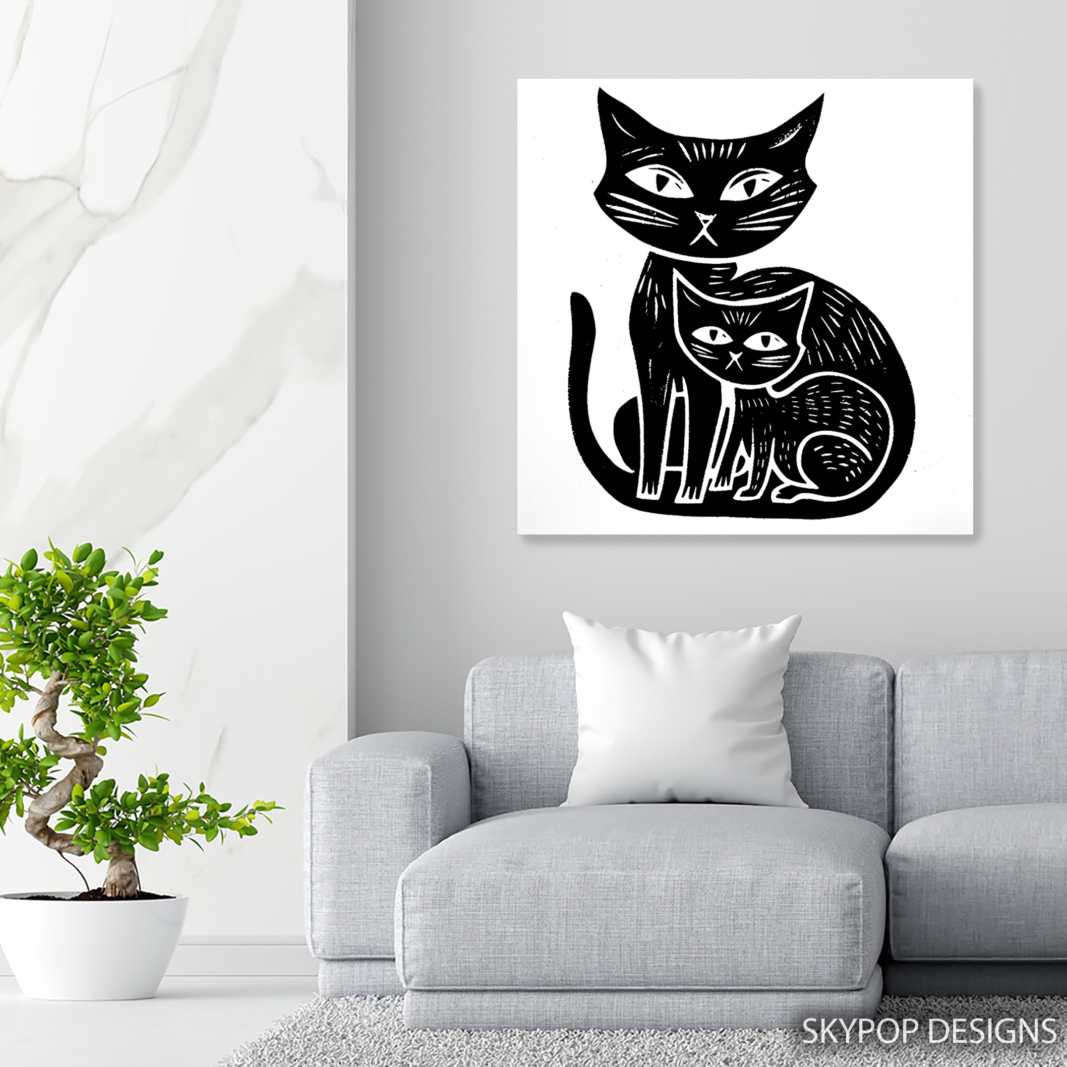 Add a touch of whimsy to your space with this striking black cat canvas wall art. The bold, minimalist design features two stylized felines in contrasting sizes, creating an eye-catching focal point for any room. Perfect for modern living rooms or contemporary bedrooms, this poster brings a sleek, Scandinavian-inspired aesthetic to your decor. The high-contrast black and white palette makes a dramatic statement, ideal for minimalist interiors or as an accent piece in colorful spaces. This versatile canvas art works beautifully in nurseries, adding a playful yet sophisticated touch, or in home offices for a touch of feline charm. The clean lines and graphic style of the cats capture their mysterious allure, making this piece a conversation starter. Whether you’re a cat lover or simply appreciate modern animal art, this poster elevates your wall decor with its timeless appeal. The larger cat’s watchful eyes seem to follow you, adding an interactive element to your space. Ideal as a housewarming gift or to refresh your own decor, this cat wall art adapts effortlessly to various interior styles. The quality printing ensures every whisker and subtle texture is captured in stunning detail. Transform your room today with this captivating black cat artwork that combines contemporary design with feline grace.