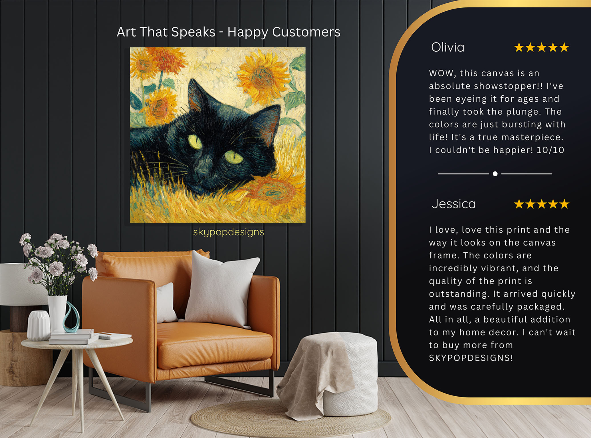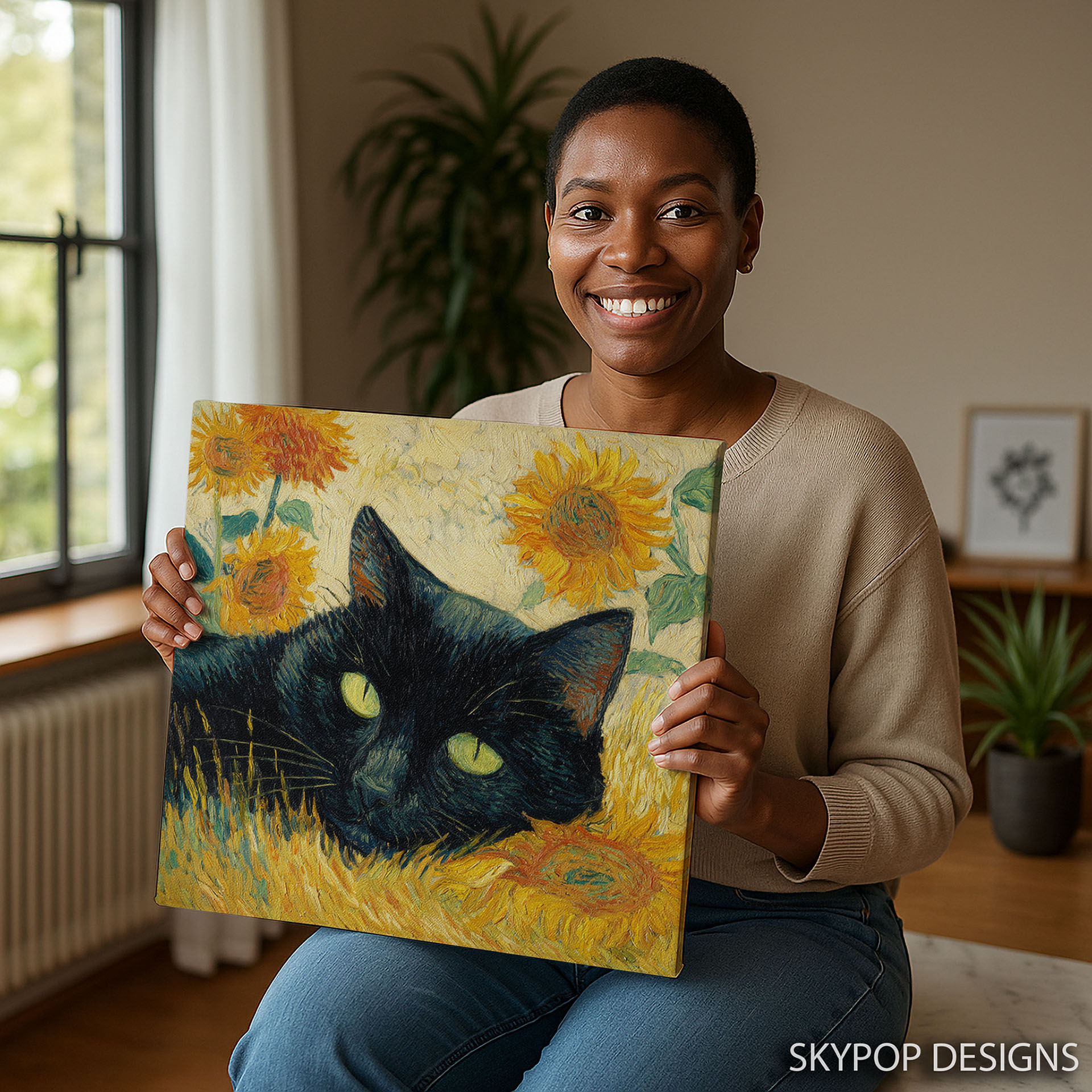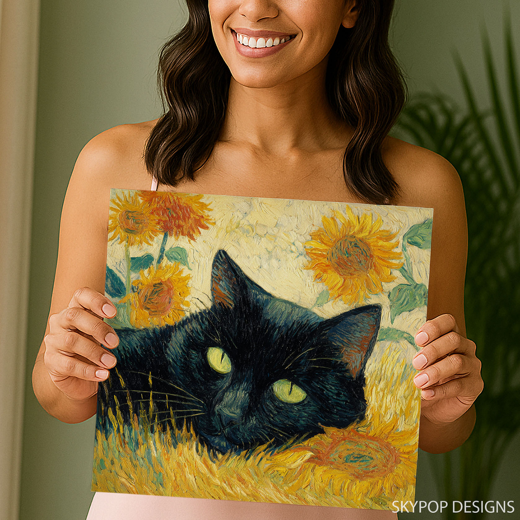 Van Gogh Style Black Cat and Sunflower Garden Canvas Art