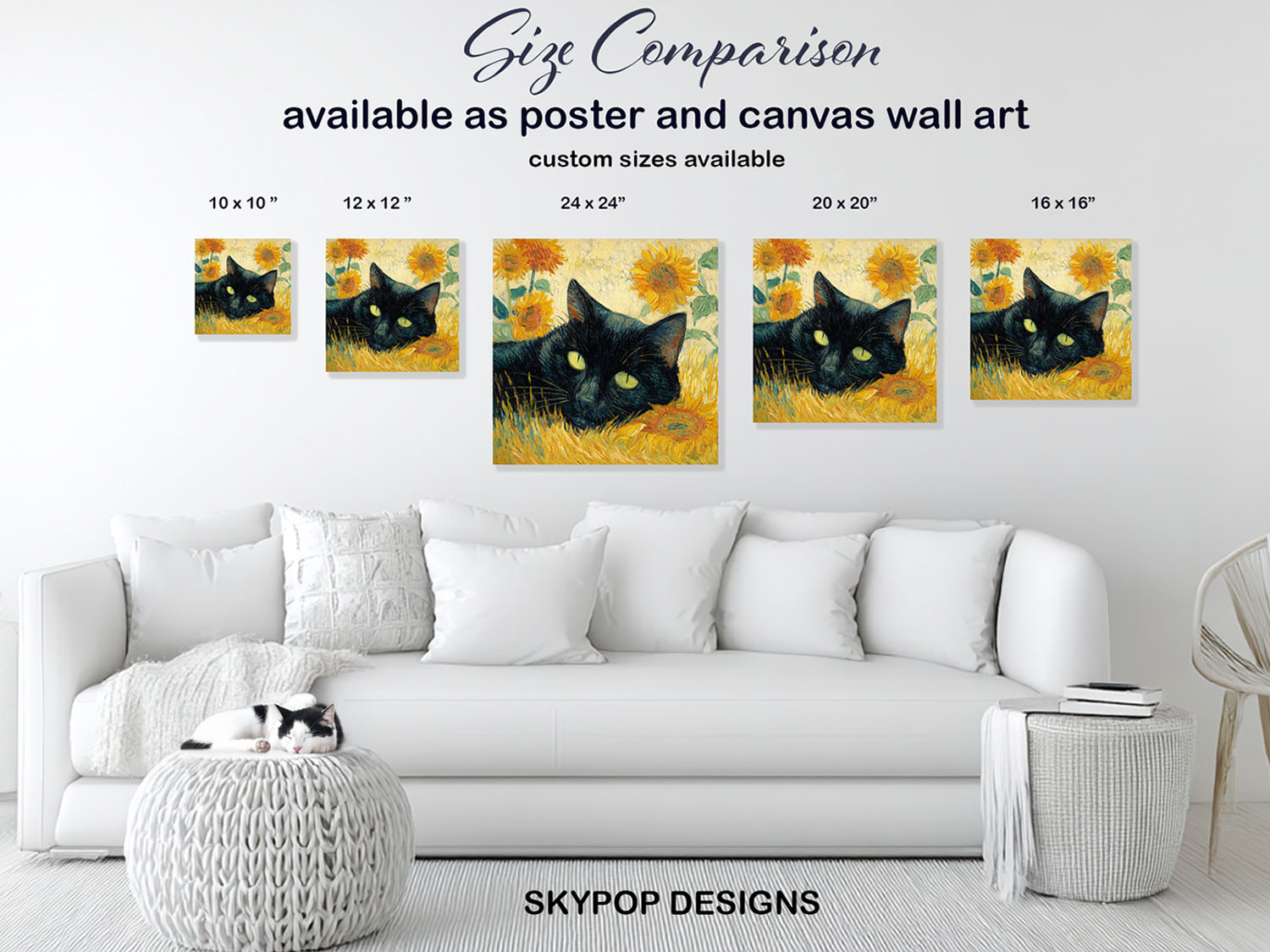 Transform your home with captivating canvas wall art that brings the beauty of nature and the charm of animals to life. This stunning black cat canvas wall art, adorned with vibrant sunflowers in a style reminiscent of Van Gogh’s masterpieces, is perfect for any space. The bold brushstrokes and rich colors create a striking visual appeal, making this poster or canvas wall art an ideal addition to your living room decor or a whimsical touch for a child’s room. The striking contrast between the black cat and the bright yellow sunflowers evokes a sense of warmth and joy, enhancing any mood. This animal art piece is a fantastic choice for bohemian and contemporary decor styles, adding personality and flair to modern farmhouse settings as well. Whether you’re looking for unique wall decor for your bedroom or a welcoming piece for your entryway, this versatile canvas print fits seamlessly. The sunflower motif, paired with the mysterious black cat, creates an atmosphere of enchantment and natural beauty. High-quality printing ensures the texture and vibrancy of the original artwork are captured, making this poster a durable and beautiful addition to your home. It serves as a wonderful gift for cat lovers, art enthusiasts, or anyone looking to infuse their space with color and character. Elevate your walls with this timeless piece of art that celebrates the simple pleasures of life and nature. This canvas wall art is more than just decoration; it’s a statement of style and personality. Bring the outdoors in with this stunning black cat and sunflower canvas art today.